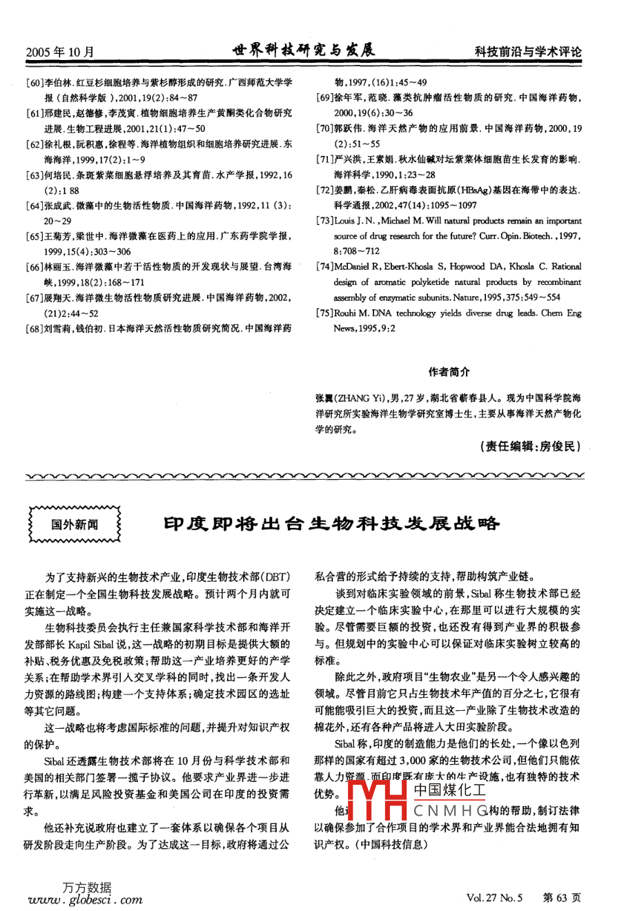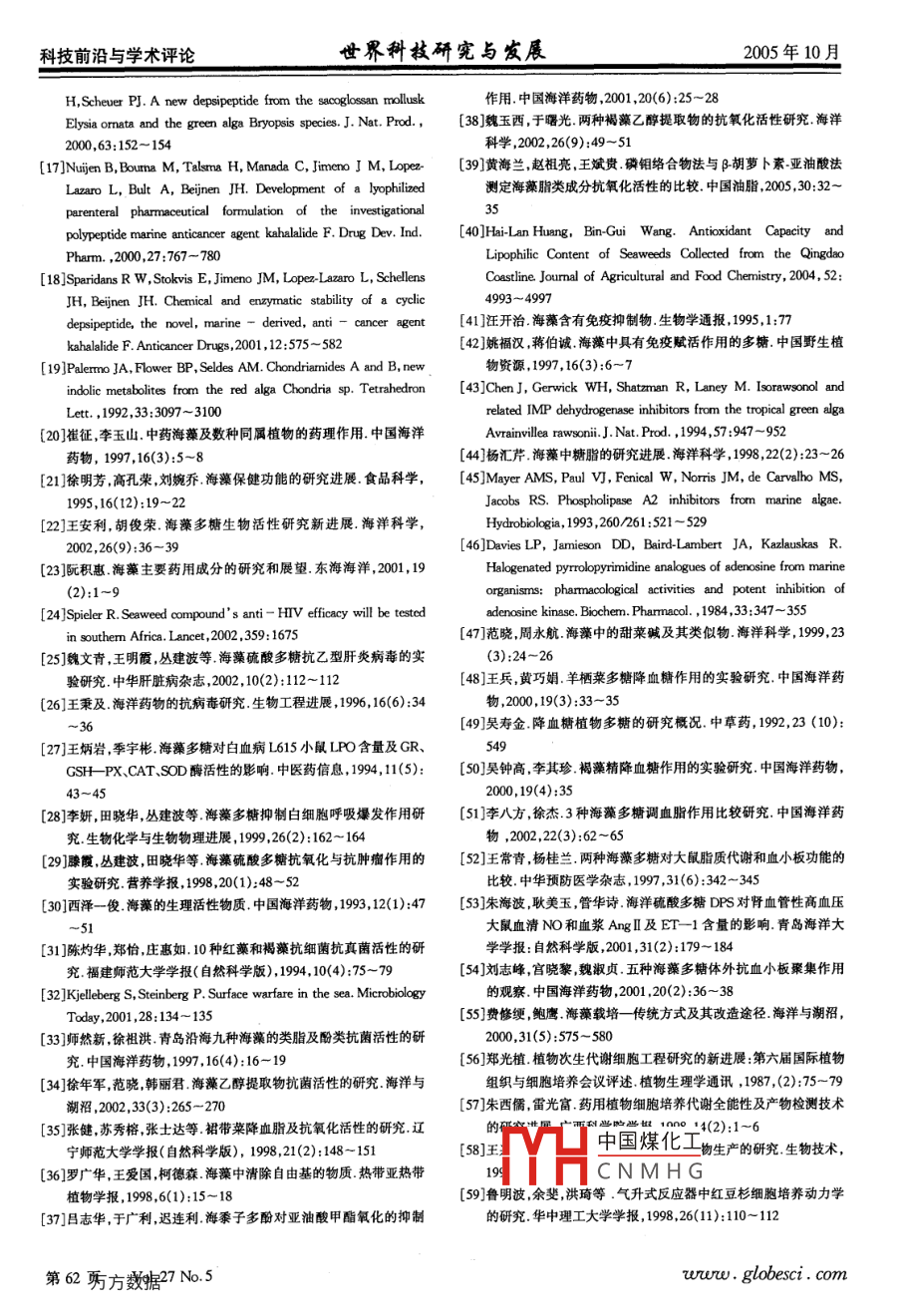 科技前沿與學(xué)術(shù)評(píng)論世界科技研憲與發(fā)屐2005年10月海藻生物活性物質(zhì)研究的回顧與展望張翼2李曉明王斌貴1.中國(guó)科學(xué)院海洋研究所青島266071;2.中國(guó)科學(xué)院研究生院北京100039摘要:本文簡(jiǎn)要介紹了海藻來(lái)源的生物活性物質(zhì)研究概況,并對(duì)生物技術(shù)在這一領(lǐng)域的應(yīng)用前景做了初步的討論與展望。作為海洋中有機(jī)物的原始生產(chǎn)者,海藻含有多種生物活性物質(zhì),包括抗腫瘤、抗病毒、抗菌活性物質(zhì)、抗氧化劑、免疫調(diào)節(jié)劑、酶抑制劑等。而人工栽培、組織培養(yǎng)、細(xì)胞工程、基因工程等生物技術(shù)在海藻生物活性物質(zhì)研究領(lǐng)域的應(yīng)用將有可能為海藻生物活性物質(zhì)的研究與開(kāi)發(fā)提供高效費(fèi)比的藥源解決方案。關(guān)鍵詞:海藻生物活性物質(zhì)生物技術(shù)Review and Prospect of Seaweed Derived Bioactive SubstancesZHANG Y, 2 LI Xiaoming WANG Bingui(1. Institute of Oceanology, Chinese Academy of Sciences, Qingdao 2660712. Graduate School of Chinese Academy of Sciences, Beijing 100039)Abstract: The progress in the research of seaweed-derived bioactive substances was summarized andthe application prospect of biotechnology in this field was also discussed in this review. As theprimary producer of organic compounds in the marine environment, seaweeds have been proven to bea uery rich source of uarious chemical constituents with interesting biological activities in antibiotic,antioxidant, antitumour, antiviral, immuno-modifying, and enzymatic inhibitory assays. Theapplication of biotechnologies such as tissue culture, cell engineering, and gene engineering, might beemployed for the cost-effective supplying for the research and development of marine algal-derivedbioactive substancesKey words: seaweed, bioactive substances, biotechnology廣闊的海洋占地球面積的70%以上,蘊(yùn)藏著豐天然富集者(包括氯、溴、碘等鹵素),它在海洋生態(tài)富的生物資源。海藻是海洋生物資源的重要組成部系統(tǒng)中處于金字塔的底層—被捕食者吞食的地分。在分類(lèi)學(xué)上,海藻屬于低等隱花植物,主要分為位,海藻與附生、共生于其中的微生物還存在著復(fù)雜四大類(lèi)—藍(lán)藻綠藻、紅藻和褐藻,另外還包括硅的拮擴(kuò)所P流營(yíng)咎合成某些具有細(xì)胞藻、甲藻金藻等微藻。估計(jì)全世界海洋中生長(zhǎng)有毒抗中國(guó)煤化保護(hù)自己。這些15000余種海藻11化學(xué)CNMHG海藻天然成分的生海藻是海洋中有機(jī)物的原始生產(chǎn)者和無(wú)機(jī)物的物活性進(jìn)行深入的研究。眾多報(bào)道表明很多海藻成第5巧方數(shù)據(jù)7N5www.globesci.com2005年10月世界科枝研憲與發(fā)展科技前沿與學(xué)術(shù)評(píng)論分具有良好的抗腫瘤抗病毒、抗真菌抗細(xì)菌免疫多的二萜類(lèi),具有抗腫瘤及抗菌活性其中尤以網(wǎng)地增強(qiáng)或抑制、抗氧化、防治腦心血管疾病、抑制某些藻科 Dictydaerae研究較多,包括網(wǎng)地藻屬 Dictyota、靶酶等生物活性。褐舌藻屬 Spatoglossum、棕葉藻屬 Stypopodium海藻與人類(lèi)有著非常密切關(guān)系,它作為重要的等;另外在喇叭藻 Turbinaria ornata中發(fā)現(xiàn)了一種藥物資源在我國(guó)傳統(tǒng)中醫(yī)藥中已有悠久的藥用歷角鯊烯型三萜 Turbinaric acid,對(duì)小鼠黑色素瘤及人史,在《神農(nóng)本草經(jīng)》、《本草綱目》等著作中早有收結(jié)腸癌細(xì)胞具有細(xì)胞毒性8:0)。錄,海帶、昆布、羊棲菜、海蒿子等海藻21常用于治從羽藻屬綠藻 Bryopsis sf.中分離到一種環(huán)縮療甲狀腺腫、前列腺增生、淋巴結(jié)結(jié)核及惡性淋巴肽 Kahalalide F(圖3),可控制肺癌、結(jié)腸癌、前列腺瘤、乳腺增生、炎癥(如肥厚性咽炎、類(lèi)風(fēng)濕性關(guān)節(jié)癌等多種腫瘤,作為候選肺癌治療藥物已申請(qǐng)專利炎、痛風(fēng));另外還用于治療甲亢眼病不孕癥、高脂作為肝癌治療藥物已進(jìn)入I期臨床試驗(yàn)15-18血癥等多種疾病3-7。從對(duì)海洋藻類(lèi)生物活性物質(zhì)研究取得的眾多現(xiàn)代成果來(lái)看,海藻生物活性物H,C質(zhì)對(duì)于解決人類(lèi)健康的新問(wèn)題也具有重要的潛力和優(yōu)勢(shì)。1海藻中的各類(lèi)生物活性物質(zhì)11抗腫瘤活性物質(zhì)萜類(lèi)是海藻中報(bào)道較多的一類(lèi)抗腫瘤活性成O CH,分。紅藻中的次生物質(zhì)以萜類(lèi)最為豐富。松節(jié)藻科凹頂藻屬 Laurencia是萜類(lèi)的“天然工廠",富含各種具細(xì)胞毒活性的鹵代三萜、二萜、倍半萜。如鈍形圖3 Kahalalide F凹頂藻L. obtusa中分離到兩種具角鯊烯三萜骨架另外曾有報(bào)道從海藻 Lissocilinum vareau中分的溴代醚(圖1)其對(duì)P388細(xì)胞株的FD3分別是離到的環(huán)狀多硫化合物anin(圖4),該化合物對(duì)0.0038和0.010g/mlL, brongniartii中發(fā)現(xiàn)了腸癌細(xì)胞的毒性比5-氟尿嘧啶高一百倍9。從軟系列溴代吲哚生物堿也具活性。海頭紅科海頭紅屬骨藻 Chondria atropurpurea中分離到了一種內(nèi)酰( Plocamium)含多種鏈狀和環(huán)狀多鹵代單萜,具細(xì)胺 Chondriamide a(圖5),對(duì)人類(lèi)鼻咽癌和結(jié)腸癌細(xì)胞毒鎮(zhèn)靜等活性。從根葉藻科松香藻 Portieria胞具有體外抑制活性15湯海峰等從東南海的hornemannii中分離到的鹵化單萜化合物 Halomon葉托馬尾藻中以稻瘟霉模型篩選抗有絲分裂、