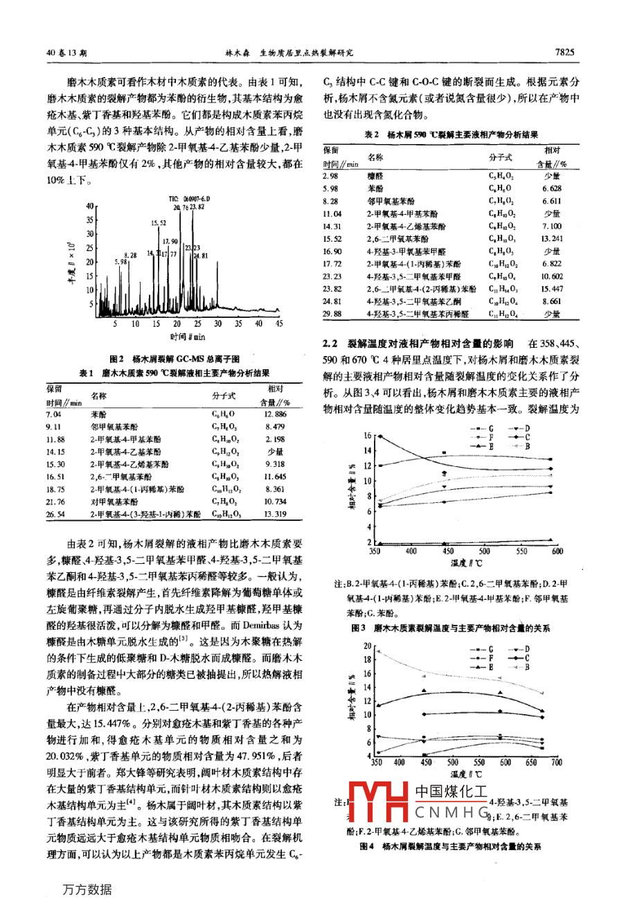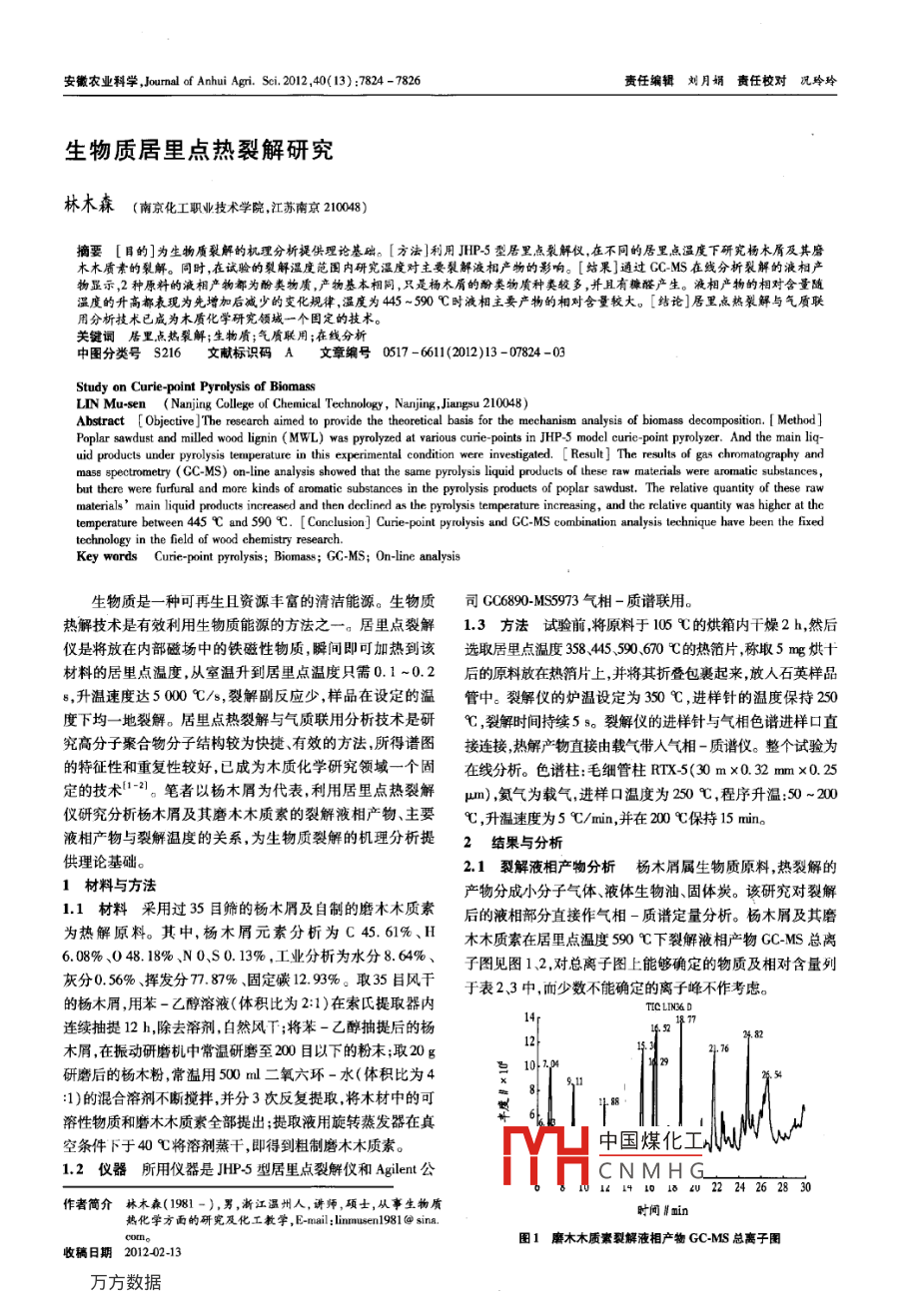 安徽農(nóng)業(yè)科學, Journal of Anhui Agri.Soi.2012,40(13):7824-7826責任編輯劉月娟責任校對況玲玲生物質(zhì)居里點熱裂解研究林木森(南京化工職業(yè)技術學院,江蘇南京21008摘要[目的]為生物質(zhì)裂解的機理分析提供理論基礎。[方油]利用JHP5型居里點裂解儀,在不同的居里點溫度下研究楊木屑及其磨木木質(zhì)素的裂解。同時,在試驗的裂解溫度范囯內(nèi)研究溫度對主要裂解液相產(chǎn)物的彩響。[結果]通過CCMS在線分析裂解的液相產(chǎn)物顯示,2種原料的液相產(chǎn)物都為酚類物質(zhì),產(chǎn)物基本相同,只是楊木屑的酚類物質(zhì)種類較多,并且有糠醛產(chǎn)生。液相產(chǎn)物的相對含量隨漒度的升高都表現(xiàn)為先增加后減少的變化規(guī)律,溫度為445~590℃時液相主要產(chǎn)物的相對含量較大。[結論]居里點熱裂解與氣盾聯(lián)用分析技術已成為木質(zhì)化學研究領域一個固定的技術關鍵詞居里點熱裂解;生物質(zhì);氣質(zhì)聯(lián)用;在線分析中圖分類號S216文獻標識碼A文章編號017-6611(2012)13-07824-03Study on Curie-point Pyrolysis of BiomassLIN Mu-sen Nanjing College of Chemical Technology, Nanjing, Jiangsu 210048)Abstract Objective ] The research aimed to provide the theoretical basis for the mechanism analysis of biomass decomposition. MethodPoplar sawdust and milled wood lignin( MWL)was pyrolyzed at various cunie-points in JHP-5 model curie-point pyrolyzer. And the main liqid products under pyrolysis temperature in this experimental condition were investigated. Result] The results of gas chromatography anass spectrometry(GC-MS)on-line analysis showed that the same pyrolysis liquid products of these raw materials were aromatic substancesbut there were furfural and more kinds of aromatic substances in the pyrolysis products of poplar sawdust, The relative quantity of these rawnaterials,main liquid products increased and then declined as the pyrolysis temperature increasing, and the relative quantity was higher at themperature between 445 C and $ C. Conclusion] Curie-point pyrolysis and GC-MS combination analysis technique have been the fixedhnology in the field of wood ehemistry researchKey words Curie-point pyrolysis; Biomass; GG-MS: On-line analysis生物質(zhì)是一種可再生且資源豐富的清潔能源。生物質(zhì)司GC6890-MS573氣相-質(zhì)譜聯(lián)用熱解技術是有效利用生物質(zhì)能源的方法之一。居里點裂解1.3方法試驗前將原料于106℃的烘箱內(nèi)干燥2h,然后儀是將放在內(nèi)部磁場中的鐵磁性物質(zhì),瞬間即可加熱到該選取居里點溫度358415590670℃的熱箔片稱取5mg烘十材料的居里點溫度,從室溫升到居里點溫度只需0.1~0.2后的原料放在熱箔片上,并將其折疊包裹起來,放入石英樣品6,升溫速度達5000℃/s,裂解副反應少,樣品在設定的溫管中。裂解儀的爐溫設定為350℃,進樣針的溫度保持250度下均一地裂解。居里點熱裂解與氣質(zhì)聯(lián)用分析技術是研℃C,裂解時間持續(xù)5s。裂解儀的進樣針與氣相色譜進樣口直究高分子聚合物分子結構較為快捷、有效的方法,所得譜圖接連接熱解產(chǎn)物直接由載氣帶入氣相-質(zhì)譜儀。整個試驗為的特征性和重復性較好,已成為木質(zhì)化學研究領域一個固在線分析。色譜柱:毛細管柱RIX5(30mx0.32mx0.25定的技術2。筆者以楊木屑為代表利用居里點熱裂解pm),氦氣為載氣,進樣口溫度為20℃,程序升溫:0-x0儀研究分析楊木屑及其磨木木質(zhì)素的裂解液相產(chǎn)物、主要℃,升溫速度為5℃/mn,并在20℃保持15min液相產(chǎn)物與裂解溫度的關系,為生物質(zhì)裂解的機理分析提2結果與分析供理論基礎。2.1裂解液相產(chǎn)物分析楊木屑屬生物質(zhì)原料,熱裂解的1材料與方法產(chǎn)物分成小分子氣體、液體生物油固體炭。該研究對裂解L1材料采用過35目篩的楊木屑及自制的磨木木質(zhì)素后的液相部分直接作氣相-質(zhì)譜定量分析。楊木屑及其磨為熱解原料。其中,楊木屑元素分析為C45.61%、日木木質(zhì)素在居里點溫度590℃下裂解液相產(chǎn)物GCMS總離608%、048.18%N0、50.13%,工業(yè)分析為水分8.64%子圖見圖1、2,對總離子圖上能夠確定的物質(zhì)及相對含量列灰分0.56%、揮發(fā)分7.87%、固定碳1293%。取35目風干于表2、3中,而少數(shù)不能確定的離子峰不作考慮。的楊木屑,用苯-乙醇溶液(體積比為2:1)在索氏提取器內(nèi)TIC LIN3 D連續(xù)抽提12h,除去溶劑,自然風T;將苯-乙醇抽提后的楊木屑,在振動研磨機中常溫研磨至200目以下的粉末;取20g研磨后的楊木粉常溫用500ml二氧六環(huán)-水(體積比為410+21)的混合溶劑不斷攪拌,并分3次反復提取,將木材中的可溶性物質(zhì)和磨木木質(zhì)素全部提出;提取液用旋轉蒸發(fā)器在真空條件下于40℃將溶劑蒸干,即得到粗制磨木木質(zhì)素。中國爆化工從1.2儀器所用儀器是JHP5型居里點裂解儀和 Agilent公CNMHGL動作者簡介林木森(1981-),男,淅江溫州人,講師,碩士,從事生物質(zhì)時間"min熱化學方面的研究及化工教學,E-mail; linmusenl981@sin圖1磨木木質(zhì)素裂解液相產(chǎn)物GCMS總離子圖收稿日期201202-1340卷13期林木森生物質(zhì)居里點熱裂解研究7825磨木木質(zhì)素可看作木材中木質(zhì)素的代表。由表1可知,C3結構中C-C鍵和C.0C鍵的斷裂而生成。根據(jù)元素分磨木木質(zhì)素的裂解產(chǎn)物都為苯酚的衍生物,其基本結構為愈析楊木屑不含氮元素(或者說氮含量很少),所以在產(chǎn)物中瘡木基、紫丁香基和羥基苯酚。它們都是