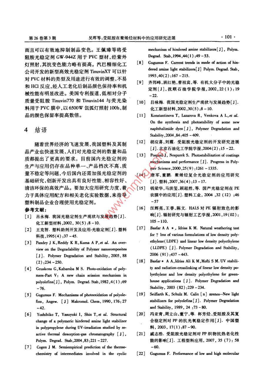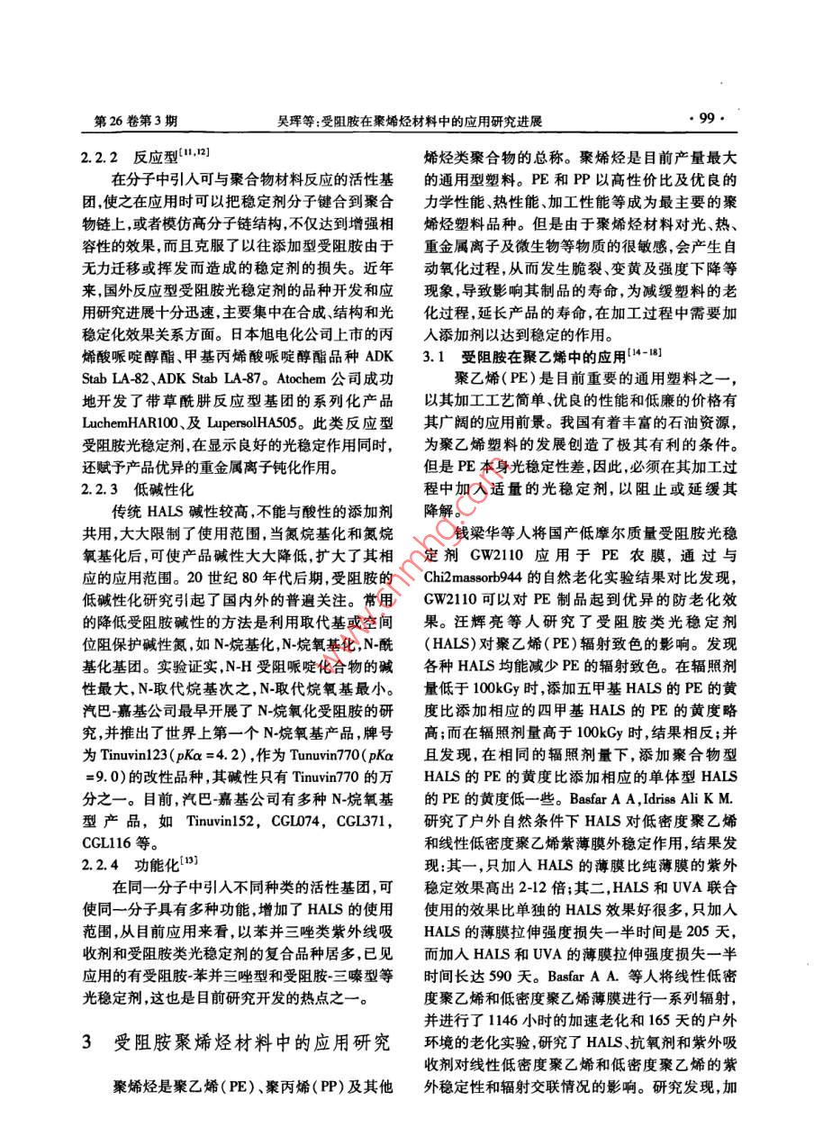 2011 年6月材料開發(fā)與應(yīng)用97.文章編號:1003-1545(2011 )03-009706受阻胺在聚烯烴材料中的應(yīng)用研究進(jìn)展吳琿,王峰(安徽省建筑工業(yè)學(xué)院材料科學(xué)與工程系,安徽合肥230022)摘要:受阻胺光穩(wěn)定劑( HALS)是- -種 新型高效的光穩(wěn)定劑,在聚烯烴材料中有著廣泛的應(yīng)用。本文闡述了HALS的穩(wěn)定機(jī)理和發(fā)展趨勢;并介紹了國內(nèi)外受阻胺在聚烯烴材料中的應(yīng)用和研究進(jìn)展。在新研究手段的發(fā)展和取得的成果的基礎(chǔ)上,展望了受阻胺在聚烯烴材料中的研究方向和應(yīng)用前景。關(guān)鍵詞:受阻胺;聚烯烴;光穩(wěn)定劑;老化機(jī)理中圈分類號:TQ 325.1文獻(xiàn)標(biāo)識碼:A聚烯烴材料原料豐富,價格低廉,容易加工象稱為塑料的老化。從化學(xué)角度上看,塑料材料成型,綜合性能優(yōu)良,作為- -種新型材料已廣泛無論是天然的還是合成的,都具有一定的分子結(jié)深人國民經(jīng)濟(jì)各部門以及人民生活各個領(lǐng)域,不構(gòu),其中某些部位具有一些弱鍵,這些弱鍵自然僅彌補(bǔ)了部分傳統(tǒng)材料質(zhì)和量方面的不足,而且地成為化學(xué)反應(yīng)的突破口。塑料老化本質(zhì)無非已成為某些部門技術(shù)進(jìn)步不可缺少的材料。但是一種化學(xué)反應(yīng),即以弱鍵發(fā)生化學(xué)反應(yīng)(例如烯烴材料在使用過程中常會受到光、熱和氧的作氧化反應(yīng))為起點(diǎn)并引發(fā)一系列化學(xué)反應(yīng)。 它可用,使聚烯烴材料老化,大大縮短制品的使用壽以由許多原因引起,例如熱、光、機(jī)械應(yīng)力、輻射、命,嚴(yán)重地影響了材料使用的經(jīng)濟(jì)性和環(huán)保性,電場等。可以單獨(dú)- -種因素,也可以多種因素共限制其應(yīng)用范圍。同作用。其結(jié)果是高分子材料的分子結(jié)構(gòu)發(fā)生受阻胺光穩(wěn)定劑( HALS)是一類非常高效的改變及相對分子量下降或產(chǎn)生交聯(lián),從而材料性聚烯烴材料的添加劑,是各類光穩(wěn)定劑中研究最能變壞,以至無法正常使用。最常見的導(dǎo)致老化多、發(fā)展最快的品種。20世紀(jì)70年代中期由日因素是熱和紫外光,因?yàn)樗芰蠌纳a(chǎn),儲存、加工本三共公司研制開發(fā),其光穩(wěn)定效果是普通光穩(wěn)到制品應(yīng)用接觸最多的環(huán)境便是熱和陽光。定劑的2 ~4倍,受阻胺類光穩(wěn)定劑無毒、原料易1.1聚烯烴材料熱 氧老化降解機(jī)理(}]得,合成簡便,與許多樹脂具有良好的相當(dāng)高聚物與空氣接觸時,會與空氣中的氧進(jìn)容性12]。行化學(xué)反應(yīng)而被氧化。這是典型的自由基反應(yīng),-般屬于自由基連鎖反應(yīng)。高聚物對氧化降解1聚烯烴材料的老化的敏感程度在很大程度上取決于其本身的分子結(jié)構(gòu),例如含有a-氫的聚丙烯就比聚乙烯對氧化高分子材料在其合成、儲存及其加工和最終反應(yīng)敏感得多。任何高聚物材料的性能都是通應(yīng)用的各個階段都可能發(fā)生變質(zhì),即材料的性能過-一定相對分子量和分子量分布來達(dá)到的,而當(dāng)變壞,例如泛黃、相對分子量下降、制品表面龜高聚物受到自動氧化后其初始分子結(jié)構(gòu)發(fā)生了裂、光澤喪失,更為嚴(yán)重的是導(dǎo)致沖擊強(qiáng)度、撓曲改變,這稱為“降解"。廣義而言,降解包括相對強(qiáng)度拉伸強(qiáng)度和伸長率等力學(xué)性能大幅下降,分子量降低(斷鏈)和相對分子量增加(交聯(lián))。從而影響高分子材料制品的正常使用。這種現(xiàn)描述自動氧化反應(yīng)須考慮- -系列反應(yīng),包括產(chǎn)生收稿日期:2010-11-22基金項(xiàng)目:安徽省安徽優(yōu)秀青年基金(06044097)和安徽省教育廳自然科研項(xiàng)目(2006KJ107B)。作者簡介:昊琿(1983-),男,安徽潁上縣人,安徽省建筑工業(yè)學(xué)院碩士生。王峰( 1969-) ,男,江蘇揚(yáng)州人,博士后,安徽省建筑工業(yè)學(xué)院副教授,碩士生導(dǎo)師?!?8●材料開發(fā)與應(yīng)用2011年6月初級自由基的鏈引發(fā)反應(yīng),帶來氧化產(chǎn)物的鏈增滅機(jī)理至今仍不明確。長和鏈歧化反應(yīng)以及導(dǎo)致整個體系中消除自由(2)分解氫過氧化物基的鏈終止反應(yīng)。高分子材料中過氧化氫的存在與積聚是光1.2聚烯烴材料的光老化降 解機(jī)理4.,5]氧化降解的根源。因此,如能有效地減少或消除聚合物的光老化是一系列復(fù)雜反應(yīng)的結(jié)果。過氧化物的存在,就能抑制高分子材料的光對大多數(shù)聚合物而言,-般認(rèn)為它們是-一個由光老化。能引發(fā)的自動氧化過程,其歷程如下:(1)引發(fā)反(3)捕獲自由基應(yīng),(2)鏈增長反應(yīng),(3)終止反應(yīng)在光氧化過程受阻胺分子中哌啶環(huán)上的仲胺基在熱、光等中。鏈的斷裂和交聯(lián)可以同時發(fā)生,斷裂使固體氧化條件下可以轉(zhuǎn)化為相應(yīng)的氮氧自由基,這種聚合物相對分子量降低,交聯(lián)則產(chǎn)生脆性的網(wǎng)狀氮氧自由基非常穩(wěn)定,但是它們能夠有效的捕獲分子,結(jié)果使其物理力學(xué)性能劣化。同時含羰基高分子聚合物中的烷基自由基及烷氧自由基,使分解產(chǎn)物和形成的發(fā)色團(tuán)又加深了其顏色的之失去活性,生成相應(yīng)的酯及過氧化酯。這些生變化。成的酯及過氧化酯又會繼續(xù)的與聚合物中的烷基自由基