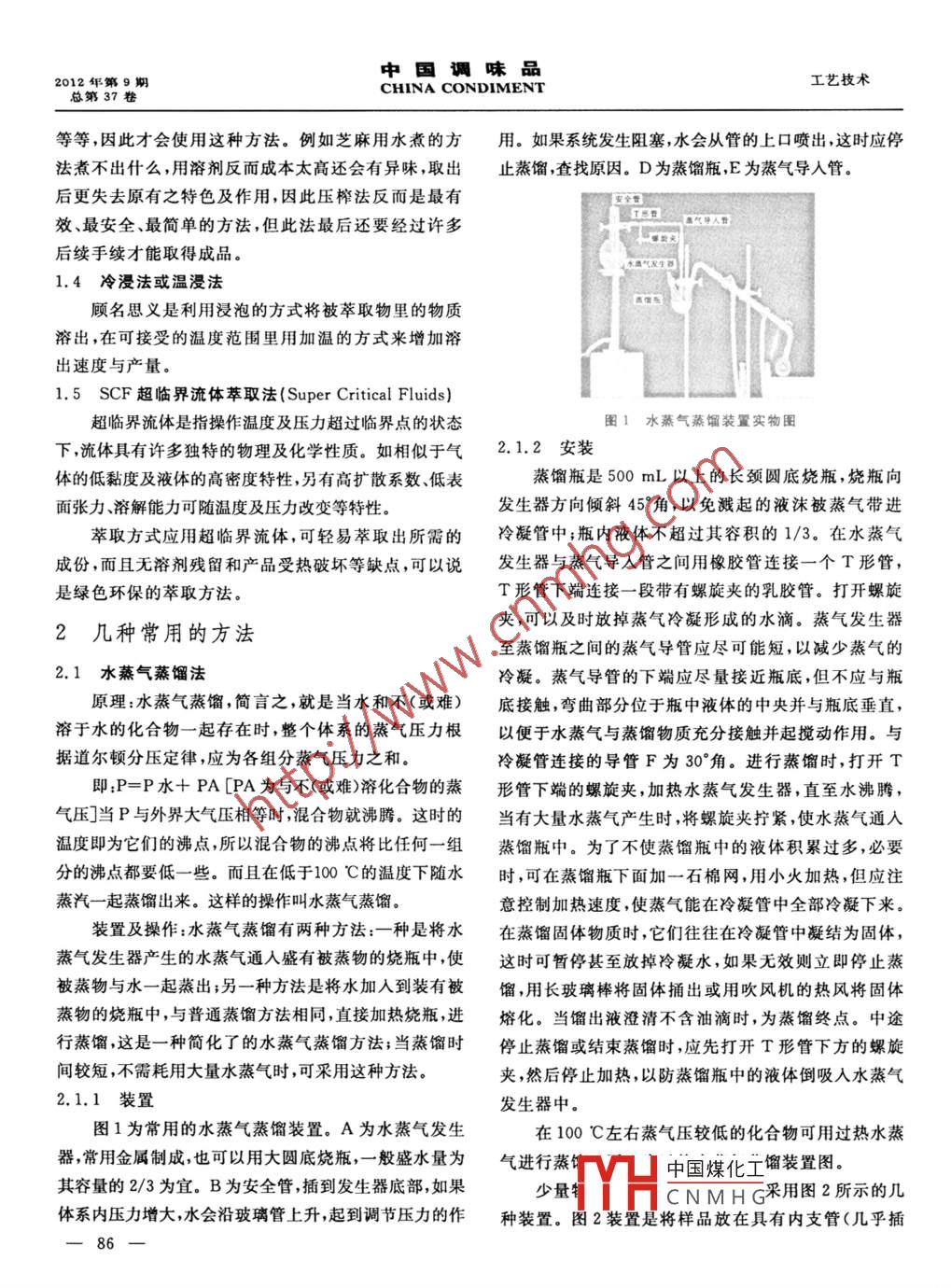 2012年第9期中國(guó)調(diào)味品工藝技術(shù)總第37卷CHINA CONDIMENT花椒精油的加工工藝胡建平‘,史碧波(西昌學(xué)院輕化工程學(xué)院,四川西昌615013)摘要:花椒精油是食品加工企業(yè)和香料行業(yè)理想的調(diào)香原料,花椒精油的制得方法很多。文章主要綜述了花椒精油的水蒸氣燕餾方法、同時(shí)燕餾萃取法、超臨界CO2萃取法。關(guān)鍵詞:花椒;精油;加工中圖分類號(hào):TS264.3文獻(xiàn)標(biāo)識(shí)碼:A文章編號(hào):1000-9973(2012)09-0085-04Processing Techniques of the Zanthoxylum OilHU Jian-ping, SHI Bi-bo(School of Applied and Chemical Engineering of Xichang College, Xichang 615013, China)Abstract: Zanthoxylum oil food processing enterprises and spices trade- ideal for raw materials, Chineseprickly ash oil preparation method. This paper mainly reviews the pepper zanthoxylum oil steam distillation method, simultaneous distillation and extraction, supercritical CO2 extraction methodKey words: zanthoxylum; oil; process精油是從植物上取得的具有香氣的物質(zhì),是由植物中的花、葉、種子、果皮、枝干、樹皮、木質(zhì)、根地下1精油的取得方式莖、樹膠或油性樹脂中萃取出來的液體。具有該植物1.1水蒸氣蒸餾法的特殊芳香氣味及復(fù)雜特殊的化學(xué)成份。就如同中草利用水來熬煮或蒸煮或在高壓鍋爐煮的方式來萃藥一般,每一種植物或同一種植物不同部位,都會(huì)有不取,在經(jīng)過沉淀、過濾等多道復(fù)雜的手續(xù)來取得精油的同的氣味與作用同樣的植物、同樣的部份也會(huì)因?yàn)檩洼腿》椒ㄈ〉姆绞讲煌玫降臍馕杜c作用也有可能不相同。1.2有機(jī)溶劑抽提法因?yàn)楸惠腿〕鑫镔|(zhì)濃度高,因此具有特殊的物理或化這種萃取方法常被用在不能使用水蒸氣蒸餾法,學(xué)作用,所以芳香精油才會(huì)有著特別的功能,例如抑制因?yàn)橛行┏煞轃o(wú)法承受高溫,因?yàn)楦邷貢?huì)破壞萃取物細(xì)菌、治療傷口、情緒放松、振奮精神等?;钚宰饔没虮苊飧邷囟冑|(zhì)或不易透過水蒸氣蒸餾法從花椒中提取出的揮發(fā)性油稱為花椒精油,是花取得之成份,再經(jīng)過濾及去除有機(jī)溶劑或其它凈化程椒香氣的主要有效成份,每公斤精油相當(dāng)于60~序,取得成品。100kg原料花椒所具有的香氣程度??芍苯踊蛳♂尯?.3壓榨法用于調(diào)制產(chǎn)生花椒的特有香氣,是食品加工企業(yè)和香這種萃取方法用在水蒸氣蒸餾法或化學(xué)溶劑萃取料行業(yè)理想的調(diào)香原料。同時(shí)花椒精油具有較強(qiáng)的殺法都不適用時(shí)其原因可能是:高溫問題、無(wú)合適的有機(jī)蟲活性與一定的抑菌活性,深受老百姓的青睞。溶劑、有合適的有機(jī)溶劑但無(wú)法去除、取得產(chǎn)量太低收稿日期:2012-04-05通訊作者中國(guó)煤化工基金項(xiàng)目:西昌學(xué)院碩士科研啟動(dòng)基金資助(XAo515)CNMHG作者簡(jiǎn)介:胡建平(1980-),男,副教授,研究方向:食品開發(fā)與研究。2012年第9期中國(guó)調(diào)味品CHINA CONDIMENT工藝技術(shù)總第37卷等等因此才會(huì)使用這種方法。例如芝麻用水煮的方用。如果系統(tǒng)發(fā)生阻塞,水會(huì)從管的上口噴出,這時(shí)應(yīng)停法煮不出什么,用溶劑反而成本太高還會(huì)有異味,取出止蒸餾,查找原因。D為蒸餾瓶,E為蒸氣導(dǎo)入管。后更失去原有之特色及作用,因此壓榨法反而是最有安全管效、最安全、最簡(jiǎn)單的方法,但此法最后還要經(jīng)過許多氣導(dǎo)人晉后續(xù)手續(xù)才能取得成品。水晶氣發(fā)生1.4冷浸法或溫浸法顧名思義是利用浸泡的方式將被萃取物里的物質(zhì)溶出,在可接受的溫度范圍里用加溫的方式來增加溶出速度與產(chǎn)量。1.5SCF超臨界流體萃取法( Super Critical Fluids)超臨界流體是指操作溫度及壓力超過臨界點(diǎn)的狀態(tài)圖1水蒸氣蒸餾裝置實(shí)物圖下流體具有許多獨(dú)特的物理及化學(xué)性質(zhì)。如相似于氣2.1.2安裝體的低黏度及液體的高密度特性,另有高擴(kuò)散系數(shù)低表蒸餾瓶是500mL以上的長(zhǎng)頸圓底燒瓶,燒瓶向面張力、溶解能力可隨溫度及壓力改變等特性。發(fā)生器方向傾斜45°角,以免濺起的液沫被蒸氣帶進(jìn)萃取方式應(yīng)用超臨界流體,可輕易萃取出所需的冷凝管中;瓶?jī)?nèi)液體不超過其容積的1/3。在水蒸氣成份,而且無(wú)溶劑殘留和產(chǎn)品受熱破壞等缺點(diǎn),可以說發(fā)生器與蒸氣導(dǎo)人管之間用橡膠管連接一個(gè)T形管,是綠色環(huán)保的萃取方法。T形管下端連接一段帶有螺旋夾的乳膠管。打開螺旋幾種常用的方法夾,可以及時(shí)放掉蒸氣冷凝形成的水滴。蒸氣發(fā)生器至蒸餾瓶之間的蒸氣導(dǎo)管應(yīng)盡可能短,以減少蒸氣的2.1水蒸氣蒸餾法冷凝。蒸氣導(dǎo)管的下端應(yīng)盡量接近瓶底,但不應(yīng)與瓶原理:水蒸氣蒸餾,簡(jiǎn)言之,就是當(dāng)水和不(或難)底接觸,彎曲部分位于瓶中液體的中央并與瓶底垂直,溶于水的化合物一起存在時(shí),整個(gè)體系的蒸氣壓力根以便于水蒸氣與蒸餾物質(zhì)充分接觸并起攪動(dòng)作用。與據(jù)道爾頓分壓定律,應(yīng)為各組分蒸氣壓力之和。冷凝管連接的導(dǎo)管F為30°角。進(jìn)行蒸餾時(shí),打開T即:P=P水十PA[PA為與不(或難)溶化合物的蒸形管下端的螺旋夾,加熱水蒸氣發(fā)生器,直至水沸騰,氣壓]當(dāng)P與外界大氣壓相等時(shí),混合