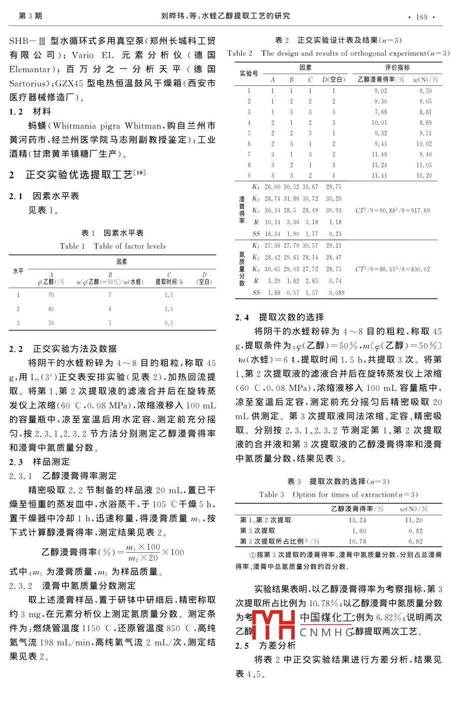 第21卷第3期精細(xì)化工Vol 21. No. 32004年3月FINE CHEMICALS中藥現(xiàn)代化技術(shù)水蛭乙醇提取工藝的研究劉曄瑋,邸多隆,張建民3,陳曉琴3(1.河西學(xué)院化學(xué)系,甘肅張掖734000;2.中國(guó)科學(xué)院蘭州化學(xué)物理研究所甘肅省天然藥物重點(diǎn)實(shí)驗(yàn)室,甘肅蘭州730000;3.張掖市藥品檢驗(yàn)所,甘肅張掖734000摘要:以乙醇浸膏得率和浸膏中氮質(zhì)量分?jǐn)?shù)為評(píng)價(jià)指標(biāo),選擇乙醇體積分?jǐn)?shù)、乙醇與水蛭質(zhì)量比、提取時(shí)間為考察因素,利用正交實(shí)驗(yàn)L(3)確定乙醇提取水蛭最佳工藝條件為:g(乙醇)mg(乙醇)=50%初(水蛭)=6,提取時(shí)間1.5h,共提取2次。平均乙醇浸膏得率13.24%,浸膏中平均氮質(zhì)量分?jǐn)?shù)w(N)=11.05%關(guān)鍵詞:水蛭;乙醇;浸膏得率中圖分類號(hào):R282.74文獻(xiàn)標(biāo)識(shí)碼:A文章編號(hào):1003-5214(2004)03-0168-03Study of Ethanol Extraction Process for Whitmania Pigra WhitmanLIU Ye-wei, DI Duo-long. ZHANG Jian-min, CHEN Xiao-qin(l. De partment of Chemistry, Hexi University, Zhangye 734000, Gansu, China: 2. Lanzhou Institute ofChemical physics, the Chinese Academy of Sciences, Lanzhou 730000, Gansu, China; 3. Institute for DrugControl, Zhangye 734000 Gansu, chinoAbstract: With extraction rate and mass fraction of nitrogen in the extract as aindices, the optimum extracting conditions for Whitmania pigra whitman were studied by theorthogonal design. Thus, extracting for twice (1. 5 h each) with (ethanol )=50% and m(ethanol) 'm( Whitmania pigra Whitman)=6: 1, the average extraction rate and the massfraction of nitrogen in the extract were 13. 24% and 11.05%(n=3)respectively.Key words Whitmania pigra Whitman; ethanol; extraction rate目前已知水蛭科動(dòng)物在全世界共有300多種,的水溶液提取水蛭以兼顧二者。由于水蛭中有效成我國(guó)分布有62種,中國(guó)藥典2000年版一部收載分比較復(fù)雜,起主要藥理作用的化學(xué)成分尚不十分的藥用品種為水蛭科動(dòng)物螞蟥( Whitmania pigra清楚,在硏究乙醇提取水蛭工藝時(shí)選擇一種或幾種Whitman)、水蛭( Hirude Nipponica Whitman)、柳化合物作為提取工藝的評(píng)價(jià)指標(biāo),既存在分析方法葉螞蟥( Whitmania acranulata whitman)的干燥方面的困難,也可能不全面。針對(duì)其有效成分大多體。其化學(xué)成分主要含氨基酸和蛋白質(zhì)3,其新是含氮化合物這一特點(diǎn),作者以乙醇浸膏得率和浸鮮唾液中含水蛭素( hirudin)、偽水蛭素膏中氮質(zhì)量分?jǐn)?shù)為評(píng)價(jià)指標(biāo),用正交實(shí)驗(yàn)L(3)研( pseudohirudin)、肝素( heparin)、抗血栓素(究乙醇提取水蛭的工藝條件,為合理、有效地提取水a(chǎn)ntithrombus element)等46。目前,水蛭在中醫(yī)蛭有效成分,為新藥研究和工業(yè)生產(chǎn)提供參考。應(yīng)用和中藥制劑生產(chǎn)中基本上是用水單煎或用水與其他藥材共煎,對(duì)其乙醇提取工藝研究極少。由1儀器與材料于水蛭中具藥理活性的有效成分既有水溶性部分,1.1也有醇溶性部分。-,用水提取水蛭時(shí)醇溶性有效中國(guó)煤化工市英峪予華儀器廠)成分損失嚴(yán)重。因此,作者選擇不同乙醇體積分?jǐn)?shù)RECNMHG海亞榮生化儀器廠)*收稿日期:2003-05-20作者簡(jiǎn)介:劉曄瑋(1963—),女,陜西富平人,河西學(xué)院化學(xué)系副教授,理掌碩士,主要從事分析化學(xué)教學(xué)工作和天然產(chǎn)物的分離分析研究,電話:0936-8282045,E-mail:zy8214087@public.1z.gs.cn第3期劉曄瑋,等:水蛭乙醇提取工藝的研究SHB一Ⅲ型水循環(huán)式多用真空泵(鄭州長(zhǎng)城科工貿(mào)表2正交實(shí)驗(yàn)設(shè)計(jì)表及結(jié)果(n=3)有限公司); Vario el元素分析儀(德國(guó) Table2 The design and results of orthogonal experiment(n=3Elemantar);百萬(wàn)分之一分析天平(德國(guó)因素評(píng)價(jià)指標(biāo)實(shí)驗(yàn)號(hào)Sartorius);GZX45型電熱恒溫鼓風(fēng)干燥箱(西安市ABCD(空白)乙醇浸膏得率/%(N)/%醫(yī)療器械修造廠)1.2材料232316881螞蟥( Whitmania pigra Whitman,購(gòu)自蘭州市黃河藥市,經(jīng)蘭州醫(yī)學(xué)院馬志剛副教授鑒定);工業(yè)10.02酒精(甘肅黃羊鎮(zhèn)糖廠生產(chǎn))11.499.4011.2正交實(shí)驗(yàn)優(yōu)選提取工藝011K126.0030.5231.6729.752.1因素水平表K228.7431.8630.7230.20見表1K336,1428.528.4930CT2/9=90.882/9=917.69率R10.143.363.181.18表1因素水平表18.341.901.770.23Table 1 Table of factor levelsK127.3627.7930.5729.21氮K228.429.6128.1428.47量K330.6529.0327.7228.75CT2/9=86.432/9=830.02g乙醇)%m(gZ酶)=50%/m(水蛭)提取時(shí)間/h(空白)數(shù)K3.291.822.850.74SS1.880.571.570.0892.4提取次數(shù)的選擇將陰干的水蛭粉碎為4~8目的粗粒.稱取452.2正交實(shí)驗(yàn)方法及數(shù)據(jù)g,提取條件為:g(乙醇)=50%,m(g(乙醇)=50%將陰干的水蛭粉碎為4~8目的粗粒,稱取45加n(水蛭)=64,提取時(shí)間1.5h,共提取3次。將第,用L(3)正交表安排實(shí)驗(yàn)(見表2),加熱回流提1、第2次提取液的濾液合并后在旋轉(zhuǎn)蒸發(fā)儀上濃縮取。將第1、第2次提取液的濾液合并后在旋轉(zhuǎn)蒸(60C,0.08MPa)濃縮液移入100mL容量瓶中發(fā)儀上濃縮(60℃,0.08MPa)濃縮液移入100mL涼至室溫后定容,測(cè)定前充分搖勻后精密吸取20的容量瓶中,涼至室溫后用水定容,測(cè)定前充分搖mL供測(cè)定。第3次提取液同法濃縮、定容、精密吸勻,按2.3.1、2.3.2節(jié)方法分別測(cè)定乙醇漫膏得率取。分別按2.3.1、2.3.2節(jié)測(cè)定第1、第2次提取和浸膏中氮質(zhì