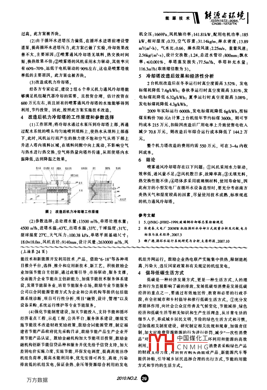 候說點環(huán)統(tǒng)能源技術(shù)電站環(huán)冰冷卻改造工翟張小寧福建省能源集團有限責任公司福建福州350001摘要電站循環(huán)水冷卻塔是利用循環(huán)水和空氣的接觸,通過蒸發(fā)作用來散去汽輪機凝汽器循環(huán)水熱量的一種設(shè)備,由于閉式循環(huán)水散熱效果好壞直接關(guān)系到凝汽器的真空,對機組效率有很大彩響。通過某電站循環(huán)水冷卻塔改逵實例,對比改造前后運行參數(shù),得出對小型電站循環(huán)水冷卻塔設(shè)備選型的一些結(jié)論。關(guān)鍵詞電站循環(huán)水冷卻塔節(jié)能降耗改造選型中圖分類號:TM6217文獻標識碼:A文章編號:1672-90642010)02-0028-02當前煤炭價格上漲燃料成本占燃煤電廠發(fā)電成本比例2改造前的噴霧通風冷卻塔達到70%以上,節(jié)能降耗,控制生產(chǎn)成本成為生產(chǎn)管理最關(guān)噴霧通風冷卻塔主要由噴霧推進霧化裝置、塔體、引風鍵的一環(huán)凝汽器真空對發(fā)電效率有極大的影響理論上,純筒、淋水篩網(wǎng)收水器凝發(fā)電廠汽輪機凝汽器真空每下降lkPa,發(fā)電效率可提高等幾部分組成(圖1%,而凝汽器真空與循環(huán)水溫度和循環(huán)倍率有極大的關(guān)1)。其工作原理是利系。循環(huán)水冷卻塔原來主要應(yīng)用在北方的缺水地區(qū),南方地用水壓能量,通過由區(qū)多采用開式循環(huán)水隨著南方地區(qū)對水資源使用的限制和旋轉(zhuǎn)霧化噴頭水室減少向河流排放廢熱的需要,南方地區(qū)特別是內(nèi)地的發(fā)電密封傳動機構(gòu)及與噴對循環(huán)水冷卻塔逐步開始推廣應(yīng)用。由于運行經(jīng)驗少,在設(shè)頭同步旋轉(zhuǎn)的風葉組備選型方面可能會出現(xiàn)一些問題本文就某電廠循環(huán)水冷卻成的噴霧推進霧化裝塔改造實例和改造前后參數(shù)對比得出南方小型電廠循環(huán)水置后,形成細小水粒冷卻塔選型方面的一些結(jié)論。霧粒,水泡,并利用噴1電廠相關(guān)背景資料及存在問題射作用能量推動葛廷某電廠是為采用煤矸石和臟雜煤等低熱值燃料資源建根葉片風機旋轉(zhuǎn),抽圖I噴霧通風冷卻塔結(jié)構(gòu)圖設(shè)的集節(jié)約能源資源綜合利用與保護環(huán)境為一體的綜合利取室外空氣,使得水用電廠。電廠裝機容量αx50Mw凝汽機組,配2臺濟南鍋爐分子與空氣進行熱量交換,從而使塔內(nèi)水溫降低,達到降溫廠生產(chǎn)的YC-2209.8-M2型煤矸石循環(huán)流化床鍋爐,汽輪之效果。其核心主要是將霧化噴頭與液力風機融為一體,兼機為武漢汽輪發(fā)電機廠生產(chǎn)的N0883535型高溫、高壓有噴霧和抽風的雙重效果。廠家介綱當水壓在016MPa時單缸凝汽式汽輪機,汽輪機凝汽器循環(huán)水冷卻塔采用2x2組特殊噴嘴的流速達到16ms左右,風筒內(nèi)風速達到235ms。噴霧通風冷卻塔。2臺機組于2006年投入商業(yè)運行。汽噴霧通風冷卻塔原設(shè)計工況參數(shù)及技術(shù)性能為:冷卻兩臺機組自投產(chǎn)以來其噴霧通風冷卻塔一直存在冷卻水量:1200mh,干球溫度:31.℃,濕球溫度:267℃,大氣壓效果差的問題:循環(huán)水出水溫度比設(shè)計值高約5-10℃,使汽力:10038kPa,進水溫度:43℃,出水溫度:33℃,溫降:△t=機熱效率下降煤耗上升;在夏季高溫時,機組只能帶90%10℃,懸浮物:20mgL,進水壓力:0.2~0.16MPa,水損:<額定負荷;每年(按設(shè)備年利用5500h計)因冷卻水溫高造成01%,噪聲:<70dB(標準測試點)。機組效率下降約1-2%,煤耗增加約2%的經(jīng)濟損失和造成3改造方案選擇夏季機組不能帶滿負荷的終濟損失約達700萬元。而且運行由于噴霧通風冷卻塔存在冷卻能力不足和故障率高的中噴霧通風冷卻塔存在故障率較高的問題嚴重影響∫機組問題,電廠決定進行技術(shù)改造并提出了幾個改造方案進行的安全經(jīng)濟運行。根據(jù)電力試驗研究院所作的噴霧通風冷卻比選:塔測試結(jié)果,分析認為造成噴霧通風冷卻塔冷卻效果差的原(1)改造為自然通風塔。優(yōu)點是效率較高且廠用電消耗因主要是風量不足,同時由于無填料氣水熱交換條件差;旋較小中國煤化工算建造自然通風塔占轉(zhuǎn)噴霧形成水流貼壁進風口淋水密度過大阻擋氣流進塔,地e致使噴霧通風冷卻塔達不到設(shè)計保證值。CNMHG足。從經(jīng)濟性方面比較,自則風度2a可界時平習費用為540萬元,費用。作者簡介:張小寧,男,1997年畢業(yè)于上海交通大學熱能動力機械與裝置專業(yè),大學學歷,工程師,現(xiàn)在福建省能源集團有限責任公司電力產(chǎn)部負責生產(chǎn)技術(shù)管理工作2010NO2源技術(shù)候源點環(huán)統(tǒng)過高。此方案被否決。機全壓:1669Pa,風機軸功率:141.8lkW配用電機功率:185(2)由于源環(huán)水進塔壓力偏低,在循環(huán)水進塔前增設(shè)管kW,相對濕度:073,空氣容重:3114kgm,淋水密度:1389道泵提高循環(huán)水進塔壓力此方案已做了實驗冷卻效果改m/(m2h),氣水比:06,淋水段風速:25ms,重量風速:善不大,主要原因:①噴霧通風冷卻塔無填料熱交換時間2.56kg(m2s),設(shè)計交換數(shù):1.24,總進水管徑:800m;飄水短換熱效果不佳:②噴霧塔的風機采用水力驅(qū)動其效率只率:≤00%,單塔蒸發(fā)損失:775m沿h,單塔補允水量有60%-70%,遠低于電機驅(qū)動的90%左右,這也是噴霧塔效163mh(取濃縮倍數(shù)為3)率低的主要原因。此方案也被否決。5冷卻塔改造后效果和經(jīng)濟性分析(3)改造成機力