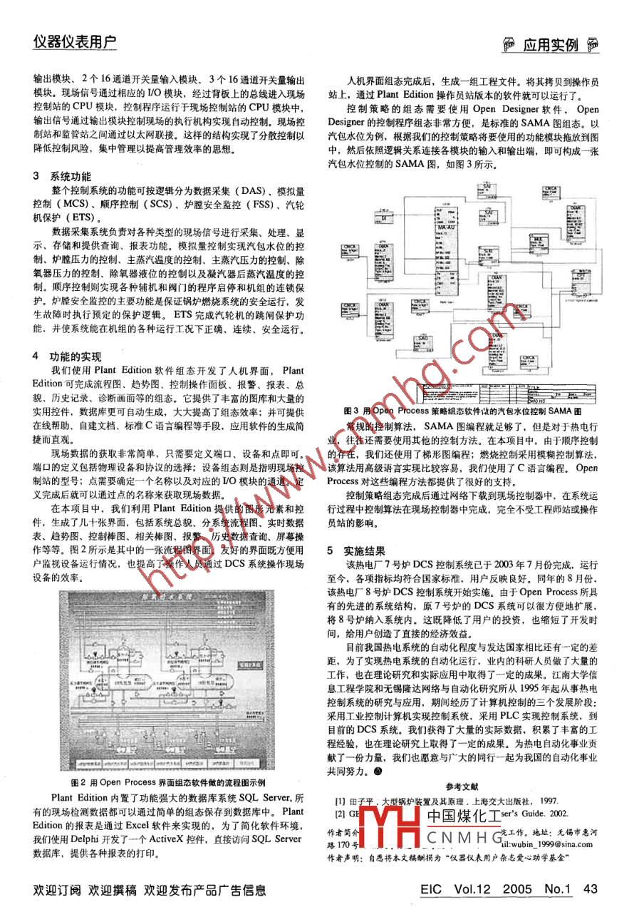 魚應(yīng)用實(shí)例盆儀器儀表用戶文章編號(hào): 1671-1041(2005)01-0042-02OpenProcess在熱電系統(tǒng)中的應(yīng)用吳濱(江南大學(xué)信息工程學(xué)院,無錫市214036)摘要:熱電企業(yè)的生產(chǎn)- -般是以供熱為主,發(fā)電為輔.熱電聯(lián)產(chǎn)具有節(jié)約能經(jīng)過對(duì)市場(chǎng)上的DCS系統(tǒng)全面的深入了解,我們選用了美國(guó)源.改薔環(huán)境、提高僕熱質(zhì)量.補(bǔ)充電力供應(yīng)等綜合效益。本文介紹了美國(guó)通用電氣公司的Open Process 開放型DCS系統(tǒng)來構(gòu)建控制系統(tǒng).通用電氣公司Open Process 開放型DCS系統(tǒng)在熱電自動(dòng)控制系統(tǒng)中的應(yīng)Open Process 系統(tǒng)是美國(guó)通用電氣公司近年推出一套DCS產(chǎn)品。它有兩個(gè)系列( PA30和PA70),包括軟件和硬件兩大部分。關(guān)鍵詞:熱電聯(lián)產(chǎn);雙爐排鏈條鍋爐: DCS: SAMA圖:機(jī)欄控制; 節(jié)硬件包括各種全金屬封裝的功能模塊; 提供物理安裝位置,內(nèi)置智約能源:環(huán)保能并行總線的背板:以及連接電纜。軟件基于Windows 2000,包括中國(guó)分類號(hào): TP273 文獻(xiàn)標(biāo)識(shí)碼: B用戶界面組態(tài)軟件( Plant Edition) 和控制策略組態(tài)軟件( OpenDesigner)。Open process's application in the通用電氣的這套DCS產(chǎn)品有其特色:它的硬件結(jié)構(gòu)簡(jiǎn)單,功thermoelectricity plant能強(qiáng)大,工藝精良,穩(wěn)定性好,具備抗電磁于擾的能力,能在各種惡劣環(huán)境下工作。軟件則獲得微軟的認(rèn)證,保證其在WindowsWU Bin(Southern Yangtze University, School of Information2000下的性能最佳,可靠性最高。內(nèi)置大型數(shù)據(jù)庫SQL Server.軟件的使用界面類似微軟的ffie 200同時(shí)提供了大量的圖形元Technology, Wuxi 214036)素供組態(tài)使用:控制組態(tài)軟件界面類似Auto CAD,其中提供了一Abstract:Thermnoelectnicity plants'production is mostly to supply steam千多個(gè)控制功能模塊供調(diào)用,也有高級(jí)語言接口。while secondarily to generate electricily. Steam-electrcily combinedproduction has a synthetially beneft of saving energy, improving系統(tǒng)結(jié)構(gòu)envircnment, advance quality of steam-supply and supplementing實(shí)際項(xiàng)目中我們選用了PA30系列的DCS產(chǎn)品。按15-20%的electic power purvey. The application of Open Process DCS氽量配制l/o模塊,選用100M的交換機(jī)構(gòu)建了一個(gè)以太網(wǎng),配置products of GE Fanuc Automation North Amerca, Inc. in thermoelectnicity sots automatic control system is introduced in this paper.了1臺(tái)工程師站、1臺(tái)操作員站。系統(tǒng)結(jié)構(gòu)如圖1所示。Key wordsteam-electnicity combined production; double-chain steamboilerDCS,SAMA char,fuzzy algorithmeconomize on energy:environmental protection1概述杭州市某熱電廠建于1993年,建廠初期的規(guī)模是1臺(tái)3St/h鍋爐和I臺(tái)汽機(jī),經(jīng)過幾年的發(fā)展,目前已擁有8臺(tái)鍋爐;同時(shí)即將建立分廠。該廠以管理嚴(yán)格。技術(shù)先進(jìn)出名,在杭州地區(qū),甚至在以上網(wǎng)浙江省都有一定的知名度。相應(yīng)地,該廠的各項(xiàng)經(jīng)濟(jì)、技術(shù)指標(biāo)都是比較高的。而投入自動(dòng)控制系統(tǒng)如果不能明顯提高指標(biāo),用戶是不會(huì)滿意的。這就要求我們?cè)谝呀?jīng)很高的指標(biāo)上進(jìn)一步提高,具有觀場(chǎng)鈔韌站相當(dāng)?shù)碾y度。系統(tǒng)的控制對(duì)象是1臺(tái)75th的雙爐排鏈條爐和1臺(tái)汽輪機(jī)現(xiàn)場(chǎng)設(shè)備組。用戶提出實(shí)現(xiàn)的自動(dòng)控制系統(tǒng)必須具備可靠性高,界面友好,4.20mA信號(hào)使用方便,維護(hù)簡(jiǎn)單,自動(dòng)控制投入率高等特點(diǎn)。主要的模擬量控藥電俱可安柴器其它能按420mA控制儲(chǔ)號(hào)的設(shè)備制指標(biāo)如下:熱電租! 汽包水位土10mm*爐膛壓力土10Pa團(tuán)1 Open Process系統(tǒng)結(jié)構(gòu)圜*主蒸汽溫度土5C工程師站和操作員站的硬件都使用了研華的工業(yè)控制計(jì)算機(jī),主蒸汽壓力土0.05MPa安裝了微軟的Windows 2000 操作系統(tǒng)。操作員站置于鍋爐控制●除氧器壓力土0.5KPa室,安裝有界面組態(tài)軟件Plant Editin的操作員站版本。完成對(duì)同時(shí)要求系統(tǒng)結(jié)構(gòu)可以很方便地?cái)U(kuò)展,因?yàn)樗麄冊(cè)? 號(hào)爐投運(yùn)。除氧器液位土5mm現(xiàn)場(chǎng)數(shù)據(jù)的監(jiān)視、數(shù)據(jù)的查詢、報(bào)表的打印,并可以通過CRT.后還要繼續(xù)擴(kuò)大生產(chǎn)規(guī)模;所有的現(xiàn)場(chǎng)數(shù)據(jù)可以按照用戶要求的格鍵盤、鼠標(biāo)對(duì)現(xiàn)場(chǎng)執(zhí)行機(jī)構(gòu)進(jìn)行遠(yuǎn)操。工程師站安放于一個(gè)獨(dú)立的式提供給該廠原有的MIS系統(tǒng),并不允許為了完成此功能而增加控制室,安裝有界面組態(tài)軟件Plant Edition的工程師站版本,及控制的十施生喻了日 胡4B比所有功能外,工程師站還可額外的軟件或硬件投資。以修中國(guó)煤化工1. D的值等。:THCN M H G°通道模擬量輸入棋塊,收稿日期: 2004-09-21個(gè)8通電熱電時(shí)伙頭、通電的心法模塊、 1個(gè)8通道模擬量42 EIC Vol.12_ 2005 No.1歡迎光臨本刊網(wǎng)站htp://www.eic.com.cn儀器儀表用戶魚應(yīng)用實(shí)例盆輸出模塊、2個(gè) 16通道開關(guān)量輸入模塊、3 個(gè)16通道開關(guān)量輸出人機