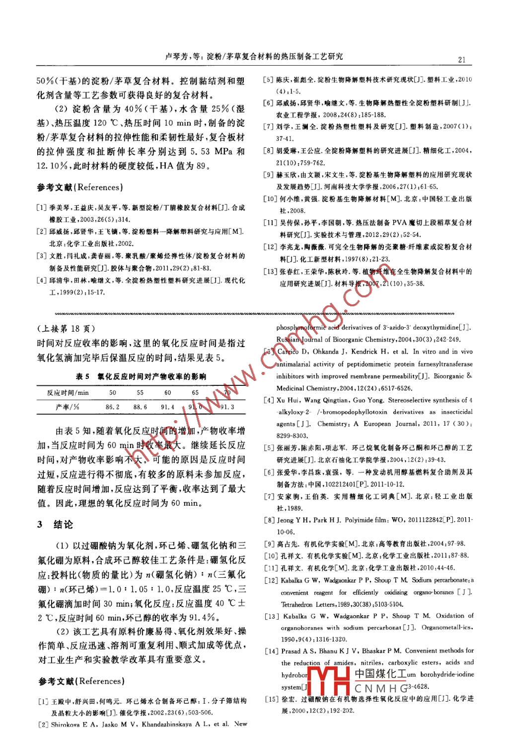 IsSN1002-4956實驗技術(shù)與管理第30卷第5期2013年5月CN11-2034/TExperimental Technology and ManagementⅤol.30No.5May.2013環(huán)已醇合成工藝的改進孔祥文,邱錦鋒(沈陽化工大學(xué)應(yīng)用化學(xué)學(xué)院,遼寧沈陽110142)摘要:以環(huán)己烯為起始原料,兩步法合成環(huán)已醇。對環(huán)已醇合成的關(guān)鍵步驟—氧化反應(yīng)的氧化劑進行了改進,考察了合成反應(yīng)的諸多因素。最佳工藝條件是:硼氫化反應(yīng)中,濃度比n(硼氫化鈉);n(三氟化硼):n(環(huán)己烯)=1.0:1.05:1.0,三氟化硼滴加時間30min;氧化反應(yīng)中,氧化反應(yīng)溫度(40℃±2℃),反應(yīng)時間60min。工藝經(jīng)改進后,產(chǎn)物的收率達到91.4%關(guān)鍵詞:環(huán)己醇;環(huán)己烯;合成工藝;硼氫化中圖分類號:0624.3-33文獻標志碼:B文章編號:1002-4956(2013)05-0017-03Improvement of synthesis of cyclohexanolKong Xiangwen, Qiu Jingfeng(Applied Chemistry College, Shenyang University of Chemical Technology, Shenyang 110142, China)Abstract: As an important organic chemical material, cyclohexanol is widely used in preparation of adipic acidand caprolactam. Cyclohexanol is synthesized from cyclohexene as raw material by two-step reactions. Theoxdiant in the key step of oxidation reaction is improved. The influence of some factors on the synthesisprocess is studied, The optimal reaction conditions are chosen that the molar ratio of sodium borohydride andboron trifluoride, and cyclohexene is 1.0: 1. 05: 1.0, the dropping addition of boron trifluoride is 30 min for thehydroboration; the reaction temperature is (40 C+2 C), the reaction time is 60 min for the oxidationreaction. Under the optimal reaction conditions, the yield of cyclohexanol could reached a level of 91. 4%, whichis 9. 8% higher than beforeKey words: cyclohexanol; cyclohexene synthesis: hydroboration環(huán)己醇是一種非常重要的有機化工原料,是合成采用改進的硼氫化氧化法01合成環(huán)己醇,考察了合已二酸、己內(nèi)酰胺以及醫(yī)藥23、農(nóng)藥、染料等精成反應(yīng)的影響因素,確定了反應(yīng)的優(yōu)化條件。細化學(xué)品的重要中間體,也可用作燃料助劑n。近年來科學(xué)家研究發(fā)現(xiàn)以環(huán)已醇為原料合成的聚酰亞胺1實驗薄膜具有很好的透明度、極佳的導(dǎo)電性能,在導(dǎo)電薄1.1主要試劑與儀器膜、二極管晶體及印刷電路基板中都有廣泛的作用。試劑:環(huán)己烯,硼氫化鈉,三氟化硼-乙醚絡(luò)合物,環(huán)己醇的制備是有機化學(xué)實驗中的一個基本合成實四氫呋喃過硼酸鈉,無水硫酸鎂(分析純,國藥集團化驗,傳統(tǒng)的制備方法是環(huán)已酮被異丙醇鋁還原然后學(xué)試劑有限公司)在酸性條件下水解合成,但該方法反應(yīng)時間冗長、操作儀器:FT-IR470型紅外光譜儀,WAY-2S數(shù)字阿繁項、原料價格昂貴、對生產(chǎn)設(shè)備要求高,并且產(chǎn)生大貝折射儀,ARX300型HNMR波譜儀量的廢酸,危害生態(tài)環(huán)境。本文以過硼酸鈉為氧化劑,1.2環(huán)己醇的合成收稿日期:2012-08-26修改日期:2012-11-11在裝有攪拌、恒壓滴液漏斗及溫度計的250mL基金項目遼寧省教育科學(xué)“十一五”規(guī)劃立項課題高校精品課程建設(shè)三口瓶中,加人0.65g(0.016mo)粉狀硼氫化鈉、的理論與實踐研究(Go9DB12);遼寧省教育廳高等學(xué)???.1g(0.05mol)環(huán)己烯、25mL四氫呋喃,攪拌,用水學(xué)研究項目(202092009)浴將反應(yīng)物中國煤化工籬液漏斗中加入作者簡介:孔祥文(1962-),男,江西九江,博士,教投,碩士生導(dǎo)師,主2.6mL(2CNMHG和5mL四氫呋要從事有機化學(xué)教學(xué)和有機合成研究工作E-mail:kxwwz12168@163.com喃,混合均勻,極緩慢地滴入三口瓶中,30min內(nèi)滴完,保溫攪拌30min;反應(yīng)完成后,從滴液漏斗慢慢滴實驗技術(shù)與管理入5mL水,約10min滴完,繼續(xù)攪拌10min;升溫至25℃、三氟化硼滴加時間為30min、氧化反應(yīng)溫度為40℃±2℃,緩慢滴加5mL過硼酸鈉(5g,0.05mo)40℃、氧化反應(yīng)時間為60min的實驗條件下,考察了水溶液,控制加入速度,以便反應(yīng)放出的熱使溫度保持三氟化硼的加入量對反應(yīng)的影響,結(jié)果見表在40℃±2℃,約25min加完,保溫攪拌60min,停表2硼氫化鈉與三氟化硼摩爾比對產(chǎn)物收率的影響止加熱;用冷水將反應(yīng)物冷卻至室溫,加入氯化鈉飽和n(A):n(B)1:0.91:11:1.051:1.11:1.15溶液,分出有機層;水層用10mL四氫呋喃萃取,分出產(chǎn)率/%有機層;再合并有機層;用20mL飽和氯化鈉水溶液注:A為硼氫化鈉;B為三氟化硼。洗兩次,分出有機層,用無水硫酸鎂干燥;干燥后的溶液用水浴加熱蒸去溶劑,將殘留液(黃色,約10mL)移由表2知,隨著三氟化硼比例的增加,產(chǎn)物收率先入50mL蒸餾瓶中加熱蒸餾收集150~159℃餾升,且摩爾比達到1.0:1.05以后產(chǎn)物收率趨于平穩(wěn)分;產(chǎn)物為具有似樟腦氣味的無色透明油狀液體,沸點其可能的原因是三氟化硼過量,加速了反應(yīng),一段時間為155℃。其紅外光譜圖譜與標準圖譜完全一致。以后,反應(yīng)趨于平衡,收率達到了最高值。因此,確定最佳摩爾比為1.0:1.05。2結(jié)果與分析2.3三氟化硼滴加時間對收率的影響2.1氧化劑的選擇硼氫化反應(yīng)是一個劇烈的放熱反應(yīng),因此三氟化對過硼酸鈉NaBO(SPB)過氧化氫H2O2和次硼的滴加速度直接影響反應(yīng)進程,影響環(huán)己醇的收率。氯酸鈉NaCO1-3種氧化劑進行了實驗且對H2O2/取硼氫化鈉與三氟化硼摩爾比為1.0:1.05,環(huán)己烯NaOH和H2O2/Na2QCO31體系做