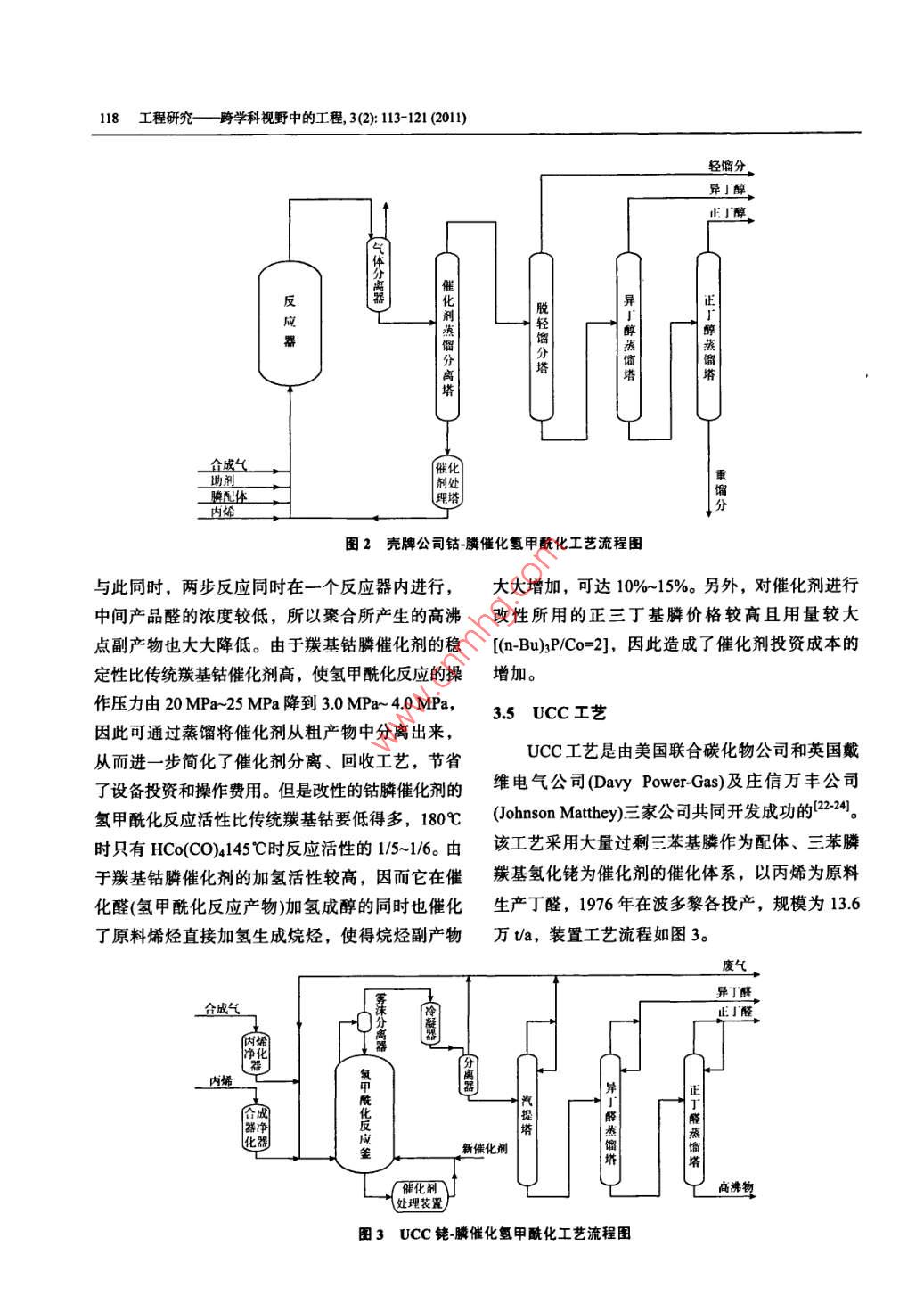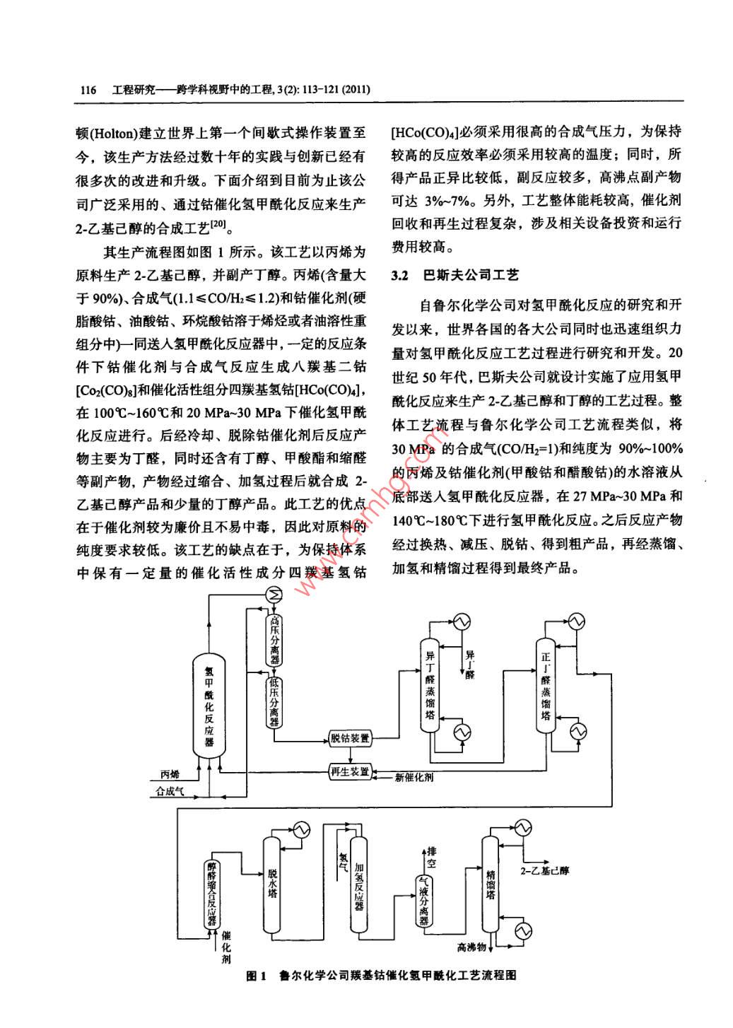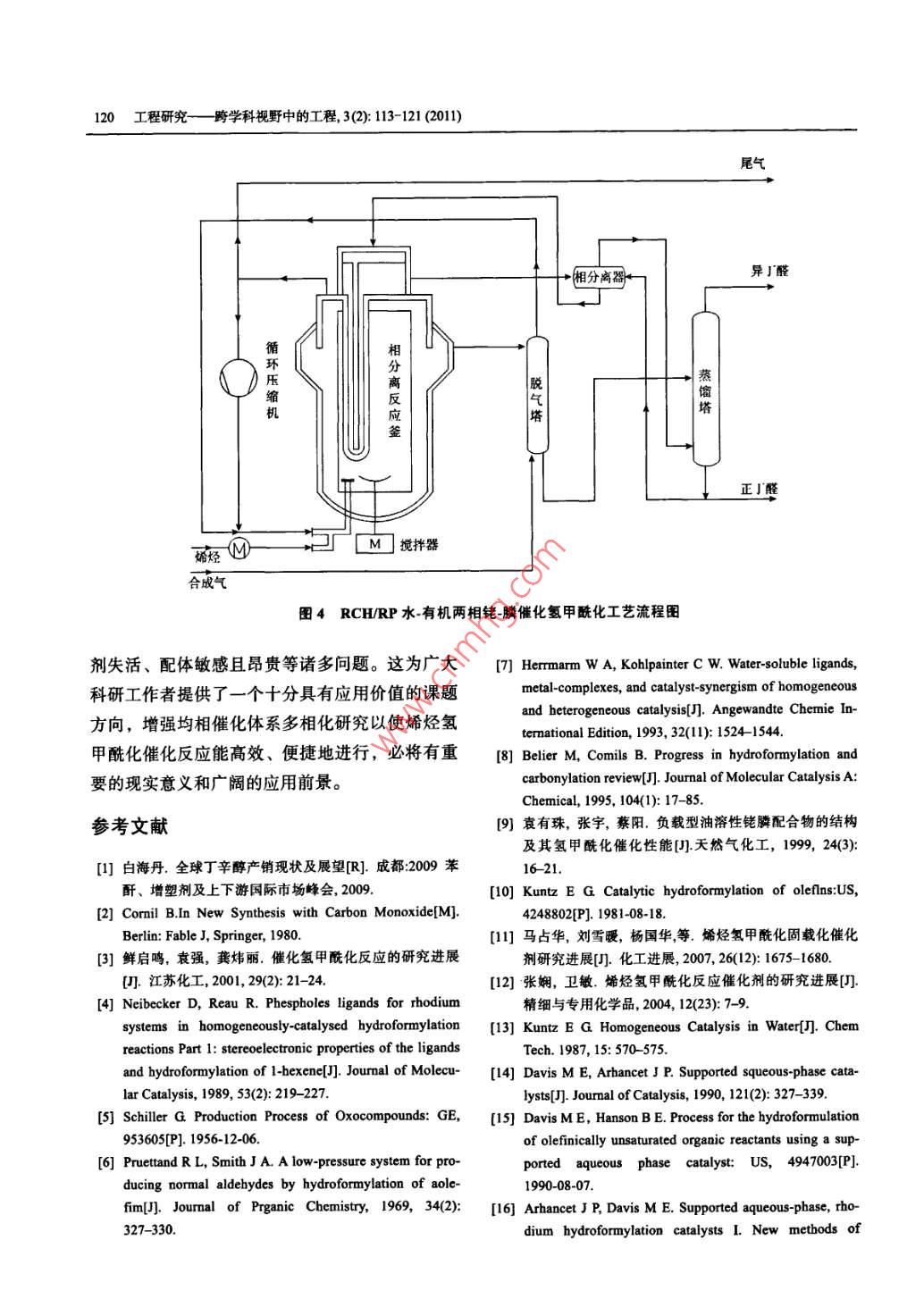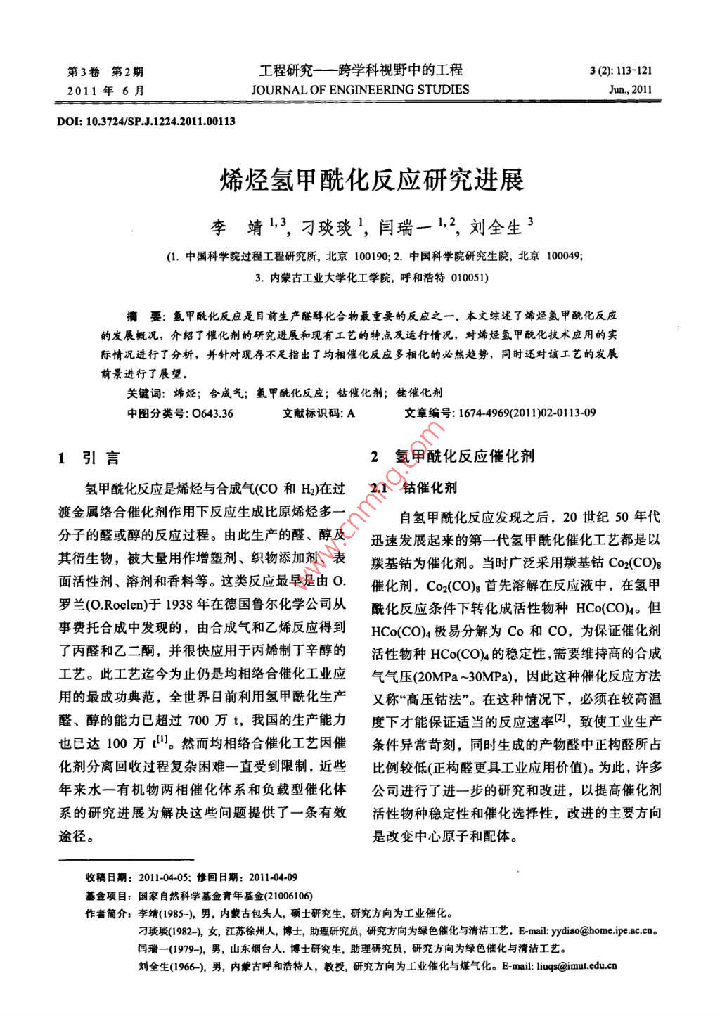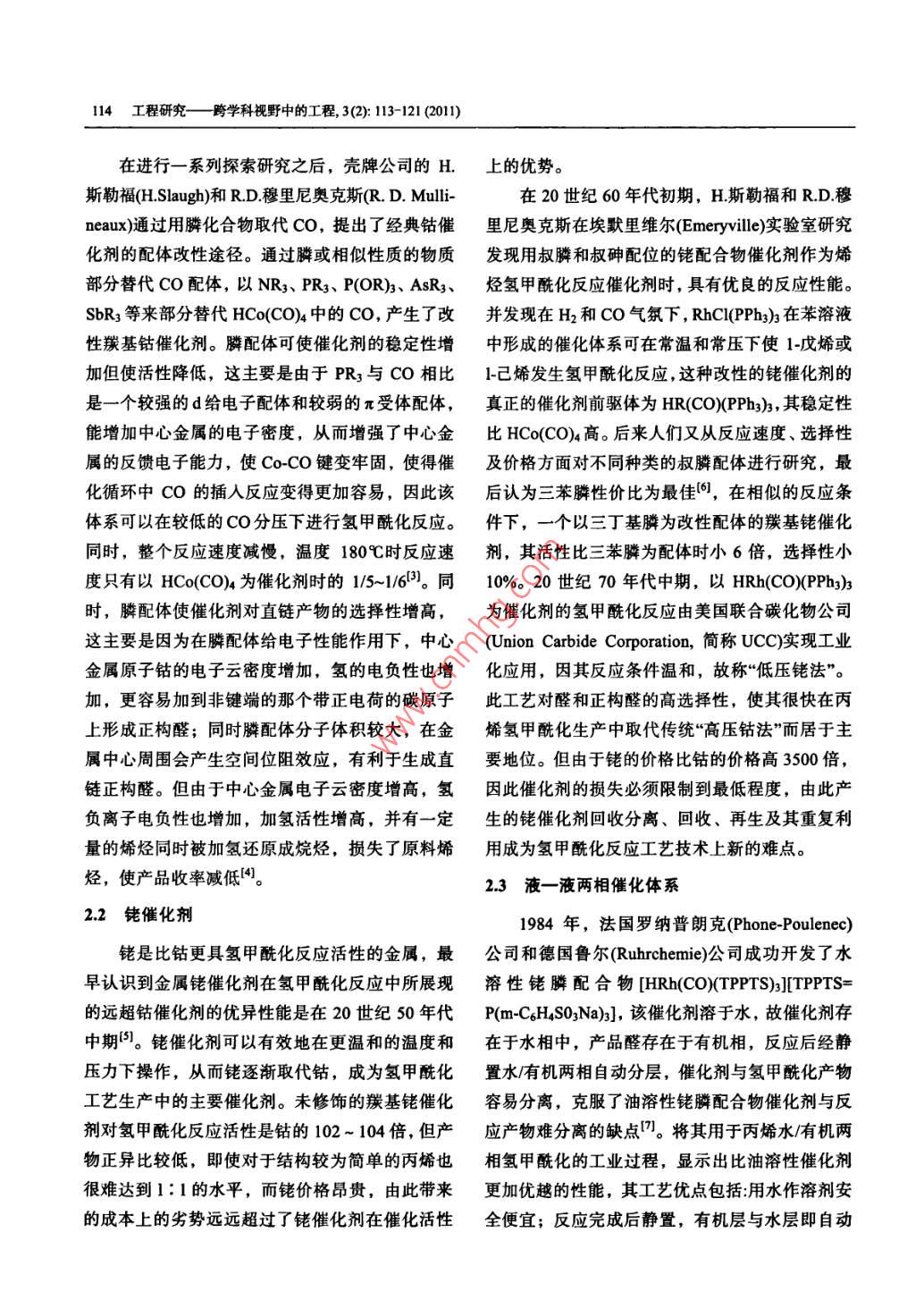 第3卷第2期工程研究一跨學(xué)科 視野中的工程3 (2): 113-1212011年6月JOURNAL OF ENGINEERING STUDIESJun, 2011DOI: 10.3724/SP.J.1224.2011.00113烯烴氫甲?;磻?yīng)研究進(jìn)展李靖1,3,刁琰琰',閆瑞一1,2,劉全生3(1.中國科學(xué)院過程工程研究所,北京100190; 2.中國科學(xué)院研究生院,北京100049;3.內(nèi)蒙古工業(yè)大學(xué)化工學(xué)院,呼和浩特010051)摘要:氫甲?;磻?yīng)是目前生產(chǎn)醛醇化合物最重要的反應(yīng)之一.本文綜述了烯烴氫甲?;磻?yīng)的發(fā)展概況,介紹了催化劑的研究進(jìn)展和現(xiàn)有工藝的特點(diǎn)及運(yùn)行情況,對(duì)烯烴氫甲?;夹g(shù)應(yīng)用的實(shí)際情況進(jìn)行了分析,并針對(duì)現(xiàn)存不足指出了均相催化反應(yīng)多相化的必然趨勢(shì),同時(shí)還對(duì)該工藝的發(fā)展前景進(jìn)行了展望.關(guān)鍵詞:烯烴;合成氣;氫甲?;磻?yīng);鈷催化劑;銠催化劑中圖分類號(hào): 0643.36文獻(xiàn)標(biāo)識(shí)碼: A文章編號(hào): 1674-4969(201 1)02-0113-091引言2氫甲 ?;磻?yīng)催化劑氫甲?;磻?yīng)是烯烴與合成氣(CO和H)在過2.1鈷催化劑渡金屬絡(luò)合催化劑作用下反應(yīng)生成比原烯烴多一自氫甲?;磻?yīng)發(fā)現(xiàn)之后,20世紀(jì)50年代分子的醛或醇的反應(yīng)過程。由此生產(chǎn)的醛、醇及迅速發(fā)展起來的第- -代氫甲?;呋に嚩际且云溲苌铮淮罅坑米髟鏊軇?、織物添加劑、表羰基鈷為催化劑。當(dāng)時(shí)廣泛采用羰基鈷Co2(CO)g面活性劑、溶劑和香料等。這類反應(yīng)最早是由O.催化劑, Co2(CO)s 首先溶解在反應(yīng)液中,在氫甲羅蘭(O.Roelen)于1938 年在德國魯爾化學(xué)公司從?;磻?yīng)條件下轉(zhuǎn)化成活性物種HCo(CO)4。 但事費(fèi)托合成中發(fā)現(xiàn)的,由合成氣和乙烯反應(yīng)得到HCo(CO)4極易分解為Co和CO,為保證催化劑了丙醛和乙二酮,并很快應(yīng)用于丙烯制丁辛醇的活性物種HCo(CO)4的穩(wěn)定性,需要維持高的合成工藝。此工藝迄今為止仍是均相絡(luò)合催化工業(yè)應(yīng)氣氣壓(20MPa ~-30MPa),因此這種催化反應(yīng)方法用的最成功典范,全世界目前利用氫甲?;a(chǎn)又 稱“高壓鈷法”。在這種情況下,必須在較高溫醛、醇的能力已超過700萬t, 我國的生產(chǎn)能力度下才能保證適當(dāng)?shù)姆磻?yīng)速率[2],致使工業(yè)生產(chǎn)也已達(dá)100 萬"。然而均相絡(luò)合催化工藝因催條件異??量?,同時(shí)生成的產(chǎn)物醛中正構(gòu)醛所占化劑分離回收過程復(fù)雜困難一直受到限制, 近些比例較低(正構(gòu)醛更具工業(yè)應(yīng)用價(jià)值)。為此,許多年來水一有機(jī)物兩相催化體系和負(fù)載型催化體公司進(jìn)行了進(jìn)--步的研究和改進(jìn),以提高催化劑系的研究進(jìn)展為解決這些問題提供了一條有效活性物種穩(wěn)定性和催化選擇性,改進(jìn)的主要方向途徑。是改變中心原子和配體。收稿日期: 2011-04-05; 修回日期: 2011-04-09基金項(xiàng)目:國家自然科學(xué)基金青年基金(21006106)作者簡(jiǎn)介:李靖(1985-), 男,內(nèi)蒙古包頭人,碩士研究生,研究方向?yàn)楣I(yè)催化。刁琰瑣(1982-),女,江蘇徐州人博土,助理研究員,研究方向?yàn)榫G色催化與清潔工藝,E-mail: yydiao@home.ipe.ac.cn.閆瑙- -(1979-),男,山東煙臺(tái)人,博士研究生,助理研究員,研究方向?yàn)榫G色催化與清潔工藝。劉全生(1966-),男,內(nèi)蒙古呼和浩特人,教授,研究方向?yàn)楣I(yè)催化與煤氣化。E-mail: liuqs@imut.edu.cn114工程研究-跨學(xué)科視野中的工程, 3(2): 113-121 (2011)在進(jìn)行一-系列探索研究之后,殼牌公司的H.上的優(yōu)勢(shì)。斯勒福(H.Slaugh)和R.D.穆里尼奧克斯(R. D. Mulli-在20世紀(jì)60年代初期,H.斯勒福和R.D.穆neaux)通過用膦化合物取代CO,提出了經(jīng)典鈷催里尼奧克斯在埃默里維爾(Emeryville)實(shí)驗(yàn)室研究化劑的配體改性途徑。通過膦或相似性質(zhì)的物質(zhì)發(fā)現(xiàn)用叔膦和叔砷配位的銠配合物催化劑作為烯部分替代CO配體,以NR3、PR3、P(OR)3、AsR3、烴氫甲酰化反應(yīng)催化劑時(shí),具有優(yōu)良的反應(yīng)性能。SbR3等來部分替代HCo(CO)4中的CO,產(chǎn)生了改并發(fā)現(xiàn)在 H2和CO氣氛下, RhCl(PPh3)3在苯溶液性羰基鈷催化劑。膦配體可使催化劑的穩(wěn)定性增中形成的催化體系可在常溫和常壓下使1-戊烯或加但使活性降低,這主要是由于PRs與CO相比1-己烯發(fā)生氫甲酰化反應(yīng),這種改性的銠催化劑的是一個(gè)較強(qiáng)的d給電子配體和較弱的π受體配體,真正 的催化劑前驅(qū)體為HR(CO)(PPh3)3,其穩(wěn)定性能增加中心金屬的電子密度,從而增強(qiáng)了中心金比HCo(CO)4高。后來人們又從反應(yīng)速度、選擇性屬的反饋電子能力,使Co-CO鍵變牢固,使得催及價(jià)格方面對(duì)不同種類的叔膦配體進(jìn)行研究,最化循環(huán)中CO的插人反應(yīng)變得更加容易,因此該后認(rèn)為三苯膦性價(jià)比為最佳(6,在相似的反應(yīng)條體系可以在較低的CO分壓下進(jìn)行氫甲?;磻?yīng)。件下, 一個(gè)以三T基膦為改性配體的羰基銠催化同時(shí),整個(gè)反應(yīng)速度減慢,溫度180C時(shí)反應(yīng)速劑,其活性比三苯膦為配體時(shí)小6倍,選擇性小度只有以HCo(CO)4為催化劑時(shí)的1/5~16)。 同10%。 20 世紀(jì)70年代中期,以HRh(CO)PPb3)3時(shí),膦配體使催化劑對(duì)直鏈產(chǎn