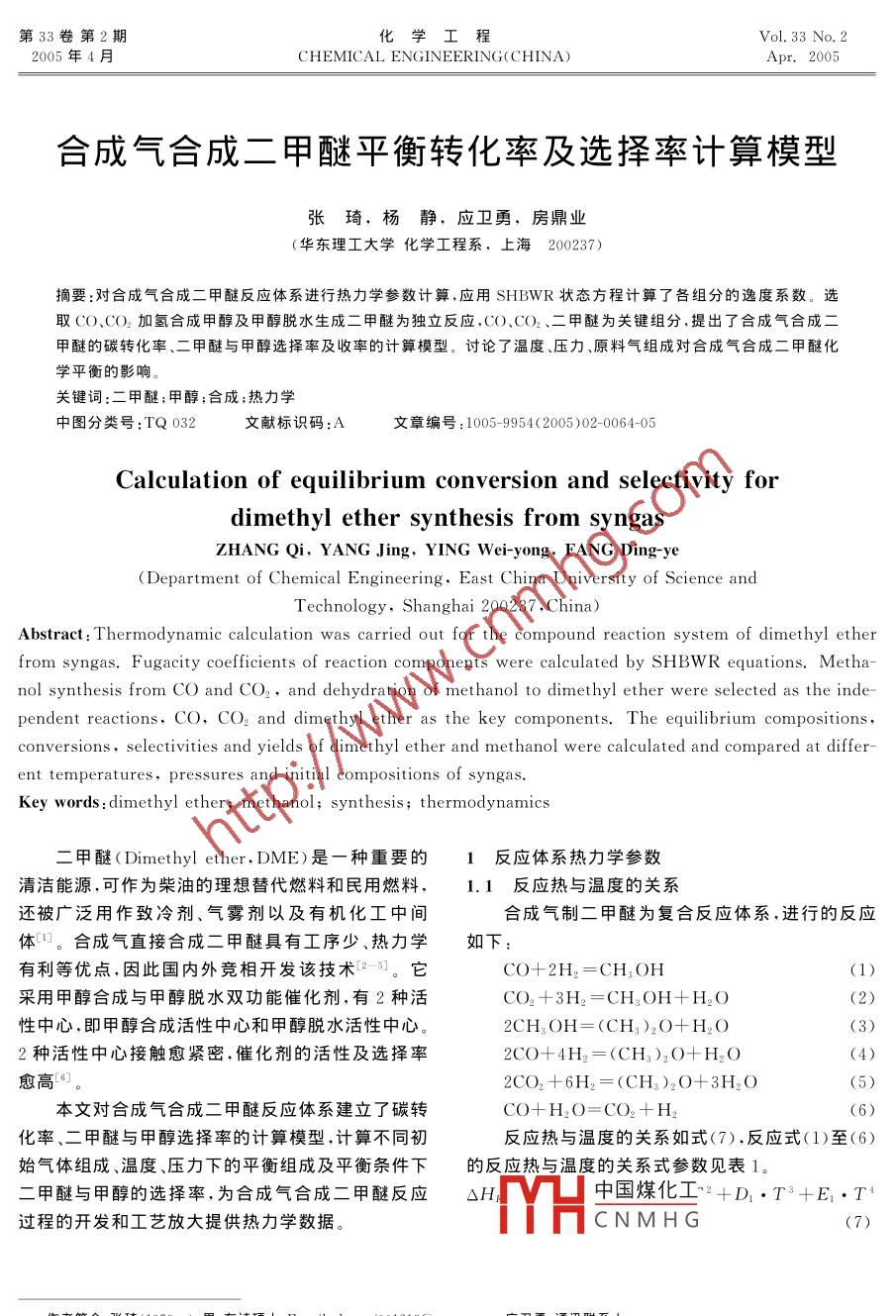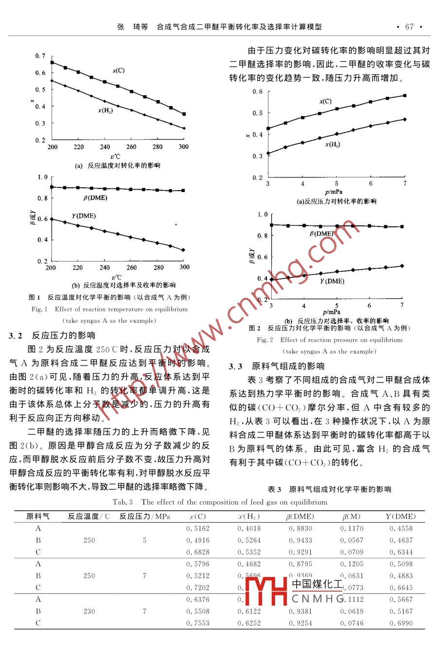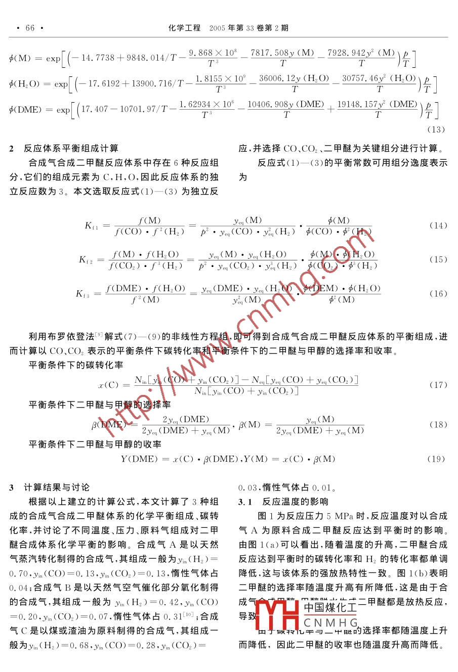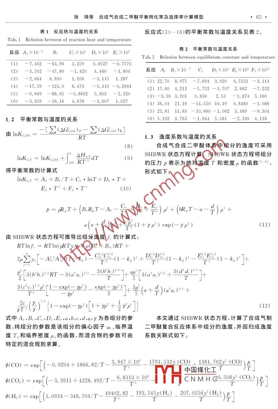 合成氣合成二甲醚平衡轉(zhuǎn)化率及選擇率計(jì)算模型