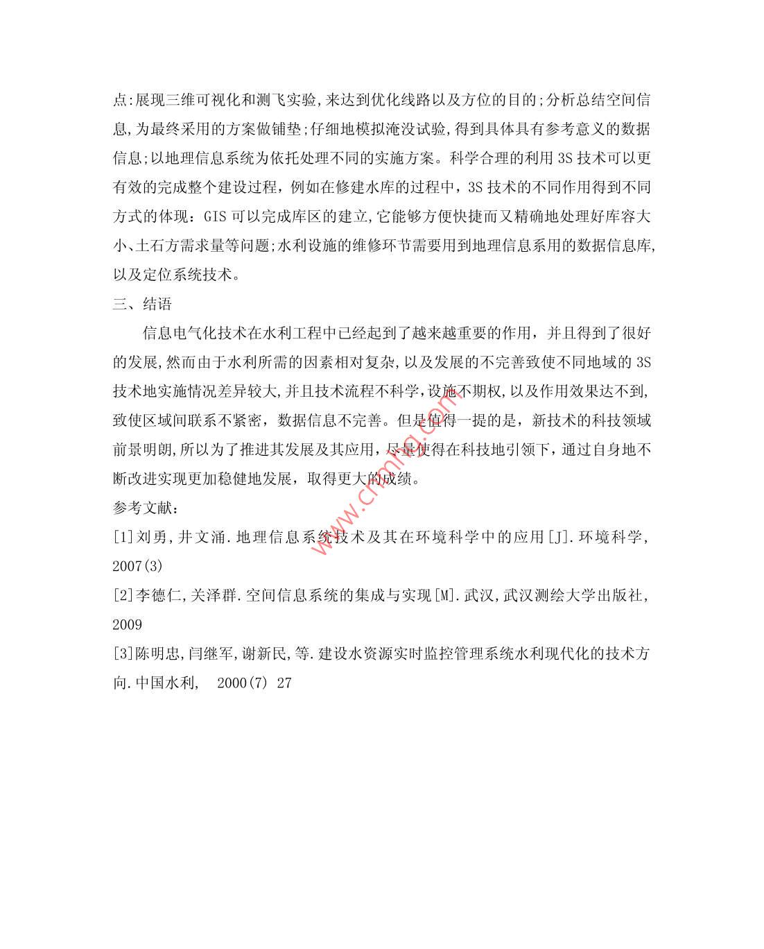 水利工程中信息電氣化技術(shù)的應(yīng)用俞陽(yáng)南京河海南自水電自動(dòng)化有限公司江蘇 南京210032摘要:文章通過(guò)在詮釋遙感技術(shù)(RS)、地理信息系統(tǒng)(GIS)、全球定位導(dǎo)航系統(tǒng)(GPS)、自動(dòng)化集成技術(shù)的基礎(chǔ)上,對(duì)上述技術(shù)在水利工程方面的應(yīng)用,諸如在防洪抗洪、水土保持、合理利用水源等所起到的作用。信息電氣化逐步成為主流科技,并在我國(guó)的水利事業(yè)以及提升我國(guó)經(jīng)濟(jì)發(fā)展速度發(fā)揮著越來(lái)越重要的作用。關(guān)鍵詞:信息電氣化技術(shù);水利工程;應(yīng)用;中圖分類號(hào): TV文獻(xiàn)標(biāo)識(shí)碼: A文 章編號(hào):-一、現(xiàn)狀與概念科技實(shí)力的不斷提升,使得信息電氣化逐步走入人們的視野。并且電氣自動(dòng)化作用的不斷提高,對(duì)我國(guó)人民的生產(chǎn)生活做出了不可替代的貢獻(xiàn)。其中水利作為其“受益者”,在信息電氣化技術(shù)不斷提高的今天,也得到了長(zhǎng)足發(fā)展。電器信息化帶動(dòng)水利行業(yè)的發(fā)展也是當(dāng)務(wù)之需。隨著計(jì)算機(jī)科技、通信技術(shù)、地理信息系統(tǒng)、遙感技術(shù)、全球定位系統(tǒng)、自動(dòng)化集成等技術(shù)地成熟,水利工程的信息化應(yīng)用系統(tǒng)也相應(yīng)發(fā)展。在排澇除險(xiǎn)、合理利用水源、爆出水土保持等方面作用顯著。信息是水利工程以及相關(guān)監(jiān)管程序都需要信息,這就需要相關(guān)水利部門以及信息行業(yè)對(duì)水利情況進(jìn)行及時(shí)地收集與處理,而在所需的技術(shù)中,上述的3S技術(shù)起到了至關(guān)重要的作用,他可以科學(xué)收集、歸納信息,人們可以更加從容地應(yīng)對(duì)水利過(guò)程中所發(fā)生的各種問(wèn)題,方便快捷。將主動(dòng)權(quán)握于手中,遙感技術(shù)、地理信息系統(tǒng)、全球定位導(dǎo)航系統(tǒng)、自動(dòng)化集成技術(shù)已經(jīng)成為不可缺少的科技力量作用于水利建設(shè)。1.遙感技術(shù)RS從二十世紀(jì)中葉新興起來(lái),它的具體含義是通過(guò)高度足夠大的空間等,利用電磁波探測(cè)儀對(duì)所需對(duì)象拍攝、掃描以及感應(yīng)以及后續(xù)分析,了解地表信息,諸如體表外觀、周圍環(huán)境等元素。遙感技術(shù)能夠在不觸及物體的請(qǐng)康下獲取其所需信息,之后開(kāi)始?xì)w納分析出對(duì)具有利用價(jià)值的信息。2.地理信息系統(tǒng)GIS主要是指信息管理,它的主要作用是處理地理信息與環(huán)境, GIS系統(tǒng)必須要使用微機(jī)的硬件系統(tǒng)才可以更穩(wěn)健地收集信息、解決問(wèn)題、相關(guān)咨詢、應(yīng)用處理。另外一點(diǎn),GIS綜合其他因素,幫助使用主體解決較發(fā)雜的問(wèn)題。例如在水利行業(yè)中,處理相關(guān)建筑問(wèn)題時(shí),信息化系統(tǒng)通過(guò)地理信息系統(tǒng)為依托,及時(shí)地起到幫助作用,是一種效率極高的技術(shù)。3.全球?qū)Ш较到y(tǒng)能夠不間斷地測(cè)量距離以及確定時(shí)間的系統(tǒng)便是全球?qū)Ш较到y(tǒng),即GPS。它的流程是通過(guò)外層衛(wèi)星接受采集到的相關(guān)信息,并計(jì)算載體速度、時(shí)間以及提供所處位置的精確坐標(biāo),更關(guān)鍵的一點(diǎn)是物品的屬性也可以被鑒定出來(lái)。在水利工程中GPS系統(tǒng)也得到了光桿的應(yīng)用,例如可以對(duì)水深的精確測(cè)量,探究水勢(shì)以及水文特征、監(jiān)督管理工程建筑、及時(shí)處理險(xiǎn)情等。4.自動(dòng)化集成技術(shù)將以上不同的科技在通過(guò)數(shù)據(jù)信息進(jìn)行連接的,并且合理配合,將其功能相融合便組成了自動(dòng)化集成技術(shù),因?yàn)檫@三類技術(shù)的外語(yǔ)名稱為RS、GIS、 GPS, 所以該組合- -般被稱為3S技術(shù)。3S技術(shù)可以發(fā)揮更大的作用,作用空間也有所擴(kuò)展。3S技術(shù)既具有其不可比擬的特質(zhì),作用效果顯著,并且能夠科學(xué)合理地使系統(tǒng)有條不.紊地工作,處理諸多相對(duì)復(fù)雜的水利建設(shè)難題。在不斷操作的過(guò)程中,.上述技術(shù)彼此作用,互為依托。二、水利行業(yè)中信息電氣化技術(shù)的作用1.預(yù)防洪澇,排除險(xiǎn)情在排除洪澇隱患的不同環(huán)節(jié)上3S技術(shù)都有著重要的作用:例如在提前預(yù)測(cè)過(guò)程,它通過(guò)對(duì)具體的現(xiàn)象進(jìn)行分析得到問(wèn)題的相關(guān)信息,因而通過(guò)3S技術(shù)可以組建信息數(shù)據(jù)系統(tǒng),既能夠準(zhǔn)確預(yù)測(cè)險(xiǎn)情,又能夠在對(duì)以往洪澇信息的總結(jié)處理中不斷形成模型。在抗洪救災(zāi)時(shí),地理信息系統(tǒng)的重要作用可以發(fā)揮出來(lái),空間分析可以作用于水域地表,組建理論模型。并綜合預(yù)測(cè)以及及時(shí)得到的水下情況,對(duì)將要發(fā)生的水勢(shì)以及汛期等做出一定的預(yù)測(cè),得到所需的結(jié)果,將險(xiǎn)情的不同區(qū)域以及不同的災(zāi)害面積更加系統(tǒng)的展現(xiàn);其后在利用遙感技術(shù)的作用下,及時(shí)有效地把握整個(gè)澇災(zāi)地動(dòng)態(tài),并通過(guò)全球定位系統(tǒng)進(jìn)行詳細(xì)鎖定,因此整個(gè)水災(zāi)的發(fā)生以及災(zāi)區(qū)的相