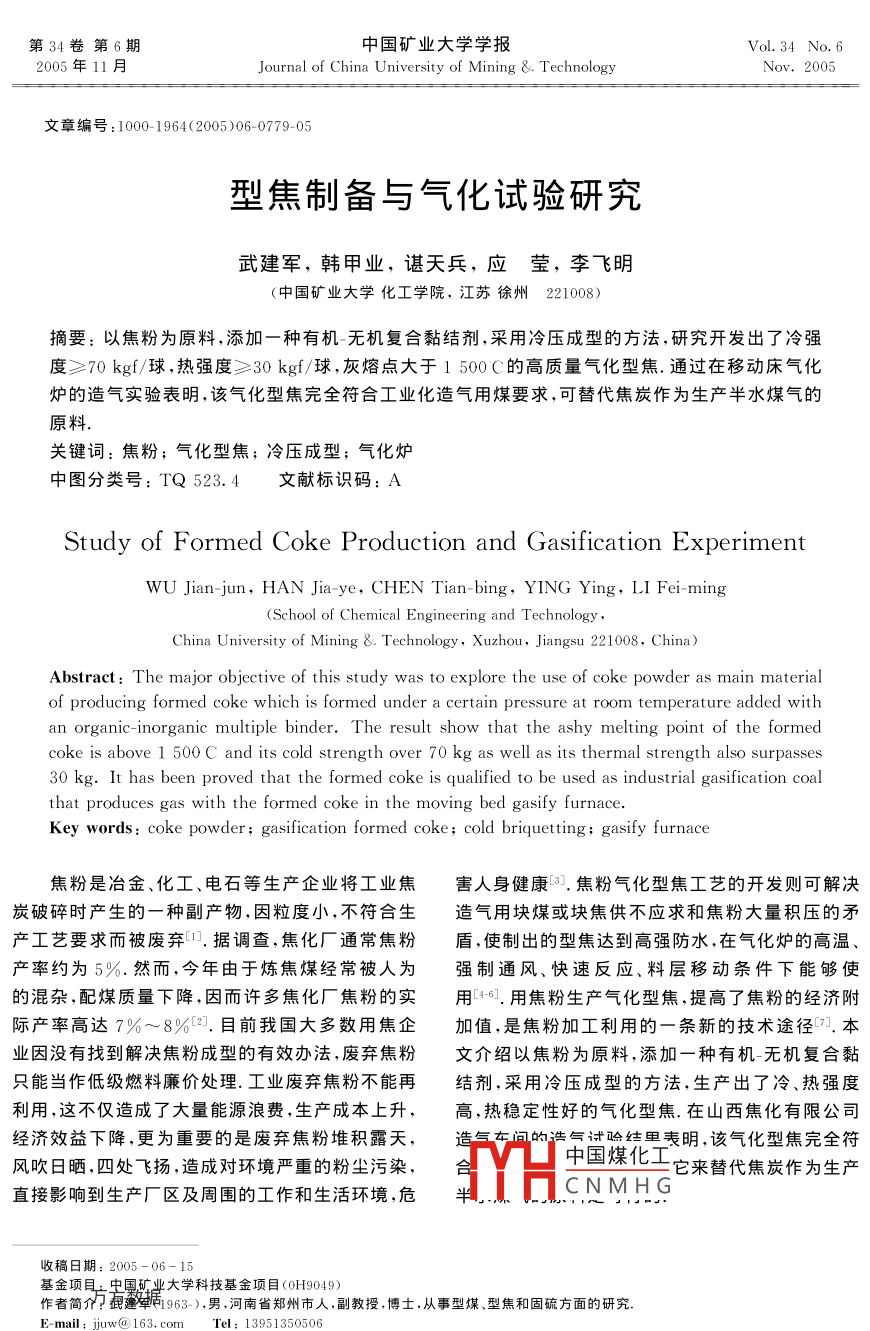 第34卷第6期中國礦業(yè)大學學報Vol 34 No 62005年11月Journal of China University of Mining & TechnologOV文章編號:1000-1964(2005)06-0779-05型焦制備與氣化試驗研究武建軍,韓甲業(yè),諶天兵,應瑩,李飛明(中國礦業(yè)大學化工學院,江蘇徐州221008)摘要:以焦粉為原料,添加一種有機-無機復合黏結劑,采用冷壓成型的方法,研究開發(fā)出了冷強度≥70kgf/球,熱強度≥30kgf/球,灰熔點大于1500C的高質(zhì)量氣化型焦通過在移動床氣化爐的造氣實驗表明,該氣化型焦完全符合工業(yè)化造氣用煤要求,可替代焦炭作為生產(chǎn)半水煤氣的原料.關鍵詞:焦粉;氣化型焦;冷壓成型;氣化爐中圖分類號:TQ523.4文獻標識碼:AStudy of Formed Coke Production and Gasification ExperimentWU Jian-jun, hAn Jia-ye, CHEN Tian-bing, YING Ying, LI Fei-ming(School of Chemical Engineering and Technologyhina University of Mining & Technology, Xuzhou, Jiangsu 221008, ChinaAbstract: The major objective of this study was to explore the use of coke powder as main materiaof producing formed coke which is formed under a certain pressure at room temperature added withan organic-inorganic multiple binder. The result show that the ashy melting point of the formedcoke is above 1 500C and its cold strength over 70 kg as well as its thermal strength also surpasseskg. It has been proved that the formed coke is qualified to be used as industrial gasification coalbed gasify furnaceKey words: coke powder; gasification formed coke; cold briquetting; gasify furnace焦粉是冶金、化工、電石等生產(chǎn)企業(yè)將工業(yè)焦害人身健康③.焦粉氣化型焦工藝的開發(fā)則可解決炭破碎時產(chǎn)生的一種副產(chǎn)物,因粒度小,不符合生造氣用塊煤或塊焦供不應求和焦粉大量積壓的矛產(chǎn)工藝要求而被廢棄.據(jù)調(diào)查,焦化廠通常焦粉盾,使制出的型焦達到高強防水,在氣化爐的高溫、產(chǎn)率約為5%.然而,今年由于煉焦煤經(jīng)常被人為強制通風、快速反應、料層移動條件下能夠使的混雜,配煤質(zhì)量下降,因而許多焦化廠焦粉的實用6.用焦粉生產(chǎn)氣化型焦,提高了焦粉的經(jīng)濟附際產(chǎn)率高達7%~8%2.目前我國大多數(shù)用焦企加值,是焦粉加工利用的一條新的技術途徑.本業(yè)因沒有找到解決焦粉成型的有效辦法,廢棄焦粉文介紹以焦粉為原料,添加一種有機-無機復合黏只能當作低級燃料廉價處理.工業(yè)廢棄焦粉不能再結劑,采用冷壓成型的方法生產(chǎn)出了冷、熱強度利用,這不僅造成了大量能源浪費,生產(chǎn)成本上升,高,熱穩(wěn)定性好的氣化型焦.在山西焦化有限公司經(jīng)濟效益下降,更為重要的是廢棄焦粉堆積露天,的諧氣嶠結里表明,該氣化型焦完全符風吹日曬,四處飛揚,造成對環(huán)境嚴重的粉塵污染中國煤化工它來替代焦炭作為生產(chǎn)直接影響到生產(chǎn)廠區(qū)及周圍的工作和生活環(huán)境,危RYCNMHG收稿日期:基金項P影業(yè)大學科技基金項目(H949作者簡3-),男,河南省鄭州市人,副教授,博士,從事型煤、型焦和固硫方面的研究780中國礦業(yè)大學學報第34卷原料制備及工藝方案成型水分:10%~14%型煤干重:(30±1)g/個1原料制備干燥條件:105C(2h);焦粉,破碎至3mm以下;成型溫度:室溫;風化煤,粉碎至177m以下;摻混時間:10~15min黏土,粉碎至125gm以下2.2黏結劑對型焦質(zhì)量的影響實驗用粉分析見表1型煤的熱穩(wěn)定性是指型煤在高溫燃燒或氣化表1試驗用粉工業(yè)分析過程中對熱的耐受程度,即型煤在高溫作用下保持Table 1 Proximate anal ysis of coke powder原來形狀的性質(zhì)0.型焦的熱穩(wěn)定性是影響型焦名稱造氣效果的關鍵因素,而黏結劑在粉焦成型的過程83.32中起著非常重要的作用,不同的黏結劑對同一種原2工藝方案料煤具有不同的黏結效果,同一種黏結劑的不同添粉焦成型工藝見圖1加量對同一種原料煤也具有不同的黏結效果.基于□匾四【四這個理,同冶粉,通過使用不同的粘結涼干叫澤翩定溶解律,為最終確定氣化型焦生產(chǎn)配方提供理論基礎向聞南威座2.2.1Y3黏結劑對型焦冷熱強度的影響制備[制備從圖2可以觀察到:型煤的冷強度隨著Y3配比的增加而明顯提高,Y3的添加量對型煤冷強度的影響很明顯,在不加Y3時型煤的冷強度很低,成型仟千燥入爐造氣當Y3的配比大于2%時型煤的冷強度就達到粉焦成型工藝流程99%以上,但當配比大于4%時,變化就不明顯了;Fig1 Processof coke powder formedY3對型煤熱穩(wěn)定性的影響也是非常明顯的,從沒影響型焦質(zhì)量的一個重要因素就是黏結劑無有Y3時的58.23%增加到Y3為2%時的機黏結劑成型后的冷、熱強度好,熱穩(wěn)定性好,價格96.32%,當Y3配比增大到4%時,型煤熱穩(wěn)定性低,但防水性能差,型焦的發(fā)熱量降低,灰分提高的變化就不明顯了,到10%還稍微有點下降有機黏結劑成型的型焦機械強度和防水性能能滿熱強度足要求,也不會降低發(fā)熱量,但熱穩(wěn)定性差,價格偏冷強度高,生產(chǎn)成本高8.本文提出了一種有機-無機復合黏結劑,采用冷壓成型的方法,用此黏結劑冷壓成型的氣化型焦具有冷、熱強度高,熱穩(wěn)定性好和防水效果優(yōu)良的特性,其指標完全滿足普通煤氣發(fā)生爐用煤質(zhì)量要求.另外,所研發(fā)的有機-無機復合黏結劑型煤黏結劑還具有來源廣、價廉、灰分增加量圖2Y3的添加量對氣化型焦冷熱強度的影響少的特點Fig 2 Influence of Y3 content on cold strength andhermal strength of formed coke for gasfication produced2型焦配方的研制Y3