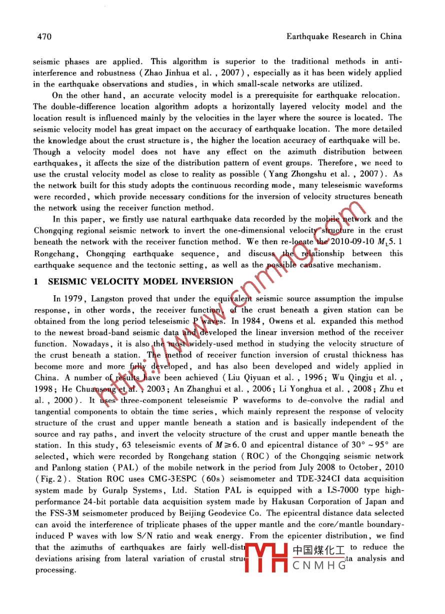 Earthquake Research in ChinaVolume 26, Number4, 2012Fine Velocity Structure andRelocation of the 2010 M[ 5. 1Earthquake Sequence in theRongchang Gas Field'Wang Xiaolong'), Ma Shengli?), Lei Xingln2.3), Guo Xin”, Wang Qiang’,Yu Guozheng',Gou Xianbin',Kuwahara Yasuto') , Imanishi Kazutoshi) ,and Jiang Xiadong1) Earthquake Administration of Chongqing Municipality , Chongqing 401 147, China2) Stale Key Laboratory of Earthquake Dynamics, Institute of Geology, CEA, Beijing 100029, China3) Geological Survey of Japan, Tsukuba 305 ~ 8567, Japan4) Hohai University, Changzhou, Changzhou 213022, ChinaBased on data collected from a temporal seismic network , and in addition to the data fromsome nearby permanent stations, we investigate the velocity structure and seismicity in theRongchang gas field, where significant injection-induced seismicity has been identified.First, we use receiver functions from distant earthquakes to invert detailed 1-D velocitystructures beneath typical stations. Then, we use the double-difference hypocenter locationmethod to re-locate earthquakes of the 2010 M[5. 1 earthquake sequence that occurred inthe region. The re-located hypocenters show that the 2010 M,5.1 earthquake sequence wasdistributed in a small area surrounding major injection wells and clustered mostly alongpre-existing faults. M ajor earthquakes show a focal depth less than 5km with a dominantdepth of ~2km, a depth of major reservoirs and injection wells. We thus conclude thatthe 2010 M, 5.1 earthquake sequence might have been induced by the deep well injectionof unwanted water at a depth ~ 3km in the Rongchang gas field.Key words: Inducedearthquake;Receiverfunction; Double difference location ;RongchangINTRODUCTIONThe Rongchang gas field is located at the southern edge of Sichuan basin in the border area' Received on March 15, 2011; revised on April 21, 2012. This reegoroh“Program of China Earthquake Administration ( XH12038Y), the中國煤化工lquake Dynamic(LED2008B04),and Science and Technology Program of ChongdMHCNMH Gant No. CSTC,2011AC0149),Research on the New Patterm and Key Technique。Lraliyuant uicigoncy Decision inSouthwest China ( 201108013).468Earthquake Research in Chinabetween Sichuan Province and Chongqing Municipality. Tectonically, it is located in thesouthwestem range of the Huaying Mountains on the eastern Sichuan fault-fold zone, being a partof the boundary belt between the two tectonic units, i. e. the central Sichuan dome structure andthe eastern Sichuan fault-fold zone (Fig. 1). The strata in the central Sichuan dome structure isnear-horizontal,with weak deformation, characterized by nose-like or short and domelikeanticlines. The eastern Sichuan fault-fold zone has experienced intensive deformation ,characterized by the elongated narrow anticlines and wide gentle synclines spreading parallel androughly equally-spaced, being typical Jura-type and comb-like folds. The anticlines form themountains and the synclines form the valleys; surface faults and anticline structures are aattendant phenomenon, and most faults show offset crossing of the axes or steep flanks of theanticlines ( Bureau of Geology and Mineral Resources of Sichuan Province, 1991 ). The majorfaults of this region are the Huayingshan basement faults, which strike N40° ~ 45°E on thewhole, dipping SE with dip angles 30° ~ 70°. This fault zone starts at the north of Dazhou in thenorth, running southwestward through Dazhu, Linshui, Hechuan, Tongliang and Rongchang tothe south of Yibin, with a total length of about 460km , being the largest fault zone in the Sichuanbasin. The fault zone is characterized by deep incision, multi-episode activity, and also withpossible late Quatemary activity. Attendant secondary faults developed in the overburden of theHuayingshan basement fault are located mainly at the axes or steep flanks of the anticlines , shownas a series of parallel faults with lengths from a few to tens of kilometers , resulting in a number ofen- echelon struetures. These faults have played a key role in controlling the earthquake activity ofthis region (Ding Renjie, et al.,2004).At the end of the 1980s, the Rongchang gas field started to inject waste water producedduring gas exploitation into underground through several abandoned wells 2 ~ 3km deep.Meanwhile, seismicity increased significantly. However, there were no historical earthquakes ofM≥5.0 recorded in this region, and the seismicity level was very low before the water injection.Since then, the water. injection induced seismicity in this region has been the concern of manyresearchers. Cheng Shi et al. ( 1992) made a field investigation and found that the seismicity inthe Rongchang area is related, to a certain extent, to the oil wells nearby. Ding Renjie et al.( 2004) made a preliminary analysis on the water injection-induced seismicity in Rongchang. In2006, the seismicity in this area was enhanced again, and studies found that it also had a certainrelationship to the oil wells nearby ( Huang Shiyuan et al. , 2006). These studies have enrichedour knowledge about the water-injection induced seismicity in the Rongchang area. Lei et al.( 2008) made a detailed study on the characteristics of seismicity of the Rongchang area before2006 and its relationship with water injection using statistical analysis methods, such as theepisodic type aftershock sequence ( ETAS) model. They revealed the temporal evolution processof seismicity of the region in the past 30 years, established the methods to distinguish water-injection induced earthquakes and common tectonic earthquakes based on the ETAS model andother statistical methods, and discussed the triggering mechanism of water injection and therelationship between the induced earthquakes and the regional geological structures.In the Rongchang gas field area, there have been more than 30 , 000 earthquakes observedduring the period from 1988 through 2006 including two earthquakes with M≥5.0 and 14 withM≥4.0 (Lei