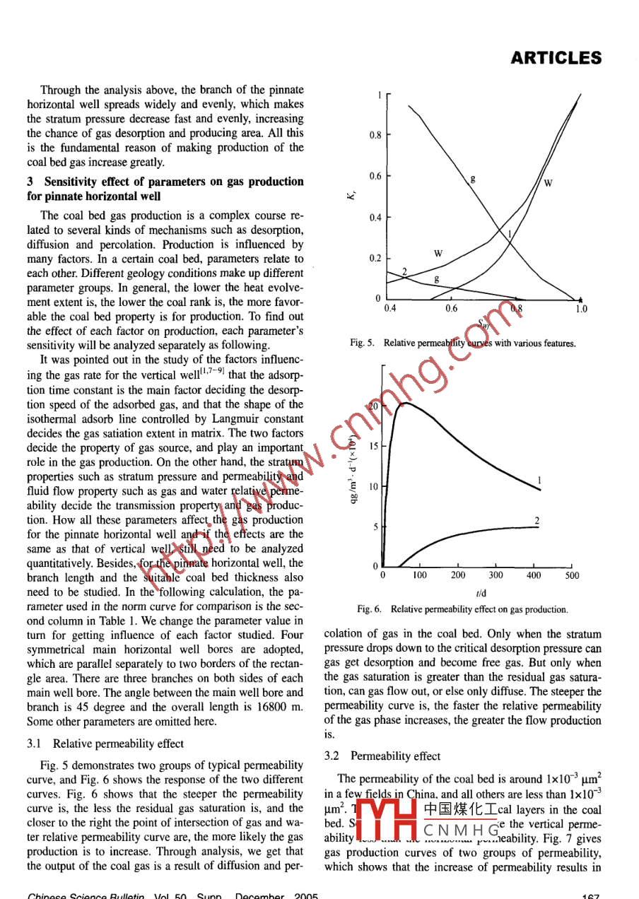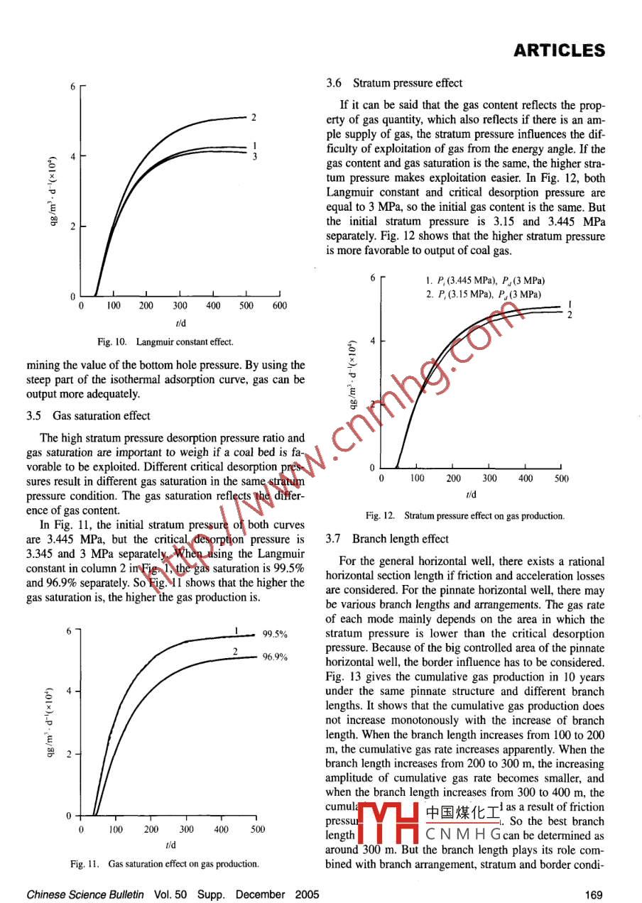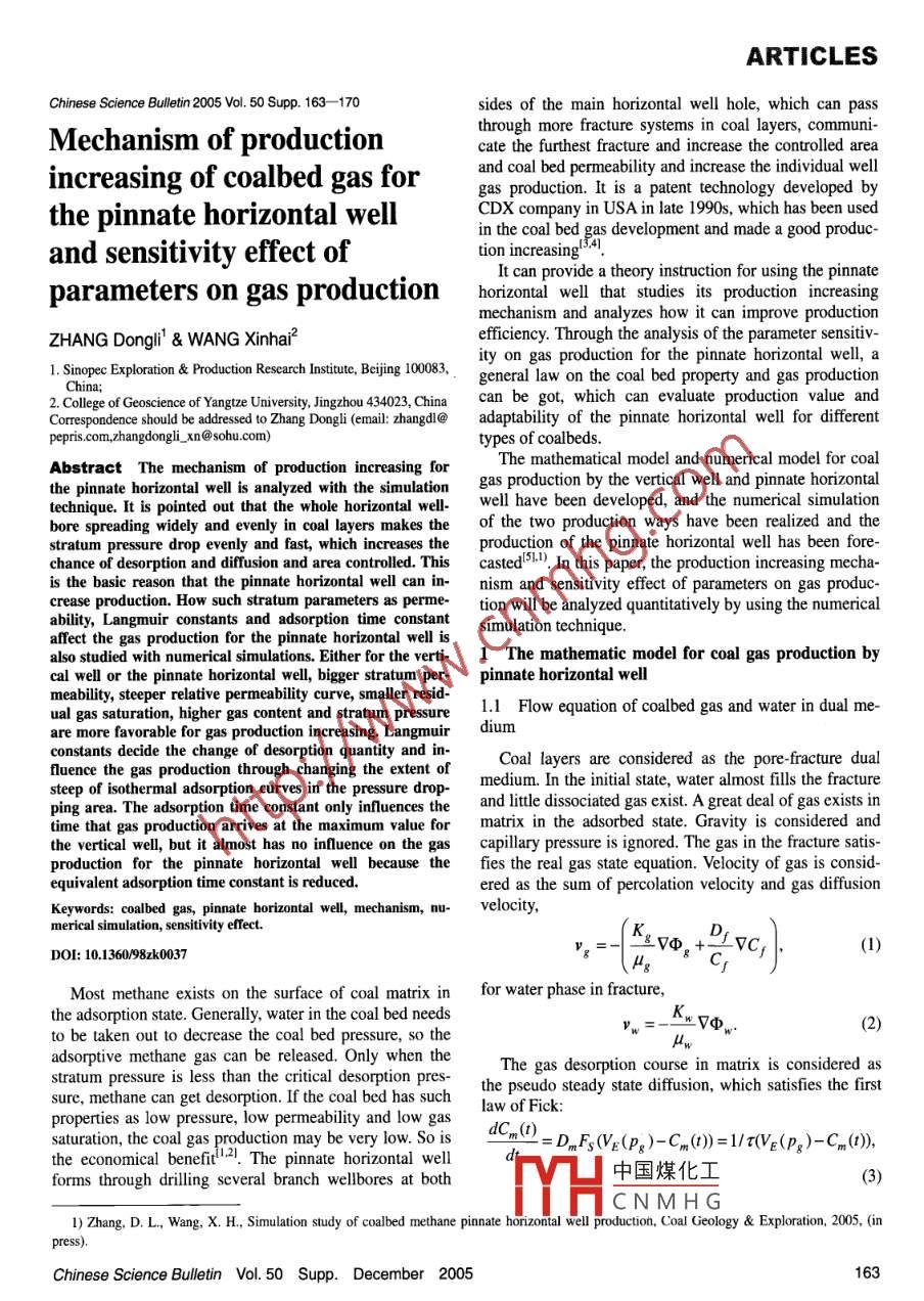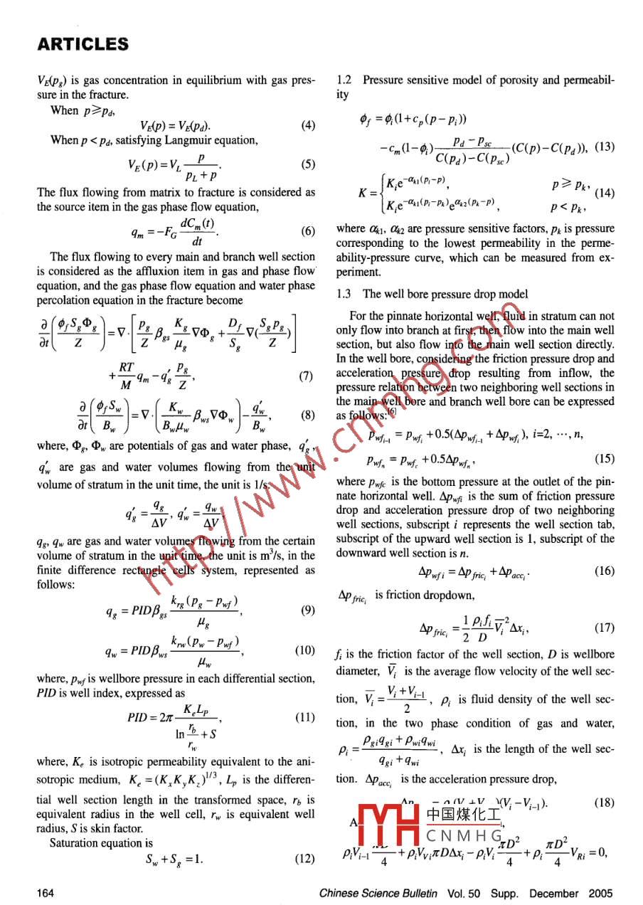 ARTICLESChinese Science Bulletin 2005 Vol. 50 Supp. 163--170sides of the main horizontal well hole, which can passMechanism of productionthrough more fracture systems in coal layers, communicate the furthest fracture and increase the controlled areaincreasing of coalbed gas forand coal bed permeability and increase the individual wellgas production. It is a patent technology developed bythe pinnate horizontal wellCDX company in USA in late 1990s, which has been usedin the coal bed gas development and made a good produc-and sensitivity effect oftion increasingIt can provide a theory instruction for using the pinnateparameters on gas production horizontal well that studies its production increasingmechanism and analyzes how it can improve productionZHANG Dongli& WANG Xinhaiefficiency. Through the analysis of the parameter sensitivExploration Production Research Institute, Beijing 100083ity on gas production for the pinnate horizontal well,ageneral law on the coal bed property and gas productionof Geoscience of Yangtze University, Jingzhou 434023, China can be got, which can evaluate production value andCorrespondence should be addressed to Zhang Dongli (email: zhangdI@ adaptability of the pinnate horizontal well for differentpepris. com, zhangdongli_xn@sohu. com)types of coalbedAbstract The mechanism of production increasing forThe mathematical model and numerical model for coalthe pinnate horizontal well is analyzed with the simulation gas production by the vertical well and pinnate horizontaltechnique. It is pointed out that the whole horizontal well. well have been developed, and the numerical simulationbore spreading widely and evenly in coal layers makes the of the two production ways have been realized and thestratum pressure drop evenly and fast, which increases the production of the pinnate horizontal well has been fore-chance of desorption and diffusion and area controlled. This casted.). In this paper, the production increasing mechais the basic reason that the pinnate horizontal well can in- nism and sensitivity effect of parameters on gas produccrease production. How such stratum parameters as perme- tion will be analyzed quantitatively by using the numericalability, Langmuir constants and adsorption time constant simulation techniqueaffect the gas production for the pinnate horizontal well isalso studied with numerical simulations. Either for the verti- 1 The mathematic model for coal gas production bycal well or the pinnate horizontal well, bigger stratum per- pinnate horizontal wellmeability, steeper relative permeability curve, smaller residual gas saturation, higher gas content and stratum pressure I. Flow equation of coalbed gas and water in dual me-are more favorable for gas production increasing. Langmuir diumconstants decide the change of desorption quantity and influence the gas production through changing the extent ofCoal layers are considered as the pore-fracture dualmedium. In the initial state water almost fills the fractureping area. The adsorption time constant only influences the and little dissociated gas exist. A great deal of gas exists intime that gas production arrives at the maximum value for matrix in the adsorbed state Gravity is considered andthe vertical well, but it almost has no influence on the gas capillary pressure is ignored. The gas in the fracture satis-duction for the pinnate horizontaal well because the fies the real gas state equation. Velocity of gas is consid-equivalent adsorption time constant is reducedered as the sum of percolation velocity and gas diffusionKeywords: coalbed gas, pinnate horizontal well, mechanism, nu- velocitymerical simulation, sensitivity effect.DDOI:10.136098zk0037gMost methane exists on the surface of coal matrix in for water phase in fracture,the adsorption state. Generally, water in the coal bed needsto be taken out to decrease the coal bed pressure, so theadsorptive methane gas can be released. Only when theThe gas desorption course in matrix is consideredstratum pressure is less than the critical desorption pres- the pseudo steady state diffusion, which satisfies the firstsure, methane can get desorption. If the coal bed has such law of fickproperties as low pressure, low permeability and low gas dCm(nz Dm Fs E(Ps)-Cm())=1/(VE(P )-Cm(D),saturation, the coal gas production may be very low. Sothe economical benefit,. The pinnate horizontal wellforms through drilling several branch wellbores at both中國煤化工CNMHG1)Zhang, D. L, Wang, X. H, Simulation study of coalbed methane pinnate horizontal well production, Coal Geology Exploration, 2005.(inChinese Science Bulletin Vol 50 Supp. December 2005ARTICLESVe(Pg) is gas concentration in equilibrium with gas pres- 1. 2 Pressure sensitive model of porosity and permeabilsure in the fractureWhen p≥p小v出p)=Vpa)=(1Pi)When p< Pd, satisfying Langmuir equation,Cm(1-)(C(P)-C(Pl),(13)VE(P)=V-PC(Pa)-C(Pse)KThe flux flowing from matrix to fracture is considered as≠pk(14)ne source item in the gas phase flow equationKe-H (pi-Pe"2(P-pPkdCm(r)(6) where al, a2 are pressure sensitive factors, Pk is pressurecorresponding to the lowest permeability in the permeThe flux flowing to every main and branch well section ability-pressure curve, which can be measured from ex-is considered as the affluxion item in gas and phase flow perimentequation, and the gas phase flow equation and water phasepercolation equation in the fracture become1.3 The well bore pressure drop modelKgD sFor the pinnate horizontal well, fluid in stratum can notv+V(8)only flow into branch at first, then flow into the main welldr Zsection, but also flow into the main well section directlyIn the well bore, considering the friction pressure drop andacceleration pressure drop resulting from inflow, thepressure relation between two neighboring well sections in9(94S)=(K,gqthe main well bore and branch well bore can be expressedBws vp(8) as follows:向ByBwwhere, g, w are potentials of gas and water phase, q gP4=pM+0.