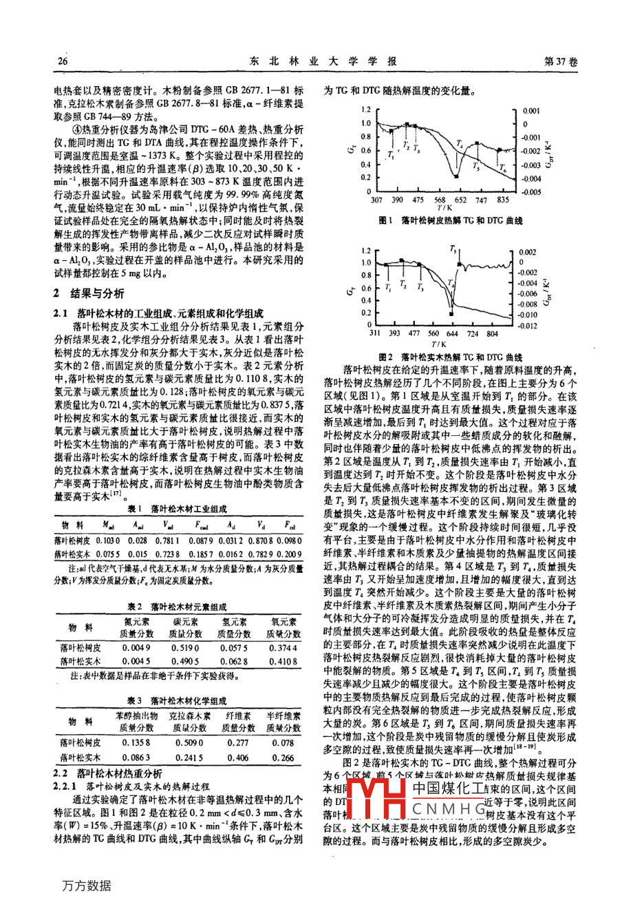 第37卷第12期東北林業(yè)大學(xué)學(xué)報(bào)Vol 37 No. 122009年12月JOURNAL OF NORTHEAST FORESTRY UNIVERSITYDec.2009落葉松木材的熱解特性!杜洪雙常建民李瑞王朋起(北華大學(xué),吉林,132013)(北京林業(yè)大學(xué))摘要釆用熱重分析儀研究了在不同升溫速率、粒徑下,落葉松樹(shù)皮和實(shí)木的熱解特性。結(jié)果表明:升溫速率升高使熱重(T)和微商熱重(DT)曲線向高溫側(cè)移動(dòng),熱解主要階段變寬;粒徑增大,DT℃曲線溫度增加,G絕對(duì)值減少;落葉松樹(shù)皮Cσ最大值為-0.0048,落葉松實(shí)木m最大值為-0.01,落葉松實(shí)木的熱解轉(zhuǎn)化率大于落葉松樹(shù)皮的熱解轉(zhuǎn)化率關(guān)鍵詞生物工程;生物質(zhì);落葉松;熱重分析;熱解分類(lèi)號(hào)S791.22:TK6Pyrolysis Characteristics of Larch Wood/ Du Hongshuang( College of Trafic and Construction Engineering, Beihua Uni-versity, Jilin 132013, P, R. China); Chang Jianmin, Li Rui, Wang Pengqi( Beijing Forestryersity )//Joumal ofNortheast Forestry University. -2009, 37(12).-25-29A number of experiments were conducted to study the pyrolysis characteristics of larch xylem and larch bark at differ-ent heating rates and particle sizes by thermogravimetric analyzer. Results showed that tG( thermogravimetry)and DTGderivative thermogravimetry) curves moved slightly towards higher temperature with the increase of heating rate, while thmain pyrolysis area widened. DTG peak temperature increased and the DTG peak value decreased with particle size increasing. DTG peak values of larch bark and larch xylem were -0 004 8 and -0. 0100, respectively. The Pyrolysis con-version rate of larch xylem was higher than that of larch barkKeywords Bioengineening; Biomass; Larch; Thermogravimetry Pyrolysis隨著能源消耗日益增加以及化石能源的過(guò)度利用,能源乃安等對(duì)林木生物質(zhì)的熱解進(jìn)行了動(dòng)力學(xué)研究,建立了二級(jí)短缺、環(huán)境污染問(wèn)題已成為全球關(guān)注的焦點(diǎn),開(kāi)發(fā)可再生的生反應(yīng)動(dòng)力學(xué)模型,并建立了描述生物質(zhì)熱解質(zhì)量損失過(guò)程的物質(zhì)能源和新型生物質(zhì)化工原料已成為當(dāng)今世界發(fā)展的趨“雙組分分階段反應(yīng)模型”、“準(zhǔn)機(jī)理模型”山。郭艷等將現(xiàn)勢(shì)。利用農(nóng)林生物質(zhì)將其合理地轉(zhuǎn)化為能源或化工原料對(duì)代化學(xué)分析領(lǐng)域中重要的分析手段—裂解氣相色譜法應(yīng)用于減少常規(guī)化石資源消耗彌補(bǔ)化工原料不足、減少環(huán)境污于對(duì)楊木快速裂解過(guò)程機(jī)理的研究2)。蔣劍春等對(duì)木屑在染、實(shí)現(xiàn)可持續(xù)發(fā)展,具有重要現(xiàn)實(shí)意義和廣闊前景。不同的升溫速度下熱解反應(yīng)進(jìn)行了研究。段佳等采用德我國(guó)具有豐富的落葉松資源,其中興安落葉松是我國(guó)北方國(guó)產(chǎn) NETZSCHSTA449C同步熱分析儀對(duì)稻稈進(jìn)行了熱解實(shí)地區(qū)速生針葉樹(shù)種之一,主要分布于大興安嶺林區(qū)。目前在國(guó)驗(yàn)研究叫。肖軍等運(yùn)用熱重一傅利葉紅外光譜聯(lián)用技術(shù)內(nèi)所有樹(shù)種中,興安落葉松的蓍積量占第一位-2)。落葉松樹(shù)(TG-FTR)研究麥秸的熱重TG和DTG曲線獲得了相關(guān)熱皮中的一元酚類(lèi)物質(zhì)(如木質(zhì)素)占木材的20%~30%,多解特性參數(shù)及動(dòng)力學(xué)參數(shù)。王昶等使用美國(guó)TA公司的元酚類(lèi)物質(zhì)(單寧)占樹(shù)皮拷膠的三分之二。因此,采用高Q50熱重分析儀對(duì)5種植物類(lèi)木材生物質(zhì)進(jìn)行了熱解的動(dòng)力新技術(shù)將落葉松采伐剩余物和加工剩余物轉(zhuǎn)化為化工替代原學(xué)研究料,利用其快速熱解生物油替代苯酚制備生物油改性酚醛樹(shù)筆者采用熱重分析儀研究了在不同升溫速率粒徑下落脂,既可以替代常規(guī)的酚醛樹(shù)脂膠,生產(chǎn)無(wú)甲醛的環(huán)保型人造葉松樹(shù)皮和實(shí)木的熱解特性,為揭示落葉松快速熱解機(jī)理,制板,又可減少對(duì)石油資源的消耗,同時(shí)還會(huì)產(chǎn)生巨大的經(jīng)濟(jì)效定高產(chǎn)率、高多元酚質(zhì)量分?jǐn)?shù)高活性的熱解油工藝提供了一益和生態(tài)效益。掌握生物質(zhì)熱解特性是探索生物質(zhì)快速熱解定的理論參考。制取熱解油工藝及機(jī)理的基礎(chǔ),為了提高落葉松熱解生物油的產(chǎn)址和利用率,有必要對(duì)落葉松熱解特性進(jìn)行研究1材料、儀器和方法生物質(zhì)熱解的研究始于20世紀(jì)70年代。國(guó)外Kug等1.1材料人1972年對(duì)木材的熱解過(guò)程進(jìn)行了研究得出數(shù)學(xué)模型5實(shí)驗(yàn)采用的樣品是出自?xún)?nèi)蒙古大興安嶺北麓的興安落葉Chan等研究了木屑、鋸末和纖維素、木質(zhì)素等的熱解確定了松( Larix gemelini Rupr)木材的樹(shù)皮和實(shí)木樹(shù)齡為40a。工其能量方程。Fomt等人對(duì)杏樹(shù)的熱解進(jìn)行了非等溫?zé)嶂貥I(yè)組成分析及元素組成分析采用樣品的粒徑(d)為0.25-實(shí)驗(yàn)。建立了一種“偽雙組分全局反應(yīng)模型”來(lái)描述熱解質(zhì)0.38mm,熱重分析采用樣品的粒徑分別為0.2mm
