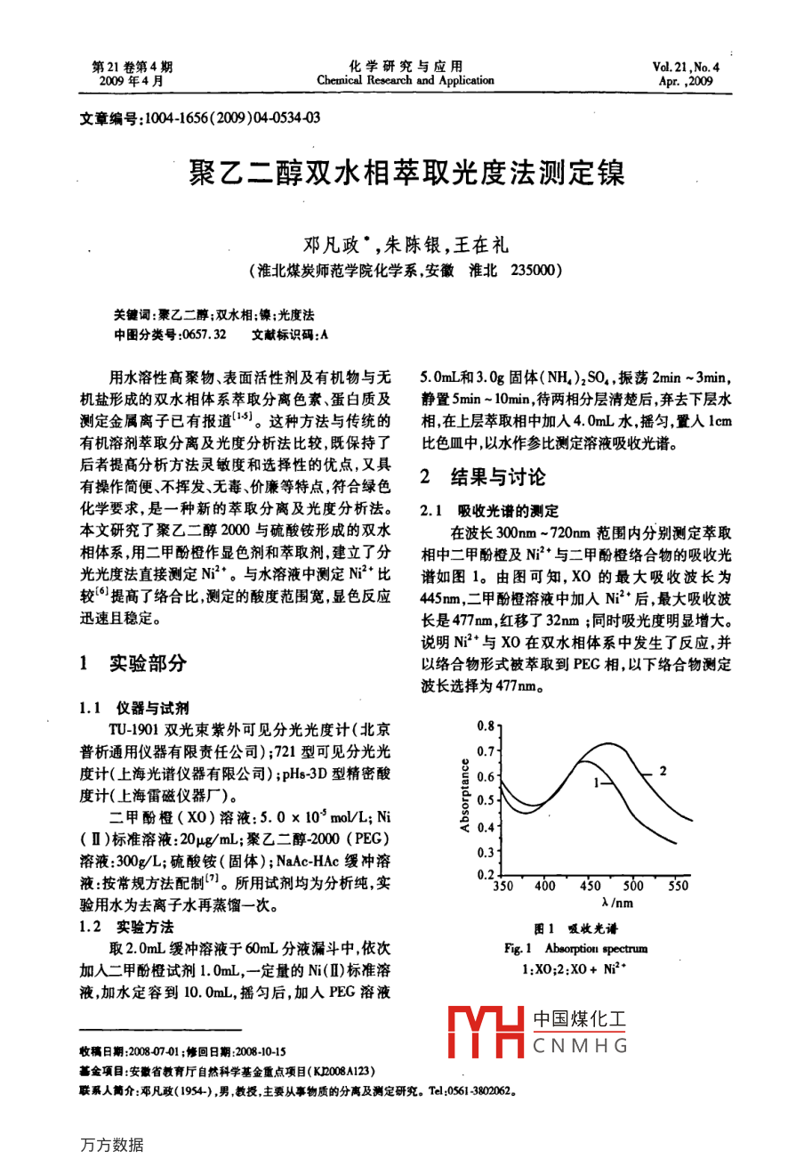 第21卷第4期化學(xué)研究與應(yīng)用,Vol.21 ,No.42009年4月.Chenical Research and ApplicationApr. ,2009文章編號(hào):1004-1656(2009)04-0534-03聚乙二醇雙水相萃取光度法測(cè)定鎳鄧凡政* ,朱陳銀,王在禮.(淮北煤炭師范學(xué)院化學(xué)系,安徽淮北235000)關(guān)鍵詞:聚乙二醇;雙水相;鎳;光度法中圖分類(lèi)號(hào):0657.32文獻(xiàn)標(biāo)識(shí)碼:A用水溶性高聚物、表面活性劑及有機(jī)物與無(wú)5. 0mL和3.0g固體( NH)2S0, ,振蕩2min ~ 3min,機(jī)鹽形成的雙水相體系萃取分離色素、蛋白質(zhì)及靜置5min ~ 10min,待兩相分層清楚后,棄去下層水測(cè)定金屬離子已有報(bào)道(1s)。這種方法與傳統(tǒng)的相,在上層萃取相中加入4.0mL水,搖勻,置人1cm有機(jī)溶劑萃取分離及光度分析法比較,既保持了比色皿中,以水作參比測(cè)定溶液吸收光譜。后者提高分析方法靈敏度和選擇性的優(yōu)點(diǎn),又具2結(jié)果 與討論有操作簡(jiǎn)便不揮發(fā)、無(wú)毒、價(jià)廉等特點(diǎn),符合綠色化學(xué)要求,是一種新的萃取分離及光度分析法。2.1吸收光譜的測(cè)定本文研究了聚乙二醇2000與硫酸銨形成的雙水在波長(zhǎng)300nm ~720nm范圍內(nèi)分別測(cè)定萃取相體系,用二甲酚橙作顯色劑和萃取劑,建立了分相中二甲酚橙及Ni+與二甲酚橙絡(luò)合物的吸收光光光度法直接測(cè)定Ni2*。與水溶液中測(cè)定Ni2*比譜如圖1。由圖可知,X0的最大吸收波長(zhǎng)為較°'提高^(guò)了絡(luò)合比,測(cè)定的酸度范圍寬,顯色反應(yīng)445nm,二甲 酚橙溶液中加人Ni?.后,最大吸收波迅速且穩(wěn)定。長(zhǎng)是477nm,紅移了32nm ;同時(shí)吸光度明顯增大。說(shuō)明Ni2+與XO在雙水相體系中發(fā)生了反應(yīng),并1實(shí)驗(yàn)部分以絡(luò)合物形式被萃取到PEC相,以下絡(luò)合物測(cè)定波長(zhǎng)選擇為477nm。1.1 儀器與試劑TU-1901雙光柬紫外可見(jiàn)分光光度計(jì)(北京0.8]普析通用儀器有限責(zé)任公司);721型可見(jiàn)分光光0.7-度計(jì)(.上海光譜儀器有限公司) ;pHs-3D型精密酸0.6+2度計(jì)(上海雷磁儀器廠)。后0.5二甲酚橙(X0)溶液:5.0 x 10* mol/L; Ni0.4( I )標(biāo)準(zhǔn)溶液: 20μg/mL;聚乙二醇2000 (PEG)0.3溶液:300g/L;硫酸銨(固體);NaAc-HAc縵沖溶液:按常規(guī)方法配制”。所用試劑均為分析純,實(shí)350400 450 500~ 5s0驗(yàn)用水為去離子水再蒸餾-一次。λ/nm1.2 實(shí)驗(yàn)方法圖1 吸收光譜取2.0mL緩沖溶液于60mL分液漏斗中,依次Fig1 Absorption spectrum加入二甲酚橙試劑1. 0mL,- -定量的Ni(I)標(biāo)準(zhǔn)溶1:X0;2:X0+ Ni2+液,加水定容到10. 0mL,搖勻后,加人PEG溶液中國(guó)煤化工收稿日期:2008-07-01 ;修回日期:2008-10-15MHCNMHG基金項(xiàng)目:安徽省教育廳自然科學(xué)基金重點(diǎn)項(xiàng)目(KD008A123)聯(lián)系人簡(jiǎn)介:鄧凡政(1954-) ,男,教授,主要從事物質(zhì)的分離及測(cè)定研究。Tel:0561 3802062.第4期鄧凡政等:聚乙二醇雙水相萃取光度法測(cè)定鎳2.2溶 液酸度的影響(NH,)2SO,用量少于2.0 g時(shí),溶液不能分層;2.0g固定其它條件不變,加入不同pH值的緩沖溶~2. 5g分層效果不明顯;3.0g ~4.5g分層效果好,液,結(jié)果見(jiàn)圖2。溶液pH3.0~5.0之間,吸光度值且吸光度值基本不變;當(dāng)(NH,)2SO,用量再增大時(shí),基本不變,說(shuō)明Ni2+與二甲酚橙絡(luò)合物在酸性介由于鹽效應(yīng),使絡(luò)合物穩(wěn)定性降低,吸光度有所下質(zhì)中穩(wěn)定。實(shí)驗(yàn)選用pH4.0的緩沖溶液。同時(shí),降。故實(shí)驗(yàn)選用硫酸銨加入量為3.0g。固定其它條件不變,改變緩沖溶液用量,結(jié)果表2.5工作曲線測(cè)定明,緩沖溶液用量在2. 0mL ~4.0mL范圍內(nèi)吸光固定其它條件,改變Ni2+ 加入量,測(cè)得結(jié)果表度值基本不變,故緩沖溶液加入量為2. 0mL。明,Ni?'在0~5.0μg/ mL范圍內(nèi)符合比爾定律線性回歸方程y =0.0677x +0.0163,回歸率r = 0. 9960。表觀摩爾吸光系數(shù)ε=5.14x10^ L. mol'●cm*。; 0.72.6 PEG 相中絡(luò)合物組成測(cè)定采用連續(xù)濃度變化法和摩爾比法,測(cè)定PEG相中Ni?+與XO絡(luò)合物的組成比是1:3。2 0.62.7反 應(yīng)時(shí)間與穩(wěn)定性在聚乙二醇硫酸銨雙水相體系中,Ni?+與X0反應(yīng)迅速完成,分層后取萃取相每隔10min測(cè)定0.53.54.04.55.05.56.0一次,2h內(nèi)吸光度值基本不變,說(shuō)明Ni*與X0反pF應(yīng)形成的絡(luò)合物在該體系中較穩(wěn)定。圖2溶液酸度影響2.8共存物 質(zhì)的影響Fig.2 Elect of solutio acidity測(cè)定20μg Ni+ ,按誤差≤5 %為允許量,以下共存離子量(mg)為:Na* ,K* ,Mg?* ,Zn2* ,NH,' ,2.3二甲酚橙用 的影響改變二甲酚橙用量,測(cè)得結(jié)果如圖3。二甲酚Cd2* ,Hg*,SO.3 (1. 0);Cu2*,cI,F, Br',I橙用量在1. 0mL ~2.5mL范圍內(nèi)吸光度值達(dá)最大(0.50);Ba2*,Fe+* ,Ti(IV),Mn*(0.3) ;Ag',且基本不變。故實(shí)驗(yàn)中X0加入量為1. 0mL。V*(0.01);AP+ ,Bi*(0.005)。在體系中加入1.0mL的10mg/mLNHF時(shí)可使Al*允許量提0.81高到5.0 mg。2.9試樣分析。 0.6-準(zhǔn)確稱(chēng)取一定量的鋁合金標(biāo)準(zhǔn)樣品,加入10.0mL200mg/mL的氫氧化鈉溶液及1.0mL過(guò)氧化氫溶液,微熱溶解。用鹽酸(1 +1)中和并過(guò)0.210.35~1.0152.0253.0量5.0mL,加入2. 0mL過(guò)氧化氫和適量水煮沸5 min,冷卻后過(guò)濾。濾液定容至100mL容量瓶V/mL” 中。準(zhǔn)確移取-定量試液,加入- -定量的NHF溶?chē)?二甲酚橙用量影響Fig.3 Efeet of adition of xo液,按實(shí)驗(yàn)方法測(cè)定,結(jié)果如表1。2