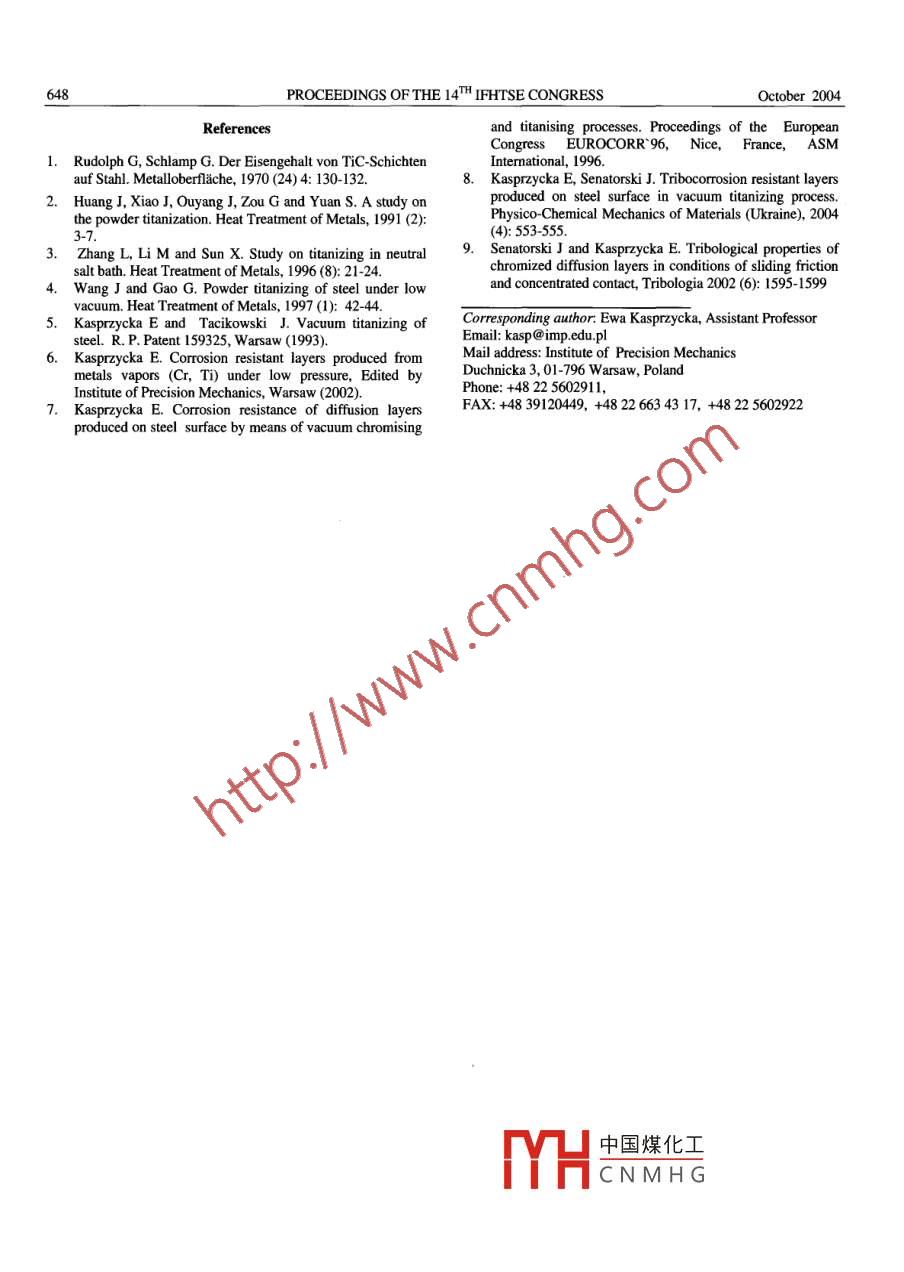 TRANSACTIONS OF MATERIALS AND HEAT TREATMENTVol.25 No.5PROCEEDINGS OF THE 14TH IFHTSE CONGRESSOctober 2004Diffusion Carbide Layers, Formed on the Surface of Steel in the VacuumTitanizing ProcessKASPRZYCKA Ewa, SENATORSKI Jan, NAKONIECZNY Aleksander, BABUL TomaszInstitute of Precision Mechanics, Warsaw, PolandAbstract: Diffusion layers produced on carbon steel surface in vacuum titanizing process were investigated. Studies oflayers thickness, their morphology, titanium, carbon and iron concentration depth profiles in the diffusion zone of titanizedlayers were carried out. The effect of process parameters such as time and temperature on the kinetics of layer growth onsteel surface was investigated. Tribocorrosion resistance of titanized layers was determined.Key words: Diffusion layers, thermochemical treatment, vacuum titanizing, wearlcorrosion resistanceDIFFUSION TITANIZING is applied to increase theIhe resulting layers were investigated by X-raydurability of tools, which operate under wearstructural analysis using Philips diffractometer and byconditions [1]. There is considerable bibliographicalspectral line analysis with SU-30 CAMECA X-raydata concerming the diffusion titanizing process, itmicroanalyser.particular, problems connected with hard titaniumMetallographic examinations andthicknesscarbide layers are quite well elaborated [2-4].measurements of titanized layers were carried out withIn this paper, a novel vacuum titanizing process,an optical microscope. I ayer microstructure waswhich involves treating steel in titanium vapor at therevealed by nital etching. Microhardness of titanizedtemperature over 1000°C under low pressure, has beenlayers was measured by Vickers method.proposed [5]. A porous material containing titaniumTo determine the tribological properties an Amslerwas employed as the source of titanium vapor. Inmachine of A135 type was used.contrast to other titanizing methods (powder, gas, etc.),"he friction unit was disk and plate [9]. Testingneither toxic reagents i.e. chlorides nor a hydrogenparameters were as follows: speed of disk sample (n), .containing atmosphere have been used [6].200 rpm; average sliding friction speed (v), 0.42 m/s;Carbon content plays an important role in theload of frictional system by concentrated contact (P),diffusion titanizing of steels, since its difusion to the25 daN; total friction time (), 2 h. Lubrication withsurface (up hill diffusion) during the process leads to its50% water solution of physiological salt with drip feedcombination with titanium to form carbides. At highof 60 drops/min. Microscopic measurement of linearcarbon content in steels, the obtained diffusion layerswear with accuracy of 5 μm was used to estimateare composed of titanium carbides. Such layers aretribocorrosion damagehard and wear resistant [7-8].The objective of this paper is to determine the2. Resultsmicrostructure,growth kinetics and tribocorrosionX-ray surface structure analysis of titanized surfacesproperties of carbide layers produced on carbon steelon the 45 steel revealed a substantial presence ofsurface during vacuum titanizing process.titanium carbide (TiC) and trace Fe2Ti intermetallic1. Experimentalphase.A metallographic cross-section of carbide layer hasA structural 45 steel (non - alloyed steel of gradeshown that the layer was unetched, as opposed to theequivalent to AISI 1045: 0,45% C) has been selectedsteel base. A decarburized zone was present in the steelfor experiments.base just bellow the layer.Titanizing of this steel was carried out in a coldConcentration depth profiles of Ti, C and Fe in thewall vacuum fumace at the temperature range oflayer diffusion zone are typical of a carbide titanized1000+1100°C with pressure in the range of 10 Pa tolayer (Fig. 1). Concentration of titanium in the carbide10~2 Pa using the novel method [5]. Crucibles of highlayer is about 79 wt. % and of carbon about 19 wt. %.temperature-resistant steel were used to contain theKinetics of layer growth on the 45 steel surface wassteel samples in contact with porous materialstudied by performing a series of titanizing processescontaining titanium. After the crucibles were placed infor va中國煤化工8 and 10 h at thethe vacuum furmace, the pumping system was startedtempet1100°C.and, then, heating was activated. After the process wasff ICNMHGknes for variousterminated, the batch was cooled with the furnace.temperatures is illustrated on Fig. 2. A parabolicVol.25 No.5TRANSACTIONS OF MATERIALS AND HEAT TREATMENT647dependence of layer thickness on the time suggests that250titanizing process is controlled by the diffusion in steel.10Ti200gE80o??寫150黃蛋40LayerCoregoo_o501520!2Depth [μm]Fig. 1. Depth profles of Cr, Fe and C concentration of carbide0,51,5layer produced on the 45 steel surface.Friction time [h]Fig.3. Run of linear wear of toughened (1) and diffusiontitanized 45 steel (2) subjected to the tribocorrosiondamage% 10The results obtained show very high wear resistancef titanized steel in conditions of sliding friction by2concentrated contact in the presence of corrosionmedium.3. ConclusionsOn the base of obtained results it is possible toformulate the following conclusions:48(1) Application of the vacuum titanizing enablesProcess time [h]a formation of titanium carbide layers on the surfaceof 45 steel, with microhardness about 2400 HV.Titanium concentration in the layer was 79 wt. %.Fig. 2.Thickness of titanized layers produced on theCarbon concentration in this layer was about 19 wt. %.45 steel surface versus process time forThe carbide layer thickness reached about 15 um in 10temperatures: 1- 1025%C, 2- 1050°C,3- 1075*C,hours at temperature 1100C.4 -1100C.(2) Titanized carbide layers growth on steel surfaceThickness of carbide layers produced on the 45 steelis controlled by the diffusion in steel.(3) Diffusion layers obtained in the vacuumsurface during vacuum titanizing process reached about15 μm in 10 hours at temperature of 1100°C. Layertitanizing 
