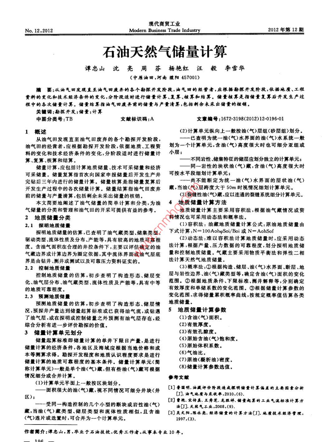 現(xiàn)代商貿(mào)工業(yè)No.12,2Modern Business Trade Industry2012年第12期石油天然氣儲(chǔ)量計(jì)算譚忠山沈亮周芬楊艷紅汪毅李雪華中原油田,河南濮陽457001)摘要:從油氣田發(fā)現(xiàn)直至油氣田廢棄的各個(gè)勘探開發(fā)階段,油氣田的經(jīng)管者,應(yīng)根據(jù)跏探開發(fā)階段,依據(jù)地質(zhì)、工程貴料的變化和技術(shù)經(jīng)濟(jì)條件的變化,分階段適時(shí)進(jìn)行儲(chǔ)量計(jì)算、復(fù)算、核算和結(jié)算。儲(chǔ)量核算是指儲(chǔ)量復(fù)算后開發(fā)生產(chǎn)過程中的各次儲(chǔ)量計(jì)算。儲(chǔ)量結(jié)算指油氣田廢棄前的儲(chǔ)量與產(chǎn)量清算,包括剩余未采出儲(chǔ)量的核銷關(guān)犍詞:勐探開發(fā);儲(chǔ)量;計(jì)算中圖分類號(hào):TB文獻(xiàn)標(biāo)識(shí)碼:A文章編號(hào):16723198(2012)12-0196-011概述(2)計(jì)算單元縱向上一般按油(氣)層組(砂層組)劃分。從油氣田發(fā)現(xiàn)直至油氣田廢棄的各個(gè)勘探開發(fā)階段,已查明為統(tǒng)一油(氣)水界面的油(氣)水系統(tǒng)一般油氣田的經(jīng)營者,應(yīng)根據(jù)勘探開發(fā)階段,依據(jù)地質(zhì)、工程資劃為一個(gè)計(jì)算單元,含油(氣高度很大時(shí)也可細(xì)分亞組或料的變化和技術(shù)經(jīng)濟(jì)條件的變化,分階段適時(shí)進(jìn)行儲(chǔ)量計(jì)小層;算、復(fù)算、核算和結(jié)算-不同巖性、儲(chǔ)集特征的儲(chǔ)層應(yīng)劃分獨(dú)立的計(jì)算單元;儲(chǔ)量計(jì)算,應(yīng)包括計(jì)算地質(zhì)儲(chǔ)量、技術(shù)可采儲(chǔ)量和經(jīng)濟(jì)同一巖性的塊狀油(氣)藏,含油(氣)高度很大時(shí)可采儲(chǔ)量。儲(chǔ)量復(fù)算指首次向國家申報(bào)儲(chǔ)量后開發(fā)生產(chǎn)井可按水平段細(xì)劃計(jì)算單元;完鉆后三年內(nèi)進(jìn)行的儲(chǔ)量計(jì)算。儲(chǔ)量核算是指儲(chǔ)量復(fù)算后尚不能斷定為統(tǒng)一油(氣)水界面的層狀油(氣)開發(fā)生產(chǎn)過程中的各次儲(chǔ)量計(jì)算。儲(chǔ)量結(jié)算指油氣田廢棄藏,當(dāng)油(氣)層跨度大于50m時(shí)視情況細(xì)劃計(jì)算單元。前的儲(chǔ)量與產(chǎn)量清算,包括剩余未采出儲(chǔ)量的核銷。(3)裂縫性油(氣)藏,應(yīng)以連通的裂縫系統(tǒng)細(xì)分計(jì)算單元本文簡要地闡述了油氣儲(chǔ)量的簡單計(jì)算和分類,為油4地質(zhì)儲(chǔ)量計(jì)算方法氣儲(chǔ)量的分類和管理和油氣田的開采可提供有益的參考。地質(zhì)儲(chǔ)量計(jì)算主要采用容積法,根據(jù)油氣藏情況或資2地質(zhì)儲(chǔ)量分類料情況也可采用動(dòng)態(tài)法和概率法。2.1探明地質(zhì)儲(chǔ)量(1)容積法:油藏地質(zhì)儲(chǔ)量計(jì)算公式:原油地質(zhì)儲(chǔ)量由探明地質(zhì)儲(chǔ)量的估算已查明了油氣藏類型儲(chǔ)集類型、下式計(jì)算:N=100A0 ho soi,/Boi或N= AohSof驅(qū)動(dòng)類型流體性質(zhì)及分布、產(chǎn)能等,具有較高的地質(zhì)可靠程(2)動(dòng)態(tài)法:難以容積法計(jì)算地質(zhì)儲(chǔ)量時(shí),應(yīng)采用動(dòng)態(tài)度。含油氣面積在合理的井控條件下,主要以評(píng)估確定的油法計(jì)算,根據(jù)產(chǎn)量、壓力數(shù)據(jù)的可靠程度,劃分探明地質(zhì)儲(chǔ)氣藏邊界或計(jì)算邊界為圈定依據(jù),其中流體界面或油氣層底量和控制地質(zhì)儲(chǔ)量.氣藏主要采用物質(zhì)平衡法和彈性二相界是由鉆井、測井或測試以及可靠壓力資料證實(shí)的。法計(jì)算天然氣地質(zhì)儲(chǔ)量2.2控制地質(zhì)儲(chǔ)量(3)概率法:①根據(jù)構(gòu)造、儲(chǔ)層、油(氣)水界面、斷層、地控制地質(zhì)儲(chǔ)量的估算,初步查明了構(gòu)造形態(tài)、儲(chǔ)層變層與巖性邊界油(氣)藏類型等,確定含油(氣)面積的變化化油氣層分布油氣藏類型流體性質(zhì)及產(chǎn)能等,具有中等范國。②根據(jù)地質(zhì)條件、下限標(biāo)準(zhǔn)測井解釋等,分別確定的地質(zhì)可靠程度。有效厚度和單儲(chǔ)系數(shù)的變化范圍。③根據(jù)儲(chǔ)量計(jì)算參數(shù)的2.3預(yù)測地質(zhì)儲(chǔ)量變化范圍,求得儲(chǔ)量累積概率曲線,按規(guī)定概率值估算各類預(yù)測地質(zhì)儲(chǔ)量的估算初步查明了構(gòu)造形態(tài)、儲(chǔ)層情地質(zhì)儲(chǔ)量況,預(yù)探井產(chǎn)量達(dá)到儲(chǔ)量起算標(biāo)準(zhǔn)或已獲得油氣流,或鉆遇5地質(zhì)儲(chǔ)量計(jì)算參數(shù)了油氣層,或在探明或控制儲(chǔ)量之外預(yù)測有油氣層存在,經(jīng)(1)含油(氣)面積綜合分析有進(jìn)一步評(píng)價(jià)勘探的價(jià)值(2)有效厚度。3儲(chǔ)量計(jì)算單元?jiǎng)澐?3)有效孔隙度。儲(chǔ)量起算標(biāo)準(zhǔn)即儲(chǔ)量計(jì)算的單井下限日產(chǎn)量,是進(jìn)行(4)原始含油(氣)飽和度儲(chǔ)量計(jì)算的經(jīng)濟(jì)條件,各地區(qū)及海域應(yīng)根據(jù)當(dāng)?shù)貎r(jià)格和成(5)原始體積系數(shù)本等測算求得??碧介_發(fā)程度和地質(zhì)認(rèn)識(shí)程度要求是進(jìn)行(6)氣油比。儲(chǔ)量計(jì)算的地質(zhì)可靠程度的基本條件。儲(chǔ)量計(jì)算單元(簡(7)原油(凝析油)密度。稱計(jì)算單元)一般是單個(gè)油(氣)藏,但有些油(氣)藏可根據(jù)(8)儲(chǔ)量計(jì)算參數(shù)選值情況細(xì)分或合并計(jì)算。參考文獻(xiàn)(1)計(jì)算單元平面上一