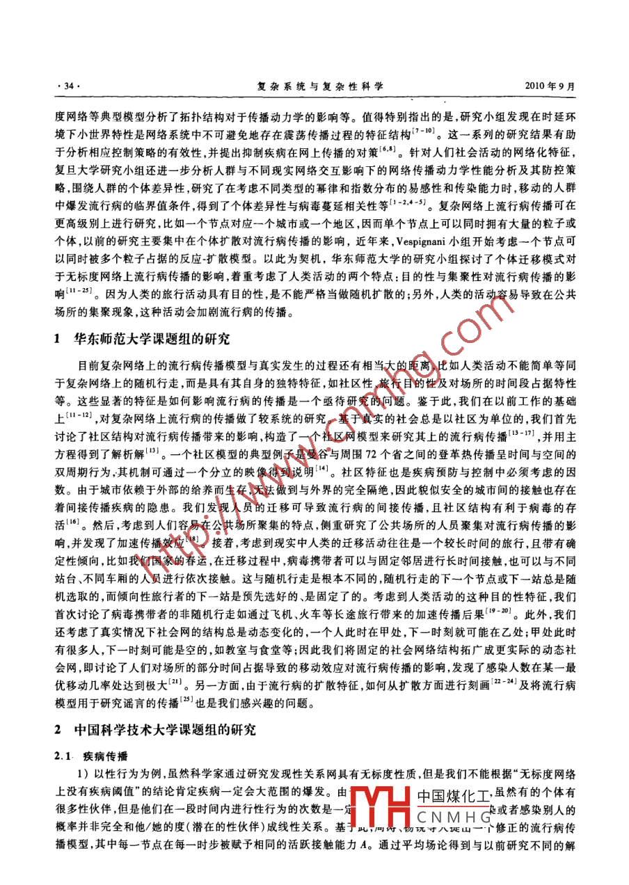 第7卷第2-3期復(fù)雜系統(tǒng)與復(fù)雜性科學(xué)Vol. 7 No. 2-3010年9月COMPLEX SYSTEMS AND COMPLEXITY SCIENCESep.2010文章編號(hào):1672-3813(2010)02-03-0033-05網(wǎng)絡(luò)傳播動(dòng)力學(xué)李翔,劉宗華2,汪秉宏31.復(fù)旦大學(xué),上海200433;2.華東師范大學(xué),上海200241;3.中國(guó)科學(xué)技術(shù)大學(xué),合肥230026摘要:病毒的流行、謠言的散布、觀點(diǎn)的傳遞都是在不同網(wǎng)絡(luò)上的形形色色的傳播現(xiàn)象,既存在著現(xiàn)象后的不同起因和特征,更存在著千絲萬(wàn)縷的聯(lián)系和共通的演化機(jī)理。匯總了復(fù)旦大學(xué)、華東師范大學(xué)和中國(guó)科學(xué)技術(shù)大學(xué)的研究小組過(guò)去幾年里在網(wǎng)絡(luò)傳播動(dòng)力學(xué)的研究成果。關(guān)鍵詞:復(fù)雜網(wǎng)絡(luò);傳播動(dòng)力學(xué);網(wǎng)絡(luò)中圖分類號(hào):N941文獻(xiàn)標(biāo)識(shí)碼:AOn Spreading Dynamics on NetworksLIhua2. WANG(1. Fudan University, Shanghai 200433, China; 2. East China Normal University, Shanghai 230026, China3. University of Science and Technology of China, Hefei 230026, CIAbstract: The prevalence of epidemics, rumors, and opinions are various spreading phenomena on dif-ferent categories of networks, which not only exhibit specific features and backgrounds, but also sharesome mechanisms and extensive interconnections. This paper is a brief collection including the work andhinking on this topic from the research groups of Fudan Univeristy, East China Normal University, andUniversity of Science and Technology of China.Key words: complex networks; spreading dynamics; network網(wǎng)絡(luò)傳播研究涉及疾病擴(kuò)散、輿論傳播及其動(dòng)力學(xué)等問(wèn)題。(計(jì)算機(jī)或生物)病毒在網(wǎng)絡(luò)上的流行與傳播行為是復(fù)雜網(wǎng)絡(luò)理論的主要研究?jī)?nèi)容之一,也是近年來(lái)人們?cè)谏鐣?huì)經(jīng)濟(jì)活動(dòng)中最為密切關(guān)注的一個(gè)主題。SARS、禽流感、沖擊波、震蕩波、熊貓燒香、灰鴿子等生物和計(jì)算機(jī)病毒的肆虐給人們帶來(lái)了以千億美元計(jì)數(shù)的巨大經(jīng)濟(jì)損失,而且這一傳播過(guò)程通常極為迅速。以2004年的“震蕩波”蠕蟲(chóng)病毒為例,在短短的十余天內(nèi)全球數(shù)千萬(wàn)臺(tái)計(jì)算機(jī)遭受到它的攻擊,其傳播速度驚人。復(fù)雜網(wǎng)絡(luò)傳播動(dòng)力學(xué)行為的研究還包括對(duì)謠言輿論、觀點(diǎn)等主體在網(wǎng)絡(luò)上擴(kuò)散現(xiàn)象的探討。本文主要匯總了復(fù)旦大學(xué)、華東師范大學(xué)和中國(guó)科學(xué)技術(shù)大學(xué)這幾個(gè)研究小組在過(guò)去幾年里對(duì)上述問(wèn)題的若干思考。歷史上流行病動(dòng)力學(xué)的研究已經(jīng)提出了幾個(gè)代表性模型。伴隨復(fù)雜網(wǎng)絡(luò)研究的興起,復(fù)旦大學(xué)研究小組-間°通過(guò)數(shù)值計(jì)算和理論分析研究網(wǎng)絡(luò)上傳播動(dòng)力學(xué)的若干模型,在探索復(fù)雜網(wǎng)絡(luò)的傳播臨界值理論基礎(chǔ)上,結(jié)合非線性動(dòng)力學(xué)分析了傳播動(dòng)態(tài)過(guò)程中存在的混沌、分叉等典型動(dòng)力學(xué)行為特征,圍繞小世界、無(wú)標(biāo)收稿日期:2010-06-14中國(guó)煤化工基金項(xiàng)目:園家自然科學(xué)基金項(xiàng)目(10635040,10975126,60874089,91024026CNMH校博士點(diǎn)基金項(xiàng)目(20093402110032);教育部新世紀(jì)優(yōu)秀人才計(jì)劃項(xiàng)目(NCET-09-031知-^目(09QH1400200)作者簡(jiǎn)介:李(1975-),男,湖南人,教授博導(dǎo),主要研究方向?yàn)閺?fù)雜網(wǎng)絡(luò)系統(tǒng)理論與應(yīng)用。復(fù)雜系統(tǒng)與復(fù)雜性科學(xué)2010年9月度網(wǎng)絡(luò)等典型模型分析了拓?fù)浣Y(jié)構(gòu)對(duì)于傳播動(dòng)力學(xué)的影響等。值得特別指出的是,研究小組發(fā)現(xiàn)在時(shí)延環(huán)境下小世界特性是網(wǎng)絡(luò)系統(tǒng)中不可避免地存在震蕩傳播過(guò)程的特征結(jié)構(gòu)0。這一系列的研究結(jié)果有助于分析相應(yīng)控制策略的有效性,并提出抑制疾病在網(wǎng)上傳播的對(duì)策6。針對(duì)人們社會(huì)活動(dòng)的網(wǎng)絡(luò)化特征,復(fù)旦大學(xué)研究小組還進(jìn)一步分析人群與不同現(xiàn)實(shí)網(wǎng)絡(luò)交互影響下的網(wǎng)絡(luò)傳播動(dòng)力學(xué)性能分析及其防控策略,圍繞人群的個(gè)體差異性,研究了在考慮不同類型的冪律和指數(shù)分布的易感性和傳染能力時(shí),移動(dòng)的人群中爆發(fā)流行病的臨界值條件,得到了個(gè)體差異性與病毒蔓延相關(guān)性等-24-。復(fù)雜網(wǎng)絡(luò)上流行病傳播可在更高級(jí)別上進(jìn)行研究,比如一個(gè)節(jié)點(diǎn)對(duì)應(yīng)一個(gè)城市或一個(gè)地區(qū),因而單個(gè)節(jié)點(diǎn)上可以同時(shí)擁有大量的粒子或個(gè)體,以前的研究主要集中在個(gè)體擴(kuò)散對(duì)流行病傳播的影響,近年來(lái), Vespignani小組開(kāi)始考慮一個(gè)節(jié)點(diǎn)可以同時(shí)被多個(gè)粒子占據(jù)的反應(yīng)-擴(kuò)散模型。以此為契機(jī),華東師范大學(xué)的研究小組探討了個(gè)體遷移模式對(duì)于無(wú)標(biāo)度網(wǎng)絡(luò)上流行病傳播的影響,著重考慮了人類活動(dòng)的兩個(gè)特點(diǎn):目的性與集聚性對(duì)流行病傳播的影響:2