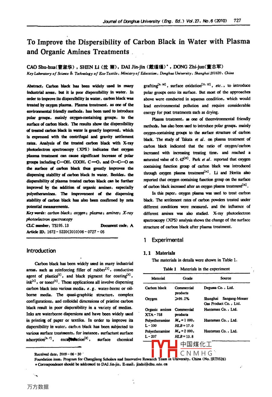 Joumnal of Donghue University (Eng. Ed.) Vol.27, No.6 (2010)727To Improve the Dispersibility of Carbon Black in Water with Plasmaand Organic Amines TreatmentsCAO Shu-hua(曹淑華) , SHEN Li (沈麗), DAI Jin-jin (戴瑾瑾)*,DONG Zhi-jun(志軍)Key Laboratory of Science & Techmology of Eco-Tetile , Mimistryof Education, Donghuo Univerity, Shanghai 201620. ChinaAbstract: Carbon black has been widely used in manygrafting* 0], surface oxidation.r), etc., to introduceindustrial areas, but it i poor dispersibility in water. Inpolar groups onto its surface. But most of the approachesorder to improve its dispersiblity in water, carbon black wasabove were conducted in aqucous condition, which wouldtreated by axygen plasma. Plasma treatment, as one of thelcad environmental pollution and require considerableenvirormental friendly methods, has been used to introduceenergy for post treatments such as drying.polar groups, mainly xygen-containing groups, 如thePlasma treatment, as one of theenvironmental friendlysurface of carbon black. The results show the dispersibilitymethods, has also ben used t如o introduce polar groups, mainlyof treated carbon black in watσr is greatly improved, whichoxygen-containing groups to the ourface strncture of carbonis expressed with the centrifugal and gravity settlementblack. The study of Takata et al. on plasma treatment ofrates. Analysis of the treated carbon black with X-raycarbon black indicated that the ratio of oxygen/carbonphotoelectron spectroscopy (XPS) indicates that xygenincreased with increasing treating time, and reached aplasma treatment can cause significant increase of polargroups includingC- -OH, 000H, C- O, andO -C-0onsaturatod valuc of 0. 42[3]. Park et al. reported that oxygcnthe surface of carbon black thus greatly improves thecontaining function group of carbon black was introduceddispersing stability of carboo black im watar. Besides, thethrough axygen plasma treatmen[4J. Li and Horita alsodispersibility of plasma treated carbon black can be furtherreported that oxygen containing function group on the surfaceimproved by the addition of organic amines, especiallyof carbon black increased ater an orxygen plasma treatmentil.polyetheramines. The improvenent of the dispersingIn this paper, xygen plasma was used to treat carbonstability of carbon black has also been conflrmed by etablack. The settlement ratcs of carbon powders treated underpotential measurements.different conditions were measured, and the infuence ofKey words: carbon black; axygenr; plasma; amines; X-raydifferent amincs was also studied. X-ray photoclectronphotoelectron spectroscopyspectroscopy (XPS) analysis shows the change of the surfaccac mumber; TS195. 13Doaument code: Astructure of carbon black after plasma treatment.Article ID; 1672 - 5220(2010)06- 0727- 05.1 ExperimentalIntroduction1.1 MaterialsThe materials in details were shown in Table 1.Carbon black has been widely used in many industrialareas, such as reinforcing filler of rubberl, conductiveTable 1 Materials in the experimentagent of plastics'), and black pigment for coating',MatcrialSourceinks), or tonef"], These applications all involve dispersingcarbon black into various media, e. g. water-borne or oil-Carbon black CommercialDegusa Co., Ltd.borme media. The quasi-graphitic structure, complexproductsOxygcn≥99.2%Shanghai Sangang-Messerconfigurations, and colloidal dimcnsions of pristine carbonGas Product Co,, Ltdblack result in poor dispersibility in a variety of medias.Organic amincs CommercialHuntsman Co. , Ltd.Inks are waterborne dispersions and have been widely uscdXTA-758in printing of paper or textils. In order to improve 謝Polyetheramine M. =1000,Huntsman Co, Ltd.dispersibility in water, carbon black has been subjected toL- 100HLB=17.0Polyetheramine M. =20,Huntsmnan Co. , Ltd.various surface treatments, for instance, surfactant surfaceL- 207HLB=13.8adsorptionf.n, encapnhation,surface chemical中國(guó)煤化工Reccived date; 2009-06 -30TMYHCNMHGFoundation item: Program for Changjiang Scholar and Innovative Rescarch Team in University, China (No. IRT0526)曲Correspondence should be addrestod to DAI Jin-jin, E-mail; jindai@dhu. edu. cn728Joumal of Donghu University (Eng. Ed.) Vol.27, No.6 (2010)(Table 1 cotinued)and pH of the upper suspension is measured using pH mcterE- 201-C (made in China). Zeta potcntial of the upperMaterialGradeSourcesuspension is mcasurcd using a Zetasizer Nano SericsPolyetheramine M. =3 0Huntsman Co, LId.(Malvern Instruments Ltd, UK).HLB=17.1Dicthanolamine ARSinopharm ChemicalRcagent Co., Ltd.2 Results and DiscussionNotc: HLB is hydrophilc-lipophile balance oumber.2.1 Eftects of plasma treatments on stspension1.2 Procedure and measurementstability o[ carbon black in water1.2.1 Plasma trealmentIn order to compare the stability o{ suspension ofPlasma trcatment equipment GPT- 3 RF 13. 56 MHzcarbon black before and after plasma trcatment, their(made in China) was used in this study. Put a petri dishgravity and centrifungal stability were dctermined and theloaded with the carbon black sample of about 100 mg asresults were shown in Figs. 1 and 2.thin as possible into the plasma chamber, and open thevacuum pump till the pressure reaches to about 10 Pa.Flush the chamber with oxygen for 2 -3 times, and then30}introduce oxygen into the reactor. Once the pressurercachcs 30 Pa. initiate the glow dischargc at a power of80 W for a trcatment time 5 min. After the plasmatrcatment, raise the pressure and remove the samples.I -Plsm uralme1- Untreated1.2.2 Measurencnts o{ sttlemneat ntes ol carbon black in2091.2.2.1 Ccntrifugal sttlement rate340Disperse the trcatcd or untreated carbon blackSubsidence time/dsamplc of about 1 g into 100 mL distiled water and stirFig.1 Gravity sttlement stability of oxygen plasmawith a high-speed mixer SFJ - 400 ( Shanghai Xiandaitrcated and untreated carbon blacks in waterEnvironment Engincering Technique Co., .Ltd.China) at1 800 r/min for 30 min. Pour 5 mL dispernion0pi