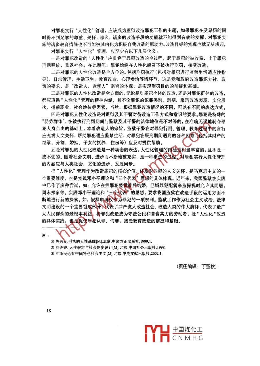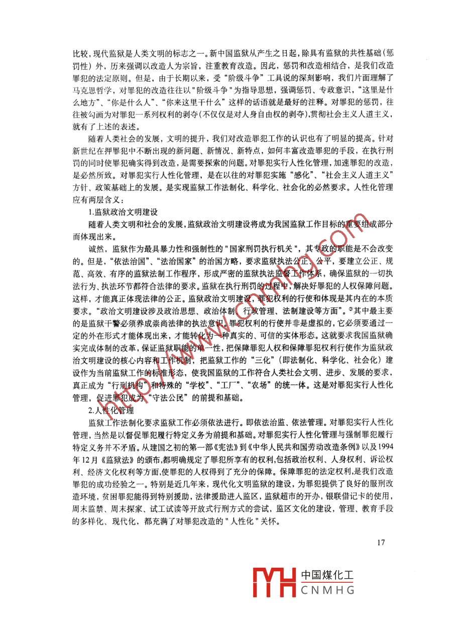 第19卷第2期法治論叢No2004年3月The Rule of Law Forum◆現(xiàn)論篇“人性化”改造之我見馮平(上海大學(xué)法學(xué)院,上海201701)摘要:罪犯是特殊的“弱勢群體”,在我國,懲罰罪犯是手段,改造罪犯是宗旨.如何改造罪犯?幾十年來,我國形成了一套行之有效的手段,進(jìn)入21世紀(jì)以來,在以人為本思想的指導(dǎo)下,實(shí)踐個(gè)代教”的思想,“人性化”管理應(yīng)威為改造罪犯的一個(gè)主要手段,只有這樣,才能充分調(diào)動(dòng)罪犯接受改造的內(nèi)在需要、提高改質(zhì)量關(guān)鍵詞:人性;人性化管理;政治文明;罪犯改造中圖分類號(hào):DF87文獻(xiàn)標(biāo)識(shí)碼:A文章編號(hào):1008-452502004)03-016-03進(jìn)入21世紀(jì)以來,以人為本的人文思想在我國逐漸得到廣泛認(rèn)同,監(jiān)獄系統(tǒng)對罪犯的人性化管理實(shí)踐呈現(xiàn)加速趨勢。這引起了監(jiān)獄警察,乃至社會(huì)各界的關(guān)注。陳興良先生說:“人性,又稱人的本性,是人為人的基本品格?!雹偈阌∠壬灿型瑯拥慕忉?“人的本性就是人性”。③與人性概念相聯(lián)系的還有人性化、人性主義、人本主義、以人為本等。這些概念都從不同角度表達(dá)了對人性的理解。筆者以為,將人性化概括為人本主義較為妥貼,可理解為對人的尊重、理解以及向人本性的方向引導(dǎo)復(fù)歸??v觀中國五千年的文明史,人性”作為人文思想的核心理念或明或暗地貫穿始終。但新中國成立后的長期以來,我們對待"人性化"的態(tài)度是批評多于尊重,貶損多于贊譽(yù),排斥多于借鑒。往往把“人性化”與資產(chǎn)階級思想等同起來,把“人性”歸類到唯心的、抽象的范疇之中。傳統(tǒng)文化主張的是,人性是有的,人性是具體的,是具有階級性的。我們主張無產(chǎn)階級的人性,人民大眾的人性。后來,作為人性的替代品,社會(huì)主義人道主義被廣泛宣傳,以和資產(chǎn)階級的人性論劃清界限在解讀社會(huì)主義人道主義的內(nèi)涵時(shí),往往作出這樣的注釋,社會(huì)主義人道主義能正確體現(xiàn)和反映國家的法律規(guī)定和黨的改造政策的精神尊重罪犯的人格,禁止對罪犯進(jìn)行體罰和虐待,保障罪犯的法定權(quán)利。國家給予罪犯在服刑期間必要的生活和物質(zhì)保障。以對罪犯實(shí)施社會(huì)主義人道主義待遇,為他們提供足夠保持身體健康和進(jìn)行勞動(dòng)生產(chǎn)需要的物質(zhì)醫(yī)療條件,來促使罪犯認(rèn)罪、悔罪,自覺改造。上述表述,只反映了我們改造罪犯的政策和手段,反映了改造罪犯應(yīng)遵循的基本原則。是屬于在改造罪犯工作方面總體思路的范疇。與筆者主張的對罪犯實(shí)施人性化管理,并把他作為一項(xiàng)基本原則來對待,是有明顯差異的。監(jiān)獄是私有制、國家、法律的附屬物,是專政工具。與原始社會(huì)的同態(tài)復(fù)仇、以牙還牙相收稿日期:200401-12作者簡介:馮平,上海大學(xué)法學(xué)院監(jiān)獄學(xué)教研室講師16中國煤化工CNMHG比較,現(xiàn)代監(jiān)獄是人類文明的標(biāo)志之一。新中國監(jiān)獄從產(chǎn)生之日起,除具有監(jiān)獄的共性基礎(chǔ)(懲罰性)外,歷來強(qiáng)調(diào)以改造人為宗旨,注重教育改造。因此,懲罰和改造相結(jié)合,是我們改造罪犯的法定原則。但是,由于長期以來,受“階級斗爭”工具說的深刻影響,我們片面理解了馬克思哲學(xué),對罪犯的改造往往以"階級斗爭"為指導(dǎo)思想,強(qiáng)調(diào)懲罰、專政意識(shí),“這里是什么地方”、“你是什么人”、“你來這里干什么”這樣的話語就是最好的注釋。對罪犯的懲罰,往往被勾畫為對罪犯一系列權(quán)利的剝奪(不僅僅是對人身自由權(quán)的剝奪),貫徹社會(huì)主義人道主義,就有了上述的表述。隨著人類社會(huì)的發(fā)展,文明的提升,我們對改造罪犯工作的認(rèn)識(shí)也有了明顯的提高。針對新世紀(jì)在押罪犯中不斷出現(xiàn)的新問題、新情況、新特點(diǎn),如何豐富改造罪犯的手段,在執(zhí)行刑罰的同時(shí)使罪犯確實(shí)得到改造,是需要探索的問題。對罪犯實(shí)行人性化管理,加速罪犯的改造是必然所致。對罪犯實(shí)行人性化管理,是在以往的對罪犯實(shí)施“感化”、“社會(huì)主義人道主義方針、政策基礎(chǔ)上的發(fā)展。是實(shí)現(xiàn)監(jiān)獄工作法制化、科學(xué)化、社會(huì)化的必然要求。人性化管理應(yīng)有兩層含義:1監(jiān)獄政治文明建設(shè)隨著人類文明和社會(huì)的發(fā)展,監(jiān)獄政治文明建設(shè)將成為我國監(jiān)獄工作目標(biāo)的重要組成部分而體現(xiàn)出來。誠然,監(jiān)獄作為最具暴力性和強(qiáng)制性的"國家刑罰執(zhí)行機(jī)關(guān)",其專政的職能是不會(huì)改變的。但是,“依法治國”、“法治國家”的治國方略,要求監(jiān)獄執(zhí)法公正、公平,要建立公正、規(guī)范、高效、有序的監(jiān)獄法制工作程序,形成嚴(yán)密的監(jiān)獄執(zhí)法監(jiān)督工作體系,確保監(jiān)獄的一切執(zhí)法行為、執(zhí)法環(huán)節(jié)都符合法律的要求。監(jiān)獄在執(zhí)行刑罰的過程中,解決好罪犯的人權(quán)保障問題。這樣,才能真正體現(xiàn)法律的公正。監(jiān)獄政治文明建設(shè),罪犯權(quán)利的行使和體現(xiàn)是其內(nèi)在的本質(zhì)要求?!罢