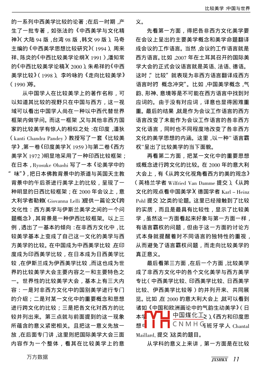 江西社會科學2006.1ciai sciences當代美學的走向與未來(筆談【編者按】進入新世紀以來美學在中國一直十分活躍呈現為多方面多流向的勢頭。但怎樣才能更好地推進美學研究有那些應注意的問題?這仍然是一個正在探索中的事情。這里選取美學研究的四個基本方面即美學原理、中國美學史、西方美學史與比較美學請在這四個領域中學有所成又有一定個人特點的學人發(fā)表個人見解。2006年起,學子語類"欄目為每期一個話題將進一步加強討論的針對性和時效性。歡迎廣大讀者提供話題專家學者踴躍參與討論。本刊第二期學子語類"的話題是洱節(jié)文化與當代社會。比較美學沖國與世界外文化比較研究中心主任、教授,中國人民大學哲學系博士生導師。(重慶400031)■張法比較美學的學術景觀由眾多橫跨各洲學者于2003創(chuàng)刊的網上美學雜志《當代美學》,在新近一期編者的話本文對比較美學國內外的現狀作了現象上的描中寫道!美學作為一個學科,已經遠遠地超越述,聯系比較美學的內在理路,分析了中國比較美學何了藝術,而進入了諸多的新領域,比如環(huán)境學、以呈現為現在勢態(tài)的原因,指出了中國比較美學的局限,從全球比較美學的語境談了中國比較美學努力的方日常生活、大眾文化、比較美學?!雹龠@里比較美學中國煤化芏看成了美學新近發(fā)關鍵詞]比較美學;中西比較洤球化湙破意識展中CNMH然比較美學并不中圖分類號]B83-0[文獻標識碼]A文章編號]是一個新出的領域,但E叫以成為給美學研究1004-518X(20061-0009-06帶來新景象的一個領域實為理之當然。也許正張法(1954-),男,重慶市人四川外國語學院中因如此,對比較美學的學術興趣遍布于海內外JXSHKX 9江西社會科學2006.1的學術機構之中在中國遍于美學、文藝學、比奇召開的17屆世界美學大會的主題定為在較文學這三個學科之中,從中國社會科學院、北文化間架橋的美學”( Aesthetics bridging cul京大學、中國人民大學,到復旦大學、南京大學、 tures),而且企望,為了超越東西與西方、傳統與浙江大學,到山東大學、四川大學、暨南大學、華當代、藝術與科學、全球與本土、自然與文化、大東師大,到香港浸會大學……布滿了比較美學眾與精英、中心與邊緣等二元對立而關注文化學人,國際上,從歐洲到美洲從亞洲到澳洲都差異研究。可以說跨文化美學是對比較美學的可以發(fā)現比較美學學者。然而,比較美學的研一種本質上點題,正如2000年意大利會議上究又是不易的。在中國,近十年來,比較美學相博洛尼亞大學學者米來尼( Raffaele milani)的論對于美學領域的其他主科(如美學原理和中西文題目以一幽默方式所呈現的世紀,從美學史)來,呈為低迷狀態(tài)。這不只是表現在比比較美學到跨文化美學的轉型時代較美學的著作不到10本,更在于基本上沒有起眼的突破。與之相反,國際上,比較美學卻頗有二、比較美學的基本背景和運行基調聲勢。意大利錫耶納大學著名的跨文化美學教國際上的美學,本有一個跨文化的語境,又授馬卡艾羅(σ grazia marchiani〕編了《美學:東方在全球化的浪潮之中,高揚比較美學,很好理與西方X1997)次年,他在《從東方美學可以學解。本來,包括比較美學在內的整個比較學,都到什么》一文中說,比較美學的發(fā)展有三個里程建立在這一個背景上:現代社會在西方興起、向碑:一是安格魯~僧伽羅思想家孔瓦拉什王梅全球擴張,把一個分散的世界史變成了統一的( Ananda K. Coomaraswamy,1877~1947開辟了世界史,西方文化面對著眾多的非西方文化,各西方理解印度藝術之路;二是在這位學術大師非西方文化面對著作為世界主流的西方文化逝世50周年(1997)之際,同時召開了兩個重要這時,一是各文化要理解其他文化乃至整個世的學術會議,即東方學的第35屆 ICANAS大會界;二是一個文化要相信和證明自己文化的思和第一屆泛太平洋跨文化美學大會,特別是后想不但在自己文化中具有普遍意義,而且在全大會,使比較美學的大旗飄揚;三是柯勒球范圍內也有普遍意義,而自己文化的思想體( Michael Kelly)主編的由牛津大學出版社出版系和思維模式已經不夠了,于是比較學應運而的《美學百科全書Ⅹ1998)專列了比較美學”詞生。從比較學所產生的基本背景可以知道比較條,由一流學者、檀香山大學教授道奇〔 Eliot美學,不是簡單地把這一個與那-個加以比較,Deutsch)撰寫。且不管馬氏之言是否定論但緊而主要是兩個或兩個以上帶有根本性范式差異接下來,比較美學好戲連臺卻為事實:2000年之間的比較。因此,比較美學,帶有喚醒性質和10月,在國際美學會的支持下,意大利美學會、突破性性質:它通過比較,把研究者從已有的方悉尼文學與美學學會、澳大利亞和新西蘭文學式中喚醒,使之意識到自己的局限;它通過引進與美學學會,與意大利博洛尼亞大學一道,在博另一不同的體系,對原有的理論范式進行一種洛尼亞主辦了″當代美學的跨文化前沿″根基性的突破而走向一種更廣大的新境界。在Frontiers of Transculturalityry中國現代文化中,有過兩次比較高潮:一是五四Aesthetics閫際會議。2004年9月在悉尼大學時中國煤化工兩次都是中國范式召開了第二屆泛太平洋跨文化美學會議(me發(fā)到HCNMHG。在這兩次比較浪Second pacific rim Conference in transcultural潮中,比較美學都不是文化的先鋒,而是受益于Aesthetics);國際美學會把將于2007年在士