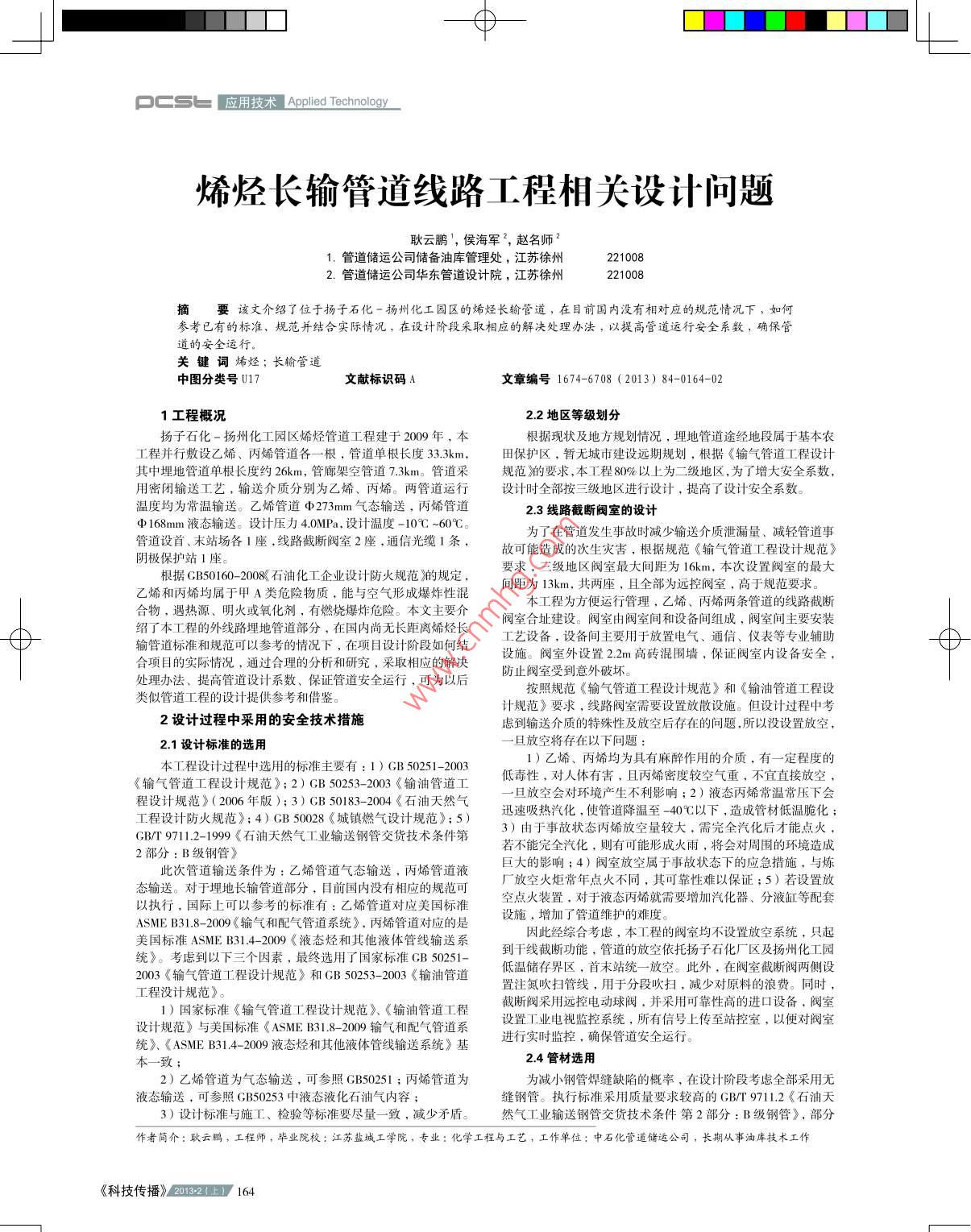 _φ-口TTPCS 5b應(yīng)用技術(shù)Applied Technloy_烯烴長輸管道線路工程相關(guān)設(shè)計問題耿云鵬',侯海軍,趙名師2.管道儲運(yùn)公司儲備油庫管理處,江蘇徐州2210082. 管道儲運(yùn)公司華東管道設(shè)計院,江蘇徐州摘。要該文介紹了位于揚(yáng)子石化 -揚(yáng)州化工園區(qū)的烯烴長輸管道.在目前國內(nèi)沒有相對應(yīng)的規(guī)范情況下,如何參者已有的標(biāo)準(zhǔn)、規(guī)范并結(jié)合實(shí)際情況.在設(shè)計階段采取相應(yīng)的解決處理辦法,以提高管道運(yùn)行安全系數(shù),確保管道的安全運(yùn)行。關(guān)鍵詞烯烴;長輸管道中圖分類號U17文獻(xiàn)標(biāo)識碼A文章編號1674-6708 (2013) 84-0164-021工程概況2.2地區(qū)等級劃分揚(yáng)子石化-揚(yáng)州化工園區(qū)烯烴管道工程建于20090年,本根據(jù)現(xiàn)狀及地方規(guī)劃情況,埋地管道途經(jīng)地段屬于基本農(nóng)工程并行敷設(shè)乙烯、丙烯管道各一-根 .管道單根長度3.3k3m.田保護(hù)區(qū).暫無城市建設(shè)遠(yuǎn)期規(guī)劃,根據(jù)《輸氣管道工程設(shè)計其中埋地管道單根長度約26km,管廊架空管道7.3km。管道采規(guī)范)的要求,本工程80%以上為二級地區(qū),為了增大安全系數(shù),用密閉輸送工藝.輸送介質(zhì)分別為乙烯、丙烯。兩管道運(yùn)行設(shè)計時全部按三級地區(qū)進(jìn)行設(shè)計,提高了設(shè)計安全系數(shù)。溫度均為常溫輸送。乙烯管道φ 273mm氣態(tài)輸送,丙烯管道2.3 線路截斷閥室的設(shè)計φ 168mm液態(tài)輸送。設(shè)計壓力4.0MPa,設(shè)計溫度-10C; ~60C。管道設(shè)首、末站場各1座,線路截斷閥室2座,通信光纜1條.為了在管道發(fā)生事故時減少輸送介質(zhì)泄漏量、減輕管道事陰極保護(hù)站1座故可能造成的次生災(zāi)害,根據(jù)規(guī)范《輸氣管道工程設(shè)計規(guī)范》根據(jù)GB50160- 2008(石油化工企業(yè)設(shè)計防火規(guī)范》的規(guī)定,要求 ,三級地區(qū)閥室最大間距為l6km.本次設(shè)置閥室的最大乙烯和丙烯均屬于甲A類危險物質(zhì).能與空氣形成爆炸性混間距為13km,共兩座,且全部為遠(yuǎn)控閥室.高于規(guī)范要求。合物,遇熱源、明火或化啊,有他現(xiàn)服有充低能求發(fā)炸性況本工程為方便運(yùn)行管理,乙烯、丙烯兩條管道的線路截斷紹了本工程的外線路埋地管道部分.在國內(nèi)尚無長距離烯烴長閥室合址建設(shè)。閥室由閥室間和設(shè)備間組成,閥室間主要安裝輸管道標(biāo)準(zhǔn)和規(guī)范可以參考的情況下,在項(xiàng)目設(shè)計階段如何結(jié)工藝設(shè)備,設(shè)備間主要用于放置電氣、通信、合項(xiàng)目的實(shí)際情況,通過合理的分析和研究,采取相應(yīng)的解決防止閥室卜破壞。! 高磚混圍墻,保證閥室內(nèi)設(shè)備安全,處理辦法、提高管道設(shè)計系數(shù)、保證管道安全運(yùn)行,可為以后按照規(guī)范 《輸氣管道工程設(shè)計規(guī)范》和《輸油管道工程設(shè)類似管道工程的設(shè)計提供參考和借鑒。計規(guī)范》要求,線路閥室需要設(shè)置放散設(shè)施。但設(shè)計過程中考2設(shè)計過程中采用的安全技術(shù)措施慮到輸送介質(zhì)的特殊性及放空后存在的問題.所以沒設(shè)置放空,2.1設(shè)計標(biāo)準(zhǔn)的選用一旦放空將存在以下問題:本工程設(shè)計過程中選用的標(biāo)準(zhǔn)主要有:1)CB 50251-20031)乙烯、丙烯均為具有麻醉作用的介質(zhì),有一-定程度的《輸氣管道工程設(shè)計規(guī)范》;2) CB 50253.2003《輸油管道工低毒性,對人體有害,且丙烯密度較空氣重,不宜直接放空,程設(shè)計規(guī)范》(2006年版);3) GB 50183- -2004《石油天然氣一旦放空 會對環(huán)境產(chǎn)生不利影響;2)液態(tài)丙烯常溫常壓下會工程設(shè)計防火規(guī)范》;4) CB 50028《城鎮(zhèn)燃?xì)庠O(shè)計規(guī)范》;5)迅速吸熱汽化.使管道降溫至-40工以下,造成管材低溫脆化;CB/T 9711.2-19993)由于事故狀態(tài)丙烯放空量較大,需完全汽化后才能點(diǎn)火,717219《石油天然氣工業(yè)輸送鋼管交貨技術(shù)若不能完全汽化,則有可能形成火雨,將會對周圍的環(huán)境造成態(tài)輸送。次管道輸送條件為:乙烯管道氣態(tài)輸送,丙烯管道液廠眾空火炬需年點(diǎn)不商,用于可松在下的應(yīng)急措施,與雄對于埋地長輸管道部分,目前國內(nèi)沒有相應(yīng)的規(guī)范可常年點(diǎn)火不同,其可靠性難以保證;5)若設(shè)置放以執(zhí)行.國際上可以參考的標(biāo)準(zhǔn)有:乙烯管道對應(yīng)美國標(biāo)準(zhǔn)空點(diǎn)火裝置,對于液態(tài)丙烯就需要增加汽化器、分液缸等配套ASME B31.8. 2009《輸氣和配氣管道系統(tǒng)》.丙烯管道對應(yīng)的是設(shè)施,增加了管道維護(hù)的難度。美國標(biāo)準(zhǔn)ASMIE B31.4 2009《液態(tài)烴和其他液體管線輸送系因此經(jīng)綜合考慮 ,本工程的閥室均不設(shè)置放空系統(tǒng),只起統(tǒng)》??紤]到以下三個因素,最終選用了國家標(biāo)準(zhǔn)GB 50251-到干線截斷功能.管道的放空依托揚(yáng)子石化廠區(qū)及揚(yáng)州化工園2003《輸氣管道工程設(shè)計規(guī)范》和GB 50253. 2003《輸油管道低溫儲存界區(qū),首末站統(tǒng)- -放空。此外.在閥室截斷閥兩側(cè)設(shè)工程沒計規(guī)范》。置注氨吹掃管線,用于分段吹掃,減少對原料的浪費(fèi)。同時,1)