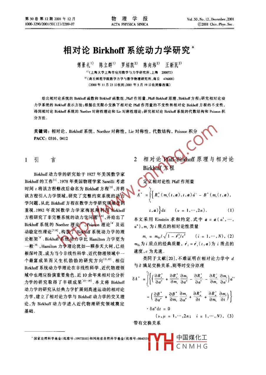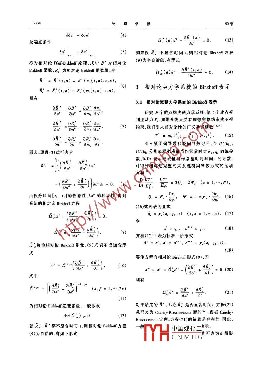 第50卷第12期2001件12月物理學(xué)報(bào)Vol 50, No, 12, December, 200110003290/2001/50(12)1289-0ACTA PHYSICA SINICA@2001 Chin. Phys. S相對(duì)論 Birkhof'系統(tǒng)動(dòng)力學(xué)研究傅景禮》)陳立群》)羅紹凱2)陳向煒2)王新民1)(上海大學(xué)上海市應(yīng)用數(shù)學(xué)與力學(xué)研究所,上海20072)(商丘師范學(xué)院數(shù)學(xué)力學(xué)與數(shù)學(xué)物理研究所,商丘4760002000年11月23日收到;200年S月19日收到修改稿給出相對(duì)論系統(tǒng)的Birh函數(shù)和Bikh函數(shù)組、Pa作用量、 Pfaff- Birkh原理、 Birkhof方程;研究相對(duì)論動(dòng)力學(xué)系統(tǒng)的Bdho表示方法;根據(jù)在無限小變換下相對(duì)論P(yáng)作用量的不變性和相對(duì)論Bikh方程的不變性得到相對(duì)論 Birkho系統(tǒng)的 Noether對(duì)稱性理論和lie對(duì)稱性理論;研究相對(duì)論 Birkhof系統(tǒng)的代數(shù)結(jié)構(gòu)和 Poisson分方法關(guān)鍵詞:相對(duì)論, Birkhof系統(tǒng), Noether對(duì)稱性,Iie對(duì)稱性,代數(shù)結(jié)構(gòu), Poisson積分PACC:0316,04122相對(duì)論 Pfaff-Birkhe原理與相對(duì)論Bkho方程Biho動(dòng)力學(xué)的研究始于1927年美國(guó)數(shù)學(xué)家Biho的工作.1978年美國(guó)物理學(xué)家Snli考慮定義相對(duì)論性Pa作用量時(shí)間t將該方程修改后命名為Bkho方程2,并將該方程引入力學(xué)領(lǐng)域研究了完整約束系統(tǒng)的動(dòng)力A={R:(m(,a),t,a)d-B'(m,(t,a)學(xué)問題,從此 Birkhof方程在數(shù)學(xué)力學(xué)研究領(lǐng)域受到重視.1992年我國(guó)數(shù)學(xué)力學(xué)家梅風(fēng)翔利用 Birtht,a)ldt (v=I(1)方程研究了非完整系統(tǒng)的動(dòng)力學(xué)問題“,并給出了本文采用 Einstein求和約定式中a=a(a1,…,Birkhoff系統(tǒng)的 Noether 3理論”, Poisson理論及運(yùn)),m為;質(zhì)點(diǎn)的相對(duì)論性質(zhì)量動(dòng)穩(wěn)定性理論,構(gòu)筑了Bdh系統(tǒng)動(dòng)力學(xué)的理論框架°. Birkhof系統(tǒng)動(dòng)力學(xué)比 hamilton力學(xué)更為mo/√1-r/i=1,…,N),(2)般1, Hamilton力學(xué)理論猶如一顆參天大樹,已經(jīng)mo為i質(zhì)點(diǎn)的經(jīng)典質(zhì)量,r=i,(t,a)為i質(zhì)點(diǎn)的根深葉茂,成為當(dāng)今非線性科代物理領(lǐng)域中一速度,c為光速個(gè)最富成果而又生機(jī)勃勃的研究方向H.相信類同于文獻(xiàn)[20],不難證明在相對(duì)論力學(xué)中dBih系統(tǒng)動(dòng)力學(xué)理論在非線性科學(xué)、近代物理領(lǐng)與6滿足交換關(guān)系,則等時(shí)變分原理域中也理應(yīng)扮演重要角色近10余年來相對(duì)論分析aRaR am aR aRam力學(xué)的研究取得了豐碩成果"m.本文將BMm6A·={(ag+am,odaa動(dòng)力學(xué)的研究從經(jīng)典力學(xué)擴(kuò)展到高速運(yùn)動(dòng)的相對(duì)論力學(xué),建立了相對(duì)論力學(xué)與 Birkhof動(dòng)力學(xué)的交叉理aBaBam, ar. ar:ada" at am a論,為 Birkhof動(dòng)力學(xué)進(jìn)入近代物理研究領(lǐng)域奠定基礎(chǔ)da dt= 0y,=1,…,2n;i=1,…,N),(3)帶有交換關(guān)系國(guó)家自然科學(xué)基金(批準(zhǔn)號(hào):19972010)和河南省自然科學(xué)基金(批準(zhǔn)號(hào):984053中國(guó)煤化工CNMHG2290物理學(xué)報(bào)daa= 8da(4)及端點(diǎn)條件B'(a)=6a(5)如果僅R不顯含時(shí)間t,則相對(duì)論 Birkhoff方程稱為相對(duì)論hf,Biho原理式中B為相對(duì)論(9)為半自治的有形式Birkhof函數(shù),R;為相對(duì)論 Birkhoff函數(shù)組令:(a)a-9B”(a)=0B’=B'(t,a)=B'(m(t,a),t,a)R=R:(t,a)=R:(m;(t,a),t,a),3相對(duì)論動(dòng)力學(xué)系統(tǒng)的Bkh表示則有3.1相對(duì)論完整力學(xué)系統(tǒng)的 Birkho表示e-2aBam研究N個(gè)質(zhì)點(diǎn)構(gòu)成的力學(xué)系統(tǒng),第i個(gè)質(zhì)點(diǎn)受到主動(dòng)力F;,如果系統(tǒng)只受有理想完整約束或不受aa" aa" am aa(7)約束,我們引入相對(duì)論性的廣義動(dòng)能函數(shù)3T=mac2(1-√1-P2).(15引入凝固偏導(dǎo)數(shù)和凝固導(dǎo)數(shù)記號(hào),令Ⅱ那么,原理(3)式可表為/q,分別表示把質(zhì)量當(dāng)作常量時(shí)對(duì)q,q,的偏導(dǎo)數(shù),D/Dt表示把質(zhì)量當(dāng)作常量時(shí)對(duì)時(shí)間t的導(dǎo)數(shù)8A·=可得到相對(duì)論完整約束系統(tǒng)凝固導(dǎo)數(shù)形式的運(yùn)動(dòng)方程aB8a"dt=0.(8)2Q,+2Ws(s=1,…,N)由積分區(qū)間[t,t2]的任意性,8a的獨(dú)立性,得到Q系統(tǒng)的相對(duì)論 Birkhof方程(16)式可表為顯式∩aBq,=g,()(s,k=1令(9)方程(17)可表為標(biāo)準(zhǔn)一階形式稱為相對(duì)論Brkh張量.(9)式表示成逆變形i'=o,o'=a,o"'=g, (gs, 9, 4).式要使方程有相對(duì)論 Birkhof形式(9),即B·Rb. aR式中則有(21)(11)為相對(duì)論 Birkhof逆變張量.一般假設(shè)對(duì)于給定的B,無論R’是否顯含時(shí)間t,方程(21e(n)≠0(12)總可表為 Cauchy-KoBarmeBcKas型的21.根據(jù) cauchyKoBareBcKas定理,方程(21)的解總是存在的因此若R,B·都不顯含時(shí)間t,則相對(duì)論 Birkhoff方程TH中國(guó)煤化工示(9)為自治的有如下形式:CNMH統(tǒng)可表為正則形12期傅景禮等:相對(duì)論 Birth系統(tǒng)動(dòng)力學(xué)研究2291式0a"a、分取B’為相對(duì)論 Hamilton函數(shù),則(22)式自然有+FE-B廣-:(R;F.-B”}=0.(2)BihM表示,即相對(duì)論完整動(dòng)力學(xué)系統(tǒng)都可納人引入規(guī)范函數(shù)P=P(t,a),在(29)式中相加并相減Bih系統(tǒng)eP,得到32相對(duì)論非完整動(dòng)力學(xué)系統(tǒng)的Brkh表示(RF.-B+P)