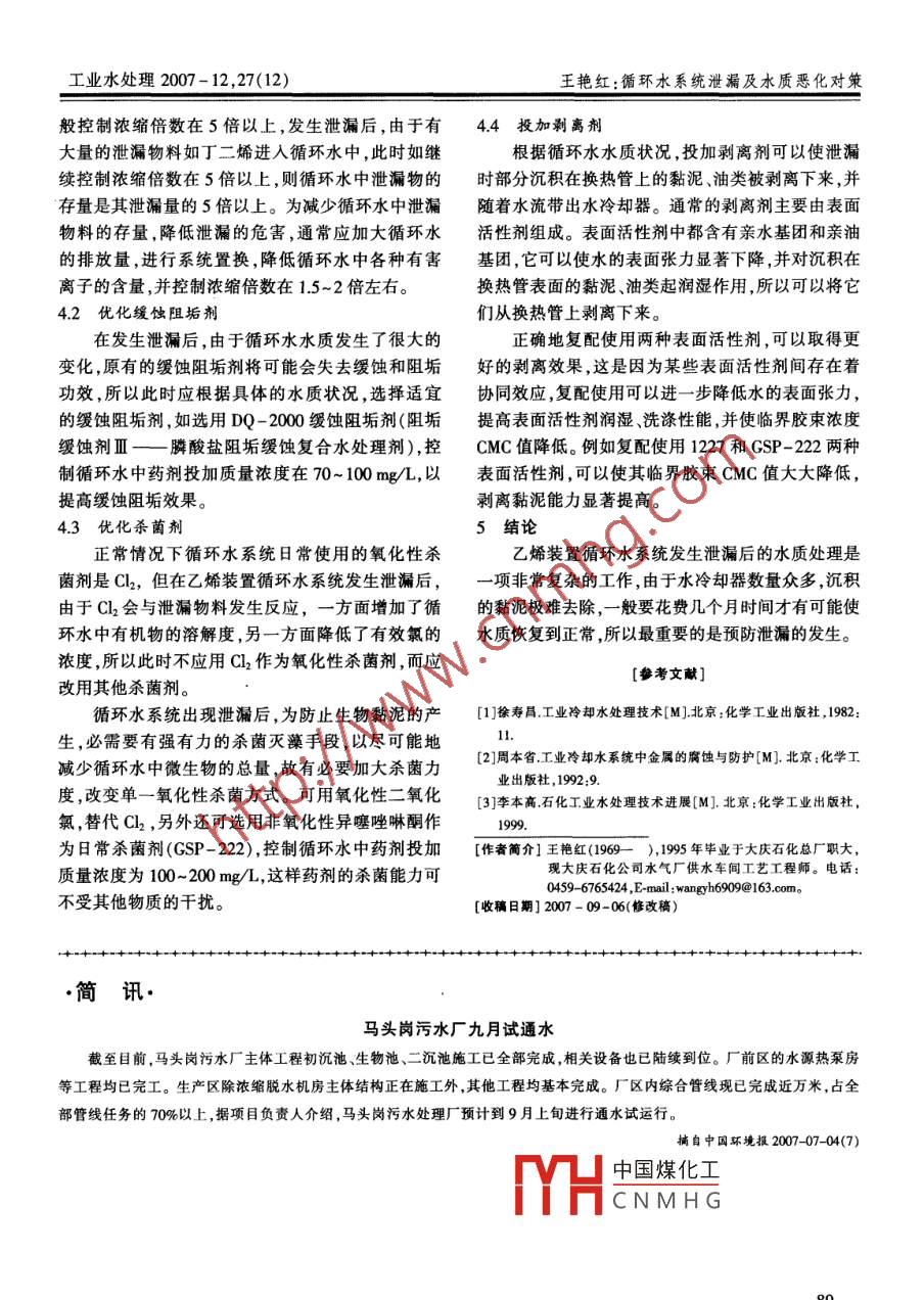 第27卷第12期工業(yè)水處理VolL.27 No.12.2007年12月Industrial W ater TreatmentDec. ,2007循環(huán)水系統(tǒng)泄漏及水質(zhì)惡化對(duì)策王艷紅(大慶石化公司水氣廠供水車間,黑龍江大慶163714)[摘要]循環(huán)水系統(tǒng)泄漏主要是由工藝物料腐蝕和循環(huán)水腐蝕引起。泄漏導(dǎo)致水質(zhì)惡化,加劇沉積和腐蝕的進(jìn)一步發(fā)生,從而降低換熱器換熱效率。泄漏發(fā)生后,應(yīng)通過調(diào)整工藝及水處理方案,控制微生物滋生,采取黏泥剝離等方法,維持水系統(tǒng)正常運(yùn)行。[關(guān)鍵詞]循環(huán)水系統(tǒng);化工裝置;泄漏介質(zhì);應(yīng)急對(duì)策[中圖分類號(hào)] TQ085*.412 [文獻(xiàn)標(biāo)識(shí)碼]B [文章編號(hào)] 1005 - 829X(2007)12- 0086-04Countermeasure of the leaking and worsening of water qualityin the circulating water systemWang Yanhong(Water Supply Workshop, W ater & Steam Plant, Daqing Petrochemical Co. , Daqing 163714, China)Abstract:Circulating water system leaking is caused by raw material corrosion and circulating water corrosion.The leaking worsens the water quality, results in more sediment and further corrosion, and thus lowers the heatexchange efficiency of the heat exchanger. After leaking occurs,the technics and water treatment proposalshould be adjusted so as to control microbe growing,and viscous mud should be peeled off so as to maintainnormal running of the water system.Key words :circulating water systerm; chemical equipment; leaking media; emergent countermeasure循環(huán)水系統(tǒng)工藝泄漏是指循環(huán)冷卻水系統(tǒng)水卻器 提供循環(huán)冷卻水。一循環(huán)系統(tǒng)水質(zhì)穩(wěn)定技術(shù)采冷卻器內(nèi)換熱管發(fā)生穿孔或破裂,使各種化工工藝用磷鋅緩蝕阻垢配方,循環(huán)水量為4.2x10*m3/h,系物料進(jìn)人到循環(huán)水中的現(xiàn)象。大慶石化公司一循環(huán)統(tǒng)容量為1.8x 104 m',濃縮倍數(shù)5(以K計(jì)),排污量裝置主要為裂解、動(dòng)力、加氫、丁二烯抽提、芳烴、60 m2/h,補(bǔ)水量450 m2/h。補(bǔ)充水水質(zhì)見表1。MTBE、丁辛醇、丙烯腈造氣硫氰酸鈉等裝置水冷系統(tǒng)換熱:器材質(zhì)主要為碳鋼,在--循環(huán)系統(tǒng)中,.表1 補(bǔ)充水水質(zhì)鈣硬度總硬度鎂硬度總堿度pH(以碳酸鈣計(jì))/ (以碳酸鈣計(jì))/ (以碳酸鈣計(jì))/ (以碳酸鈣計(jì))/總?cè)芄?K*/Cl(mg:L")(mg+L")(mg*L")(mg*L)7.87-8.6572.8-113101 ~16528.2-52.0120~202140~ 2801.50-1.90 .10.0~ 18.0這些泄漏物料既包括輕組分的C~ C4,又含有Cs~C,的換熱管內(nèi)或包圍著換熱管,由于換熱管表面的不等重組分,還有HS.CO2氣體等?;ぱb置循環(huán)水均勻性,就很容易在換熱管表面形成微電池,發(fā)生腐系統(tǒng)發(fā)生泄漏后,由于多種工藝物料進(jìn)人循環(huán)水蝕,在腐蝕電池中陰極反應(yīng)主要是氧的還原,陽極反中,將引起水中雜質(zhì)和離子含量的顯著變化,導(dǎo)致應(yīng)則是鐵的溶解。碳鋼在水中發(fā)生的腐蝕反應(yīng)見式循環(huán)水水質(zhì)惡化,使水冷卻器發(fā)生嚴(yán)重的腐蝕和沉(1)~式(3)。積危害,影響乙烯裝置的正常運(yùn)行。中國煤化工(1)1泄漏的原因CHCNMH G40H2)1.1循環(huán)水對(duì)水冷卻器的腐蝕總應(yīng):ZFe+2H2U+U2- +2Fe(OH)2↓(3)在循環(huán)水系統(tǒng)中,循環(huán)水始終充滿著水冷卻器在腐蝕過程中,鐵生成Fe(OH)2從溶液中沉淀36 -工業(yè)水處理2007 - 12,27(12)王艷紅:循環(huán)水系統(tǒng)泄漏及水質(zhì)惡化對(duì)策.出來。由于Fe(OH)2在含氧的水中不穩(wěn)定,它將進(jìn)涂料,也可能出現(xiàn)問題,這主要是由于部分涂料- - 旦一步氧化生成Fe(OH)3(鐵銹),由于鐵銹基本不脫落,就很容易形成大陰極小陽極的腐蝕電池使換溶于水,所以只要水中不斷有O2溶人,就不斷會(huì)有熱管在涂料脫落處腐蝕穿孔。Fe(OH)3生成,見式(4)。2泄 漏對(duì)水質(zhì)的影響2Fe(OH)2+ 2H20+1/202→2Fe(OH)3↓(4)水冷卻器發(fā)生泄漏后,各種化工工藝物料將進(jìn)其次,金屬的垢下電化學(xué)腐蝕存在自催化作人到循環(huán)水中,使水中增加了多種有害雜質(zhì)和離子,用,將加速金屬的腐蝕。因此隨著使用時(shí)間的增加,水質(zhì)將會(huì)發(fā)生明顯惡化,一般表現(xiàn)為微生物超標(biāo),水腐蝕將進(jìn)一步增加,水冷卻器的壁厚逐漸變薄,最中黏泥含量激增,pH下降。終發(fā)生破裂或穿孔。2.1 水質(zhì)的富營養(yǎng)化產(chǎn)生生物黏泥1.2 工藝物料對(duì)水冷卻器的腐蝕泄漏物中的重組分有機(jī)物可為某些細(xì)菌(如假在化工裝置中,工藝物料泄漏后,各種化工工單孢菌、脫硫弧菌)提供作為營養(yǎng)的碳源(3),所以發(fā)藝物料進(jìn)人循環(huán)水中,使水中增加了多種有害雜質(zhì)生泄漏之后,循環(huán)水中的營養(yǎng)成分顯著增多,微生物和離子,導(dǎo)致水質(zhì)惡化,對(duì)水冷卻器的腐蝕主要是的繁殖得以加速。例如循環(huán)水系統(tǒng)發(fā)生泄漏后,水急冷系統(tǒng)急冷水的腐蝕和裂解汽油加氫系統(tǒng)HS的中的異養(yǎng)菌的數(shù)量會(huì)比泄漏前增加,通常會(huì)達(dá)到甚腐蝕。至超過1x 10* mL-'。微生物增加,必然會(huì)引起水中生(1)急冷水的腐蝕。在裂解氣中,含有酸性氣物黏泥的增加,這對(duì)水冷卻器的正常運(yùn)行將產(chǎn)生嚴(yán)體,主要是CO2和HS,另外還含有少量有機(jī)硫化重的影響。物,如硫化碳、二硫化碳、硫醚、硫醇及噻吩等,硫化2.2產(chǎn)生化學(xué)黏泥物總