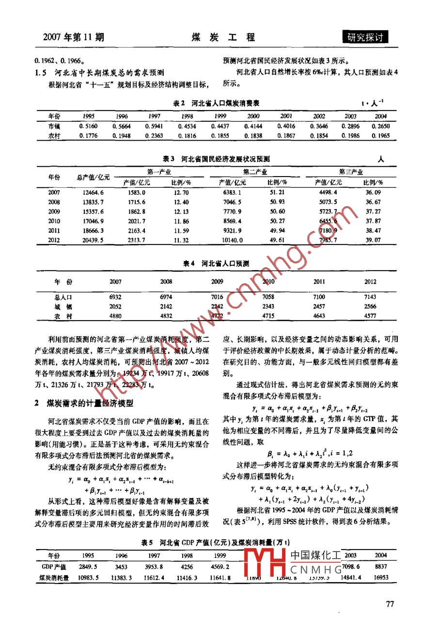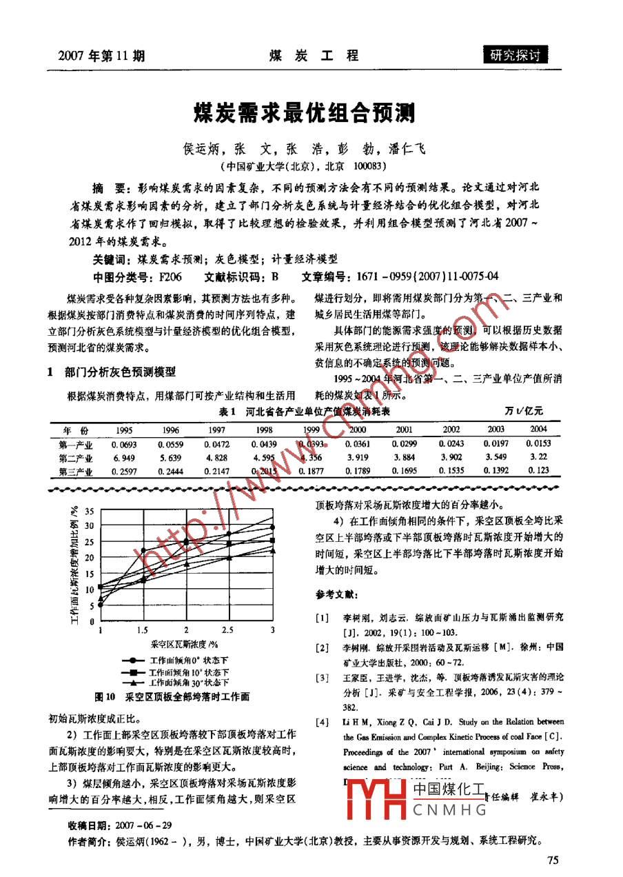 2007年第11期煤炭工程研究探討煤炭需求最優(yōu)組合預(yù)測(cè)侯運(yùn)炳,張文,張浩,彭勃,潘仁飛(中國礦業(yè)大學(xué)(北京),北京10083)摘要:影響煤炭需求的因素復(fù)雜,不同的預(yù)測(cè)方法會(huì)有不同的預(yù)測(cè)結(jié)果。論文通過對(duì)河北省煤炭需求影響因素的分析,建立了部門分析灰色系統(tǒng)與計(jì)量經(jīng)濟(jì)結(jié)合的優(yōu)化組合模型,對(duì)河北省煤炭需求作了回歸模擬,取得了比較理想的檢驗(yàn)效果,并利用組合模型預(yù)測(cè)了河北省2007 ~2012年的煤炭需求。關(guān)鍵詞:煤炭需求預(yù)測(cè);灰色模型;計(jì)量經(jīng)濟(jì)模型中圖分類號(hào): F206文獻(xiàn)標(biāo)識(shí)碼: B文章編號(hào): 1671 -0959(2007)11-0075-04煤炭需求受各種復(fù)雜因索影響,其預(yù)測(cè)方法也有多種。煤進(jìn)行劃分,即將需用煤炭部門分為第一、二、三產(chǎn)業(yè)和根據(jù)煤炭按部門消費(fèi)特點(diǎn)和煤炭消費(fèi)的時(shí)間序列特點(diǎn),建城鄉(xiāng)居民生活用煤等部門。立部門分析灰色系統(tǒng)模型與計(jì)量經(jīng)濟(jì)模型的優(yōu)化組合模型,具體部門的能源需求強(qiáng)度的預(yù)測(cè),可以根據(jù)歷史數(shù)據(jù)預(yù)測(cè)河北省的煤炭簡求。采用灰色系統(tǒng)理論進(jìn)行預(yù)測(cè),該理論能夠解決數(shù)據(jù)樣本小、貧信息的不確定系統(tǒng)的預(yù)測(cè)問題。1部門分析灰 色預(yù)測(cè)模型1995 ~2004年河北省第一、二、三產(chǎn)業(yè)單位產(chǎn)值所消根據(jù)煤炭消費(fèi)特點(diǎn),用煤部門可按產(chǎn)業(yè)結(jié)構(gòu)和生活用耗的煤炭如表1所示。表1河北省各產(chǎn)業(yè) 單位產(chǎn)值煤炭消耗表萬V億元F份1995199619971998199920002001200220032004第產(chǎn)業(yè) 0.06930. 05590.04720.04390.03930. 03610.02990.02430. 01970.0153第二產(chǎn)業(yè)6. 9495. 6394.8284.5954.3563.9193. 8843. 9023.5493.22第三產(chǎn)業(yè)0. 25970. 24440.21470. 20150. 18770.17890. 16950. 15350. 1392 .0.123頂板垮落對(duì)采場(chǎng)瓦斯依度增大的百分率越小。.員354)在工作面傾角相同的條件下,采空區(qū)頂板全垮比采空區(qū)上半部垮落或下半部頂板垮落時(shí)瓦斯?jié)舛乳_始增大的25 t時(shí)間短,采空區(qū)上半部垮落比下半部筠落時(shí)瓦斯?jié)舛乳_始2015增大的時(shí)間短。10參考文獻(xiàn):[1]李樹剛,劉志云,綜放面礦山壓力與瓦斯涌出監(jiān)鍘研兗22.5[J]. 2002, 19(1): 100- 103.采空區(qū)瓦斯?jié)舛?%[2]李樹剛,綜放開采圍巖活動(dòng)及瓦斯運(yùn)移[M]. 徐州:中國◆-工作面傾角0°狀態(tài)下礦業(yè)大學(xué)出版社,2000; 60-72.工作面傾角10'狀態(tài)下[3]王家臣,王進(jìn)學(xué),沈杰,等頂板垮落誘發(fā)瓦斯災(zāi)害的理論-士工作面候角30°狀態(tài)下分析[J].采礦與安全工程學(xué)報(bào),2006, 23(4): 379 ~團(tuán)10采空區(qū)頂板全部垮落 時(shí)工作面82.初始瓦斯?jié)舛瘸烧?。[4} liHM, XiongZQ, CaiJ D. Study on the Relation between2)工作面上部采空區(qū)頂板垮落較下部頂板垮落對(duì)工作the Gas Emision and Complex Kinetic Proes of coal Face [C].面瓦斯?jié)舛鹊挠绊懸?特別是在采空區(qū)瓦斯?jié)舛容^高時(shí),Proeeding of the 2007 ' intermational Bympoeiun oa salety上部頂板垮落對(duì)工作面瓦斯?jié)舛鹊挠绊懜蟆cience and technology: Purt A. Beijin: Science Pres,3)煤層傾角越小,采空區(qū)頂板垮落對(duì)采場(chǎng)瓦斯?jié)舛扔爸袊夯と尉庉嫶抻镭S)響增大的百分率越大,相反,工作面傾角越大,則采空區(qū)THCNMHG收稿日期: 2007 -06 -29作者簡介:侯運(yùn)炳(1962- ), 男,博士,中國礦業(yè)大學(xué)(北京)教授,主要從事資源開發(fā)與規(guī)劃、系統(tǒng)工程研究。75研究探討煤炭工程2007年第11期.1.1第一產(chǎn)業(yè)煤炭 需求強(qiáng)度預(yù)測(cè)i=((1), (2), ..,彩(10))由表1中第- -產(chǎn)業(yè)單位產(chǎn)值煤炭消統(tǒng)計(jì)數(shù)據(jù)得:= ( 0.0406, 0.0377, 0.0346, 0.0317, 0.0291,x{°) = (x(°(1) ,x°(2) ,x(°)(3) ,x")(4) ,x(0(5),0.267, 0.0245, 0. 0224, 0. 0205)x(0(6) ,x(°(7) ,x'")(8) ,x("(9) ,xI0)(10))殘差序列為:= ( 0.0693, 0.0559, 0.0472, 0.0439, 0.0393,8=(e(1), e(2), ", e(10))0.0361, 0.0299, 0.0243, 0.0197, 0.0153)。=(0,-0.00064, -0.00023, -0. 0049, 0. 006,引人一階弱化算子D,令:0.000, 0.00015,-0. 0046,-0. 0089)x(°D = . (x("(1)d,X(o) ()d,()d,x("(4)d, .其相對(duì)誤差序列為:x°(5)d,X(0) (6)d,x"(7)d,x("(8)d,x(o) (9)d, .▲= (0,一0.0173,- 0.0067, 0.0151, 0. 0255,x(0) (10)d)。0.0293,0.0059, - 0.0289, 0. 0449)其中預(yù)測(cè)平均絕對(duì)誤差為:x{°)(k)d = [x(9)(k) +x(9)(k+1-......+.0=0214.1 =0.0184x{(n)]/(n-k+1);k= 1,2*,n,于是得:因此,其預(yù)測(cè)精度為- -級(jí)。同時(shí)由于a =0.0149 <0.3.x' (0)D = (x(°》(1)d,x(0) (2)d,x(')(3)d,XI0) (4)d,因此可用該模型對(duì)河北省第一產(chǎn)業(yè)單位產(chǎn)值煤炭需求進(jìn)行x{)(5)d,x(O)(6)d,xio) (7)d,x(')(8)d,X(0) (9)d,x'0》(10)d) =0.0406, 0.0371, 0.0343, 0. 0322, 0. 0298,中長期預(yù)測(cè)。利用該模型可以預(yù)測(cè)2007 ~2012年河北省第一產(chǎn)業(yè)的煤炭消耗強(qiáng)度分別為0.0146、0.0134、 0.0123、0.0275, 0.0246, 0. 0219, 0. 0175, 0. 0153)令X = x'°)D=(x(1),*(2) ,(3),.",x(10)) =0.0112、0. 0103、0. 0095。( 0.0406,0.0371, 0.0343, 0.0322, 0.0298, 0. 0275,1.2 第二產(chǎn)業(yè)煤炭需求強(qiáng)度預(yù)測(cè)由表1可看出,河北省第二產(chǎn)業(yè)單位產(chǎn)值煤炭消耗的0.0246, 0. 0219, 0.0175, 0. 0153)。變化比較