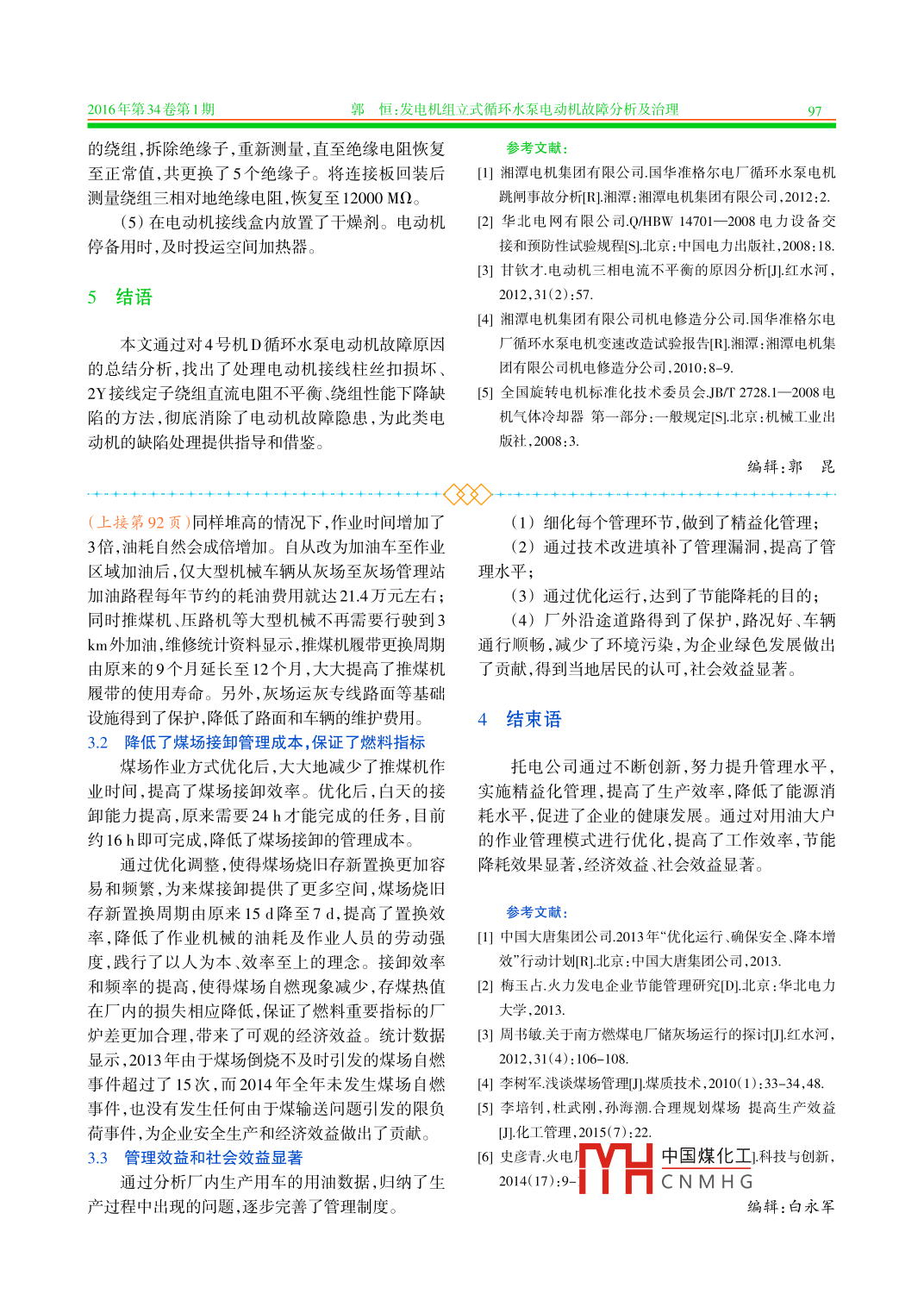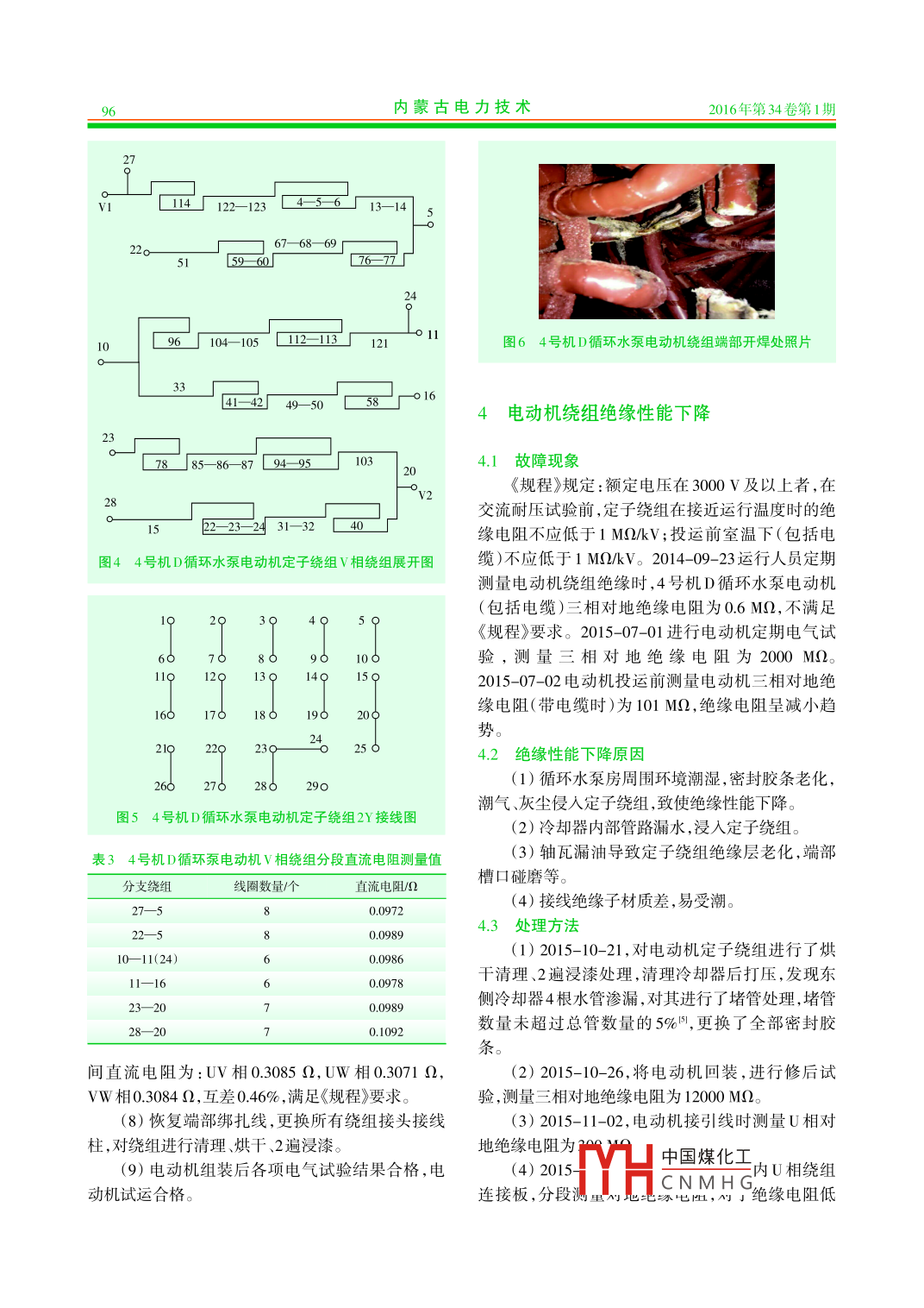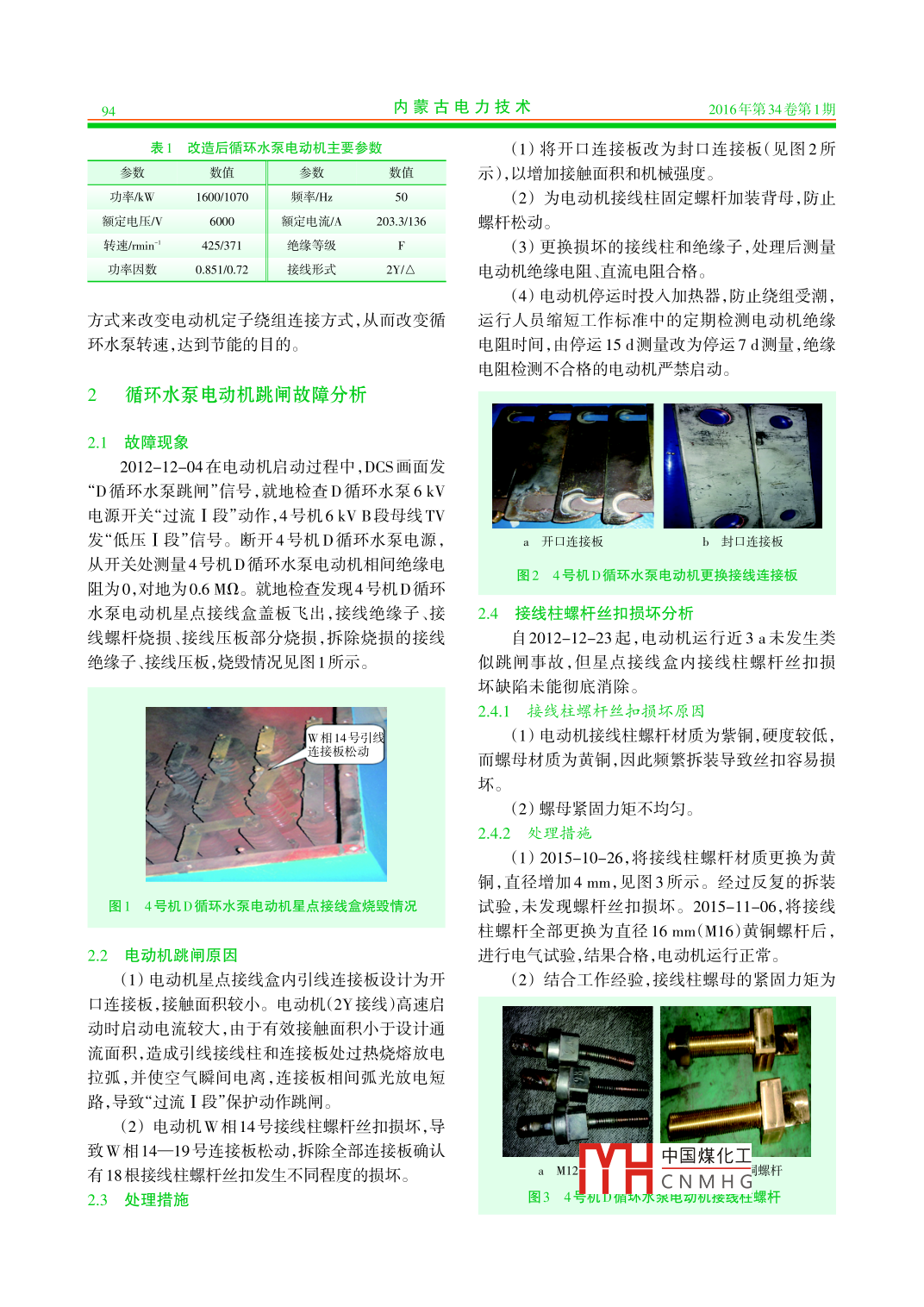 內蒙古電力技術2016年第34卷第1期INNER MONGOLIA ELECTRIC POWER .doi:10.3969/j.issn. 1008-6218.2016.01.014發(fā)電機組立式循環(huán)水泵電動機故障分析及治理郭恒(神華內蒙古國華準格爾發(fā)電有限責任公司,內蒙古鄂爾 多斯010300)摘要:神華內蒙古國華準格爾發(fā)電有限責任公司4號機D循環(huán)水泵電動機雙速改造后,在運行維護過程中,出現(xiàn)因接線柱螺絲松動導致電動機啟動后跳閘、定子繞組采用2Y接線時三相直流電阻不平衡、電動機繞組絕緣性能下降等問題。通過采取更換電動機接線連接板、絕緣子和接線柱,對繞組線圈連線焊接處進行補焊,冷卻器堵漏等措施,徹底消除了故障隱患,保證了循環(huán)水泵電動機的安全穩(wěn)定運行。關鍵詞:循環(huán)水泵;電動機;直流電阻;絕緣性能;接線柱;冷卻器;絕緣子文獻標志碼:B中圖分類號:TM621.7文章編號:1008- -6218(2016)01-0093-05Fault Analysis and Treatment of Vertical Circulating W ater Pump MotorGUO Heng(Shenhua Inner Mongolia Guohua Zhungeer Power Generation Co.,Ltd., Ordos 010300, China)Abstract: After circulation pumps D motor double speed transformation in GuohuaZhungeer Power Generation Co.,Ltd. No.4 unit, motor trip in the star operation because ofscrew terminal loose, phase DC resistance appear unbalance during stator winding 2Ywiring, simultaneously motor winding insulation gradually decline. By measures to replacingelectrical wiring board, posts and insulator, welding junction of windings, cooler plugging,completely eliminate the motor risks, also ensure safety and stable operation of units.Key words : circulating water pump; motor; DC resistance; insulation performance;posts; cooler; insulator1設備概況示。4號機組共有2臺循環(huán)水泵電動機,冬季1臺電動機低速運行,夏季2臺電動機高速運行,春、秋季神華內蒙古國華準格爾發(fā)電有限責任公司4號根據(jù)氣溫情況1臺高速或1臺低速運行。發(fā)電機組D循環(huán)水泵電動機為湘潭電機集團有限公電動機機座為長方體結構,橫截面為方形,在司生產(chǎn)的立式電動機,2007--09--30投運,電動機型機座東、西兩側面分別裝有水一空冷卻器;電動機號為YKSL1600- 14/1730-1。2010- -09- 14在湘潭電上軸承由推力軸承和導向軸承組成,型號為機集團有限公司電機修造分公司進行了雙速改造,SMZ12- 200- -6B;下軸承為圓柱滾子軸承,型號為改造后電動機型號為YKKL1600/1070- 14/16,將原NU 1048ECM ;接線盒位于機座南、北兩側,星點接線來14極雙Y接線改為14極雙Y和16極△2種接線盒內有29個絕緣子和接線柱,出線接線盒內有3個方式,并于2010-10-20投運,其主要參數(shù)如表1所絕緣子和接線柱.通過改變接線盒內接線柱的連接中國煤化工[收稿日期] 2015-11-27HCNMH G[作者簡介]郭恒(1981), 男,山西人,學士,工程師,從事發(fā)電廠電氣設備檢修工作。94內蒙古電力技術2016年第34卷第1期表1 改造后循環(huán)水泵電動機主要參數(shù)(1)將開口連接板改為封口連接板(見圖2所參數(shù)數(shù)值示),以增加接觸面積和機械強度。功率/W1600/1070頻率/Hz ;(2)為電動機接線柱固定螺桿加裝背母,防止額定電壓/V6000額定電流/A203.3/136螺桿松動。轉速/min'425/371絕緣等級(3)更換損壞的接線柱和絕緣子,處理后測量功率因數(shù)0.851/0.72接線形式2Y/O電動機絕緣電阻、直流電阻合格。(4)電動機停運時投人加熱器,防止繞組受潮,方式來改變電動機定子繞組連接方式,從而改變循運行人員縮短工作標準中的定期檢測電動機絕緣環(huán)水泵轉速,達到節(jié)能的目的。電阻時間,由停運15 d測量改為停運7d測量,絕緣電阻檢測不合格的電動機嚴禁啟動。2循環(huán)水泵電動機跳閘故障分析2.1故障現(xiàn)象2012- 12-04在電動機啟動過程中, DCS畫面發(fā)“D循環(huán)水泵跳閘”信號,就地檢查D循環(huán)水泵6kV電源開關“過流I段”動作,4號機6kV B段母線TV發(fā)“低壓I段”信號。斷開4號機D循環(huán)水泵電源,開口連接板b封口連接板從開關處測量4號機D循環(huán)水泵電動機相間絕緣電圖24號機D循環(huán)水泵電動機更換接線連接板阻為0,對地為0.6MQ。就地檢查發(fā)現(xiàn)4號機D循環(huán)水泵電動機星點接線盒蓋板飛出,接線絕緣子、接2.4接線 柱螺桿絲扣損壞分析線螺桿燒損、接線壓板部分燒損,拆除燒損的接線自2012-12-23起,電動機運行近3a未發(fā)生類絕緣子、接線壓板,燒毀情況見圖1所示。似跳閘事故,但星點接線盒內接線柱螺桿絲扣損壞缺陷未能徹底消除。2.4.1接線柱螺桿絲 扣損壞原因Iw相14號引線(1)電動機接線柱螺桿材質為紫銅,硬度較低,連接板松動而螺母材質為黃銅,因此頻繁拆裝導致絲扣容易損不。(2)螺母緊固力矩不均勻。2.4.2處 理措施(1) 2015-10-26,將接線柱螺桿材質更換為黃銅,直徑增加4mm,見圖3所示。經(jīng)過反復的拆裝圖14號機D循環(huán)水泵電動機星點接線盒燒毀情況試驗,未發(fā)現(xiàn)螺桿絲扣損壞。2015-11-06, 將接線柱螺桿全部更換為直徑16mm(M16)黃銅螺桿后,2.2電動機跳閘原因進行電氣試驗,結果合格,電動機運行正常。(1)電動機星點接線盒內引線連接板設計為開(2)結合工作經(jīng)驗,接線柱螺母的緊固力矩為口連接板,接觸面積較小。電動機(2Y接線)高速啟動時啟動電流較大,由于有效接觸面積小于設計通流面積,造成引線接線柱和連接板處過熱燒熔放電拉弧,并使空氣瞬間電離,連接板相間弧光放電短路,導致“過流I段"保護動作跳閘。(2) 電動機W相14號接線柱螺桿絲扣損壞,導致W相14-19號連接板松