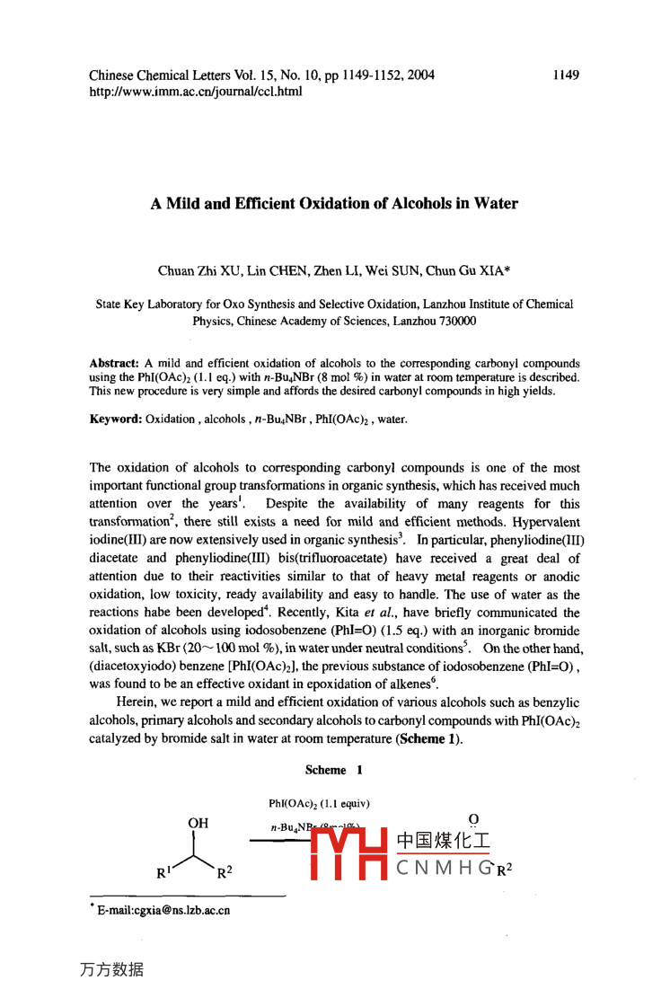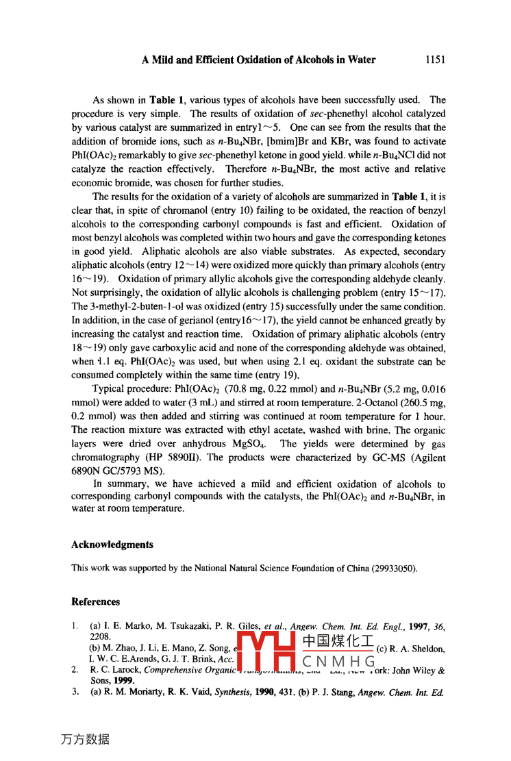 Chinese Chemical Letters Vol. 15, No.10, pp 1149-1152, 20041149htp://ww.imm.ac.cnjournalccl.htmlA Mild and Efficient Oxidation of Alcohols in WaterChuan Zhi XU, Lin CHEN, Zhen LI, Wei SUN, Chun Gu XIA*State Key Laboratory for Oxo Synthesis and Selective Oxidation, Lanzhou Institute of ChemicalPhysics, Chinese Academy of Sciences, Lanzhou 730000Abstract: A mild and efficient oxidation of alcohols to the corresponding carbonyI compoundsusing the PhI(OAc)2 (1.1 eq.) with n-Bu.NBr (8 mol %) in water at room temperature is described.This new procedure is very simple and affords the desired carbonyI compounds in high yields.Keyword: Oxidation , alcohols , n-Bu,NBr , PhI(OAc)2 , water.The oxidation of alcohols to corresponding carbonyl compounds is one of the mostimportant functional group transformations in organic synthesis, which has received muchattention over the years' .Despite the availability of many reagents for thistransformation', there still exists a need for mild and efficient methods. Hypervalentiodine(II) are now extensively used in organic synthesis'. In particular, phenyliodine(II)diacetate and phenyliodine(II) bis(urifluoroacetate) have received a great deal ofattention due to their reactivities similar to that of heavy metal reagents or anodicoxidation, low toxicity, ready availability and easy to handle. The use of water as thereactions habe been developed*. Recently, Kita et al, have briefly communicated theoxidation of alcohols using iodosobenzene (PhI=O) (1.5 eq,) with an inorganic bromidesalt, such as KBr <20~ 100 mol %), in water under neutral conditions'. On the other hand,(diacetoxyiodo) benzene [Ph(OAc)2], the previous substance of iodosobenzene (PhI=O),was found to be an effective oxidant in epoxidation of alkenes'.Herein, we report a mild and eficient oxidation of various alcohols such as benzylicalcohols, primary alcohols and secondary alcohols to carbonyl compounds with PhI(OAc)2catalyzed by bromide salt in water at room temperature (Scheme 1).Scheme 1PhI(OAC)2 (1.1 equiv)QH0中國煤化工RI'R2TYHCNMHGR2* E-mail:cgxia@ns.lzb.ac.cn1150Chuan Zhi XU et al. .Table 1 Oxidation of various alcohols with PhI(OAc)2 in H2O*EntrySubstrateProductTime(h)Yield(%)1c520.62d24.13698.54of2100qHi。R1=Me. Br. CF3R2=Me、C2H5OHoio)HpH1013.1的011moM如O°12O-oH< )=o11314iww15~ OH人n。16ppo341747.61849.6人oia, Unless otherwise noted, the reaction used n-Bu.NBr as the catalyst and the reaction conditionare: substrate : oxidant : catalyst= 1 : 1.11 m中國煤化工elds are average oftwo or more runs and base on the amount 0I1yst d. n-Bu,NCl ascatalyst. e. KBr as catalyst. f. [bmim]Br asfMYHC N M H Gyst=1:1.1 :0.25.h.Substrate : oxidant : catalyst= 1 :2.1 : 0.08.A Mild and Eficient Oxidation of Alcohols in Water1151As shown in Table 1, various types of alcohols have been successfully used. Theprocedure is very simple. The results of oxidation of sec-phenethyl alcohol catalyzedby various catalyst are summarized in entryl~5. One can see from the results that theaddition of bromide ions, such as n-Bu4NBr, [bmim]Br and KBr, was found to activatePhI(OAc)2 remarkably to give sec-phenethyl ketone in good yield. while n-Bu4NCI did notcatalyze the reaction effectively. Therefore n-Bu4NBr, the most active and relativeeconomic bromide, was chosen for further studies.The results for the oxidation of a variety of alcohols are summarized in Table1, it isclear that, in spite of chromanol (entry 10) failing to be oxidated, the reaction of benzylalcohols to the corresponding carbonyl compounds is fast and efficient. Oxidation ofmost benzyl alcohols was completed within two hours and gave the corresponding ketonesin good yield. Aliphatic alcohols are also viable substrates. As expected, secondaryaliphatic alcohols (entry 12 ~ 14) were oxidized more quickly than primary alcohols (entry16~ 19). Oxidation of primary allylic alcohols give the corresponding aldehyde cleanly.Not surprisingly, the oxidation of alylic alcohols is challenging problem (entry 15~17).The 3-methy1-2- buten- 1 ol was oxidized (entry 15) successfully under the same condition.In addition, in the case of gerianol (entry16~ 17), the yield cannot be enhanced greatly byincreasing the catalyst and reaction time. Oxidation of primary aliphatic alcohols (entry18~ 19) only gave carboxylic acid and none of the corresponding aldehyde was obtained,when 4.1 eq. PhI(OAc)2 was used, but when using 2.1 eq. oxidant the substrate can beconsumed completely within the same time (entry 19).Typical procedure: PhI(OAc) (70.8 mg, 0.22 mmol) and n-Bu4NBr (5.2 mg, 0.016mmol) were added to water (3 mL) and stired at room temperature.2-Octanol (260.5 mg,0.2 mmol) was then added and stiring was continued at room temperature for 1 hour.The reaction mixture was extracted with ethyI acetate, washed with brine. The organiclayers were dried over anhydrous MgSO4. The yields were determined by gaschromatography (HP 5890I1). The products were characterized by GC-MS (Agilent6890N GC/5793 MS).In summary, we have achieved a mild and efficient oxidation of alcohols tocorresponding carbonyl compounds with the catalysts, the PhI(OAc) and n-Bu4NBr, inwater at room temperature.AcknowledgmentsThis work was supported by the National Natural Science Foundation of China (29933050).References1. (a)1. E. Marko, M. Tsukazaki, P. R. Giles, et al, Angew. Chem. Int. Ed. Engl, 1997, 36,中國煤化工(b) M. Zhao, J. Li, E. Mano, Z. Song, e: (c) R. A. Sheldon,I w. C. E.Arends, G. J. T. Brink, Acc.YHCNMH G_2. R. C. Larock, Comprehensive Organic ........ u, 1 ork: John Wiley &Sons, 1999.3. (&) R. M. Moriarty, R. K. Vaid, Synthesis, 1990, 431. (b) P. J. Stang, Angew. Chem. Int Ed.1152Chuan Zhi XU et al.Engl, 1992, 31, 274. (c) P. J. Stang, V. V. Zhdankin, Chem. Rev, 1996, 96, 1123. (d) H.Tohma, S. Takizawa, T. Maegawa, Y. Kita, Angew. Chem. Int. Ed, 2000, 39, 1306. (e) H.Tohma, T. Maegawa, S. Takizawa, Y. Kita, Adv. Synth. Catal, 2002, 344.4. (a) Organic Symthesis in Water (Ed: P. A. Grieco