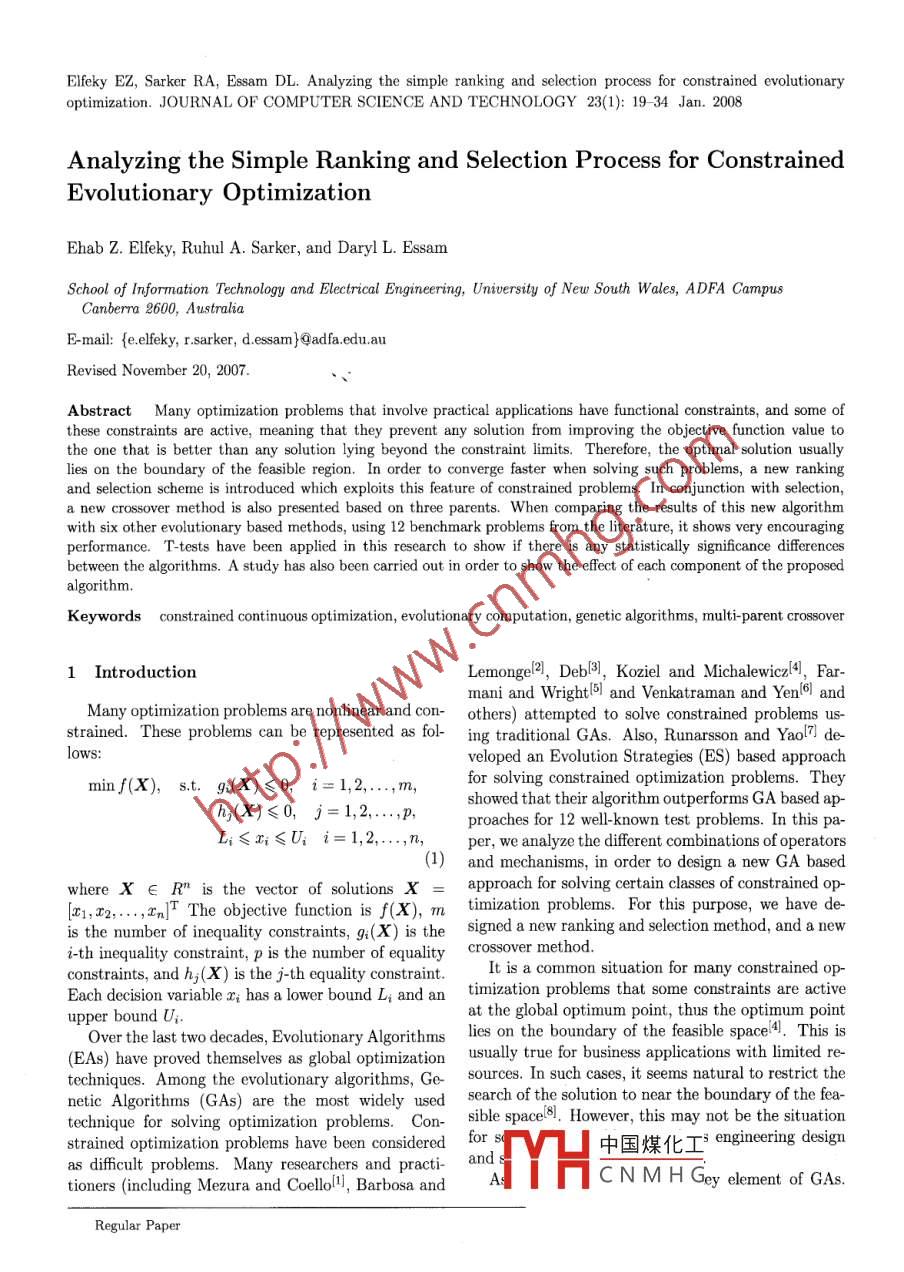 Elfeky EZ, Sarker RA, Essam DL. Analyzing the simple ranking and selection process for constrained evolutionaryoptimization. JOURNAL OF COMPUTER SCIENCE AND TECHNOLOGY 23(1): 19 34 Jan. 2008Analyzing the Simple Ranking and Selection Process for ConstrainedEvolutionary OptimizationEhab Z. Elleky, Ruhul A. Sarker, and Daryl L. EssamSchool of Information Technology and Elctrical Engineering, University of New South Wales, ADFA CampusCanberra 2600, AustraliaE-mail: {elfeky, r.sarker, d.essam }@adfa.edu.auRevised November 20, 2007.Abstract Many optimization problems that involve practical applications have functional constraints, and some ofthese constraints are active, meaning that they prevent any solution from improving the objective function value tothe one that is better than any solution lying beyond the constraint limits. Therefore, the optimal solution usuallylies on the boundary of the feasible region. In order to converge faster when solving such problems, a new rankingand selection scheme is introduced which exploits this feature of constrained problems. In conjunction with selection,a new crossover method is also presented based on three parents. When comparing the results of this new algorithmwith six other evolutionary based methods, using 12 benchmark problems from the literature, it shows very encouragingperformance. T-tests have been applied in this research to show if there is any statistically significance diferencesbetween the algorithms. A study has also been carried out in order to show the effect of each component of the proposedalgorithm.Keywords constrained continuous optimization, evolutionary computation, genetic algorithms, multi-parent crossover1 IntroductionLemongel2), Debl3), Koziel and Michalewicxl4, Far-mani and Wrightl5 and Venkatraman and Yenl6l andMany optimization problems are nonlinear and con-others) attempted to solve constrained problems us-strained. These problems can be represented as fol-ing traditional GAs. Also, Runarsson and Yaol7] delows:veloped an Evolution Strategies (ES) based approachfor solving constrained optimization problems. Theyminf(X),s.t. g;(X)≤0, i= 1,2...,m,showed that their algorithm outperforms GA based ap-h;(X)≤0,j= 1,2.....proaches for 12 well-known test problems. In this pa-Li≤x;≤U; i= 1,2...n,per, we analyze the different combinations of operators1)and mechanisms, in order to design a new GA basedwhere x∈R" is the vector of solutions x = approach for solving certain casses of constrained op-[x1,2..... The objective function is f(X), mtimization problems. For this purpose, we have de-is the mumber of inequality cnstraints, g(X) is the signed a new ranking and slection method, and a newi-th inequality constraint, p is the number of equalitycrossover method.constraints, and hj(X) is the j-th equality constraint.It is a common situation for many constrained op-Each deision variable has a lower bound L, and an timization problems that some constraints are activeat the global optimum point, thus the optimum pointupper bound U;.Over the last two decades, Evolutionary Algorithmslies on the boundary of the feasible spacel4l. This is(EAs) have proved themselves as global optimizationusually true for business applications with limited re-techniques. Among the evolutionary algorithms, Gsources. In such cases, it seems natural to restrict thenetic Algorithms (GAs) are the most widely usedsearch of the solution to near the boundary of the fea-technique for solving optimization problems. Con-sible space(8l. However, this may not be the situationstrained optimization problems have been consideredfor中國煤化工$ engineering designas dificult problems. Many researchers and practi- andAsYHCNMHGeyelementofGAs.tioners (including Mezura and Coellol1, Barbosa andRegular Paper20J. Comput. Sci & Technol, Jan. 2008, Vol.23, No.1Many studies have been carried out to show how this new offspring. There are three most commonly usedoperator afects the evolutionary process. The most ranking and selection methods. First, fitness propor-widely used crossover methods are k- point, uniform,. tional reproduction, in this scheme individuals are cho-intermediate, global discrete, order-based, and matrix- sen for selection in proportion to their fitness value.based[9]. Most of these crossovers are based on twoIn the second method, rank based selection, the popu-parents. However, Eiben et al.l10l introduced a multi- lation is sorted from best to worst; then the higherparent reproduction process to GAs. They have in- ranked individuals are given higher probabilities todicated that increasing the number of parents in the survivel9. The third method is tournament selection,crossover leads to more reliable offspring. As they re- where a random number of individuals are chosen fromported, performance increased up to a certain num- the population (with or without replacement) and theber of parents and then decreased. They concluded best individual from this group is chosen as a par-that the improvement was at the maximum level when ent for the next generation9. These processes are re-changing the number of parents from2 to3. So it was peated until the mating pool is flled. There are a va-not worthwhile going beyond 3 or 4 parentslo. Note riety of other selection methods, including stochasticthat Eiben et aliol have applied their genetic algo- methodsl7. In this paper, we introduce an algorithmrithm with a binary representation.which uses a tournament selection in some stages ofAs we are dealing with constrained problems, the the evolution process, and uses a new ranking methodfeasibility ratio (the ratio between the number of feasi- in other stages. This will be discussed later in moreble individuals and the total population size) plays an detail.important role in the search process and can thus beThe penalty function is the most widely usedconsidered as an indicator for diversity. Hence, a wider method to deal with constraints in constrained op-range of fea