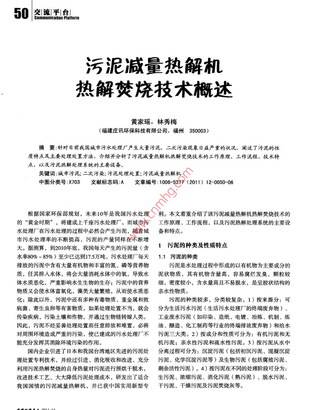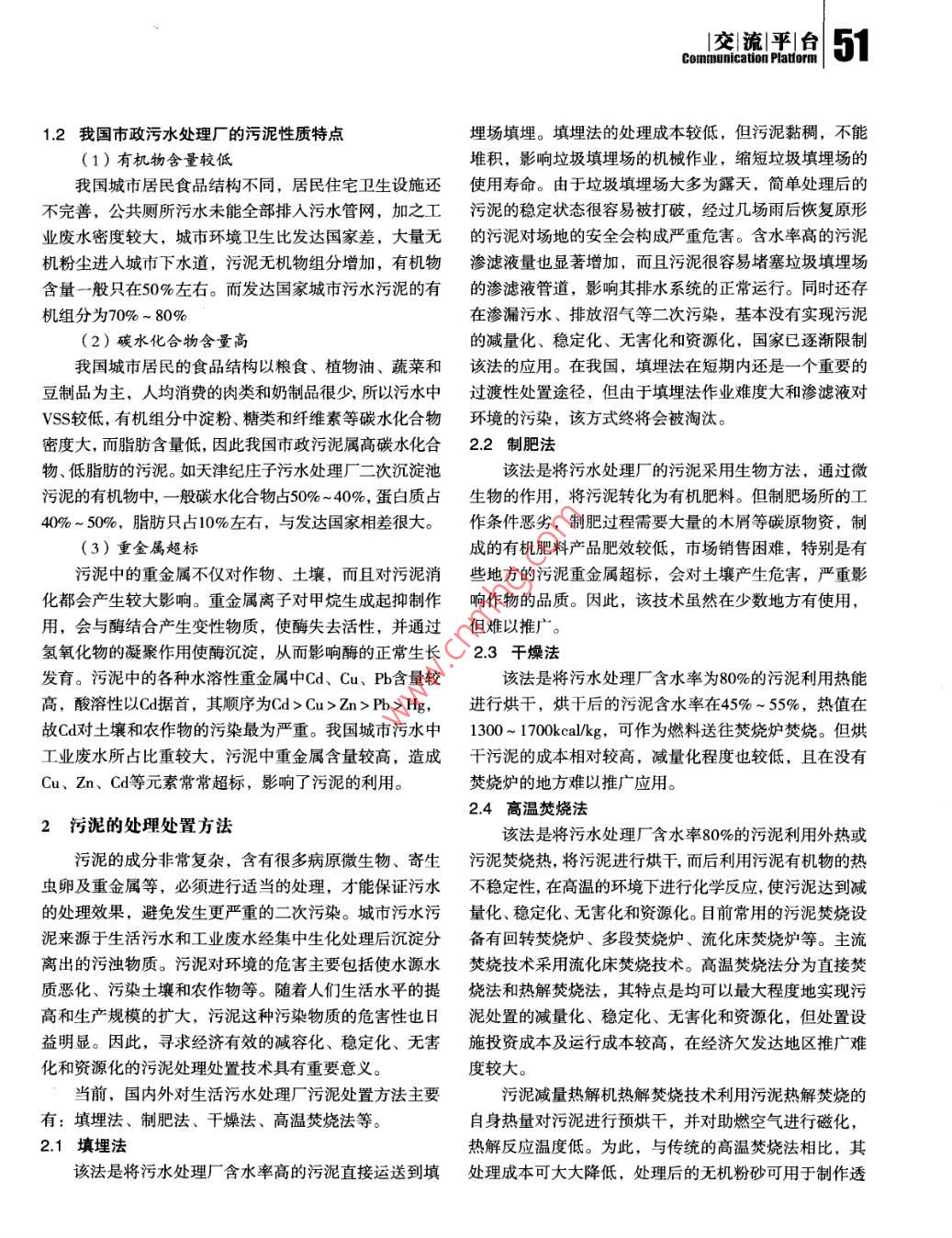 50交|流|平|臺(tái)|Communlcaton Platform污泥減量熱解機(jī)熱解焚燒技術(shù)概述黃家瑤,林秀梅(福建莊訊環(huán)??萍加邢薰?,福州350003)摘要:針對(duì)目前我國(guó)城市污水處理廠產(chǎn)生大量污泥, 二次污染現(xiàn)象日益嚴(yán)重的狀況,闡述了污泥的性質(zhì)特點(diǎn)及主要處理處置方法,介紹并分析了污泥減量熱解機(jī)熱解焚燒技術(shù)的工作原理、工作流程、技術(shù)特點(diǎn),以及污泥熱解處理系統(tǒng)的主要設(shè)備。關(guān)鍵詞:城市污泥;二次污染;污泥處理處置;污泥減量熱解機(jī)中圖分類號(hào):X703文獻(xiàn)標(biāo)志碼:A文章編號(hào):1006- -5377 (2011) 12- -0050-06根據(jù)國(guó)家環(huán)保部規(guī)劃,未來(lái)10年是我國(guó)污水處理利。本文著重介紹了該污泥減量熱解機(jī)熱解焚燒技術(shù)的的“黃金時(shí)期”,將建成上千座污水處理廠。而城市污工作原理、工作流程,以及污泥熱解處理系統(tǒng)的主要設(shè)水處理廠在污水處理的過程中必然會(huì)產(chǎn)生污泥,隨著城備和特點(diǎn)。市污水處理率的不斷提高,污泥的產(chǎn)量同樣在不斷增1污泥的種類及性質(zhì)特點(diǎn)大。據(jù)測(cè)算,到2010年底, 我國(guó)每天產(chǎn)生的污泥量(含水率80%~ 85%)至少已達(dá)到17.5萬(wàn)噸。污水處理廠每天1.1 污泥的種類排放的污泥中含有大量有機(jī)物和豐富的氮、磷等營(yíng)養(yǎng)物污泥是水處理過程中形成的以有機(jī)物為主要成分的質(zhì),任其排入水體,將會(huì)大量消耗水體中的氧,導(dǎo)致水泥狀物質(zhì), 其有機(jī)物含量高,容易腐爛發(fā)臭,顆粒較體水質(zhì)惡化,嚴(yán)重影響水生生物的生存;污泥中的營(yíng)養(yǎng)細(xì),密度較小,含水量高且不易脫水,是呈膠狀結(jié)構(gòu)的物質(zhì)又會(huì)使水體富氧化,藻類大量繁殖,從而使水質(zhì)惡親水性物質(zhì)?;?除此以外,污泥中還有多種有毒物質(zhì)、重金屬和致污泥的種類較多,分類較復(fù)雜。1)按來(lái)源分:可病菌、寄生蟲卵等有害物質(zhì),如果處理處置不當(dāng),就會(huì)分 為生活污水污泥(生活污水處理廠的終端廢棄物)、傳染疾病,污染土壤和作物,并通過生物鏈轉(zhuǎn)嫁人類。工業(yè)廢水污泥(如印染、造紙、電鍍、冶煉、機(jī)制、煉因此,污泥不經(jīng)妥善處理處置而任意排放和堆置,必將油、釀造、化工制藥等行業(yè)的終端排放廢棄物)和給水對(duì)周圍環(huán)境造成嚴(yán)重的污染,使已建成的污水處理廠“不污泥三大類。 2)按成分和性質(zhì)可分為:有機(jī)污泥和無(wú)能充分發(fā)揮其消除環(huán)境污染的作用。機(jī)污泥;親水性污泥和疏水性污泥。3)按污泥從水中國(guó)內(nèi)企業(yè)引進(jìn)了日本和我國(guó)臺(tái)灣地區(qū)先進(jìn)的污泥處分離過程可分為:沉淀污泥(包括初沉污泥、混凝沉淀理處置專利技術(shù),并經(jīng)過引進(jìn)、消化吸收和改進(jìn),充分污泥、 化學(xué)沉淀污泥等)及生物污泥(包括腐殖污泥、利用污泥熱解焚燒的自身熱量對(duì)污泥進(jìn)行預(yù)烘干脫水,剩余活性污泥)。4)按污泥在不同的處理階段可分為:改進(jìn)技術(shù)工藝,大大降低污泥處理成本,研發(fā)出了適合生污泥、 濃縮污泥、消化污泥(熟污泥)、脫水污泥、我國(guó)國(guó)情的污泥減量熱解機(jī),并已獲中國(guó)實(shí)用新型專干污泥、干燥污泥及污泥焚燒灰等。交|流|平|臺(tái)51Comnunication Pattorn1.2我國(guó)市政污水處理廠的污泥性質(zhì)特點(diǎn)埋場(chǎng)填埋。填埋法的處理成本較低,但污泥黏稠,不能(1)有機(jī)物含量較低堆積,影響垃圾填埋場(chǎng)的機(jī)械作業(yè),縮短垃圾填埋場(chǎng)的我國(guó)城市居民食品結(jié)構(gòu)不同,居民住宅衛(wèi)生設(shè)施還使用壽命。由于垃圾填埋場(chǎng)大多為露天,簡(jiǎn)單處理后的不完善,公共廁所污水未能全部排人污水管網(wǎng),加之工污泥的穩(wěn)定狀態(tài)很容易被打破,經(jīng)過幾場(chǎng)雨后恢復(fù)原形業(yè)廢水密度較大,城市環(huán)境衛(wèi)生比發(fā)達(dá)國(guó)家差,大量無(wú)的污泥對(duì)場(chǎng)地的安全會(huì)構(gòu)成嚴(yán)重危害。含水率高的污泥機(jī)粉塵進(jìn)人城市下水道,污泥無(wú)機(jī)物組分增加,有機(jī)物滲濾液量也顯著增加,而且污泥很容易堵塞垃圾填埋場(chǎng)含量一般只在50%左右。而發(fā)達(dá)國(guó)家城市污水污泥的有的滲濾液管道,影響其排水系統(tǒng)的正常運(yùn)行。同時(shí)還存機(jī)組分為70% ~ 80%在滲漏污水、排放沼氣等二次污染,基本沒有實(shí)現(xiàn)污泥(2)碳水化合物含量高的減量化、穩(wěn)定化、無(wú)害化和資源化,國(guó)家已逐漸限制我國(guó)城市居民的食品結(jié)構(gòu)以糧食、植物油、蔬菜和該法的應(yīng)用。在我國(guó),填埋法在短期內(nèi)還是-一個(gè)重要的豆制品為主,人均消費(fèi)的肉類和奶制品很少,所以污水中過渡性處置途徑,但由于填埋法作業(yè)難度大和滲濾液對(duì)VSS較低,有機(jī)組分中淀粉、糖類和纖維素等碳水化合物環(huán)境的污染,該方式終將會(huì)被淘汰。密度大,而脂肪含量低,因此我國(guó)市政污泥屬高碳水化合.2 制肥法物、低脂肪的污泥。如天津紀(jì)莊子污水處理廠二次沉淀池該法是將污水處理廠的污泥采用生物方法,通過微污泥的有機(jī)