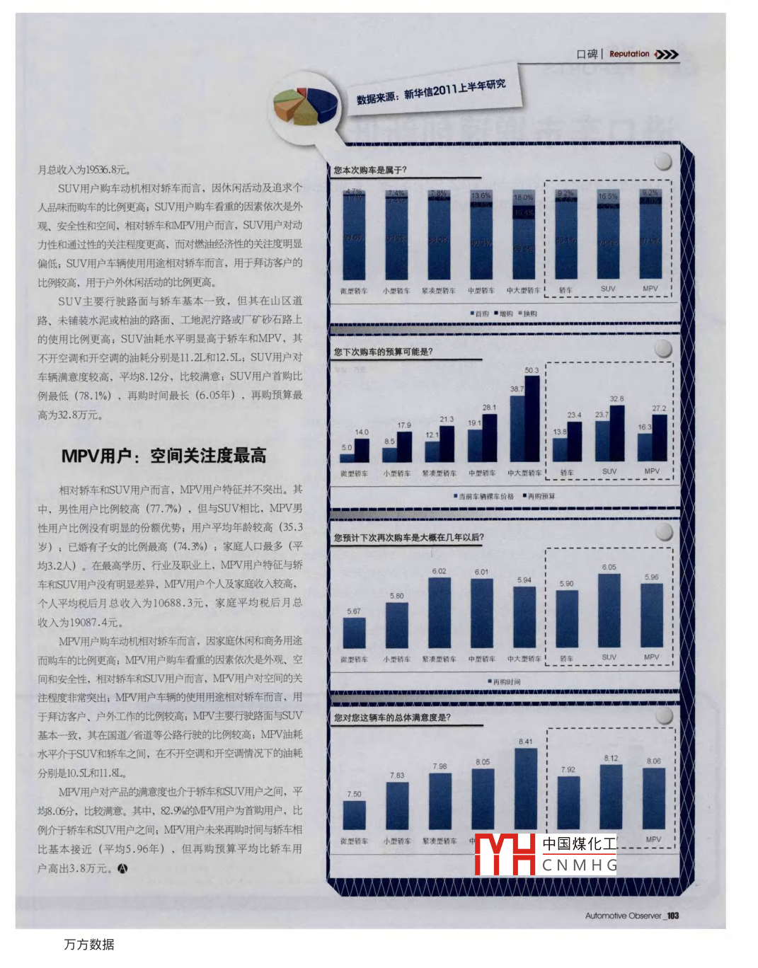 報(bào)告REPORTS誰在消費(fèi)中國車市?各汽車廠商為了擴(kuò)大或維持現(xiàn)有市場份額,除了需要大力提高產(chǎn)品質(zhì)量外,還需要應(yīng)對市場行情變化實(shí)施和改進(jìn)營銷策略,而要做出精準(zhǔn)營銷,離不開對消費(fèi)者的分析。本報(bào)告內(nèi)容由新華信和《汽車觀察》雜志聯(lián)合奉獻(xiàn)編輯=本刊記者張靜201年7月14日,新華信聯(lián)合搜狐汽車發(fā)布首期《中濟(jì)性的關(guān)注程度越低。國汽車消費(fèi)趨勢報(bào)告》,用以幫助車企更準(zhǔn)確地把握消費(fèi)轎車用戶車輛主要用于上下班代步、購物、外出就趨勢,從而做出更好的營銷決策。該報(bào)告分別從消費(fèi)者人餐、家人休閑活動(dòng)等,相對SUV和MV用戶而言,轎車用口學(xué)特征、社會學(xué)特征、汽車購買行為、汽車使用行為、戶車輛用于公商務(wù)用途的比例較低;轎車用戶車輛行駛路汽車再購行為進(jìn)行數(shù)據(jù)分析,以此形成對中國汽車消費(fèi)未面主要是市內(nèi)道路、高速公路、高架橋和國道/省道等公來趨勢的判斷。路,與SUV和MV相比,轎車行駛路面范圍相對狹窄;百里油耗明顯低于SUV和M,特別低于SUV,其不開空轎車用戶:女性車主比例最高調(diào)和開空調(diào)時(shí)的百公里油耗分別是8.5L和9.幾;轎車用戶對車輛的滿意度平均為7.92分,比較滿意,稍低于SUV和相對SUV和M用戶而言,轎車用戶女性比例最高M(jìn)用戶。對不同級別斷車而言,級別越高,車輛用于公(占43.1%);年齡最小(平均年齡344歲),未婚或已商務(wù)用途的比例越高,車輛路面行駛范圍越大,百公里油婚無子女的比例最高(占3.8%);家庭結(jié)構(gòu)更為緊湊耗越高,對車輛的滿意度越高。(平均3.人)。對不同級別轎車而言,級別越高,男性此外,86.1%的轎車用戶為首購用戶,這一比例明顯比例越高、年齡越長、已婚有子女的比例越高。高于SUV用戶;轎車用戶平均未來再購時(shí)間為5.9年,略轎車用戶與SUV和MV用戶在最高學(xué)歷、行業(yè)及職短于SUV和M們V的再購時(shí)間;轎車用戶未來再購預(yù)算為業(yè)上沒有明顯差異,超過的轎車用戶擁有大?;虮究?3.4萬元,明顯低于SUV和MP用戶,特別低于SUV用學(xué)歷,行業(yè)集中在零售/批發(fā)、房地產(chǎn)/建筑/裝潢等;職戶。對緊湊型及以下級別轎車用戶而言,級別越高,再購業(yè)以私營企業(yè)和個(gè)體戶為主;但在收入上,轎車用戶個(gè)人時(shí)間越長;對中型轎車及以上轎車用戶而言,級別越高及家庭平均收入低于SUV和MPV用戶,其個(gè)人稅后月均再購時(shí)間越短,再購預(yù)算越高。收入為982.8元,家庭月均稅后收入為1400.3元。對不同級別轎車而言,級別越高,車主最高學(xué)歷越高,從事房地SUV用戶:再購預(yù)算最高產(chǎn)/建筑/裝潢及金融/很銀行/保驗(yàn)/證券等高收入行業(yè)工作的比例越高,個(gè)人及家庭收入越高。相對轎車和MPV用戶而言,SUV用戶特征非常突轎車用戶因個(gè)人及家庭日常使用而購車的比例最高出。男性用戶比例較高(74.1%0),略低于MP用戶;平(如上下班、接送孩子等);轎車用戶購車時(shí)看重的因素均年齡最高(35.6歲):已婚有子女比例較高(6);依次是外觀、安全性和舒適性。對不同級別轎車而言,級家庭人口稍高于轎車用戶(3.11人),明顯低于MPV用別越高,因商務(wù)需求、體驗(yàn)駕駛樂趣、提高個(gè)人品味而購戶。在最髙學(xué)歷、行業(yè)及職業(yè)上,SUV用戶特征與轎車和車的比例越高;用戶對外觀、安全性、舒適性、動(dòng)力性、質(zhì)量、品牌、內(nèi)飾等關(guān)注程度越髙;對購車價(jià)格、燃油經(jīng)H中國煤化工用戶個(gè)人及家庭收入CNMHG2.2元,家庭平均稅后口碑 I Reputation∞》數(shù)據(jù)來源:新華信211上半年研究月總收入為19536.8元您本次購車是屬于?SUV用戶購車動(dòng)機(jī)相對轎車而言,因體閑活動(dòng)及追求個(gè)人品味而購車的比例更高;SUV用戶購車看重的因素依次是外觀、安全性和空間,相對轎車和M八用戶而言,SUV用戶對動(dòng)力性和通過性的關(guān)注程度更高,而對燃油經(jīng)濟(jì)性的關(guān)注度明顯偏低;SUV用戶車輛使用用途相對轎車而言,用于拜訪客戶的比例較高,用于戶外休閑活動(dòng)的比例更高衡型轎車小型車緊湊型車中型轎車中大型新車1轎MPY ISUV主要行駛路面與轎車基本一致,但其在山區(qū)道路、未鋪裝水泥或柏油的路面、工地泥濘路或廠礦砂石路上的使用比例更高;SUV油耗水平明顯高于轎車和MPV,其不開空調(diào)和開空調(diào)的油耗分別是11.2和12.5;SUV用戶對您下次購車的預(yù)算可能是?車輛滿意度較高,平均8.12分,比較滿意;SUV用戶首購比例最低(78.1%),再購時(shí)間最長(6.05年),再購預(yù)算最高為32.8萬元MPV用戶:空間關(guān)注度最高il里轎車小型轎車緊凌型車中型轎車中大型轎車!轎相對轎車和SUV用戶而言,MP用戶特征并不突出。其當(dāng)前車輛裸車價(jià)格·再購預(yù)算中,男性用戶比例較高(77%),但與SUV相比,MPV男性用戶比例沒有明顯的份額優(yōu)勢;用戶平均年齡較高(35.3您預(yù)計(jì)下次再次購車是大概在幾年以后?歲);已婚有子女的比例最高(4.3);家庭人口最多(平均3.2人)。在最高學(xué)歷、行業(yè)及職業(yè)上,MPV用戶特征與轎車和SUV用戶沒有明顯差異,MPV用戶個(gè)人及家庭收入較高,個(gè)人平均稅后月總收入為10688.3元,家庭平均稅后月總收入為19087.4元