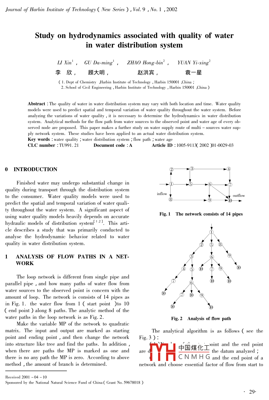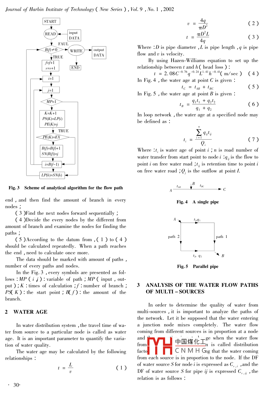 Journal of Harbin Institute of Technology( New Series), Vol.9 ,No. 1 ,2002Study on hydrodynamics associated with quality of waterin water distribution systemLI Xin',GU Da-ming',ZHAO Hong-bin2,YUAN Yi-xing2李欣,顧大明,趙洪賓,袁一星( 1. Dept of Chemistry ,Harbin Institute of Technology , Harbin 150001 ,China ;2. School of Civil Engineering , Harbin Institute of Technology , Harbin 150001 ,China )Abstract : The quality of water in water distribution system may vary with both location and time. W ater qualitymodels were used to predict spatial and temporal variation of water quality throughout the water system. Beforeanalyzing the variations of water quality ,it is necessary to determine the hydrodynamics in water distributionsystem. Analytical methods for the flow path from water sources to the observed point and water age of every ob-served node are proposed. This paper makes a further study on water supply route of multi - sources water sup-ply network system. These studies have been applied to an actual water distribution system.Key words : water quality ; water distribution system ; flow path ; water ageCLC number :TU991.21Document code :AArticle ID : 1005-9113( 2002 )01-0029-030 INTRODUCTION→④Finished water may undergo substantial change in-⑥?⑦quality during transport through the distribution systeminflowto the consumer. Water quality models were used to⑧品outlowpredict the spatial and temporal variation of water quali-ty throughout the water system. A significant aspect ofFig.1 The network consists of 14 pipesusing water quality models heavily depends on accuratehydraulic models of distribution system2I. This arti-cle describes a study that was primarily conducted toanalyse the hydrodynamic behavior related to waterquality in water distribution system.1 ANALYSIS OF FLOW PATHS IN A NET-⑨WORK①⑤∞⑦?The loop network is different from single pipe and⑦0010parallel pipe , and how many paths of water flow fromwater sources to the observed point is concern with theamount of loop. The network is consists of 14 pipes asin Fig. 1. the water flow from 1 ( start point )to 101( end point ) along 8 paths. The analytic method of thewater paths in the loop network is as Fig. 2.Fig. 2 Analysis of flow pathMake the variable MP of the network to quadraticmatrix. The input and output are marked as startingThe analytical algorithm is as follows ( see thepoint and ending point , and then change the networkFig.3 ):into structure like tree and find the paths. In addition中國煤化工oint and the end pointwhen there are paths the MP is marked as one anarethe datum analyzed ;there is no any path the MP is zero. According to abovefYHCNMHGandtheendpointofamethod , the amount of branch is determined.network and choose essential factor of flow from start toReceived 2001 -04 - 10Sponsored by the National Natural Science Fund of China( Grant No. 59678018 )Journal of Harbin Institute of Technology( New Series), Vol.9 ,No. 1 ,2002| STARTv =-tq(2) .πD'(READ)-| inputπD2 L| DATA(3 )4q1 FAULWhere :D is pipe diameter ,L is pipe length ,q is pipeBI)≠0 二> +( WRITE)- + outputDATAflow and 0 is velocity .TRUEBy using Hazen-Williams equation to set up thef=f+1ENDrelationship between t and h( head loss ) :t = 2.08C-0.76q0.24L-+4h-0.4( m/sec) (4 )=1In Fig.4 ,the water age at point C is given :tc=tsB+tgc(5)In Fig.5 , the water age at point B is given :MP= i91t + 9212tg =( 6)91+92K=K+1In loop network , the water age at a specified node mayPS(K)=LP(i)be defined as :PE(K)=j↓TRUESqPE(K)=EX(7)2;| B()=B()+1Where :t; is water age of point i ;n is road number of| SN(B()=jwater transfer from start point to nodei :qy is the flow to .t i=B(f-1) tpoint i on free water road it; is retention time to point ion free water road ;Q; is the outflow at point I.| LP(h)=SN(h) |一↓B IucFig. 3 Scheme of analytical algorithm for the flow pathA十Cend , and then find the amount of branch in everyFig.4 A single pipenodes ;( 3 )Find the next nodes forward sequentially ;( 4 )Decide the every nodes by the different fromA“amount of branch and examine the nodes for finding thepaths ;path 2path 1( 5 )According to the datum from ,( 1 ) to(4 )should be calculated repeatedly. When a path reachesthe end , need to calculate once more.口92\BThe data should be marked with amount of paths ,number of every paths and nodes.Fig.5 Parallel pipeIn the Fig. 3 , every symbols are presented as fol-lows :MP(i i): variable of path ; MP( input , out-put ) ;K : times of calculation if : number of branch ;3 ANALYSIS OF THE WATER FLOW PATHSPS( K): the start point ; B(f): the amount of theOF MULTI - SOURCESbranch.In order to determine the quality of water from2 WATER AGEmulti-sources , it is important to analyze the paths ofthe network. Let it be supposed that the water enteringIn water distribution system , the travel time of wa-a junction node mixes completely. The water flowter from source to a particular node is called as watercoming from different sources is in proportion at a nodeage. It is an important parameter to quantify the varia-and中國煤化工& when the water flowtion of water quality.fromis called distributionThe water age may be calculated by the followingfacto;YHC N M H Gng that the water comingrelationships :from each source is in proportion to the node. If the DFL(1)of water source S for node i is expressed as C,; ,and theDF of water source S for pipe ij is expressed C,,, therelation is as follows :30-Journal of Harbin Insiute of Technology( New Series ),Vol.9 ,No. 1 ,2002C = Q,;/Q;C,j = 9./q,;4 APPLICATION IN FIELD TESTThe relation between the distribution factors is asfollow :The service area had 40. 000 residential , averageC,=C,water use was 21.000 mi /day. The water came from aThe DF of any sourceS is the same and it is to anywater distribution tank which has capacity of 8. 000DF of nodes and pipes.m' /day. The distribution system is composed of pipeThe sum of DF of each source to whichever nodediameter from 0.075 
