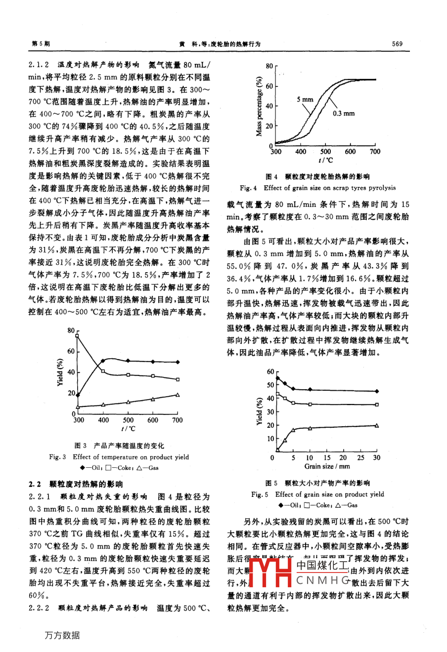Vol 31 No 5華東理工大學(xué)學(xué)報(自然科學(xué)版)005-10Journal of East China University of Science and Technology (Natural Science Edition)567文章編號:1006-3080(2005)05-0567-04廢輪胎的熱解行為黃科,高慶華,唐黎華,倪燕慧,朱子彬(華東理工大學(xué)化學(xué)工藝研究所,上海200237)摘要:考察溫度、顆粒度等熱解條件對廢輪胎熱解行為的影響。采用程序升溫?zé)崽炱絻x考察溫度、顆粒度對廢輪胎熱失重的影響;采用管式反應(yīng)器考察溫度、顆粒度對熱解產(chǎn)品(包括熱解氣、熱解油和粗炭黑)收率的影響。實驗表明:溫度是影響廢輪胎熱解產(chǎn)品收率的關(guān)鍵因素,400~550℃C時熱解失重速率最快,超過550℃接近完全熱解;若廢輪胎熱解以得到熱解油為目的,溫度控制在400~500℃時,熱解油產(chǎn)率最高。顆粒大小也是影響產(chǎn)品收率的重要因素,在400~550°,隨著顆粒度的增加廢輪胎熱解更加完全,粒徑為0.3mm和5.0mm的廢輪胎顆粒熱解活化能分別為73.1kJ/mol和55.8kJ/mol;顆粒度對產(chǎn)品收率的影響也很大,而當(dāng)顆粒度超過5mm時對熱解產(chǎn)品的影響較小。關(guān)鍵詞:廢輪胎;熱解;顆粒度;熱解動力學(xué)中圖分類號:TQ325文獻(xiàn)標(biāo)識碼:APerformance of Scrap Tyres PyrolysisHUANG Ke, GAO Qing-hua, TANG Li-hua, NI Yan-hui, ZHU Zi-bin(Research Institute of Chemical Technology, East China University of Scienceand Technology, shanghai 200237, China)Abstract: Effects of the pyrolysis condition such as temperature and grain size on the performance ofscrap tyres were studied. Thermal gravimetric analyzer was used to analyze the effect of temperature andgrain size on thermogravimetric of scrap tyres. Scrap tyres particles were pyrolysised in a tubular reactorto study the effect of temperature and grain size on the product yields. The results indicate that the effectof temperature on scrap tyres pyrolysis is critical. Between 400oC and 500C, weight loss rate was rapid,and scrap tyres pyrolysised completely. The pyrolytic temperature must be limited between 400C and 500.C, if the aim is to obtain tire-derived oil. grain size is another important factor to affect pyrolysis of scraptyres. With the larger grain size, pyrolysis is more completely at 400-500C. The activation energy ofpyrolytic kinetics of scrap tyres with 0. 3 mm and 5 mm grain size are 73. 1 kJ/mol and 55.8 kJ/molrespectively. However, the grain size has little effect on the pyrolysis when the grain size exceeds 5 mmKey words: scrap tyres; prolysis grain size pyrolytic kinetics隨著汽車工業(yè)的發(fā)展,廢棄的輪胎日益增多據(jù)本約50萬噸/年,2000年我國廢輪胎量為100萬估計,歐洲和北美廢棄的輪胎各約250萬噸/年,日噸2,廢輪胎的處理成為重待解決的問題。目前廢輪胎的處中國煤化工然料和熱解等方E-mail:zhuzib@ecust.edu.cn式。傳CNMHG因其對環(huán)境造成收稿日期:200409-19危害巳些國冢被禁止以。廢輪胎熱解有很多作者簡介黃科(19)男河北人,博土生研究方向為固體度棄優(yōu)點,且可以得到熱解氣、熱解油和炭黑,熱解氣凈物資源化回收利用華東理工大學(xué)學(xué)報(自然科學(xué)版)第31卷化后作為高熱值的燃?xì)?熱解油可以作為燃料油或經(jīng)冷凝后收集,熱解氣體經(jīng)分析后放空。實驗后,將經(jīng)過深加工作為化學(xué)品重新利用,熱解炭黑可以作殘留在磁舟中的粗炭黑和熱解油分別稱重,熱解氣為填充炭黑從20世紀(jì)80年代初期開始,發(fā)達(dá)國體通過減量法計算家對廢輪胎熱解進(jìn)行了大量研究,并建立了工業(yè)化廢輪胎熱解產(chǎn)物產(chǎn)率及成分受溫度、時間、顆粒裝置。國內(nèi)很多學(xué)者-8也對廢輪胎熱解過程、熱解度、載氣流量等多種因素的影響。本實驗在常壓氮氣產(chǎn)品的組成以及中試裝置開展了一系列的研究。廢氣氛下熱解廢輪胎,考察了溫度在300~700°范圍輪胎熱解實驗室研究多采用細(xì)顆粒,而廢輪胎熱解內(nèi),顆粒度分別為0.3~30mm條件下對熱解的影的工業(yè)化必須采用大塊或整條廢輪胎,有關(guān)顆粒度響對熱解過程和產(chǎn)品收率的影響未見詳細(xì)報道本實驗在考察溫度對廢輪胎熱解影響的基礎(chǔ)上,重點研究顆粒度對廢輪胎熱解過程和產(chǎn)品收率的影響。召21實驗研究1.1實驗原料實驗用的廢輪胎為子午胎顆粒(由上海虹磊精圖1熱解工藝流程圖細(xì)膠粉成套設(shè)備有限公司提供)。原料元素分析、工Fig.1 Schematic illustration of experimental apparatus業(yè)分析和成分分析見表1。Nitrogen gas cylinder i 2--Flowmeteri 3--Temperature transter4-Furnace:5-Reactor6-Sample boatCondenser1廢輪胎元素分析、工業(yè)分析和成分分析Table 1 Ultimate, proximate and composition analysisof feedstock2結(jié)果與討論UltimatContentComposition(%)(%)2.1溫度對熱解的影響2.1.1溫度對熱失重的影響粒徑為5mm廢輪HCarbon black31.2胎顆粒在氮氣中以20"/min的升溫速率進(jìn)行熱解,圖2是廢輪胎熱失重曲線圖。由圖可知,熱失重微分曲線(DTG)呈現(xiàn)一個峰,在400~550℃之間呈現(xiàn)峰值,相對應(yīng)的失重積分曲線(TG)在300℃左右開始失重,超過400℃C失重量迅速增加,在Accelerator400~550℃范圍內(nèi),失重率由15%達(dá)到65%,超過550℃C呈現(xiàn)失重平臺,廢輪胎接近完全熱解。1.2熱量實驗熱重實驗采用程序升溫?zé)崽炱絻x(上海分析儀器廠WRT-2P型)進(jìn)行熱解失重的研究,試樣用量e0.4約8mg,以氮氣為載氣,流量為80mL/min,升溫速率為20℃/min。實驗原料采用顆粒粒徑分別為0.3mm和5mm的廢輪胎顆粒1.3實驗裝量與實驗方法實驗