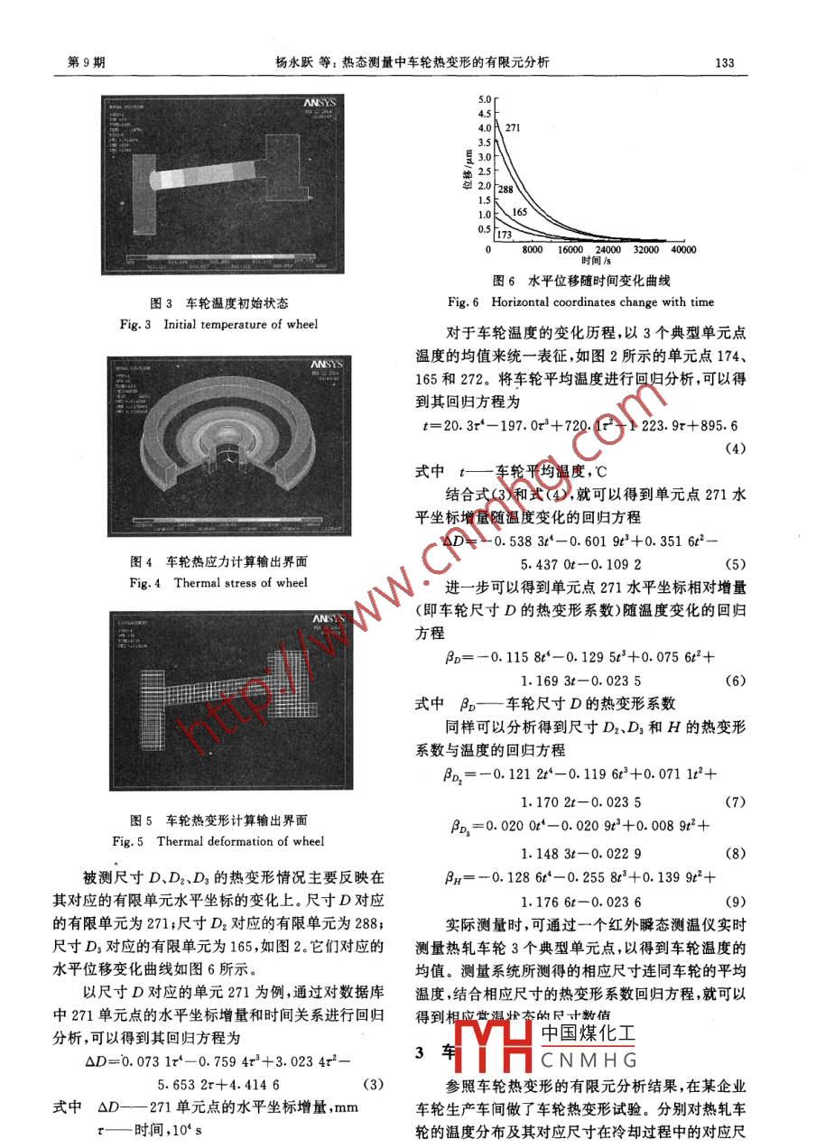 2005年9月農(nóng)業(yè)機(jī)械學(xué)報(bào)第36卷第9期熱態(tài)測量中車輪熱變形的有限元分析楊永躍鄧善熙梁發(fā)云【摘要】針對熱軋車輪在線熱態(tài)檢測中關(guān)鍵的熱變形問題,建立了熱軋車輪的導(dǎo)熱微分方程并對其進(jìn)行了有限元格式求解。使用有限元方法分析了熱軋車輪的熱應(yīng)力和熱變形歷程,得到了待求熱軋車輪尺寸相應(yīng)的熱變形系數(shù)。試驗(yàn)結(jié)果與理論分析基本吻合。關(guān)鍵詞:車輪熱變形測量有限元法中圖分類號:TB92文獻(xiàn)標(biāo)識碼:AFinite Element Analysis of Train Wheel Deformationduring Thermal MeasurementYang Yongyue Deng Shanxi Liang Fayun(Hefei University of TechnologyAbstractThe thermal deformation is a key problem in measuring a roll steel. a heat transfer quationwas set up and solved by the Fe method. the courses of thermal stress and thermal deformationwere analyzed by the Fe method and the coefficients of thermal deformation for the wheeldimensions were obtained. The results from the experiment are accordant with those fromtheoretical analysisKey words Train wheel, Thermal deformation, Measurement, Finite element method引言在進(jìn)行車輪半成品的熱態(tài)測量時(shí),熱軋車輪的熱變形誤差是影響測量精度的關(guān)鍵。熱變形誤差約熱軋車輪在線檢測,一直是車輪生產(chǎn)企業(yè)待解占常用儀器總誤差的三分之一,經(jīng)過對其他誤差源決的問題,要求通過實(shí)時(shí)的熱態(tài)測量對應(yīng)得到常溫修正后,儀器總誤差將明顯減小,但熱變形誤差所占態(tài)的構(gòu)件尺寸。由于車輪熱軋生產(chǎn)的連續(xù)性,熱軋車的比例卻上升到總誤差的一半以上因此,采用有限輪溫度高達(dá)千攝氏度,測量的實(shí)時(shí)性要求高,加之噪元法對熱態(tài)測量中車輪熱變形態(tài)和歷程進(jìn)行研究。聲、粉塵,現(xiàn)場條件非常惡劣,給測量帶來困難目前,工廠用人工對熱軋車輪進(jìn)行在線檢測勞1車輪熱變形模型動(dòng)強(qiáng)度大,測量精度不高,反饋給操作人員的信息不導(dǎo)熱物體內(nèi)部溫度分布規(guī)律的導(dǎo)熱微分方程及時(shí),產(chǎn)品的廢品率高式,是以能量守恒定律和傅里葉定律為基本依據(jù)。作者應(yīng)用主動(dòng)立體視覺測量技術(shù),在一幀圖像旦解出溫度分布,就可以用傅里葉定律求得物體內(nèi)上獲得過去要用幾個(gè)乃至幾十個(gè)傳感器同時(shí)檢測才部或表面上任何一點(diǎn)的熱傳導(dǎo)速率,即熱流密度。對能測得的多個(gè)參數(shù),實(shí)現(xiàn)熱軋車輪輪廓的高效、可于溫度場隨時(shí)間變化的非穩(wěn)態(tài)導(dǎo)熱問題,通過求得靠在線檢測。物體內(nèi)部不同時(shí)刻的溫度分布,可以確定部件的熱收稿日期:中國煤化工安徽省“十五”科技攻關(guān)重點(diǎn)項(xiàng)目(項(xiàng)目編號:01022010)CNMHG楊永躍合肥工業(yè)大學(xué)儀器儀表學(xué)院副教授,230009合肥市鄧善熙合肥工業(yè)大學(xué)儀器儀表學(xué)院教授博土生導(dǎo)師梁發(fā)云合肥工業(yè)大學(xué)儀器儀表學(xué)院博土生132農(nóng)業(yè)機(jī)械學(xué)報(bào)2005年應(yīng)力和熱變形。式(1)和式(2)構(gòu)成了熱傳導(dǎo)車輪溫度場的定車輪屬于回轉(zhuǎn)體類零件,其邊界溫度分布完全解。用數(shù)學(xué)方法求解偏微分方程的定解,只有在物體對稱于中心軸,回轉(zhuǎn)體內(nèi)的溫度分布只是圓柱坐標(biāo)形狀和邊界條件都非常簡單的情況下才有可能求出中r和z的函數(shù),而與圓周角g無關(guān),采用柱坐標(biāo)較解析解對于形狀復(fù)雜的工程構(gòu)件,其溫度分布用純?yōu)榉奖?,見圖1。數(shù)學(xué)的方法目前還不能求解,工程中也多是采用近似的方法或數(shù)值的方法計(jì)算。通過構(gòu)造滿足第1類邊界條件近似的溫度場函數(shù),保證第2類、第3類邊界條件的余量加權(quán)積分和為零,利用伽遼金法選擇權(quán)函數(shù),同時(shí)考慮時(shí)間域變(,p, z)量函數(shù),就可以得到熱軋車輪溫度場導(dǎo)熱微分方程的一般有限元格式,相關(guān)證明見文獻(xiàn)[3,4]。2 ANSYS分析結(jié)果ANSYS有限元分析軟件可處理熱傳遞的3種基本類型:傳導(dǎo)、對流和輻射,可以進(jìn)行穩(wěn)態(tài)和瞬態(tài)圖1微元體導(dǎo)熱分析線性和非線性分析。Fig. 1 Analysis of thermal conduction of element利用 ANSYS軟件對熱軋車輪從高溫狀態(tài)到常根據(jù)能量守恒定律,軸對稱構(gòu)件溫度場的導(dǎo)熱溫狀態(tài)的瞬態(tài)冷卻過程進(jìn)行了分析和計(jì)算。為便于微分方程為有限元單元網(wǎng)格的劃分,對熱軋車輪的幾何形狀進(jìn)aT_13(,3T⊥3|37(1)行了一些簡化,圖2所示為簡化后的車輪截面形狀及其有限元單元網(wǎng)格的劃分和定義情況。輸入車輪式中A導(dǎo)熱系數(shù),W/(m·K)材料的熱物理參數(shù)導(dǎo)熱系數(shù)674W/(m·K),T—溫度,KP—密度,kg/m3密度7800kg/m3,比熱容482J/(kg·K),彈性模c—比熱容,J/(kg·K)6—時(shí)間,s量217GPa,線膨脹系數(shù)1.5MK-,泊松比0.32對于特定的導(dǎo)熱過程,除了用上述導(dǎo)熱微分方程來描述外,還需要有表達(dá)該過程特點(diǎn)的補(bǔ)充說明條件:幾何條件、物理?xiàng)l件、時(shí)間條件和邊界條件等。幾何條件說明參與導(dǎo)熱過程的物體的幾何形狀和大小;物理?xiàng)l件說明參與導(dǎo)熱過程的物體的物理特征;時(shí)間條件給出過程開始時(shí)刻
