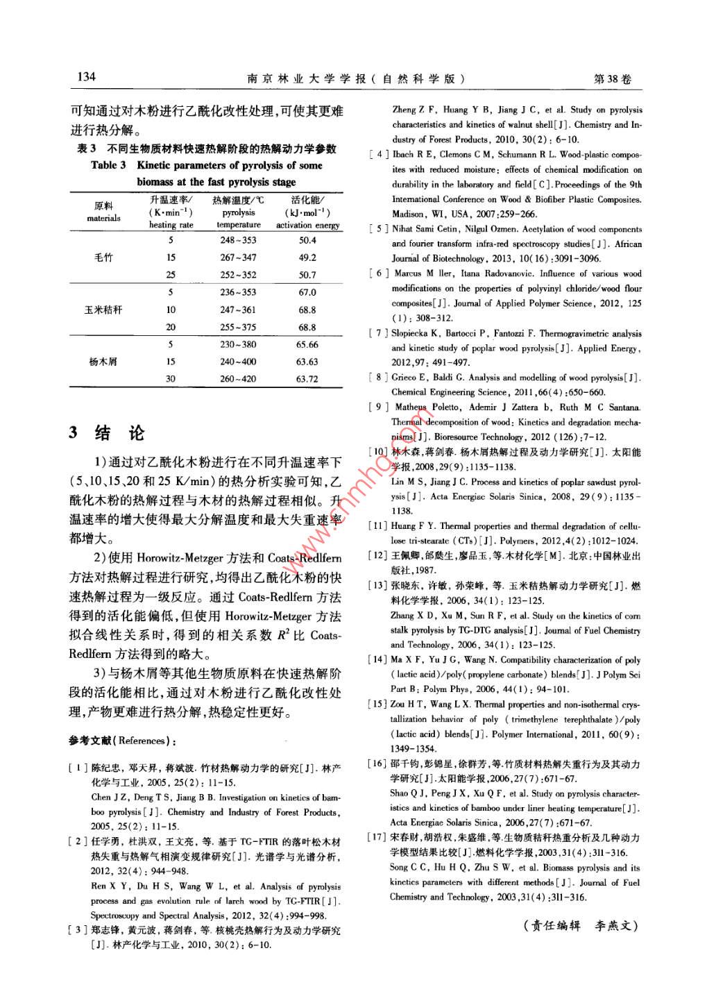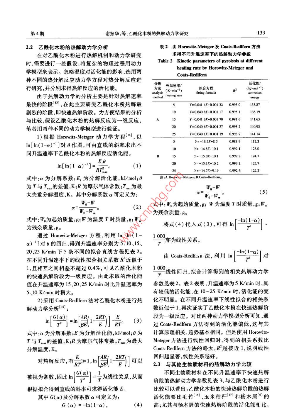 第38卷第4期南京林業(yè)大學學報(自然科學版)Vol.38, No.42014年7月Journal of Nanjing Forestry University ( Natural Sciences Edition )Jul., 2014doi:10.3969/jissn. 100-20060 2014.04.025乙酰化木粉的熱解動力學研究謝振華',張明明',金立維1'2*(1.中國林業(yè)科學研究院林產(chǎn)化學工業(yè)研究所,生物質化學利用國家工程實驗室,國家林業(yè)局林產(chǎn)化學工程重點開放性實驗室,江蘇省生物質能源與材料重點實驗室,江蘇南京210042;2.中國林業(yè)科學研究院林業(yè)新技術研究所,北京00091)摘要:利用熱重分析儀在開溫速率分別為5、10.15、20和25 K/min的條件下對乙?;痉圻M行熱解研究,利用.Horowitz-Melzger 和Coats-Redlfern兩種不同的動力學模型對乙?;痉圻M行熱解動力學分析。結果表明:乙?;痉鄣臒峤膺^程主要分為預熱解、快速熱解和慢速熱解3個階段,其中快速熱解階段失重率可達70%。對實驗數(shù)據(jù)進行回歸擬合,結果顯示快速熱解過程是一級反應。由兩種模型計算所得的活化能數(shù)值不同,但是總體變化趨勢基本相同。與其他一些生 物質材料的熱解參數(shù)對比可知乙?;痉鄹y被熱分解。關鍵詞:乙?;痉?熱解動力學;活化能;生物質材料中圖分類號:TQ352文獻標志碼:A文章編號:1000-2006(2014)04-0131-04Study on pyrolysis kinetics of acetylated wood flourXIE Zhenhua' , ZHANG Mingming' , JIN Liwei-2*( 1.Institute of Chemical Industry of Forestry Produets, CAF; National Engineeing Lab. for Biomas Chemical Utilization;Key and Open Lab. on Forest Chemical Engineering, SFA; Jiangsu Provincal Key Lab. of Biomass Energy and Material,Nanjing 210042, China; 2.Institute of Forest New Technology, CAF, Beijing 100091 ,China)Abstract: The pyolysis characteristics of acetylated wood flour (AWF) were studied at diferent heating rates(5, 10,15, 20 and 25 K/min) by themnogravimetric analysis, and the pyralysis kinetics was studied by Horowitz-Metzger andCats-Redlferm.The result showed that the pyrolysis process of AWF included pre-pyrolysis, fast pyrolysis and slow pyrol-ysis. The percentage of loss weight of AWF at fast pyrolysis stage reached 70%. The experiment data regressed by 1twodifferent models illuminated the fast pyrolysis process was a first-order reaction. Activation energy values calculated byeach model were diferent, but the overall trend was almost the same. It was showed that AWF decomposed less thansome other biomass materials by contrasting their pyrolysis parameters.Key words: acetylated wood flour( AWF) ; pyrolsis kinetics; activation energy; biomass materials熱解動力學特性直接關系到生物質熱化學利.用壽命和擴大使用范圍(4)。.用。通過生物質熱解動力學分析可深人地了解反對木粉進行乙酰化改性處理引起了眾多學者應過程或機理,還可預測反應速率以及反應的難易的關注[5-61。對乙?;痉圻M行熱解及分析其熱程度(1-1。木粉主要由纖維素、半纖維素和木質素分解機理,對木粉推廣使用具有十分重要的作用。組成,由于含有大量的羥基使得其極性很強。大量當 前有關木材的熱解動力學研究較多17-91 ,但是關的木粉用于制備木塑復合材料,而木塑復合材料的于乙?;痉鄣臒峤庋芯繄蟮垒^少。另一成分一般都是弱極性或者非極性的塑料,使得筆者利用熱重分析儀在高純氮氣的氛圍下研木粉與塑料之間的極性相差較大。通過乙酰化改究了乙酰化木粉在不同升溫速率下的熱解動力學性處理可以使木粉中大量的羥基被乙?;〈袨?,用兩種不同的動力學模型對其熱解動力學進從而降低其極性和親水性,延長木塑復合材料的使行了研究。收稿日期:2013-06-19修回日期:2013-12-07基金項目:國家林業(yè)公益性行業(yè)科研重大專項項目(201104004)第-作者:謝振華,碩士生。*通信作者:金立維,副研究員,博士。E-mail: liei-jin@ 163.com。引文格式:謝振華,張明明,金立維.乙?;痉鄣臒峤鈩恿W研究[J].南京林業(yè)大學學報:自然科學版,2014,38(4):131-134.132南京林業(yè)大學學報(自然科學版)第38卷5、10、15、20、25 K/min,升溫范圍25~800 C,樣品1材料與方法量為5~ 10 mg。1.1原料及設備主要原料:楊木木粉,粒徑0.13~0.34 mm,長2結果與分析徑比3.01~ 10. 94,江蘇嘉景復合材料有限公司提2.1乙?;痉鄣臒峤夥治龉?乙酸酐,分析純,購于上海凌峰化學試劑有限公乙酰化木粉在不同升溫速率下的TG/DTG曲司;高氯酸,分析純,購于上海金鹿化工有限公司; .線見圖1。由圖1看出,乙酰化木粉的熱分析曲線冰醋酸,分析純,購于南京化學試劑有限公司。與木材的熱分析曲線[10]相似,整個熱解過程可大主要儀器與設備:同步熱分析儀,STA 409型,致分為3個階段:第1階段為預熱解階段,溫度范德國耐馳公司;電熱恒溫鼓風干燥箱, PHG-圍100~ 280 C,主要是乙?;痉壑幸恍┬》肿?123A,.上海精宏實驗設備有限公司。.物質和少量半纖維素的熱解1"1],該階段質量的變1.2 乙?;痉鄣暮铣苫芪⑷?失重率約為3%;第2階段為快速熱解階將楊木木粉在105 C烘箱中烘12 h,使含水率段,在280~400C溫度區(qū)域,DTG曲線出現(xiàn)最大小于1%。稱取10g木粉,加入四口燒瓶中,并同峰,試樣的質量發(fā)生大幅度變化,失重率達70%。時加人80 g冰醋酸,保證木粉充分浸潤,然后升溫在該階段試樣發(fā)生劇烈的分解。隨著溫度的不斷至40 C攪拌活化2 h。之后將高氯酸1.25g與乙升高,醋酸纖維素分子中的苷鍵發(fā)生異裂或均裂反酸酐40 g配成溶液在50 C下滴加到四口燒瓶中,應,生成炭、不可冷凝氣體和液態(tài)冷凝物。乙?;?.5h內(nèi)滴完。反應2 h,得到粗產(chǎn)品,加入- -定量木