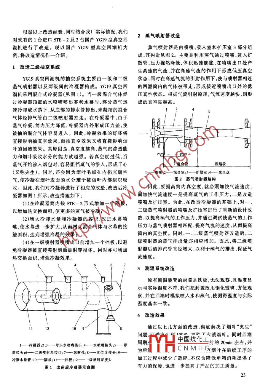 煙草科技/煙草設(shè)備與儀器Tobacco Science Technology2001年第8期(總第169期)化皮,首先將要噴涂的表面車(chē)小0.5mm;再進(jìn)行噴砂或原一黌噴6超聲速電火花拉毛,使表面粗糙,增加涂層附著力(見(jiàn)圖1)。噴涂2.3.2噴涂去氧化噴涂時(shí)的操作規(guī)范取決于噴槍的形式、噴涂金屬去氧「非噴涂一皮、使表噴涂功率部位噴涂距離的材料及工件的工作條件,要選用合理的空氣工作壓力、噴涂功率、噴射距離、工件轉(zhuǎn)速、移動(dòng)速度、表面溫表面溫度度和涂層厚度,加工過(guò)程見(jiàn)圖1。4注意事項(xiàng)超聲←加超聲速(1)噴涂前切削和噴涂后切削,以及在噴涂過(guò)程中涂碳化鎢噴涂的定位基準(zhǔn)和裝夾方法始終應(yīng)保持一致。(2)噴涂應(yīng)連續(xù)進(jìn)行,不可間斷,同時(shí)應(yīng)注意受熱表面質(zhì)量、尺寸大小、均勻度、光潔度」工件的溫度不應(yīng)超過(guò)70℃,噴涂的金屬射流要盡量垂圖1加工過(guò)程框圖直于被噴涂表面。0.8mm和1.2mm;浸漬器B上下環(huán)平均間隙分別為1.1mm和1.2mm,完全達(dá)到原設(shè)計(jì)要求3修復(fù)效果(2)修復(fù)后經(jīng)使用超過(guò)1.25倍壓力的水壓進(jìn)行試(1)修復(fù)后浸漬器A上下環(huán)平均間隙分別為驗(yàn),密封良好密封效果完全達(dá)到工藝要求。真空回潮機(jī)的改造陳文欽,葛慶生【關(guān)鍵詞】真空回潮;煙葉;回透率;冷凝率、煙葉含水率、煙葉溫度、水漬煙葉,其中以回透率最【摘要】針對(duì)目前國(guó)內(nèi)真空回潮存在的回透率偏低為關(guān)鍵。因?yàn)榛赝嘎适窃u(píng)價(jià)真空回潮均勻性的指標(biāo)及水漬煙葉的現(xiàn)象,通過(guò)改造二級(jí)抽真空系統(tǒng)提高抽一般要求≥98%,如果相差過(guò)大,則可能會(huì)產(chǎn)生“夾生真空度,以及在此基礎(chǔ)上對(duì)蒸氣噴射器、測(cè)溫系統(tǒng)進(jìn)行現(xiàn)象,即包心溫度過(guò)低,煙包中心部分煙葉的含水率幾了改造,徹底解決了回潮過(guò)程中出現(xiàn)的煙葉“夾生”問(wèn)乎未增加,極易在加工過(guò)程中產(chǎn)生造碎。因此,只要回題,回透率達(dá)到100%,并消除了水漬煙葉。透率達(dá)到要求,一般煙葉的含水率及溫度也能達(dá)到要中圖分類(lèi)號(hào)】TS431【文獻(xiàn)標(biāo)識(shí)碼】B求。另一方面,煙葉溫度和回透率等因素也是造成水【文章編號(hào)】1002-0861(2001)08-0022-02漬煙葉的主要原因,水漬煙葉含水率過(guò)高,煙葉的可用真空回潮作為制絲(打葉復(fù)烤)生產(chǎn)線的第一道工性變差,甚至無(wú)法使用。序,是我國(guó)目前普遍采用的一種預(yù)回潮方法,其基本任針對(duì)目前國(guó)內(nèi)真空回潮存在回透率偏低及水漬煙務(wù)就是提高煙葉的溫度和含水率,改善煙葉的物理特葉現(xiàn)象,許多廠家對(duì)真空回潮進(jìn)行了改造。其改造情性,使之滿(mǎn)足后續(xù)工序?qū)ξ锪系墓に囈?。況為:由原來(lái)的二級(jí)抽空改為四級(jí)抽空,加濕系統(tǒng)由原評(píng)價(jià)真空回潮效果的工藝指標(biāo)主要有4個(gè):回透來(lái)的噴嘴改為用鉆有多個(gè)孔的無(wú)縫鋼管。其優(yōu)點(diǎn)是回產(chǎn)能力提高,直空度高,回透效果好,回陳文欽,葛慶生.龍巖卷煙廠,364000福建省龍巖市西安南路24號(hào)中國(guó)煤化工缺點(diǎn)是:投資大,改造電話:0597-2213588-2321【收稿日期】2001-04-02CNMHG控部分隨之變動(dòng);維修【貴任編輯】曹娟量及維修成本增加,由于采用無(wú)縫鋼管鉆孔噴射,容易腐蝕,每半年需更換一套噴射管,且更換極為不便。根據(jù)以上改造經(jīng)驗(yàn),同時(shí)結(jié)合我廠實(shí)際情況,我們2蒸氣噴射器改造對(duì)現(xiàn)有的1臺(tái)進(jìn)口STE-2及2臺(tái)國(guó)產(chǎn)YGC19型真空回潮機(jī)進(jìn)行了改造?,F(xiàn)以國(guó)產(chǎn)YGl9型真空回潮機(jī)為蒸氣噴射器是由噴嘴、吸入室和擴(kuò)壓室3部分組例,將改造情況作一介紹。成,其構(gòu)造見(jiàn)圖2。主要是利用蒸氣通過(guò)噴嘴,進(jìn)入擴(kuò)散管,壓力驟然降低,體積迅速膨脹,在噴嘴出口處產(chǎn)1改造二級(jí)抽空系統(tǒng)生高速的氣流,并在高速氣流的作用下形成低壓真空YG19真空回潮機(jī)的抽空系統(tǒng)主要由一級(jí)和二級(jí)狀態(tài),同時(shí)在高速氣流的引射作用下,使與噴射器相連蒸氣噴射器以及兩級(jí)間的冷凝器構(gòu)成。YG19真空回的回潮筒內(nèi)的氣體被帶走,形成接近噴嘴出口處的低潮機(jī)采用混合式冷凝器(見(jiàn)圖1)。當(dāng)一級(jí)混合氣體經(jīng)壓真空狀態(tài)。根據(jù)氣流引射原理,氣流速度越快,則形過(guò)冷凝器頂部的水噴嘴噴出霧狀水幕時(shí),部分蒸氣迅成的真空度越高。速冷卻成水落下,從底部的排水管排出,未凝結(jié)的混合氣體經(jīng)排氣管由二級(jí)噴射器抽走。在冷凝器中,由于蒸氣冷凝,筒內(nèi)壓力降低,冷凝器內(nèi)外形成壓力差,使被抽的混合氣體容易進(jìn)入。因此,冷凝效果的好壞將直接影響抽真空效果,而抽真空效果又將直接影響煙葉的回透效果。其原因是,真空度越高,蒸氣的滲透能力和煙葉吸收水分的能力就越強(qiáng)。若真空度過(guò)低,當(dāng)蒸氣開(kāi)始滲人煙包時(shí),容易阻擋蒸氣的滲人,形成干心混合段壓縮段(又稱(chēng)夾生)。同時(shí),還會(huì)因?yàn)闊熑~毛細(xì)孔內(nèi)仍充滿(mǎn)空——噴嘴;2—