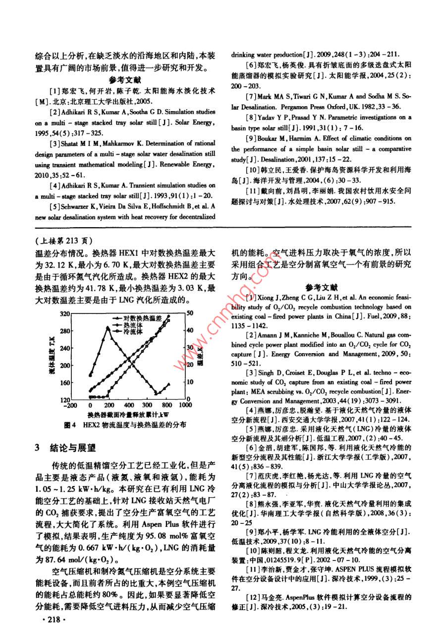 第29卷,總第167期節(jié)能技術(shù)voL 29 Sum. No. 1672011年5月,第3期ENERGY CONSERVATION TECHNOLOGYMay 2011, No. 3利用液化天然氣冷能空分新流程及模擬分析聶江華,楊宏軍2,徐文東,林小鬧(1.華南理工大學(xué)傳熱強(qiáng)化與過程節(jié)能教育部重點(diǎn)實驗室,廣東廣州510640;2.廣東海洋大學(xué)工程學(xué)院,廣東湛江524088)摘要:提出了利用液化天然氣(LNG)冷能空分新流程,產(chǎn)品是用于滿足電廠富氧燃燒的氣態(tài)富氧空氣??諝庖暈镹2(79.1mol%)和02(20.9mol%)二元混合氣體,采用 Aspen Plus軟件進(jìn)行了流程模擬,物性方法選擇Peng- Robinson方程。模擬結(jié)果表明,生產(chǎn)95.08ml%富氧空氣的能耗是0.667kWh/(kg·O2),液化天然氣(LNG)的消耗量是87.64mol/(kg·O2)。與文獻(xiàn)[7]生產(chǎn)多種液態(tài)產(chǎn)品模擬結(jié)果比較,單位氧氣的能耗大致相等,LNG消耗減少約50%,精餾塔冷凝蒸發(fā)器兩側(cè)的傳熱溫差從1.2K增大到2.8K,可大大減小換熱器的面積關(guān)鍵詞:富氧空氣;液化天然氣;冷能利用;低溫精餾;流程模擬中圖分類號:TE64文獻(xiàn)標(biāo)識碼:A文章編號:1002-6339(2011)03-0211-03A Novel Process for Air Separation by Utilization of Liquefied Natural GasCold Energy and Performance Analysis by Numerical SimulationNIE Jiang-hua, YANG Hong-jun, XU Wen-dong, LIN Xiao-na(1. Key Laboratory of Enhanced Heat Transfer and Energy Conservation, Ministry ofEducation, South China University of Technology, Guangzhou 510640, China2. College of Engineering, Guangdong Ocean University, Zhanjiang 524088, China)Abstract: A novel process for air separation by utilization of liquefied natural gas cold energy was pro-posed basedexisting studies, in which the product is oxygen-enriched air for oxy-combustion inpower plant. The process simulation was carried out by Aspen Plus software with the simulated air(N,79, 1 mol%, 02, 20. 9 mol%)and Peng-Robinson equation was chosen for property method. The resultsshow that energy consumption is 0.667 kW.h(kg.O2)and the LNG consumption is 87. 64 mol/ ( kg0,)for production of air with 95. 08 mol% oxygen. a comparison with reference[ 7 ]was also carried outthe results indicate that as for producing per kg oxygen, energy consumption for both process are equaland LNG amount could reduce roughly 50%. The heat transfer temperature difference in condenser in cry-ogenic distillation column increased from 1. 2 K to 2.8K, which could lead to a greatly reduction in heatexchanger areas.Key words: oxygen-enriched air; liquefied natural gas; cold energy utilization; cryogenic distillation;process simulation收稿日期2011-01-05修訂稿日期2011-03-20基金項目:唐山LNG項目冷能利用可行性研究報告0引言作者簡介:聶江華(1986~),男,碩士研究生,主要從事過程節(jié)能與優(yōu)化研究工作。液化天然氣(LNG)是天然氣經(jīng)凈化處理液化211得到的溫度約為112K的低溫液體,主要成份是本文建立的空分新流程,多股流換熱器HEX2CH4,具有熱值高,環(huán)保,儲運(yùn)成本低等特點(diǎn)。LNG中,處理空氣和循環(huán)氮?dú)饫鋮s的冷量來自LPC中的的主要利用方式是先在接收站汽化為高壓天然氣,低溫富氧液空和富氮?dú)怏w升溫吸熱,以及LNG汽化然后通過管網(wǎng)輸送到用戶端。LNG從液態(tài)汽化為過程中放出的冷能。與已有的流程相比由于回收常溫下的氣態(tài),放出大約830kJ/kg的冷量。LNG了低溫富氧液空的冷能,可以減少單位氧氣的LNG汽化熱源目前最常用的是海水或空氣,因此造成了用量。HPC頂部富氮?dú)怏w液化的冷量由兩部分提冷能的極大浪費(fèi)。并且一般LNG接收站都帶有獨(dú)供,一部分來自LPC底部部分富氧液體汽化吸收的立的天然氣電廠,會產(chǎn)生大量的溫室氣體CO2,需要熱量,另一部分來自循環(huán)氮?dú)狻S捎诋a(chǎn)品只有一種進(jìn)行CO2捕獲。傳統(tǒng)形式的電廠CO2捕獲方式主氣態(tài)富氧空氣,省去了氮?dú)夂蜌鍤獾恼麴s塔,大大簡要是燃后捕獲和富氧燃燒捕獲。富氧燃燒捕獲能提化了系統(tǒng)。高煙氣中CO2的濃度,同時大大減少煙氣的排放富氧燃燒所需的富氧需要消耗大量的電能或低溫冷如Q也量,是電廠CO2捕獲的一種很有前景的技術(shù)-3AC AH量進(jìn)行空分獲得。LNG接收站利用LNG汽化過程N(yùn)O的冷能進(jìn)行空分,富氧空氣用于燃?xì)廨啓C(jī)燃燒發(fā)電NC既回收利用了LNG汽化過程中的冷能,又可降低電HEX廠CO2捕獲費(fèi)用,對LNG接收站具有雙重的經(jīng)濟(jì)效益。利用LNG冷能空分流程方面的論文及專利不LP少0,但是都是基于多種液態(tài)產(chǎn)品,如液氮、液氧以及液氬等,導(dǎo)致系統(tǒng)復(fù)雜,單位產(chǎn)品LNG消耗量HEX大。本研究目的在于建立利用LNG冷能制氣態(tài)富氧的新空分流程,以滿足電廠富氧燃燒的需要,簡化—富氧空氣傳統(tǒng)空分流程同時降低單位氧氣的LNG消耗量。LN1利用LNG冷能空分新流程的建立圖1是利用LNG冷能空分流程。由于富氧空圖1利用LNG冷能空分流程氣用于電廠燃燒,空氣預(yù)處理凈化過程較為簡單圖AC-空氣壓縮機(jī);AH-空氣預(yù)冷器;HEX1,2-多股流1中省略了這個單元。系統(tǒng)的主要操作單元是精餾換熱器NC一氮?dú)鈮嚎s機(jī);m,2,3-節(jié)流閥;LPC/HPC塔由高壓精餾塔(HPC)和低壓精餾塔(LPC)組成,低壓/高壓精餾塔HPC和LPC之間由蒸發(fā)冷凝換熱器連接,其作用是利用HPC頂高溫氣體冷凝放熱使LPC底部的液體2空分流程模擬及結(jié)果分析汽化。其工作原理是,空氣經(jīng)過空氣壓縮機(jī)(AC)增加利用LNG冷能空分的 Aspen Plus模擬流程如到一定的壓力,