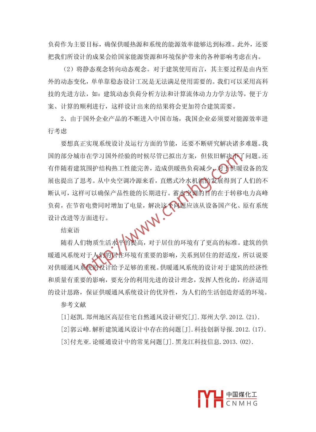 供暖通風(fēng)的優(yōu)化設(shè)計(jì)研究祁珍姣周立鑫劉杰中國(guó)新型建材設(shè)計(jì)研究院浙江310000杭州長(zhǎng)安暖通動(dòng)力設(shè)備有限公司浙江310000摘要:隨著人們生活水平的提高,對(duì)于建筑在供暖通風(fēng)方面的要求越來(lái)越高。建筑的供暖通風(fēng)也成為了當(dāng)前的建設(shè)部門比較重視的項(xiàng)目,供暖通風(fēng)和空調(diào)系統(tǒng)對(duì)于人們的居住條件有重要的影響,供暖通風(fēng)系統(tǒng)的優(yōu)異性能可以為人們的生活提供極大的便利。關(guān)鍵詞:供暖通風(fēng);系統(tǒng)優(yōu)化;優(yōu)化設(shè)計(jì)中圖分類號(hào): TE44 文獻(xiàn)標(biāo)識(shí)碼: A文 章編號(hào):引言供暖通風(fēng)專業(yè)是機(jī)電設(shè)備的重要專業(yè),不論是住宅建筑,還是工業(yè)建筑,其都發(fā)揮著重要的作用。通常情況下,供暖通風(fēng)系統(tǒng)包括供暖系統(tǒng)、空調(diào)系統(tǒng),以及通風(fēng)系統(tǒng)等,供暖通風(fēng)系統(tǒng)的設(shè)計(jì)與設(shè)備安裝存在著--定的復(fù)雜度。同時(shí),供暖通風(fēng)系統(tǒng)的設(shè)計(jì)直接關(guān)系著建筑工程的質(zhì)量和經(jīng)濟(jì)效益的高低。因此,加強(qiáng)供暖通風(fēng)系統(tǒng)的優(yōu)化設(shè)計(jì)有著非常大的必要性,對(duì)綜合效益的提高有著很大的作用。一、供暖通風(fēng)設(shè)計(jì)原則隨著社會(huì)觀念的不斷更新和變化,人們對(duì)于節(jié)能的認(rèn)識(shí)也在不斷變化,對(duì)于現(xiàn)代節(jié)能建筑的認(rèn)識(shí),人們不僅僅是注重冬季建筑的保暖,還要注重夏季室內(nèi)良好的通風(fēng)情況,這樣才能夠使得夏季的室內(nèi)溫度更加清涼,同時(shí)還能對(duì)降低建筑的隔熱效果發(fā)揮作用,減少室外溫度對(duì)室內(nèi)溫度的影響。從這些情況來(lái)看,在進(jìn)行節(jié)能建筑供暖通風(fēng)工程的設(shè)計(jì)過程中需要按照一定的原則進(jìn)行設(shè)計(jì)。根據(jù)地?zé)岵膳南嚓P(guān)特點(diǎn)來(lái)看,其特點(diǎn)具體包括了:節(jié)省居室面積和能源、環(huán)境舒適、運(yùn)費(fèi)低、隔音效果好等,這些使得地?zé)岵膳F(xiàn)在正逐漸變?yōu)楣?jié)能建筑的第一供熱方式。設(shè)計(jì)節(jié)能建筑暖通工程時(shí),應(yīng)該根據(jù)《民用建筑供暖通風(fēng)及空氣調(diào)節(jié)設(shè)計(jì)規(guī)范》相關(guān)規(guī)定并按照工程的具體情況開展設(shè)計(jì)工作。對(duì)于不同地區(qū)存在的差異進(jìn)行技術(shù)參數(shù)分析后進(jìn)行復(fù)核實(shí)際的設(shè)計(jì)與施工。節(jié)能建中國(guó)煤化工設(shè)計(jì)YHCNM HG參數(shù)包括了:第一,熱媒:低于65C,低溫為30C~40C。第二,供回水溫差:10°C~17°C,地暖系統(tǒng)工作壓力小于0. 8Mpa,設(shè)計(jì)過程中對(duì)于基本耗熱量的計(jì)算需要參照《民用建筑供暖通風(fēng)及空氣調(diào)節(jié)設(shè)計(jì)規(guī)范》中的具體規(guī)定進(jìn)行,以及按照輻射采暖特點(diǎn)做進(jìn)一步修改, 最后計(jì)算出地?zé)岱块g的單位耗熱指標(biāo)。采暖地面構(gòu)造厚度要控制在80毫米以上,管間距最好在150~300 毫米之間,熱管距外墻內(nèi)表面為70~100毫米。待這些參數(shù)準(zhǔn)備到位后,應(yīng)該然布置供熱房間管道。每戶設(shè)置- -組分水器,根據(jù)房間多少安排支環(huán)路個(gè)數(shù)。三、供暖通風(fēng)系統(tǒng)的優(yōu)化設(shè)計(jì)1、對(duì)設(shè)計(jì)方案進(jìn)行正確比較對(duì)設(shè)計(jì)方案進(jìn)行比較,并不是一件容易的事情,它需要設(shè)計(jì)人員具有較高的素質(zhì)及技術(shù)水平,同時(shí)對(duì)設(shè)計(jì)方案有清醒的認(rèn)識(shí)。像有些運(yùn)用了最新技術(shù)的方案并不一-定是最優(yōu)方案,它的經(jīng)濟(jì)性及合理性也均是需要考慮的;而且每種方案都有它自身的適用范圍及條件,當(dāng)處于適用范圍之外時(shí),先進(jìn)技術(shù)方案可能就變成了不合理或不可行方案。進(jìn)行方案選擇的時(shí)候,要盡量結(jié)合實(shí)際選擇經(jīng)濟(jì)適用的方案;并且其設(shè)計(jì)方案在滿足需求的前提下,系統(tǒng)越簡(jiǎn)單越好。2、對(duì)輔助系統(tǒng)進(jìn)行合理的綠化可以通過對(duì)輔助系統(tǒng)進(jìn)行綠化設(shè)計(jì)從而促進(jìn)供暖通風(fēng)系統(tǒng)的優(yōu)化設(shè)計(jì)。在建筑物的旁邊-般都會(huì)有綠化物,綠化樹木的存在不僅可以降低噪音,吸收灰塵,同時(shí)還美化了環(huán)境。在建筑物旁的樹木可以吸收大量的熱量,從而達(dá)到降溫的作用,并且還可以擋風(fēng)。在建筑物中,當(dāng)夏季高溫的時(shí)候,由于地面的熱量反射會(huì)使建筑的溫度升高,最高時(shí)可達(dá)80攝氏度。而在冬季寒冷的時(shí)候,由于屋頂熱量的散發(fā),溫度要比正??諝鉁囟鹊秃芏?,這樣的話,建筑在一年中的溫差就可達(dá)到一百度左右,對(duì)于建筑的供暖通風(fēng)系統(tǒng)造成了極大的負(fù)荷。所以說在建筑的屋面進(jìn)行綠化設(shè)計(jì)可以有效的避免巨大的溫差,在高溫季節(jié),綠化物會(huì)將大量的熱量通過水分蒸發(fā)而揮發(fā)掉,這樣就可以保持在20度左右,有效的控制室內(nèi)的溫度變化。3、熱泵技術(shù)熱泵技術(shù)是一種靠位能拖動(dòn