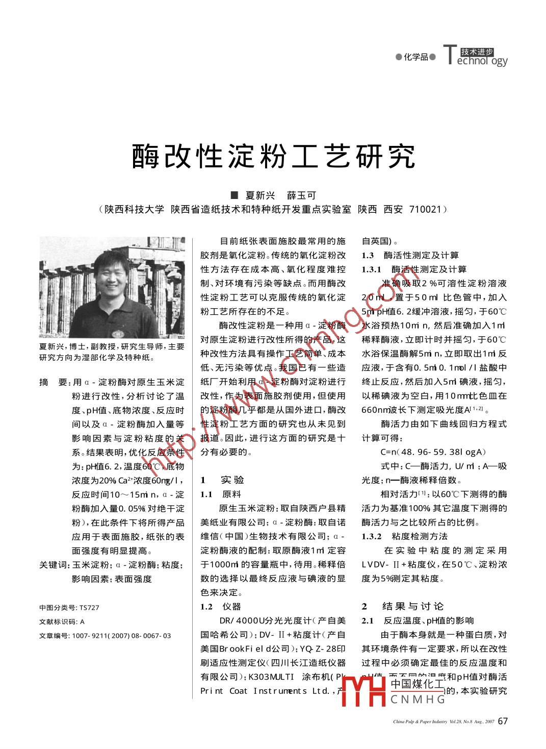 ●化學(xué)品●肢術(shù)進(jìn)步echnol ogy酶每改性淀粉工藝研究■夏新興薛玉可(陜西科技大學(xué)陜西省造紙技術(shù)和特種紙開發(fā)重點實驗室陜西西安710021)目前紙張表面施膠最常用的施自英國)。膠劑是氧化淀粉。傳統(tǒng)的氧化淀粉改1.3酶活性測定及計算性方法存在成本高、氧化程度難控1.3.1酶活性測定及計算制、對環(huán)境有污染等缺點。而用酶改準(zhǔn)確吸取2%可溶性淀粉溶液性淀粉工藝可以克服傳統(tǒng)的氧化淀20m,置于50m比色管中,加入粉工藝所存在的不足5mpH植直6.2緩沖溶液,搖勻,于60℃酶改性淀粉是一種用α-淀粉酶水浴預(yù)熱10miη,然后準(zhǔn)確加入1對原生淀粉進(jìn)行改性所得的產(chǎn)品,這稀釋酶液,立即計時并搖勻,于60℃夏新興,博士,副教授,研究生導(dǎo)師,主要究方向為濕部化學(xué)及特種紙。種改性方法具有操作工藝簡單、成本水浴保溫酶解5mn,立即取出1m反低、無污染等優(yōu)點。我國已有一些造應(yīng)液,于含有0.5m0.1mol/鹽酸中摘要用Q-淀粉酶對原生玉米淀紙廠開始利用a-淀粉酶對淀粉進(jìn)行終止反應(yīng),然后加入5m碘液,搖勻,粉進(jìn)行改性,分析討論了溫改性,作為表面施膠劑使用,但使用以稀碘液為空白,用10m比色皿在度、pH值、底物濃度、反應(yīng)時的淀粉酶幾乎都是從國外進(jìn)口酶改660nm波長下測定吸光度A1,2間以及a-淀粉酶加入量等性淀粉工藝方面的研究也從未見到酶活力由如下曲線回歸方程式影響因素與淀粉粘度的關(guān)報道。因此,進(jìn)行這方面的研究是十計算可得:系。結(jié)果表明,優(yōu)化反應(yīng)條件分有必要的。C=n(48.96-59.38|ogA)為:pH植直6.2,溫度60℃,底物式中:C一酶活力,U/m;A吸濃度為20%Ca2濃度60rg1實驗光度;n一酶液稀釋倍數(shù)反應(yīng)時間10~15mn,a-淀1.1原料相對活力:以60℃下測得的酶粉酶加入量0.05%對絕干淀原生玉米淀粉:取自陜西戶縣精活力為基準(zhǔn)100%其它溫度下測得的粉),在此條件下將所得產(chǎn)品美紙業(yè)有限公司;α-淀粉酶:取自諾酶活力與之比較所占的比例應(yīng)用于表面施膠,紙張的表維信(中國)生物技術(shù)有限公司:a·132粘度檢測方法面強(qiáng)度有明顯提高淀粉酶液的配制:取原酶液1m定容在實驗中粘度的測定采用關(guān)鍵詞:玉米淀粉;a-淀粉酶:粘度;于1000m的容量瓶中待用稀釋倍LVDV-Ⅱ粘度儀,在50℃、淀粉濃影響因素;表面強(qiáng)度數(shù)的選擇以最終反應(yīng)液與碘液的顯度為5%則定其粘度色來決定中圖分類號:TS72712儀器2結(jié)果與討論文獻(xiàn)標(biāo)識碼:DR/4000U分光光度計(產(chǎn)自美2.1反應(yīng)溫度、pH植的影響文章編號:1007-9211(2007)08-0067-03國哈希公司);DV-I+粘度計(產(chǎn)自由于酶本身就是一種蛋白質(zhì),對美國 Br ook Fi el d公司);YQz-28印其環(huán)境條件有一定要求,所以在改性刷適應(yīng)性測定儀(四川長江造紙儀器過程中必須確定最佳的反應(yīng)溫度和有限公司);K303MTI涂布機(jī)和pH值對酶活Pri nt Coat i nstr uents lt d中國煤化工的,本實驗研究CNMHGChina Pulp Paper Idustry WiN. 28, Na. 8 Aa, 2007 67echnol ogy●化學(xué)品●了不同溫度、不同pH值條件下對α-的這一特點,在實際生產(chǎn)過程中,應(yīng)盡因子的有金屬離子、輔酶和副底物(。淀粉酶活力的影響,以保證α-淀粉量使反應(yīng)體系旳ρH值接近6.2,以充輔因子本身并不具備催化作用,但在酶在反應(yīng)過程中活性達(dá)到最大。其結(jié)分發(fā)揮酶的活力,減少酶的用量,當(dāng)反酶催化反應(yīng)中起著運輸轉(zhuǎn)移電子、原果如圖1、圖2所示。應(yīng)結(jié)束時,可使體系處于酸性或堿性子或某些功能基團(tuán)的作用。在此研究中,使得殘余的酶失活,以保證所得反中采用金屬離子作為輔因子。在確定應(yīng)物的穩(wěn)定性。故此反應(yīng)過程中體系的溫度、pH埴值及底物濃度下,向體系的pH值直控制在6.2左右。中分別加入CaC2、FeSO4、MC2及22底物濃度對α·淀粉酶活力的CusO等溶液,檢測金屬離子對a影響淀粉酶的影響,然后再確定其加入的以玉米淀粉為底物,在最適酶促最佳量。反應(yīng)溫度和pH植值直條件下,研究了底物溫度℃c濃度對α-淀粉酶活力的影響酶促反應(yīng)的初速度通常較大,但圖1溫度對a淀粉酶活力的影響是隨著反應(yīng)的進(jìn)行,酶促反應(yīng)的速度達(dá)到最大之后逐漸下降。引起酶促反0.E應(yīng)速度下降的原因很多,其中最重要的原因是底物的消耗和反應(yīng)終產(chǎn)物80對酶促反應(yīng)的抑制作用4。因此,低濃5254565860溫度℃度的反應(yīng)底物是不利于酶促反應(yīng)進(jìn)6.06.26.46.66,87.0DH值行的,但過高的底物濃度必然也會帶圖4金屬離子對a-淀粉酶活力的影響來高濃度的反應(yīng)終產(chǎn)物,由于終產(chǎn)物圖2pH值對a·淀粉酶活力的影響對酶促反應(yīng)的抑制作用,其結(jié)果也會導(dǎo)致酶促反應(yīng)速度的下降因些,對a由圖1可見,α-淀粉酶的相對活個特定的酶促反應(yīng),在反應(yīng)溫度和自30力隨著反應(yīng)溫度升高先增加,當(dāng)溫度pH一定的情況下,應(yīng)該有一個最適為60℃時,α-淀粉酶的反應(yīng)活力達(dá)合的底物濃度。由圖3可見,當(dāng)?shù)孜餄?0到最大值,然后,隨著溫度進(jìn)一步升度為209時,淀粉粘度下降率最大,因020406080高,酶的相對活力開始下降。這是由此在本實驗中確定的溫度為60℃,Ca2加入量mg于在一定的溫度范圍內(n