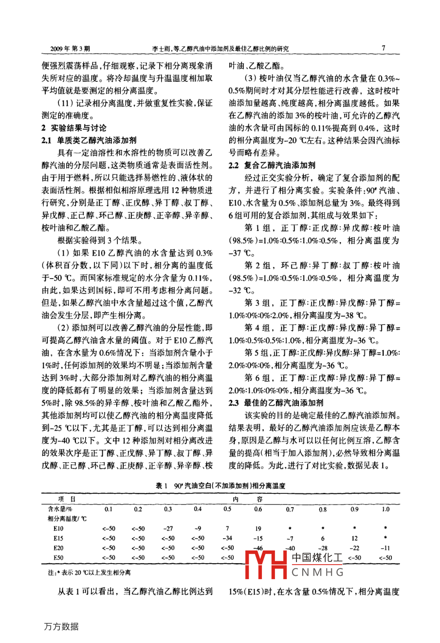 煉油與化工REFINING AND CHEMICAL INDUSTRY第20卷乙醇汽油中添加劑及最佳乙醇比例的研究李士雨12,司瑞1,齊向娟,孫傳慶12,徐麗梅(1天津大學(xué)化工學(xué)院天津30002;2石河子大學(xué)化學(xué)化工學(xué)院新疆石河子432003)摘要:參照 ASTM D642299方法對(duì)12種單質(zhì)型乙醇汽油添加劑對(duì)乙醇汽油相分離溫度的改善效果進(jìn)行了實(shí)驗(yàn)研究篩選出9種可以使乙醇含量為10%(E10)的乙醇汽油相分離溫度降低到-25℃以下的添加劑。在此基礎(chǔ)上,采用正交實(shí)驗(yàn)法開發(fā)出6種復(fù)合添加劑,均可使E0乙醇汽油的相分離溫度低于-30℃(添加劑用量為3%)。并通過實(shí)驗(yàn)確定,當(dāng)乙醇汽油中乙醇比例達(dá)到20%時(shí),不加添加劑也可使其相分離溫度在水含量為0.8%時(shí)低于-28℃,遠(yuǎn)高于國標(biāo)中對(duì)乙醇汽油水含量的限制,有利于乙醇汽油的推廣。關(guān)鍵詞:乙醇汽油;相分離溫度;醇油比中圖分類號(hào):TE626文獻(xiàn)標(biāo)識(shí)碼:A文章編號(hào):1671-4962(200)03-0006-02近年來,乙醇汽油作為一種新型的車用燃料,試管插上低溫溫度計(jì),按照 ASTM D642299的得到了世界各國的高度重視。2005年全世界生物方法進(jìn)行測定燃料乙醇產(chǎn)量為30Mt。我國有9個(gè)省(市)推廣使(3)將測試管放入低溫恒溫反應(yīng)浴。低溫恒溫用乙醇汽油,乙醇汽油的消費(fèi)量約占全國汽油消反應(yīng)浴從室溫降到-10℃,測定測試管中樣品的溫費(fèi)量的20%。度。從室溫開始測定。乙醇汽油在使用中也存在一些問題,如動(dòng)(4)以2℃為間隔,將測試管從低溫恒溫反應(yīng)力性低、尾氣排放中部分物質(zhì)超標(biāo)、發(fā)動(dòng)機(jī)有沉積浴中取出,震蕩5~10s,用蘸過異丙醇的濕毛巾擦物、分層等問題。各國在乙醇汽油中乙醇比例上存拭測試管表面,以除去凝結(jié)物,在5s之內(nèi)在光亮在很大差異,例如,巴西供應(yīng)的乙醇汽油有2種:的背景下觀測樣品??刂茰y試管中樣品的降溫速乙醇汽油(2%無水乙醇+78%汽油)和MEG燃料度不超過2/min(60%無水乙醇+33%甲醇+7%汽油),美國供應(yīng)乙5)如果測試樣品沒有出現(xiàn)相分離,或者相分醇添加比例大于20%的乙醇汽油,我國乙醇汽油離溫度并沒有低于-50℃,把測試管放回低溫恒溫中乙醇的含量為90%-105%。文中通過實(shí)驗(yàn)確定反應(yīng)浴中。如果測試樣品出現(xiàn)了相分離現(xiàn)象,則記了乙醇汽油中乙醇比例的最佳值。錄溫度,之后做第(10)步。如果測試樣品在-50℃沒1實(shí)驗(yàn)方法有出現(xiàn)相分離現(xiàn)象,則記錄相分離溫度為<-50℃。研究發(fā)現(xiàn),乙醇汽油在含水量達(dá)到一定比例(6)如果測試樣品達(dá)到了0℃仍沒有發(fā)生相時(shí)會(huì)發(fā)生分層現(xiàn)象。使用相分離溫度表征乙醇分離,則將低溫恒溫反應(yīng)浴的溫度設(shè)置為-25℃,汽油的最低分層溫度,相分離溫度越低,表明乙醇重復(fù)第(4)、(5)步汽油越不易發(fā)生相分離即使用性能越好。(7)當(dāng)樣品達(dá)到-15℃而沒有出現(xiàn)相分離現(xiàn)參照 ASTM D642299進(jìn)行該實(shí)驗(yàn)相分離溫象,將低溫恒溫反應(yīng)浴溫度設(shè)置為-40℃,重復(fù)第度的測定,實(shí)驗(yàn)過程共包括11個(gè)步驟(4)、(5)步。(1)取10mL容量瓶若干,按照乙醇、水、汽(8)當(dāng)樣品達(dá)到-25℃而沒有出現(xiàn)相分離現(xiàn)油、添加劑的順序配制一定比例的混合溶液,搖晃象將低溫恒溫反應(yīng)浴溫度設(shè)置為-50℃,重復(fù)第均勻后靜置10min,觀察現(xiàn)象靜置后分層的記錄(4)、(5)步。為“-”,表示室溫下分層,并記錄室溫溫度(如果室rV中國煤化工出現(xiàn)相分離現(xiàn)溫低于20℃,應(yīng)先將混合溶液升溫,然后進(jìn)行測象將60℃,重復(fù)第定)。CNMHGHH起·習(xí)·ML(2)將未在室溫下分層的溶液搖勻后倒入測10)使樣品在室溫下升溫,并且每升高2℃00年第3期李土雨等乙醇汽油中添加劑及最佳乙醇比例的研究便強(qiáng)烈震蕩樣品,仔細(xì)觀察,記錄下相分離現(xiàn)象消葉油、乙酸乙酯。失所對(duì)應(yīng)的溫度。將冷卻溫度與升溫溫度相加取(3)桉葉油僅當(dāng)乙醇汽油的水含量在03%~平均值就是要測定的相分離溫度。0.5%期間時(shí)才對(duì)其分層性能進(jìn)行改善,這時(shí)桉葉(11)記錄相分離溫度,并做重復(fù)性實(shí)驗(yàn),保證油添加量越高、純度越高,相分離溫度越低。如果測定的準(zhǔn)確度。在乙醇汽油的添加3%的桉葉油,可允許的乙醇汽2實(shí)驗(yàn)結(jié)果與討論油的水含量可由國標(biāo)的0.11%提高到04%,這時(shí)21單質(zhì)類乙醇汽油添加劑的相分離溫度為-20℃左右。這種結(jié)果會(huì)因汽油標(biāo)具有一定油溶性和水溶性的物質(zhì)可以改善乙號(hào)而略有差異醇汽油的分層問題,這類物質(zhì)通常是表面活性劑。2.2復(fù)合乙醇汽油添加劑由于用于燃料,所以只能選擇易燃性的、液體狀的經(jīng)過正交實(shí)驗(yàn)分析,確定了復(fù)合添加劑的配表面活性劑。根據(jù)相似相溶原理選用12種物質(zhì)進(jìn)方,并進(jìn)行了相分離實(shí)驗(yàn)。實(shí)驗(yàn)條件:90汽油、行研究,分別是正丁醇、正戊醇、異丁醇、叔丁醇、E10水含量為05%、添加劑總量為3%。最終得到異戊醇、正己醇、環(huán)己醇、正庚醇、正辛醇、異辛醇、6組可用的復(fù)合添加劑,其組成與效果如下:桉葉油和乙酸乙