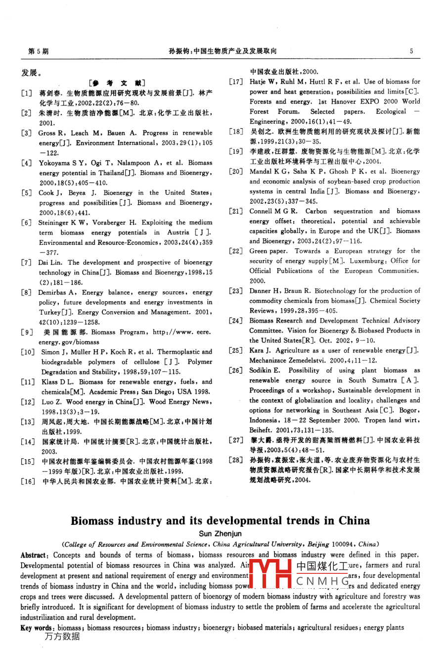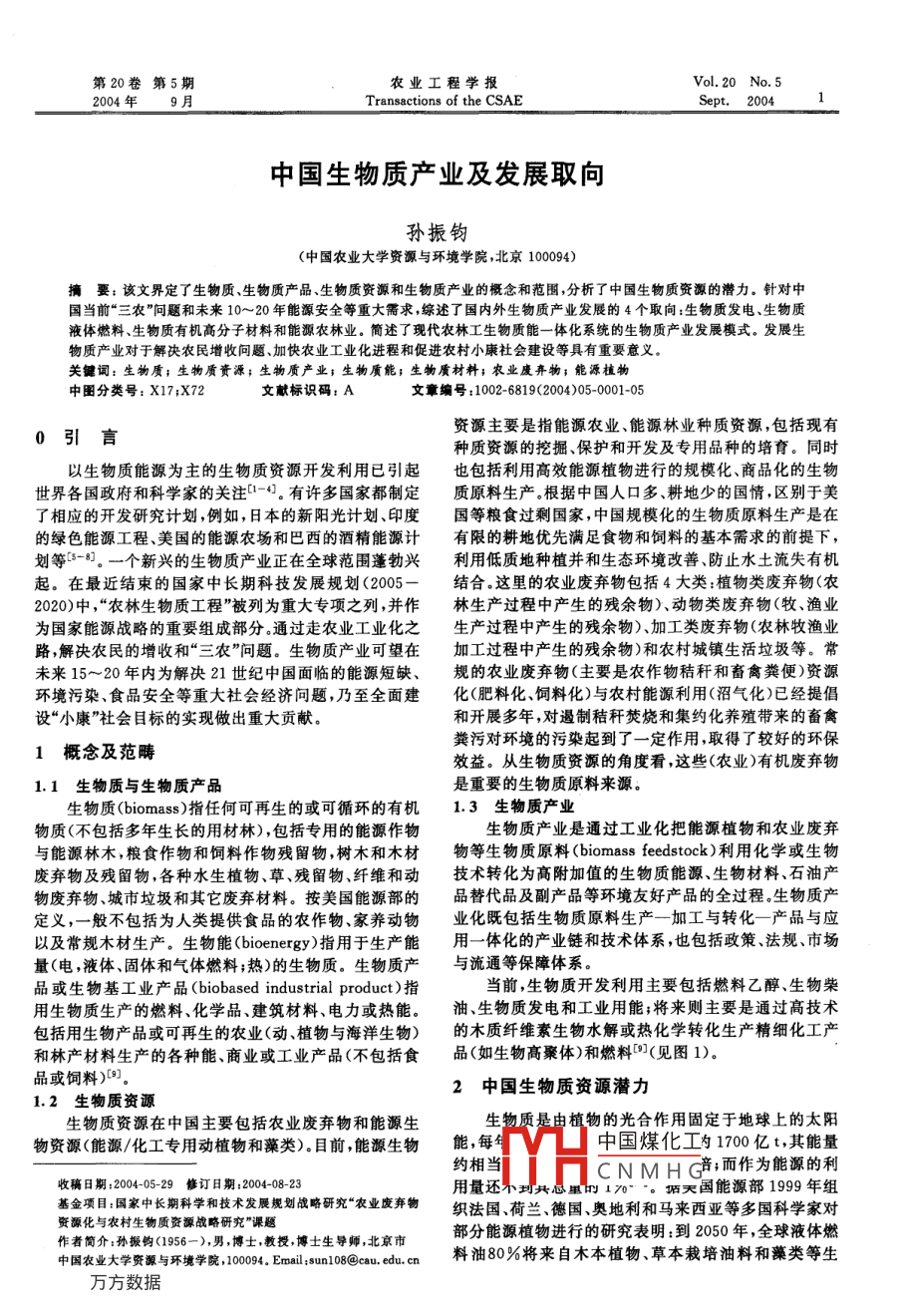 第20卷第5期農(nóng)業(yè)工程學報Vol 20 No 52004年9月Transactions of the CSae中國生物質(zhì)產(chǎn)業(yè)及發(fā)展取向?qū)O振鈞(中國農(nóng)業(yè)大學資源與環(huán)境學院,北京100094)摘要:該文界定了生物質(zhì)、生物質(zhì)產(chǎn)品、生物質(zhì)資源和生物質(zhì)產(chǎn)業(yè)的概念和范圍,分析了中國生物質(zhì)資源的潛力。針對中國當前“三農(nóng)”問題和未來10~20年能源安全等重大需求,綜述了國內(nèi)外生物質(zhì)產(chǎn)業(yè)發(fā)展的4個取向:生物質(zhì)發(fā)電、生物質(zhì)液體燃料、生物質(zhì)有機高分子材料和能源農(nóng)林業(yè)。簡述了現(xiàn)代農(nóng)林工生物質(zhì)能一體化系統(tǒng)的生物質(zhì)產(chǎn)業(yè)發(fā)展模式。發(fā)展生物質(zhì)產(chǎn)業(yè)對于解決農(nóng)民增收問題加快農(nóng)業(yè)工業(yè)化進程和促進農(nóng)村小康社會建設等具有重要意義。關鍵詞:生物質(zhì);生物質(zhì)資源;生物質(zhì)產(chǎn)業(yè);生物質(zhì)能;生物質(zhì)材料;農(nóng)業(yè)廢棄物;能源植物中圖分類號:X17;X72文獻標識碼:A文章編號:1002-6819(2004)05-001-05資源主要是指能源農(nóng)業(yè)能源林業(yè)種質(zhì)資源,包括現(xiàn)有種質(zhì)資源的挖掘、保護和開發(fā)及專用品種的培育。同時以生物質(zhì)能源為主的生物質(zhì)資源開發(fā)利用已引起也包括利用高效能源植物進行的規(guī)?;⑸唐坊纳锸澜绺鲊涂茖W家的關注-4。有許多國家都制定質(zhì)原料生產(chǎn)。根據(jù)中國人口多、耕地少的國情,區(qū)別于美了相應的開發(fā)研究計劃,例如,日本的新陽光計劃、印度國等糧食過剩國家,中國規(guī)?;纳镔|(zhì)原料生產(chǎn)是在的綠色能源工程美國的能源農(nóng)場和巴西的酒精能源計有限的耕地優(yōu)先滿足食物和飼料的基本需求的前提下劃等-81。一個新興的生物質(zhì)產(chǎn)業(yè)正在全球范圍蓬勃興利用低質(zhì)地種植并和生態(tài)環(huán)境改善、防止水土流失有機起。在最近結(jié)束的國家中長期科技發(fā)展規(guī)劃(2005-結(jié)合這里的農(nóng)業(yè)廢棄物包括4大類:植物類廢棄物(農(nóng)2020)中,“農(nóng)林生物質(zhì)工程”被列為重大專項之列,并作林生產(chǎn)過程中產(chǎn)生的殘余物)動物類廢棄物(牧、漁業(yè)為國家能源戰(zhàn)略的重要組成部分通過走農(nóng)業(yè)工業(yè)化之生產(chǎn)過程中產(chǎn)生的殘余物)加工類廢棄物(農(nóng)林牧漁業(yè)路解決農(nóng)民的增收和“三農(nóng)”問題。生物質(zhì)產(chǎn)業(yè)可望在加工過程中產(chǎn)生的殘余物)和農(nóng)村城鎮(zhèn)生活垃圾等。常未來15~20年內(nèi)為解決21世紀中國面臨的能源短缺、規(guī)的農(nóng)業(yè)廢棄物(主要是農(nóng)作物秸稈和畜禽糞便)資源環(huán)境污染、食品安全等重大社會經(jīng)濟問題,乃至全面建化(肥料化、飼料化)與農(nóng)村能源利用(沼氣化)已經(jīng)提倡設“小康”社會目標的實現(xiàn)做出重大貢獻。和開展多年,對遏制秸稈焚燒和集約化養(yǎng)殖帶來的畜禽1概念及范疇糞污對環(huán)境的污染起到了一定作用,取得了較好的環(huán)保效益。從生物質(zhì)資源的角度看,這些(農(nóng)業(yè))有機廢棄物1.1生物質(zhì)與生物質(zhì)產(chǎn)品是重要的生物質(zhì)原料來源。生物質(zhì) biomass)指任何可再生的或可循環(huán)的有機1.3生物質(zhì)產(chǎn)業(yè)物質(zhì)(不包括多年生長的用材林),包括專用的能源作物生物質(zhì)產(chǎn)業(yè)是通過工業(yè)化把能源植物和農(nóng)業(yè)廢棄與能源林木,糧食作物和飼料作物殘留物,樹木和木材物等生物質(zhì)原料( biomass feedstock)利用化學或生物廢棄物及殘留物,各種水生植物、草、殘留物纖維和動技術轉(zhuǎn)化為高附加值的生物質(zhì)能源、生物材料、石油產(chǎn)物廢棄物城市垃圾和其它廢棄材料。按美國能源部的品替代品及副產(chǎn)品等環(huán)境友好產(chǎn)品的全過程生物質(zhì)產(chǎn)定義,一般不包括為人類提供食品的農(nóng)作物、家養(yǎng)動物業(yè)化既包括生物質(zhì)原料生產(chǎn)一加工與轉(zhuǎn)化一產(chǎn)品與應以及常規(guī)木材生產(chǎn)。生物能( bioenergy)指用于生產(chǎn)能用一體化的產(chǎn)業(yè)鏈和技術體系,也包括政策法規(guī)、市場量(電,液體、固體和氣體燃料;熱)的生物質(zhì)。生物質(zhì)產(chǎn)與流通等保障體系。品或生物基工業(yè)產(chǎn)品( biobased industrial product)指當前,生物質(zhì)開發(fā)利用主要包括燃料乙醇、生物柴用生物質(zhì)生產(chǎn)的燃料、化學品、建筑材料、電力或熱能。油、生物質(zhì)發(fā)電和工業(yè)用能;將來則主要是通過高技術包括用生物產(chǎn)品或可再生的農(nóng)業(yè)(動植物與海洋生物)的木質(zhì)纖維素生物水解或熱化學轉(zhuǎn)化生產(chǎn)精細化工產(chǎn)和林產(chǎn)材料生產(chǎn)的各種能、商業(yè)或工業(yè)產(chǎn)品(不包括食品(如生物高聚體)和燃料(見圖1)。品或飼料)9。2中國生物質(zhì)資源潛力1.2生物質(zhì)資源生物質(zhì)資源在中國主要包括農(nóng)業(yè)廢棄物和能源生生物質(zhì)是由植物的光合作用固定于地球上的太陽物資源(能源/化工專用動植物和藻類)。目前,能源生物能,每中國煤化工勺1700億t,其能量約相當CNMHG音;而作為能源的利收稿日期:2