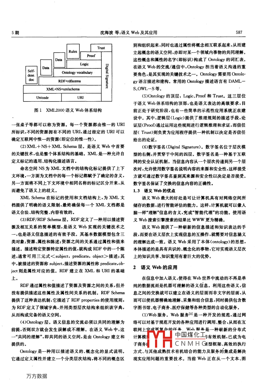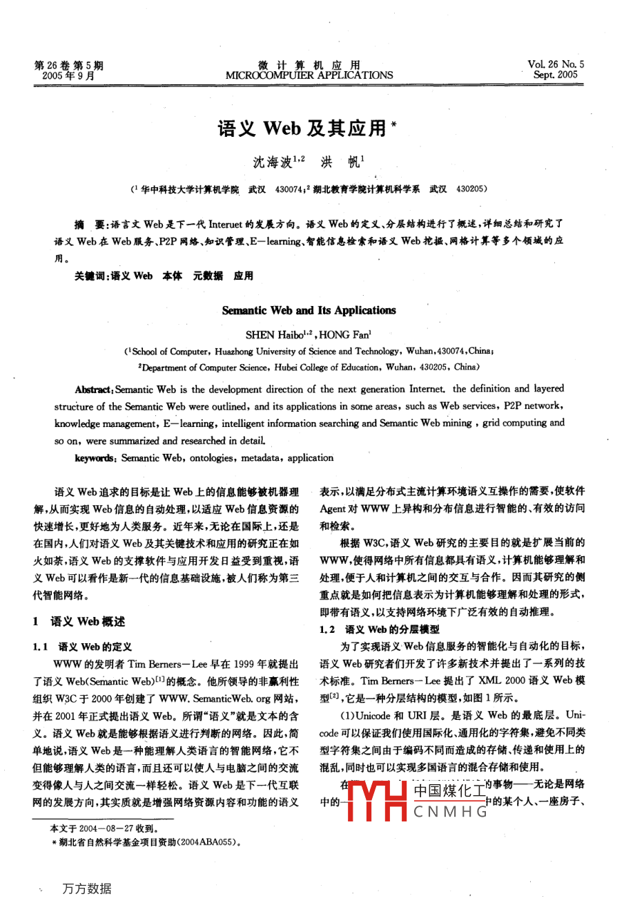 第26卷第5期VoL 26 No 52005年9月MICROCOMPUIER APPLICATIONSpt2005語(yǔ)義Web及其應(yīng)用*沈海波12洪帆1(1華中科技大學(xué)計(jì)算機(jī)學(xué)院武漢430074;2湖北教育學(xué)院計(jì)算機(jī)科學(xué)系武漢430205)摘要:語(yǔ)言文Web是下一代 Interuet的發(fā)展方向。語(yǔ)義Web的定義、分層結(jié)構(gòu)進(jìn)行了概述,詳細(xì)總結(jié)和研究了語(yǔ)義Web在Web服務(wù)、P2P網(wǎng)絡(luò)、知識(shí)管理、E- learning、智能信息檢索和語(yǔ)義Web挖摑、網(wǎng)格計(jì)算等多個(gè)領(lǐng)域的應(yīng)關(guān)鍵詞:語(yǔ)義Web本體元數(shù)據(jù)應(yīng)用Semantic Web and Its ApplicationsSHEN Haibo.2, HONG Fan'( School of Computer, Huazhong University of Science and Technology, Wuhan, 430074, China2Department of Computer Science, Hubei College of Education, Wuhan, 430205, China)Abstract, Semantic Web is the development direction of the next generation Internet. the definition and layeredstructure of the Semantic Web were outlined, and its applications in some areas, such as Web services, P2P network,knowledge management, E-learning, intelligent information searching and Semantic Web mining, grid computing andso on, were summarized and researched in detaiL語(yǔ)義web追求的目標(biāo)是讓W(xué)eb上的信息能夠被機(jī)器理表示,以滿足分布式主流計(jì)算環(huán)境語(yǔ)義互操作的需要使軟件解,從而實(shí)現(xiàn)Web信息的自動(dòng)處理,以適應(yīng)Web信息資源的 Agent對(duì)www上異構(gòu)和分布信息進(jìn)行智能的有效的訪問(wèn)快速增長(zhǎng),更好地為人類服務(wù)。近年來(lái),無(wú)論在國(guó)際上,還是和檢索。在國(guó)內(nèi),人們對(duì)語(yǔ)義Web及其關(guān)鍵技術(shù)和應(yīng)用的研究正在如根據(jù)W3C,語(yǔ)義Web研究的主要目的就是擴(kuò)展當(dāng)前的火如茶語(yǔ)義Wb的支撐軟件與應(yīng)用開(kāi)發(fā)日益受到重視語(yǔ)Www使得網(wǎng)絡(luò)中所有信息都具有語(yǔ)義,計(jì)算機(jī)能夠理解和義Web可以看作是新一代的信息基礎(chǔ)設(shè)施被人們稱為第三處理便于人和計(jì)算機(jī)之間的交互與合作。因而其研究的側(cè)代智能網(wǎng)絡(luò)重點(diǎn)就是如何把信息表示為計(jì)算機(jī)能夠理解和處理的形式,即帶有語(yǔ)義,以支持網(wǎng)絡(luò)環(huán)境下廣泛有效的自動(dòng)推理1語(yǔ)義Web概述1.2語(yǔ)義web的分層模型1.1語(yǔ)義web的定義為了實(shí)現(xiàn)語(yǔ)義Web信息服務(wù)的智能化與自動(dòng)化的目標(biāo),www的發(fā)明者 Tim berners-Le早在1999年就提出語(yǔ)義web研究者們開(kāi)發(fā)了許多新技術(shù)并提出了一系列的技了語(yǔ)義Web( Semantic Web)的概念。他所領(lǐng)導(dǎo)的非贏利性術(shù)標(biāo)準(zhǔn)。 Tim Berners-Le提出了XML2000語(yǔ)義Web模組織WC于2000年創(chuàng)建了www.SemanticWeb.org網(wǎng)站,型,它是一種分層結(jié)構(gòu)的模型如圖1所示并在2001年正式提出語(yǔ)義Web。所謂“語(yǔ)義”就是文本的含(1) Unicode和URI層。是語(yǔ)義Web的最底層。Uni義。語(yǔ)義Wb就是能夠根據(jù)語(yǔ)義進(jìn)行判斷的網(wǎng)絡(luò)。因此簡(jiǎn)code可以保證我們使用國(guó)際化、通用化的字符集避免不同類單地說(shuō)語(yǔ)義Web是一種能理解人類語(yǔ)言的智能網(wǎng)絡(luò),它不型字符集之間由于編碼不同而造成的存儲(chǔ)、傳遞和使用上的但能夠理解人類的語(yǔ)言,而且還可以使人與電腦之間的交流混亂,同時(shí)也可以實(shí)現(xiàn)多國(guó)語(yǔ)言的混合存儲(chǔ)和使用。變得像人與人之間交流一樣輕松。語(yǔ)義Web是下一代互聯(lián)中國(guó)煤化工的事物—無(wú)論是網(wǎng)絡(luò)網(wǎng)的發(fā)展方向,其實(shí)質(zhì)就是增強(qiáng)網(wǎng)絡(luò)資源內(nèi)容和功能的語(yǔ)義中的中的某個(gè)人、一座房子、CNMHG本文于2004-08-27收到湖北省自然科學(xué)基金項(xiàng)目資助(2004ABA055)5期沈海波等:語(yǔ)義Web及其應(yīng)用別和組織起來(lái)同時(shí)也通過(guò)屬性將概念相互聯(lián)系起來(lái)從而建Rules立起概念的語(yǔ)義空間,亦即對(duì)某一個(gè)領(lǐng)域內(nèi)事物的共同理解。ProofDa這些概念和屬性的名字(即標(biāo)識(shí)構(gòu)成了 Ontology的詞匯表在語(yǔ)義Web的交流/通信中, Ontology擔(dān)當(dāng)著語(yǔ)義溝通的重Ontology vocabulary要角色,是其實(shí)現(xiàn)的關(guān)鍵技術(shù)之一。 Ontology需要用 AntolRDF+rdfscemagy語(yǔ)言描述和建構(gòu)。常用的 Ontology描述語(yǔ)言有DAMLXML+NS+xmlschemaS、OWL-S等。Unicode(5) Ontology的頂層: Logic、 Proof和 Trust,這三層位于語(yǔ)義Web體系結(jié)構(gòu)的頂部,也是語(yǔ)義表達(dá)的高級(jí)要求,目圖1XML2000語(yǔ)義Web體系結(jié)構(gòu)前正處于研究階段,也有一些簡(jiǎn)單的示范性應(yīng)用系統(tǒng)正在建設(shè)中。其中,邏輯層( Logic)提供了推理規(guī)則的描述手段,論一張桌子等都可以稱為資源。每一個(gè)資源都由惟一的URI證層(Poo通過(guò)運(yùn)用這些規(guī)則進(jìn)行邏輯推理和求證,而信任所標(biāo)識(shí)不同的資源擁有不同的URI,通過(guò)指定的URI可以層(Trus則負(fù)責(zé)為應(yīng)用程序提供一種機(jī)制以決定是否信任確定互聯(lián)網(wǎng)中惟一的資源(即定位的惟一性)。給出的論證2)XML+NS+ XML Schema層。是語(yǔ)義Web中首要(6)數(shù)字簽名( Digital Signature)。數(shù)字簽名位于層