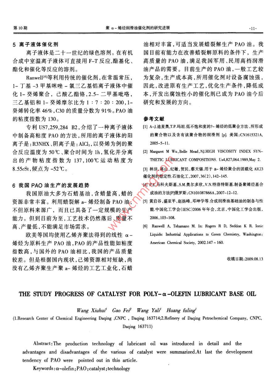 化工中間體.8●Chemical Intermediate2009年第10期綜述專論聚x-烯烴潤滑油催化劑的研究進(jìn)展王秀繪高飛2王亞麗1黃付玲 1(1.中國石油大慶化工研究中心,大慶163714;2.中國石油大慶石化公司煉油廠163711)摘要:詳細(xì)介紹了國內(nèi)外聚a-烯烴潤滑油的生產(chǎn)技術(shù)??偨Y(jié)了各種催化劑的優(yōu)缺點(diǎn),并指出聚a-烯烴潤滑油基礎(chǔ)油的發(fā)展前景。關(guān)鍵詞:a-烯烴;PAO;催化劑;生產(chǎn)技術(shù)中團(tuán)分類號:E624.99文獻(xiàn)標(biāo)識碼:A文章編號:1672-8114(2009)10-0008 041茂金屬催化劑聚a-烯烴潤滑油(PAO)可根據(jù)不同要求茂金屬催化劑,特別是茂鋯催化劑具有極高制備成各種粘度級別。一般來說100粘度小于的催化活性,但是對于均相茂金屬催化劑,助催化或等于10mm/s的稱為低粘度油,大于或等于劑用量極大,如鋁、鋯比大于2000,沒有實(shí)際工作40mm2/s的稱為高粘度油,其間的可稱為中粘度價(jià)值。通常都要求將茂金屬催化劑進(jìn)行負(fù)載化。茂油。70年代以來,各國對聚a-烯烴聚合催化劑的金屬催化劑為單- -活性中心,聚合產(chǎn)品的分子質(zhì)研究十分重視。選用不同類型的催化劑,對聚合物量分布窄。同時(shí),具有優(yōu)異的共聚合能力,能催化的收率、聚合度控制、分子量分布及油品的性能有聚合一些極性單體,其產(chǎn)品對于以極性物質(zhì)為主明顯的影響。對于低粘度潤滑油的生產(chǎn)以路易斯的大部分潤滑油添加劑,具有很好的相容性。酸為催化劑,以水、醇或弱酸作為助催化劑;而高國際殼牌研究有限公司專利CN1549852A公粘度潤滑油的生產(chǎn)用Zigler- -Natta催化劑。開了,在單中心催化劑存在下制備a-癸烯低聚其中使用面最廣的是低粘度油,幾乎占整個(gè)物。所用的單中心催化劑是包含二氯二(環(huán)戍二烯PAO用量的90%左右。它可以用于汽車發(fā)動機(jī)基)鋯的茂金屬催化劑,克服了以往三氟化硼催化油、ATF液、液壓油、軍事工業(yè)用油、齒輪油、近海作用在低聚反應(yīng)過程中引起過量的骨架支化,所鉆井液、光纖填充油等。獲得的PAO基本上不含有由于異構(gòu)化而產(chǎn)生的制備不同粘度級別的PAO的原料基本相,叔氫, 故該P(yáng)AO具有改善的生物降解性、改善的同,一般來說,多采用乙烯齊聚的純烯烴,純度越抗氧化性和相對更高的粘度指數(shù)的特性,具有諸高反應(yīng)的收率就越高,產(chǎn)品性能和a-烯烴的碳如作為潤滑劑組分的許多有用的應(yīng)用。數(shù)及碳數(shù)分布有關(guān),a-癸烯是綜合性能最好的尤尼羅亞爾化學(xué)公司"的茂金屬催化劑通式制備低粘度合成油的原料,例如專利US3,為 (CplRm1)R3(Cp2Rp2)MXq,其中配體Cp1Rm1中769,363、US3,780,128等。的Cp1和Cp2Rp2中的Cp2是相同或不相同的環(huán)目前國內(nèi)外用于a-癸烯齊聚制備潤滑油戊二烯基環(huán),R1和R2彼此獨(dú)立地是氫或含有至基礎(chǔ)油的催化劑體系主要包括茂金屬催化劑、鉻多約20個(gè)碳原子的烴基、鹵代烴基、雜烴基、烴基金屬催化劑、路易斯酸催化劑、Z-N催化劑和離子有機(jī)準(zhǔn)金屬或鹵代烴基取代的有機(jī)準(zhǔn)金屬基團(tuán),液體催化劑。m和p都是0~5,在與其相連的環(huán)戊二烯基環(huán)的相鄰碳原子上的兩個(gè)R1和/或R2取代基可以連作者筒介:王秀繪,碩士,工程師,畢業(yè)于遼寧石油化工大學(xué),現(xiàn)接在一起形成含有4至約20個(gè)碳原子的環(huán),R3從事烯烴聚合研究。是橋連Cp1和Cp2的橋連基團(tuán),M是價(jià)態(tài)為3至●通訊聯(lián)系人6的過渡金屬,所有的X是非環(huán)戊二烯基配體,q第10期聚a-烯烴潤滑油催化劑的研究進(jìn)展.9.等于M的價(jià)態(tài)減去2,助催化劑為鋁氧烷。催化劑a-烯烴油在100C的粘度2-100mm2/s,粘度指數(shù)為0.007克Ph2C (nBuCp-9 - FLu)ZrCl2,8mL10%重為大于130, 傾點(diǎn)低于-45C。但是要求癸烯原料量的MAO的甲苯溶液,在溫度為1209,壓力為中線形烯烴不低于95%,水含量低于100μg/g,過200Psig下反應(yīng)30分鐘,得到的潤滑油分子量為氧化物含量低于5μgg。整個(gè)反應(yīng)的路程如圖2。3672, 100C的運(yùn)動粘度57,粘度指數(shù)是187,碘值是2.25。a嫌給茂金屬催化劑的最大優(yōu)點(diǎn)就是得到的產(chǎn)品儲化劑性能優(yōu)良,但是存在催化劑制備條件苛刻,聚合試驗(yàn)操作困難,使用MAO助催化劑,成本較高的缺點(diǎn)。臨|如離|2鉻金屬催化劑90年代初,美孚石油公司為改進(jìn)潤滑油的使用性能,用聚a-烯烴油代替礦物油,開發(fā)出了HVI-PA0工藝21。以C6- C20a-烯烴為原料和氧化硅為擔(dān)體的低價(jià)還原態(tài)氧化鉻為催化劑,在聚合圄2反應(yīng)的路程圖條件下生成高粘度指數(shù)潤滑油,用該工藝生產(chǎn)的此外,在制備聚a-烯烴油的方法中采用鉻聚a-烯烴,雙健在分子末端,支化率低于0.19,優(yōu)催化劑的,例如:“烴潤滑油和燃油傾點(diǎn)下降劑及于路易斯酸催化過程。鉻金屬催化劑催化過程與粘度指數(shù)改進(jìn)劑"(日本專利公開號JP09 ,508;路易斯酸催化劑的催化過程比較見下圖。151)這些方法共同的不足是使用得催化劑價(jià)格昂貴,并且聚合反應(yīng)的活性不高,需要引人乙烯。此高粘度指數(shù)PAO制備過程PAO制備過程外,鉻金屬催化劑對癸烯原料性能要求苛刻,且這(1突殿)(1嬰酸)些方法所得到的聚合物的重均分子量不穩(wěn)定,使其應(yīng)用受到限制。Cr/9O,BF,/AICL3路易斯酸催化
