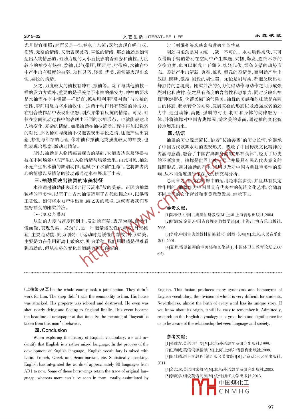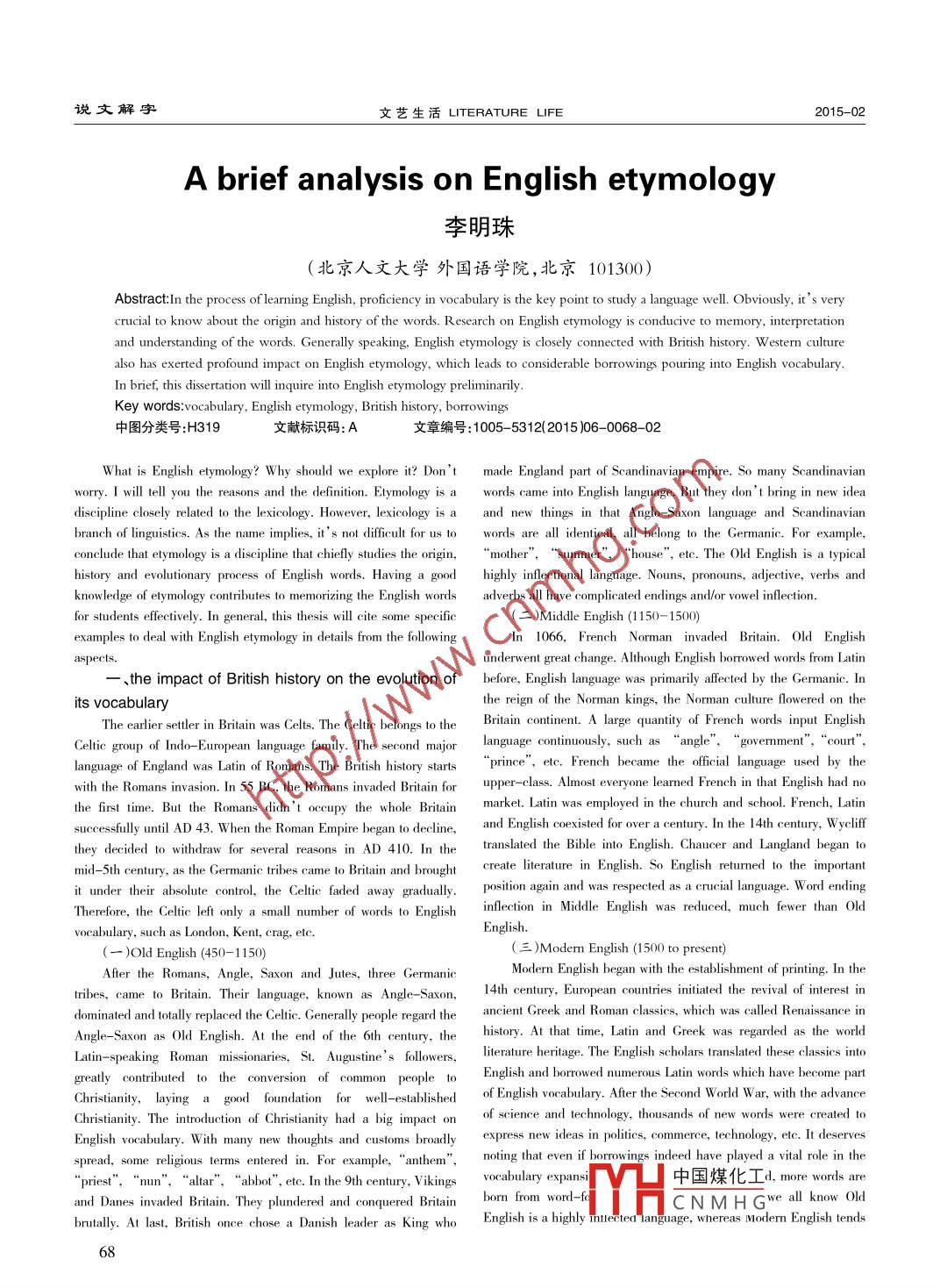說文解字文藝生活LITERATURE LIFE2015-02A brief analysis on English etymology李明珠(北京人文大學(xué)外國(guó)語(yǔ)學(xué)院,北京101300)Abstract:In the process of learning English, proficiency in vocabulary is the key point to study a language well. Obviously, it' s verycrucial to know about the origin and history of the words. Research on English etymology is conducive to memory, interpretationand understanding of the words. Generally speaking, English etymology is closely connected with British history. W estern culturealso has exerted profound impact on English etymology, which leads to considerable borrowings pouring into English vocabulary.In brief, this disertation will inquire into English etymology preliminarily.Key words:vocabulary, English etymology, British history, borrowings中圖分類號(hào):H319文獻(xiàn)標(biāo)識(shí)碼:A文章編號(hào):1005- 5312(2015 )06- -0068 -02What is English etymology? Why should we explore it? Don' t made England part of Scandinavian empire. So many Scandinavianworry. I will tell you the reasons and the definition. Etymology is a words came into English language. But they don' t bring in new ideadiscipline closely related to the lexicology. However, lexicology is a and new things in that Anglo- Saxon language and Scandinavianbranch of linguistics. As the name implies, it' s not difficult for us to words are all identical, all belong to the Germanic. For example,conclude that etymology is a discipline that chielly studies the origin,‘mother ’,“ summer',“house' ', etc. The Old English is a typicalknowledge of etymology contributes to memorizing the English words adverbs all have complicated endings and/or vowel inflection.for students effectively. In general, this thesis will cite some specifie(二)Middle English (1150- 1500)examples to deal with English etymology in details from the followingIn 1066, French Norman invaded Britain. Old Englishaspects.underwent great change. Although English borrowed words from Latin-、the impact of British history on the evolution of before, English language was primarily afected by the Germanic. Inits vocabularythe reign of the Norman kings, the Norman culture flowered on theThe earlier sttler in Britain was Celts. The Celtic belongs to theBritain continent. A large quantity of French words input EnglishCeltic group of Indo-Eurpean language family. The second major language continuously,language of England was Latin of Romans. The Brtish history starts prince, etc. French became the oficial language used by thewith the Romans invasion. In 55 BC, the Romans invaded Britain forupper- -class. Almost everyone learned French in that English had nothe frst time. But the Romans didn't oceupy the whole Britain market. Latin was employed in the church and scool. French, Latinsesauly unil AD 43. When the Roman Empire began to dedine, and English coexisted for over a century. In the 14h cntury, Wyelifthey decided to withdraw for several reasons in AD 410. In thetranslated the Bible into English. Chaucer and Langland began tomid-5th century, as the Germanic tribes came to Britain and brought create lierature in English. So Englsh returned to the importatit under their absolute control, the Celie faded away gradually position agin and was respected as a crucial language. Word endingTherefore, the Celtic left only a small number of words to Englishinflection in Middle English was reduced, much fewer than OldEnglish.vocabulary, such as London, Kent, crag, etc.(一)Old English (450-1150)(三)Modern Engish (1500 to present)Afer the Romans, Angle, Saxon and Jutes, three GermanicModern English began with the establishment of printing. In thetribes, came to Britain. Their language, known as Angle- Saxon,14th century, European countries initiated the revival of interest indominated and totally replaced the Celtic. Generally people regard theancient Greek and Roman classics, which was called Renaissance inAngle- -Saxon as Old English. At the end of the 6th century, thehistory. At that time, Latin and Greek was regarded as the worldLatin-speaking Roman missionaries, St. Augustine' s followers,literature heritage. The English scholars translated these classics intogrealy contributed to the convesion of common peple to English and brrowed numerous Latin words which have become partChristianity,laying a good foundation for well-establishedof English vocabulary. After the Second World W ar, with the advanceChristianity. The introduction of Christianity had a big impact onof science and technology, thousands of new words were created toEnglish vocabulary. With many new thoughts and customs broadly express new ideas in politics. conmerce, technology, eltc. It deservesspread, some rligous terms entered in. For example, “amthem”, noing that even if borowings indeed have played a vital role in the“priest”,“nun’ ,‘altar' ,“ abbot”, etc. In the 9th century, Vikings中國(guó)煤化工d, more words areand Danes invaded Britain. They plundered and conquered Britainborn from word: -f(YHCNMH Gwe all know Oldbrutally. At last, British once chose a Danish leader as King who English is a highly Ttteted language, whereas Modem English tends682015- -02.文藝生活LITERATURE LIFE說文解字to become the analytic language with words endings mostly lost. They“kulak”is from“kyrak”(Russian)are quite different from each other.4.Semantic-loans二.the influence of foreign words on the Englishvocabularying instead of the form. Their form is native. In other words, the exist-(一) What is the foreign wordsing words of English are endowed with new meanings. Take“ dream”"By origin, English words can be divided into natve words and for example. Its original meaning was‘hppnes" and' 'music ,foreign words. Native words are originated from the Germanic tribes whereas its modem meaning was borowed from Old Norse. Besides,including Angle, Saxon and Jutes, also known as Angle- Saxon lan-“b