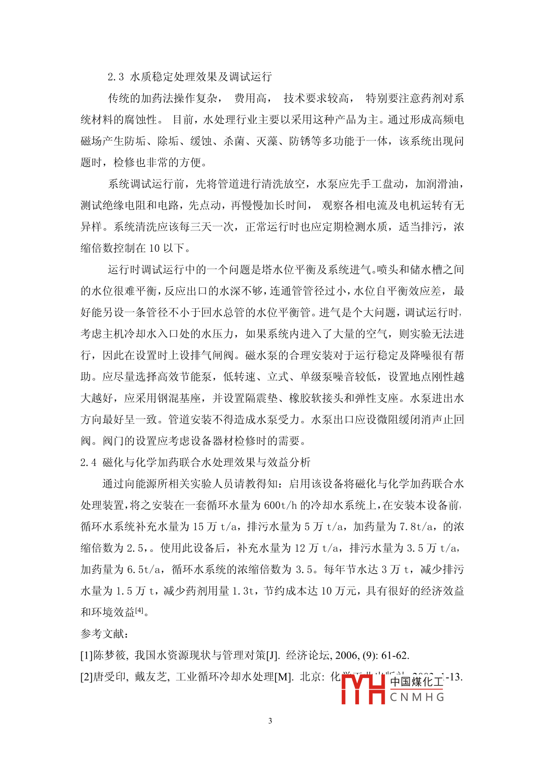 循環(huán)水冷卻系統(tǒng)的設(shè)計(jì)與運(yùn)行楊賽賽(遼寧省葫蘆島市錦西工業(yè)學(xué)校,遼寧葫蘆島125001)摘要:隨著社會(huì)經(jīng)濟(jì)的發(fā)展,我國工業(yè)領(lǐng)域中,如水處理行業(yè),其中循環(huán)水冷卻系統(tǒng)成為不可缺少的部分。筆者經(jīng)過對(duì)遼寧省能源所工業(yè)循環(huán)冷卻水系統(tǒng)的考察,淺談循環(huán)水冷卻系統(tǒng)的設(shè)計(jì)與運(yùn)行和調(diào)試運(yùn)行中的體會(huì)關(guān)鍵詞:循環(huán)水冷卻系統(tǒng);工程實(shí)例中圖分類號(hào):m1503.91文獻(xiàn)標(biāo)識(shí)碼:A文章編號(hào)1循環(huán)冷卻水系統(tǒng)冷卻水換熱并經(jīng)降溫,再循環(huán)使用的這樣的供水模式,我們把它叫做冷卻水系統(tǒng)[-31.1直流冷卻水系統(tǒng)該系統(tǒng)主要由以下設(shè)備組成:水泵和管道和冷卻設(shè)備。冷水流過需要降溫的生產(chǎn)設(shè)備(常稱換熱設(shè)備,如換熱器、冷凝器、反應(yīng)器)后,溫度上升水經(jīng)過換熱器而后又被排放出來,這樣的系統(tǒng)需要很大的水量。在水中的各種離子含量基本上維持平衡,雖然該系統(tǒng)所用的設(shè)備少,操作也很方便,但是所消耗的水量太大,與當(dāng)前提倡的節(jié)水節(jié)能、以及我國的水資源現(xiàn)狀及其不相符合。1.2循環(huán)冷卻水系統(tǒng)上面簡單介紹了直流冷卻水系統(tǒng),其中冷卻設(shè)備有封閉式和敞開式之分,因而循環(huán)冷卻水系統(tǒng)也存在這兩種系統(tǒng)模式。1)封閉式循環(huán)冷卻水系統(tǒng)該系統(tǒng)用封閉式冷卻設(shè)備,循環(huán)水在管中流動(dòng),管外通常用風(fēng)散熱。與直流冷卻水所不同的是用過后的水可以再次被使用。該系統(tǒng)需要使用硬度比較低的水質(zhì),且冷卻水是處在設(shè)備之內(nèi)的循環(huán),不與空氣接觸,因此,該系統(tǒng)無論在消耗水量還是系統(tǒng)的腐蝕結(jié)垢現(xiàn)象,均發(fā)生較少(2)敞開式循環(huán)冷卻水系統(tǒng)在該系統(tǒng)中,循環(huán)使用的水,溫度會(huì)升高,而后通過冷卻塔進(jìn)行水的冷卻,在此過程中,冷卻水要不斷與暴漏的空氣進(jìn)行接觸,水流速度的變化,水的蒸發(fā)和空氣中雜物的引入,各種無機(jī)離子和有機(jī)物質(zhì)的濃縮,這些會(huì)加重冷卻水系統(tǒng)的腐蝕、結(jié)垢、微生物故障,威脅和影響生產(chǎn)設(shè)備和裝置長周期的安全運(yùn)行。為了防止發(fā)生這些故障,可以在循環(huán)冷卻水中投加各種水TH中國煤化工水質(zhì)CNMHG保持和穩(wěn)定在一個(gè)良好的水平上。此循環(huán)冷卻水系統(tǒng)是現(xiàn)在應(yīng)用范圍最廣、類型最多的一種冷卻系統(tǒng)。該系統(tǒng)水是在高濃縮下運(yùn)行,實(shí)現(xiàn)了冷卻水的高度重復(fù)利用。2.設(shè)計(jì)案例及運(yùn)行2.1水處理設(shè)備簡介遼寧省能源研究所是一家大型的水處理機(jī)構(gòu),其內(nèi)設(shè)有大型的工業(yè)循環(huán)冷卻水系統(tǒng),該裝置主要元件如圖一所示°七6.1.儲(chǔ)水槽2.閥門3.循環(huán)磁力泵4.玻璃轉(zhuǎn)子流量計(jì)5.磁水器6.電加熱元件7.模擬換熱器8.噴頭9.交流接觸器及電子溫度調(diào)節(jié)儀圖1磁化水實(shí)驗(yàn)裝置此裝置是由儲(chǔ)水槽、循環(huán)磁力泵,玻璃轉(zhuǎn)子流量計(jì),磁水器,電加熱元件,模擬換熱器、交流接觸器及電子溫度調(diào)節(jié)儀等組成。設(shè)備在管材上的選擇,常采用⊕DPE管或玻璃纖維增強(qiáng)熱固性塑料管,這種材料強(qiáng)度髙、重量輕、耐腐蝕、內(nèi)面光滑比阻小,在安裝及使用性能方面都具有相當(dāng)優(yōu)越性內(nèi)部裝有一個(gè)小型的磁化水處理器,該設(shè)備可以將普通水轉(zhuǎn)化為磁化水,其阻垢能力比普通水好,該循環(huán)水冷卻系統(tǒng)省卻了冷水池,補(bǔ)水直接進(jìn)入儲(chǔ)水池,使水質(zhì)不易污染,且水量損失比較少。系統(tǒng)最低處設(shè)置放空排污閥,便于排放污水。水泵前后管道上均設(shè)置了壓力表。為保護(hù)主機(jī),其進(jìn)水管上設(shè)置了水流指示器。該裝置智能化控制,操作方便,調(diào)節(jié)簡單,2.2系統(tǒng)控制本設(shè)備的開機(jī)的順序是:電源開關(guān)、循環(huán)磁力泵、玻璃轉(zhuǎn)子流量計(jì)、電加熱元件、模擬換熱器及電子溫度調(diào)節(jié)儀溫度、磁水器,停機(jī)的順序則相反。根據(jù)外中國煤化工界環(huán)境氣候設(shè)定調(diào)節(jié)水泵功率,節(jié)能效果更好。CNMHG2.3水質(zhì)穩(wěn)定處理效果及調(diào)試運(yùn)行傳統(tǒng)的加藥法操作復(fù)雜,費(fèi)用高,技術(shù)要求較高,特別要注意藥劑對(duì)系統(tǒng)材料的腐蝕性。目前,水處理行業(yè)主要以采用這種產(chǎn)品為主。通過形成高頻電磁場產(chǎn)生防垢、除垢、緩蝕、殺菌、滅藻、防銹等多功能于一體,該系統(tǒng)岀現(xiàn)問題時(shí),檢修也非常的方便。系統(tǒng)調(diào)試運(yùn)行前,先將管道進(jìn)行清洗放空,水泵應(yīng)先手工盤動(dòng),加潤滑油,測試絕緣電阻和電路,先點(diǎn)動(dòng),再慢慢加長時(shí)間,觀察各相電流及電機(jī)運(yùn)轉(zhuǎn)有無異樣。系統(tǒng)清洗應(yīng)該每三天一次,正常運(yùn)行時(shí)也應(yīng)定期檢測水質(zhì),適當(dāng)排污,濃縮倍數(shù)控制在10以下。運(yùn)行時(shí