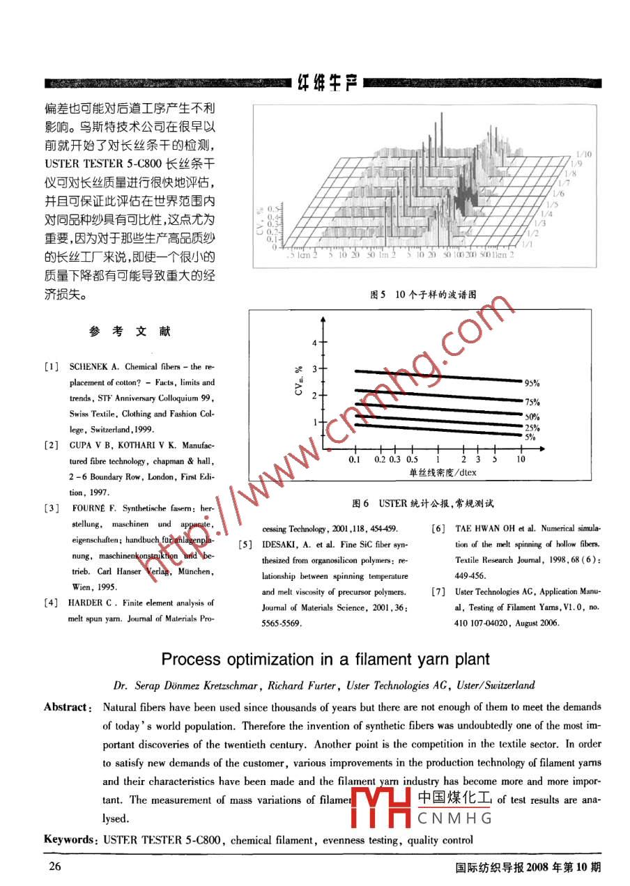 纖維生產長絲的工藝優(yōu)化S. D. Kretzschmar, R. Furter烏斯特技術公司(瑞士)摘要:天然纖維的應用雖已有數(shù)千年歷史 ,但仍無法滿足當今世界人口的需求,所以2熔體紡絲工序中常出合成纖維的發(fā)明無疑是20世紀最重要的發(fā)明之一。另一個重點是紡織行業(yè)現(xiàn)的紗疵源的競爭,為了不斷滿足客戶的新要求,長絲的生產工藝和其特性得到了多方面的改進,因而長絲工業(yè)也變得越來越重要。主要介紹了對長絲質量變化進行長絲紗的紡絲方法有多種,的測試和測試結果的分析。表1給出了一些紡絲方法。關鍵詞:烏斯特TESTER 5-C800,化纖長絲,條干均勻度檢測,質量控制本文將重點介紹熔體紡絲工因為紡絲速度非常高。這種質量藝過程,熔體紡絲被認為是最簡單的紡絲方法,因為此方法不需要使1引言變異會給后道工序生產帶來困難,用會產生問題的溶波。例如拉伸加捻工序、變形工序和染許多專家在著力于研究熔體天然纖維的應用雖然有數(shù)千色工序。這些質量變異導致了紗紡絲,不僅是在理論上,而且也做年的歷史,但仍無法滿足當今世界線質量的下降,因此全面質量檢測了大量的實驗[26],合成纖維的紡人口的需求”,所以合成纖維的發(fā)成為質量控制的必需。絲對各工序的參數(shù)變化影響非常明無疑是20世紀最重要的發(fā)明之鳥斯特技術公司從1955年開敏感,例如,紡絲過程中的大分子始就著力于生產長絲紗的檢測儀聚合物的熔化溫度以及冷卻空氣另一個重點是紡織行業(yè)的競器,2005年USTERO TESTER 5-的溫度[5] ,特別是紡絲箱體的環(huán)境爭,為了不斷滿足客戶的新要求,C800 長絲條干儀進入市場,長絲影響長絲的成型4。長絲的生產工藝和特性得到了多紗的質量參數(shù)可以通過此儀器很如圖1所示,熔體紡絲主要有方面的改進,長絲工業(yè)也變得越來快得到評估,并且測試結果可以用3個過程:給料階段、紡絲階段和越重要。來判斷后道工序的生產。.卷繞階段”。本文主要介紹了對長絲的質表1長絲紗的不同紡絲工藝方法(2]量變化進行的測試和測試結果的紡絲方法&分析。對于短纖紗來說,紗線不勻熔體紡.聚酰胺66聚酰胺6聚酯聚丙烯聚乙烯是不可避免的,主要因素為天然纖溶液紡維的變異、紡紗方法以及纖維在紗干法紡絲二乙酸纖維素三乙酸纖維素聚氨脂~氨蛇聚氣乙烯氯化聚氮乙烯中的排列。但對于長絲紗來說,異聚丙烯酸狀粒子、紡絲過程的不規(guī)則、冷卻濕法紡絲:直接溶劑聚丙烯酸變性緊丙烯腈.聚氬酯-氨鉈 聚乙酶芳蛇過程和卷繞過程的操作、以及機器造絲的缺陷和牽伸問題都會導致長絲濕法紡絲:行生法粘膠人中國煤化工質量不勻,甚至是上千米的不勻,MYHCNMHG國際紡織導報2008年第10期纖維生產二在給料階段,原材料可儲存,序的紗疵定熔化然后再加工,熔體紡絲的原材位由圖1加加料斗s]料可以是大分子顆粒,也可以是聚以說明”。合體切片,首先干燥,然后在擠壓如圖1機里熔融。在一些現(xiàn)代化的工廠,所示,圖中圓踴斗,長片段不勻或是聚酯和聚酰胺是在連續(xù)聚合裝置圈和三角表擠壓s長波長的紗疵范圍中生產的,在此裝置中熔體直接從示的機器部給料階段最終聚合器輸送到熔體紡絲裝置。件產生 的紗. 紡絲泵oo聚丙烯不同于聚酯和聚酰胺,因為疵,可以通過冷卻so}其聚合后生成固體產物,所以聚合不勻率曲線與紡絲過程分離。圖、波譜圖、紡絲階段在紡絲階段,每一次從擠壓機條干不勻值、牽伸準備. 矩片段不勻或是短波長的紗疵范圍傳輸?shù)郊徑z泵的添加劑和過濾后長度變異曲絲餅的熔體量相同,并同時被等量擠壓線圖和相對通過噴絲口(圖1),通過噴絲板之支數(shù)來查找。后,在距離噴絲口下方5 ~ 20 cm的..圖1中三角0o卷繞紡絲甬道處,由熔體紡成的長絲經標識的機器空氣冷卻成型,如果是用多噴口的部件產生的圖1熔體紡絲工序 中的常發(fā)紗疵定位7]噴絲頭,可以紡成未拉伸束絲或是紗疵,還可以部分拉伸束絲”。測量一個滿在卷繞階段,長絲通過紡絲甬筒的絲,通過不勻率曲線圖、波譜3長絲的條干測試和長道后,通過上油裝置卷繞到預備羅圖、長度變異曲線圖和相對支數(shù)來拉上,束絲在通過上油裝置之后卷查找”。絲的USTER統(tǒng)計公報繞成原絲包裝,并可以運輸?shù)较碌涝跍y試長度內,與名義值最大正如之前所述,長絲的質量指工序的機器”。的質量變異也可以測試出的。標可以通過USTER TESTER 5-以聚酰胺的生產為例,紡絲工C800長絲條干儀檢測,既有圖表分析的測試結果,也有數(shù)值分析的10/1測試結果。3.1不勻率 曲線圖不勻率曲線圖是條干測試重-10要的一部分,可提供長絲紡絲工序0 1002003004005006007008009001000中的很多細節(jié)信息,圖2是兩種不聚酯纖維(70 dtex/36)[長度/m0-同長絲的不勻辜曲線圖,下圖的長5手絲質量變異比,上圖的長絲的高得多。Wwwwwww圖2中上圖的紗條干不勻是2001 000CVm =1. 15%,下圖的紗條干不勻聚酯纖維(75 dtex/1281) 長度/m旦m-?K9%。下圖中紗的條圍2長絲紗的不勻率 曲線圖中國煤化工原因是紡絲甬道中MYHCNMHG國際紡織導報2008年第10期.2纖維生產表2長絲紗測試的數(shù)值結果NU%CVm .CVmRel.mMinmMax1m3m10 m50 mCnt士%1/11.311. 661.261.201.010. 260.2-3.53.8-2.03. I1/2.1.121.431.050.970.750.26- 3.33.4-1.81.51/31. 161.491.091.030.840.240.0-3.13.62. I1/41. 101.420.990.930.770.28-3.23.3-1.91.91/51.131.451.040.980.830.33-3.32.21/61.151.501.03.0.960.22-1.8 .2.31/71.120.82.0.35