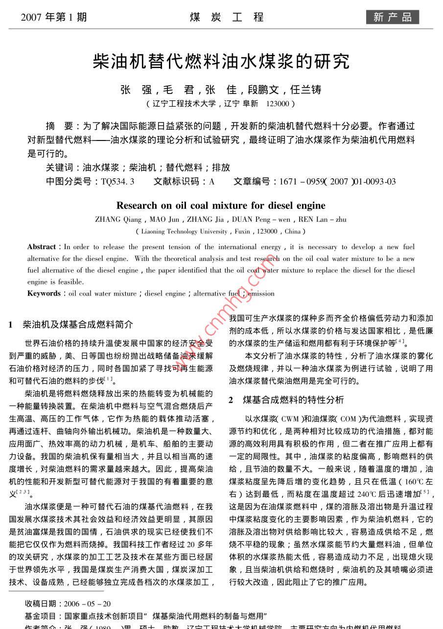 2007年第1期煤炭工程新產(chǎn)品柴油機(jī)替代燃料油水煤漿的研究張強(qiáng),毛君,張佳,段鵬文,任蘭鑄(遼寧工程技術(shù)大學(xué),遼寧阜新123000摘要∶為了解決國(guó)際能源日益緊張的問(wèn)題,開(kāi)發(fā)新的柴油機(jī)替代燃料十分必要。作者通過(guò)對(duì)新型替代燃料——油水煤漿的理論分析和試驗(yàn)硏究,最終證明了油水煤漿作為柴油杋代用燃料是可行的。關(guān)鍵詞:油水煤漿;柴油機(jī);替代燃料;排放中圖分類號(hào):TQ534.3文獻(xiàn)標(biāo)識(shí)碼:A文章編號(hào):1671-0959(2007)01-009303Research on oil coal mixture for diesel engineZHANG Qiang, MAO Jun, ZHANG Jia, DUAN Peng-wen, REN Lan-zhuC Liaoning Technology University Fuxin, 123000, ChinaAbstract: In order to release the present tension of the international energyecessary to develop a new fuellternative for the diesel engine. With the theoretical analysis and test research ond coal water mixture to be a newfuel alternative of the diesel engine, the paper identified that the oil coal water mixture to replace the diesel for the dieselKeywords: oil coal water mixture diesel engine ; alternative fuel emission1柴油機(jī)及煤基合成燃料簡(jiǎn)介我國(guó)可生產(chǎn)水煤漿的煤種多而齊全價(jià)格偏低勞動(dòng)力和添加劑的成本低,所以水煤漿的價(jià)格與發(fā)達(dá)國(guó)家相比,是低廉世界石油價(jià)格的持續(xù)升溫使發(fā)展中國(guó)家的經(jīng)濟(jì)安全受的水煤漿的生產(chǎn)儲(chǔ)運(yùn)和燃用都有利于環(huán)境保護(hù)等。到嚴(yán)重的威脅,美、日等國(guó)也紛紛拋出戰(zhàn)略儲(chǔ)備油來(lái)緩解本文分析了油水煤漿的特性,分析了油水煤漿的霧化石油價(jià)格對(duì)經(jīng)濟(jì)的壓力,同時(shí)各國(guó)加緊了尋找可再生能源及燃燒規(guī)律,并以一種油水煤漿為例進(jìn)行試驗(yàn),說(shuō)明了用和可替代石油的燃料的步伐油水煤漿替代柴油燃用是完全可行的。柴油機(jī)是將燃料燃燒釋放岀來(lái)的熱能轉(zhuǎn)變?yōu)闄C(jī)械能的一種能量轉(zhuǎn)換裝置。在柴油機(jī)中燃料與空氣混合燃燒后產(chǎn)2煤基合成燃料的特性分析生高溫、高壓的工作氣體,它作為熱能的載體推動(dòng)活塞以水煤漿(CwM)和油煤漿(COM)為代油燃料,實(shí)現(xiàn)資再通過(guò)連杄、曲軸向外輸岀杋械功。柴油機(jī)是一種數(shù)量大、源節(jié)約和優(yōu)化,是兩種相對(duì)比較成功的代油措施,都對(duì)能應(yīng)用面廣、熱效率高的動(dòng)力機(jī)械,是機(jī)車、船舶的主要?jiǎng)釉吹母咝Ю镁哂蟹e極的作用,但二者在推廣應(yīng)用上都有力設(shè)備。我國(guó)的柴油機(jī)保有量相當(dāng)大,并且以相當(dāng)高的速—定的局限性。其中,油煤漿的粘度偏高,影響燃料的供度增長(zhǎng),對(duì)柴油燃料的需求量越來(lái)越大。因此,提髙柴油給,且節(jié)油旳數(shù)量不大。一般來(lái)說(shuō),隨著溫度的增加,油機(jī)的性能和開(kāi)發(fā)新型可替代能源對(duì)于我國(guó)的有著重要的意煤漿粘度呈先降后增的變化趨勢(shì),且只在低溫(160℃左文23。右)達(dá)到最低,而粘度在溫度超過(guò)240℃后迅速增加油水煤漿便是一種可替代石油的煤基代油燃料,在我這是因?yàn)樵谟兔簼{燃料中,煤的溶脹及溶岀物是升溫過(guò)程國(guó)發(fā)展水煤漿技術(shù)其社會(huì)效益和經(jīng)濟(jì)效益更明顯,其原因中煤漿粘度變化的主要影響因素,作為柴油機(jī)燃料,它的是貧油富煤是我國(guó)的國(guó)情,石油供求的現(xiàn)實(shí)已經(jīng)使我們不溶脹及溶出物對(duì)供給影響比較大,容易造成供給不足,燃能把它僅僅作為燃料而燒掉。我囯科技工作者經(jīng)過(guò)α0多年燒不平穩(wěn)的現(xiàn)象;雖然水煤漿能節(jié)約大量燃料油,但單位的攻關(guān)研究,水煤漿的加工工藝及技術(shù)在某些方面已經(jīng)居體積的水煤漿熱能太低,容易造成動(dòng)力不足,出現(xiàn)熄火現(xiàn)于世界領(lǐng)先水平,我國(guó)是煤炭生產(chǎn)消費(fèi)大國(guó),煤炭深加工象,且當(dāng)柴油機(jī)供給和燃燒時(shí),柴油機(jī)的及其噴嘴必須進(jìn)技術(shù)、設(shè)備成熟,已經(jīng)能夠獨(dú)立完成各檔次的水煤漿加工,行較大改造,因此阻止了它的推廣應(yīng)用。收稿日期:2006-05-20基金項(xiàng)目:國(guó)家重點(diǎn)技術(shù)創(chuàng)新項(xiàng)目”煤基柴油代用燃料的制備與燃用”「新產(chǎn)品煤炭工程2007年第1期為了克服以上弊病,在對(duì)二者的物理及燃燒特性進(jìn)行的密度,比熱增加,導(dǎo)熱系數(shù)增大了。對(duì)于三相混合燃料詳細(xì)地分析研究的基礎(chǔ)上,綜合二者的優(yōu)勢(shì)研制出了一種中水的加入,可以起到促進(jìn)燃燒的作用,但水在燃燒時(shí)不由油、煤粉和水組成合成液體燃料,即煤基合成燃料油。會(huì)產(chǎn)生額外的熱量,而且加入的水在汽化時(shí)要吸收熱量該燃料油是一種濃的漿體,它由煤粉分散于外相水中,再燃料的低位發(fā)熱量還要減去這部分水要吸收的熱量。所以,加入一定數(shù)量的油和少量的分散劑(即油包含水);或者由油水煤漿的低位熱值有所下降,但熱值仍能達(dá)到作為柴油煤粉分散于外相油中,再加入一定數(shù)量的油和少量的分散的燃料的要求,另外水的加入對(duì)于改善NOx和碳煙的排放敵即水包含油)其中,油的成分為重油,煤粉一般情況有