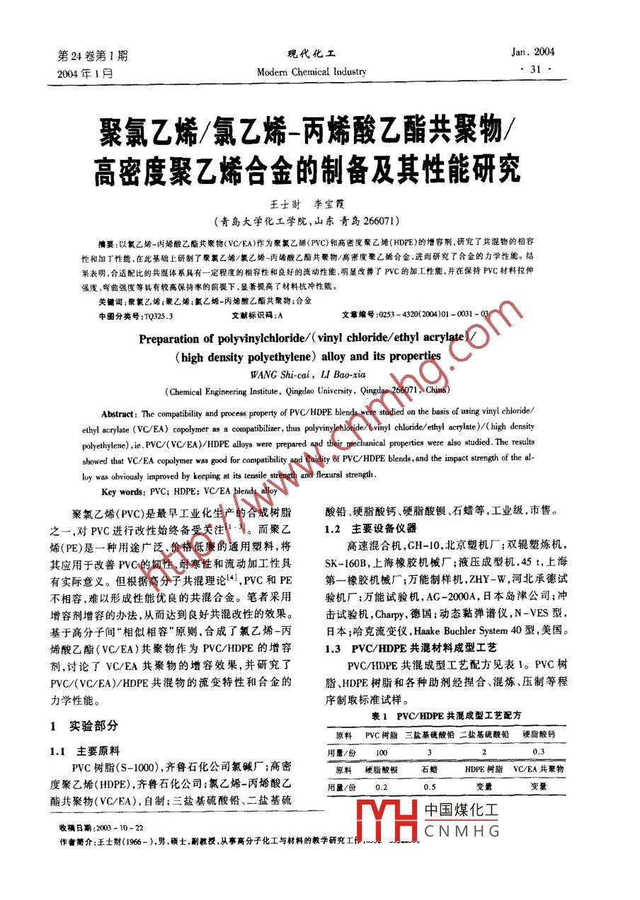 第24卷第1期現(xiàn)代化工Jan. 20042004年1月Modem Chemical lndustry聚氯乙烯/氯乙烯=丙烯酸乙酯共聚物/高密度聚乙烯合金的制備及其性能研究王士財李寶霞(青島大學(xué)化工學(xué)院,山東青島266071)摘要:以氟乙烯-丙烯酸乙酯共案物( VC/EA)作為聚氟乙烯(PVC)和高密度聚己烯(HDPE)的增容劑,研究了共混物的相容性和加丁性能,在此基礎(chǔ)上:研制了樂氧乙烯/氯乙婚: -丙烯酸乙酯共秦物/高寮度聚乙婚合金進(jìn)而研究了合金的力學(xué)性能。結(jié)果表明.合適配比的共混體系具有一定程度的相容性和良好的流動性能.明顯改普了PVC的加工性能,并在保持PVC材料拉伸強(qiáng)度、彎曲強(qiáng)度等具有較高保持率的前提下,顯著規(guī)高了材料抗沖性能。關(guān)鏞詞;聚氟乙烯;聚乙烯;氯乙婚-丙嬌酸乙酯共聚物;合金中團(tuán)分類號:TQ0325.3文獻(xiàn)標(biāo)識碼:A文章編號:0253- 4320(200)01 -0031 -03Preparation of polyvinyichloride/( vinyl chloride/etyl acrylate)/(high density polyethylene) alloy and its propertiesWANG Shi-cai, u Bao-xia(Chemiceal Engieering Istitute , Qingdao Univernity. Qingdao 266071, China)Abstraet: The compibilily and process property of PVC HDPE blends were studied on the basis of using ving choride/ethyl aeylate (VC/EA) coplymer as a coptibilizer, thus pryiycorde( vinyI choride/ ethyl acrylate )/