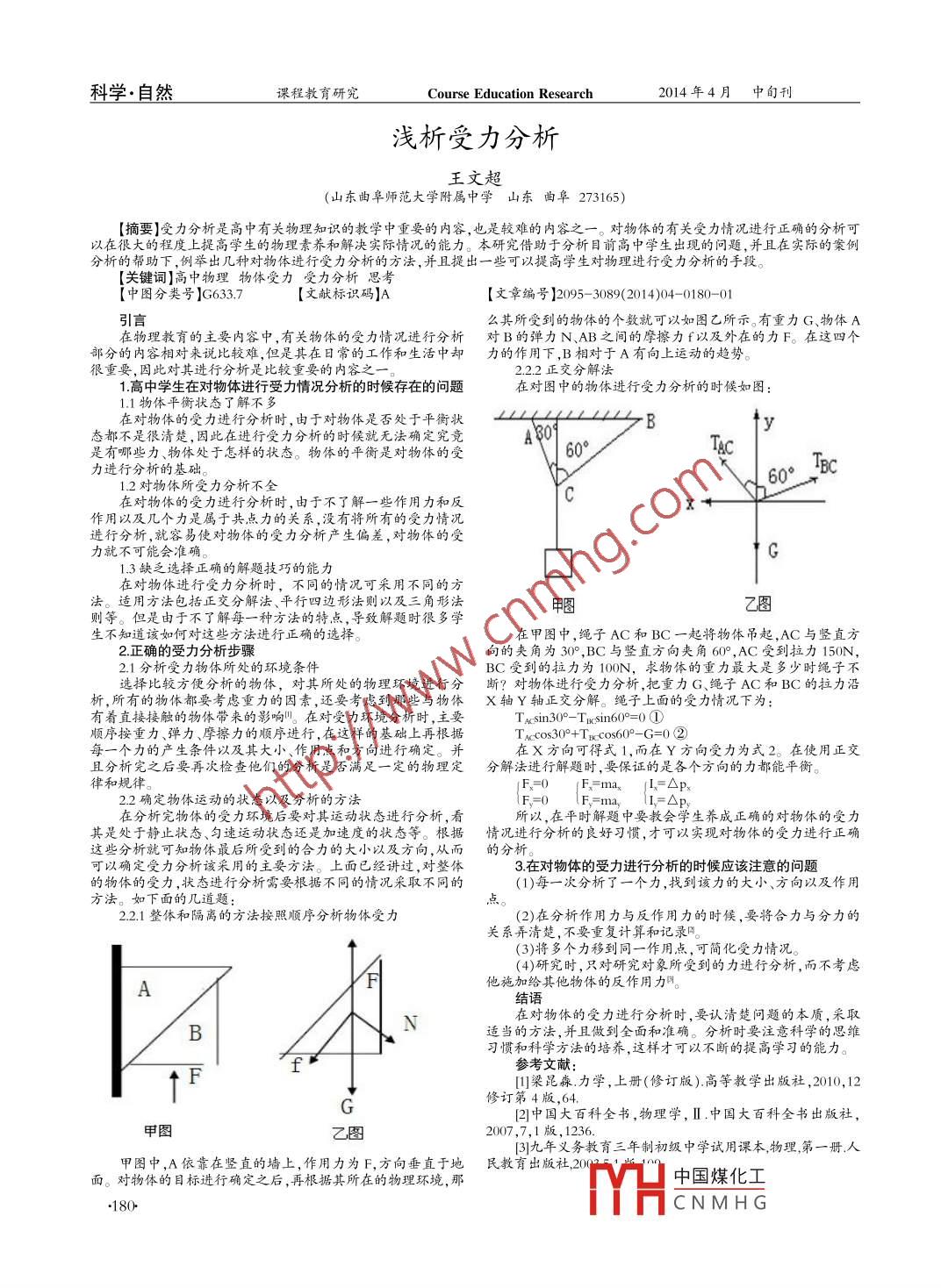科學(xué).自然課程教育研究Course Education Research2014年4月中旬刊淺析受力分析王文超(山東曲阜師范大學(xué)附屬中學(xué)山東曲阜273165)[摘要]受力分析是高中有關(guān)物理知識的教學(xué)中重要的內(nèi)容,也是較難的內(nèi)容之一。對物體的有關(guān)受力情況進行正確的分析可以在很大的程度.上提高學(xué)生的物理素養(yǎng)和解決實際情況的能力。本研究借助于分析目前高中學(xué)生出現(xiàn)的問題,并且在實際的案例分析的幫助下,例舉出幾種對物體進行受力分析的方法,并且提出一些可以提高學(xué)生對物理進行受力分析的手段。[關(guān)鍵詞]高中物理 物體受力,受力分析 思考[中圖分類號]G633.7[文獻標(biāo)識碼]A[文章編號]2095- -3089(2014)04-0180-01引言么其所受到的物體的個數(shù)就可以如圖乙所示,有重力G物體A在物理教育的主要內(nèi)容中,有關(guān)物體的受力情況進行分析對 B的彈力N、AB之間的摩擦力f以及外在的力F。在這四個部分的內(nèi)容相對來說比較難,但是其在日常的工作和生活中卻力的作用下 ,B相對于A有向上運動的趨勢。很重要,因此對其進行分析是比較重要的內(nèi)容之一。2.2.2正交分解法1.高中學(xué)生在對物體進行受力情況分析的時候存在的問題在對圖中的物體進行受力分析的時候如圖:在對物體的受力進行分析時,由于對物體是否處于平衡狀//( 1// //>B↑y態(tài)都不是很清楚,因此在進行受力分析的時候就無法確定究竟AB0是有哪些力、物體處于怎樣的狀態(tài)。物體的平衡是對物體的受60°T&C力進行分析的基礎(chǔ)。| 60TBCc1.2對物體所受力分析不全在對物體的受力進行分析時,由于不了解一些作用力和反「ox→作用以及幾個力是屬于共點力的關(guān)系,沒有將所有的受力情況進行分析,就容易使對物體的受力分析產(chǎn)生偏差,對物體的受力就不可能會準(zhǔn)確。G1.3缺乏選擇正確的解題技巧的能力在對物體進行受力分析時,不同的情況可采用不同的方去。適用方法包括正交分解法、平行四邊形法則以及三角形法甲圖乙圖則等。但是由于不了解每一種方法的特點,導(dǎo)致解題時很多學(xué)生不知道該如何對這些方法進行正確的選擇。在甲圖中,繩子AC和BC一起將物體吊起,AC與豎直方2.正確的受力分析步驟向的夾角為30",BC與豎直方向夾角600 ,AC受到拉力150N,2.1分析受力物體所處的環(huán)境條件選擇比較方便分析的物體,對其所處的物理環(huán)境進行分?jǐn)? 對物體進行受力分析,把重力G、繩子AC和BC的拉力沿析,所有的物體都要考慮重力的因素,還要考慮到那些與物體x 軸Y軸正交分解。繩子上面的受力情況下為:有著直接接觸的物體帶來的影響"。在對受力環(huán)境分析時,主要Tacsin30°- Trxsin60=0①順序按重力、彈力摩擦力的順序進行,在這樣的基礎(chǔ)上再根據(jù)TAcos30°+Txc cos60*-G=0②每一個力的產(chǎn)生條件以及其大小、作用點和方向進行確定。并在X方向可得式1,而在Y方向受力為式2。在使用正交且分析完之后要再次檢查他們的分析是否滿足一定的物理定分解法進行解題時,要保證的是各個方向的力都能平衡。律和規(guī)律。F=0.2.2 確定物體運動的狀態(tài)以及分析的方法F=0E=m(L-APx在分析完物體的受力環(huán)境后要對其運動狀態(tài)進行分析,看所以,在平時解題中要教會學(xué)生養(yǎng)成正確的對物體的受力其是處于靜止?fàn)顟B(tài)、勻速運動狀態(tài)還是加速度的狀態(tài)等。根據(jù)情況進行分析的良好習(xí)慣,才可以 實現(xiàn)對物體的受力進行正確這些分析就可知物體最后所受到的合力的大小以及方向,從而的 分析??梢源_定受力分析該采用的主要方法。上面已經(jīng)講過,對整體3.在對物體的受力進行分析的時候應(yīng)該注意的問題的物體的受力,狀態(tài)進行分析需要根據(jù)不同的情況采取不同的(1)每一次分析了一個力,找到該力的大小、方向以及作用方法。如下面的幾道題:2.2.1整體和隔離的方法按照順序分析物體受力(2)在分析作用力與反作用力的時候,要將合力與分力的關(guān)系弄清楚,不要重復(fù)計算和記錄9↑(3)將多個力移到同一作用點,可簡化受力情況。(4)研究時,,只對研究對象所受到的力進行分析,而不考慮他施加給其他物體的反作用力明。A結(jié)語N在對物體的受力進行分析時 ,要認(rèn)清楚問題的本質(zhì),采取B適當(dāng)?shù)姆椒ǎ?并且做到全面和準(zhǔn)確。分析時要注意科學(xué)的思維習(xí)慣和科學(xué)方法的培養(yǎng),這樣才可以不斷的提高學(xué)習(xí)的能力。1 fr參考文獻:↑F田梁昆森.力學(xué),上冊(修訂版).高等教學(xué)出版社,2010,12修訂第4版,64.[2]中國大百科全書,物理學(xué), II .中國大百科全書出版社,2007,7,1版, 1236[3]九年義 務(wù)教育三年制初級中學(xué)試用課本,物理,第一冊人甲圖中,,A依靠在豎直的墻上,作用力為F,方向垂直于地民教育出版社,200面。對物體的目標(biāo)進行確定之后,再根據(jù)其所在的物理環(huán)境,那中國煤化工.180 .MHCNMH G