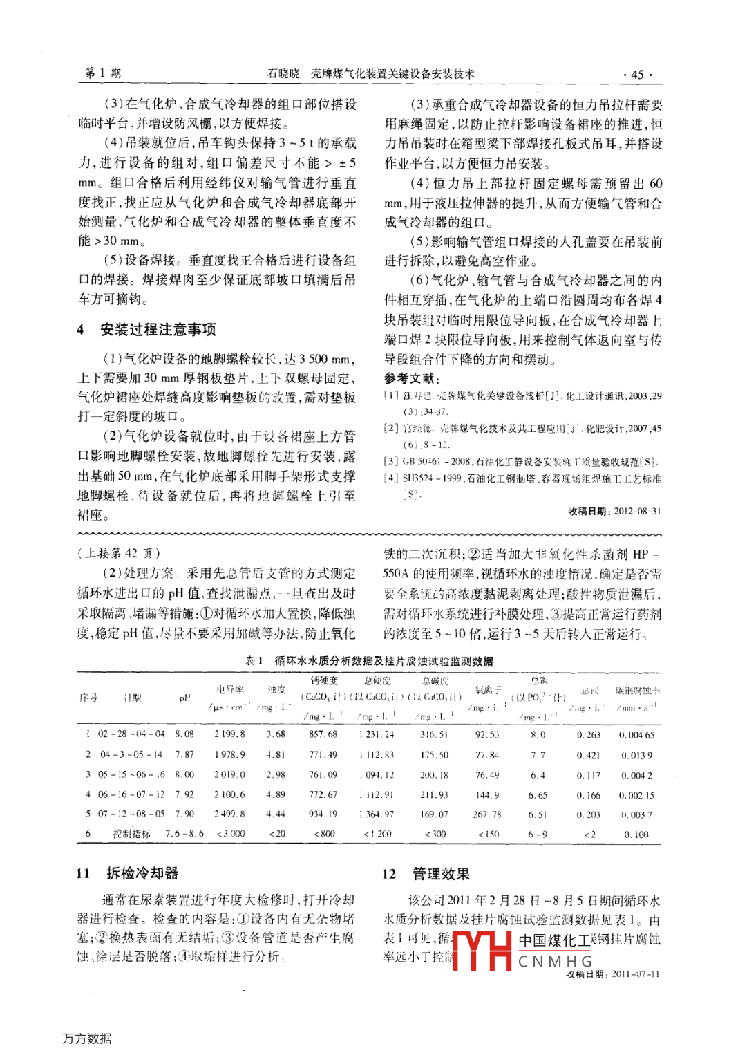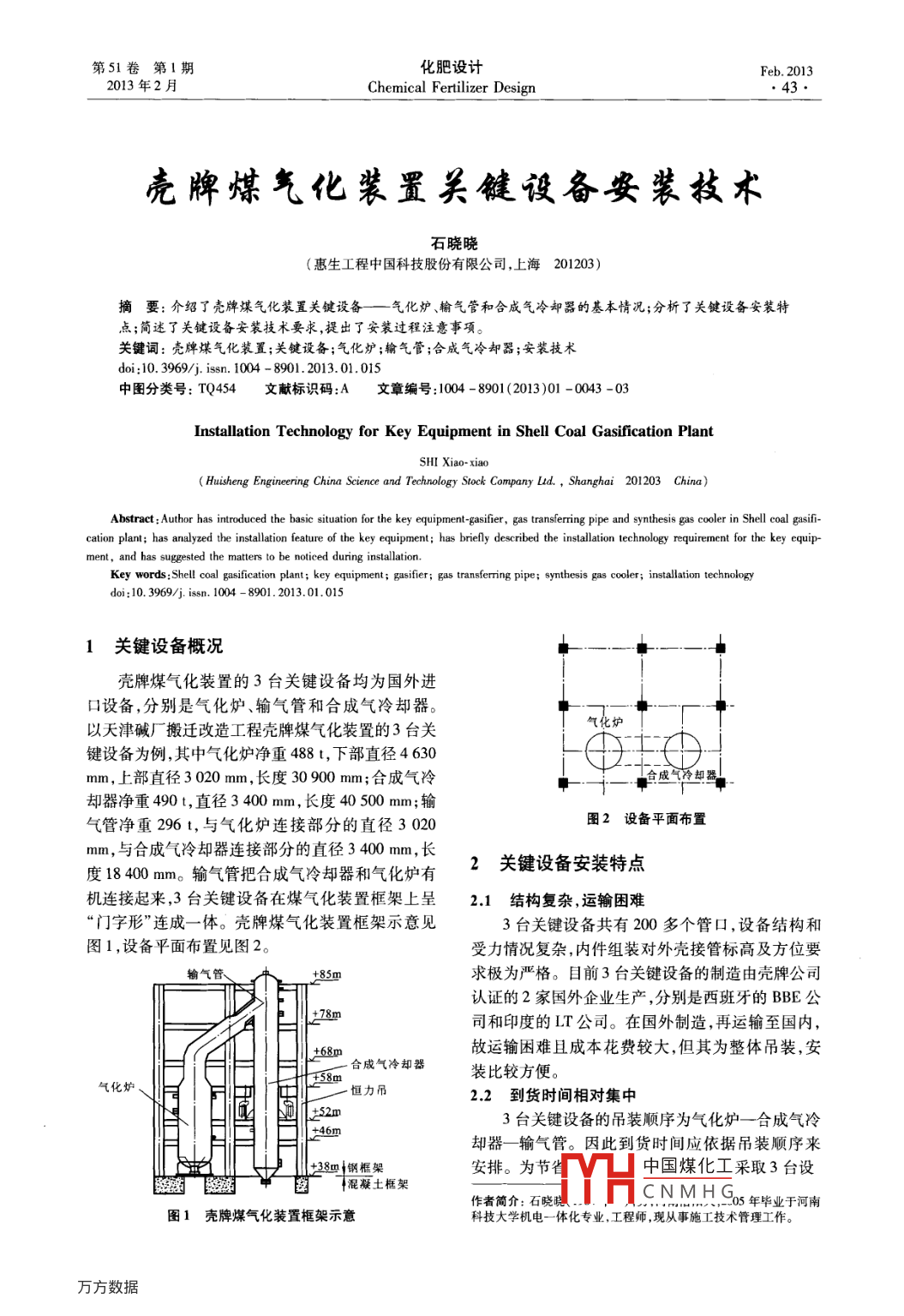 第51卷第1期化肥設(shè)計(jì)Feb.20132013年2月Chemical Fertilizer Design●43.殼牌煤氣化裝置關(guān)鍵設(shè)備安裝技術(shù)石曉曉(惠生工程中國(guó)科技股份有限公司,上海201203)摘要: 介紹了殼牌煤氣化裝置關(guān)鍵設(shè)備一氣化爐 榆氣管和合成氣冷卻器的基本情況;分析了關(guān)鍵設(shè)備安裝特點(diǎn);簡(jiǎn)述了關(guān)鍵設(shè)備安裝技術(shù)要求,提出了安裝過(guò)程注意事項(xiàng)。關(guān)鍵詞:殼牌煤氣化裝置;關(guān)鍵設(shè)備;氣化爐;輸氣管;合成氣冷卻器;安裝技術(shù)doi:10. 3969/j. issn. 1004 - 8901. 2013. 01.015中圖分類號(hào): TQ454文獻(xiàn)標(biāo)識(shí)碼:A文章 編號(hào):1004 - 8901 (2013)01 -0043 -03Installation Technology for Key Equipment in Shell Coal Gasification PlantSHI Xiao- xiao( Huisheng Enginering China Science and Technology Sock Company Lad. , Shanghai 201203 China)Abstract: Author has intoduced the basic situation for the key equipment-gasifier, gas transfering pipe and synthesis gas cooler in Shell coal gasif-cation plant; has analyzed the insallation feature of the key equipment; has briely described the intallation technology requirement for the key equip-Key words :Shell coal gasifcation plant; key equipment; gasifier; gas transfering pipe; synthesis gas cooler; insallation technologydoi;:10. 3969/j. issn. 1004 - 8901.2013. 01.0151關(guān)鍵設(shè)備概況+.殼牌煤氣化裝置的3臺(tái)關(guān)鍵設(shè)備均為國(guó)外進(jìn)口設(shè)備,分別是氣化爐、輸氣管和合成氣冷卻器。氣化爐以天津堿廠搬遷改造工程殼牌煤氣化裝置的3臺(tái)關(guān)鍵設(shè)備為例,其中氣化爐凈重488 t,下部直徑4630mm,上部直徑3020 mm,長(zhǎng)度30 900 mm;合成氣冷食成氣冷卻器.卻器凈重4901,直徑3 400 mm,長(zhǎng)度40500 mm;輸氣管凈重296t,與氣化爐連接部分的直徑3 020圖2設(shè)備平面布置mm,與合成氣冷卻器連接部分的直徑3400mm,長(zhǎng)2關(guān)鍵設(shè)備安裝特點(diǎn)度18400mm。輸氣管把合成氣冷卻器和氣化爐有機(jī)連接起來(lái),3臺(tái)關(guān)鍵設(shè)備在煤氣化裝置框架上呈2.1結(jié)構(gòu)復(fù) 雜,運(yùn)輸困難“門字形”連成- -體。殼牌煤氣化裝置框架示意見(jiàn)3臺(tái)關(guān)鍵設(shè)備共有200多個(gè)管口,設(shè)備結(jié)構(gòu)和圖1,設(shè)備平面布置見(jiàn)圖2。受力情況復(fù)雜,內(nèi)件組裝對(duì)外殼接管標(biāo)高及方位要輸氣管+85m .求極為嚴(yán)格。目前3臺(tái)關(guān)鍵設(shè)備的制造由殼牌公司認(rèn)證的2家國(guó)外企業(yè)生產(chǎn),分別是西班牙的BBE公278m司和印度的LT公司。在國(guó)外制造,再運(yùn)輸至國(guó)內(nèi),故運(yùn)輸困難且成本花費(fèi)較大,但其為整體吊裝,安F58m合成氣冷卻器裝比較方便。2.2 到貨時(shí)間相對(duì)集中+523臺(tái)關(guān)鍵設(shè)備的吊裝順序?yàn)闅饣癄t一合 成氣冷| +46m卻器一輸氣管。因此到貨時(shí)間應(yīng)依據(jù)吊裝順序來(lái)+38m鋼框架安排。為節(jié)省中國(guó)煤化工采取3臺(tái)設(shè)混凝土框架作者簡(jiǎn)介:石曉曉YHC NM h Gos年畢業(yè)于河圖1殼牌煤氣化裝 置框架示意科技大學(xué)機(jī)電- -體化專業(yè),工程師,現(xiàn)從事施工技術(shù)管理工作?!?4●化肥設(shè)計(jì)2013年第51卷備到貨后再集中吊裝的方式。因此3臺(tái)設(shè)備的到貨備的中心線是否-致,調(diào)整--致后,設(shè)備方可就位。的時(shí)間又不能相隔太久。由于設(shè)備占據(jù)場(chǎng)地時(shí)間此時(shí)吊車鉤頭受力應(yīng)逐漸遞減,并最終保持3~5t長(zhǎng),影響現(xiàn)場(chǎng)施工作業(yè),因此到貨后立即安排吊裝的承載力,同時(shí)用2臺(tái)經(jīng)緯儀對(duì)設(shè)備的相鄰方位線是最合理的選擇。作為垂直線進(jìn)行測(cè)量,由于設(shè)備較重,此時(shí)用吊車2.3 場(chǎng)地要求嚴(yán)格來(lái)調(diào)整設(shè)備垂直度。垂直度偏差不能> 10 mm。垂3臺(tái)設(shè)備的運(yùn)輸路線和吊裝吊車的行走路線以直度調(diào)整合格后,吊車方可松鉤。及設(shè)備的擺放位置要綜合考慮,提前對(duì)擺放場(chǎng)地和(4)吊車松鉤后要復(fù)核設(shè)備的安裝標(biāo)高,設(shè)備.吊裝場(chǎng)地進(jìn)行規(guī)劃,提前做好場(chǎng)地的平整及處理安裝標(biāo)高不能> +5 mm。無(wú)誤后,穿人地腳螺栓并工作。固定。2.4設(shè)備重量大 ,連接形式復(fù)雜3.2合成氣冷卻器安裝3臺(tái)設(shè)備與框架的連接形式復(fù)雜,其中氣化爐(1)結(jié)構(gòu)預(yù)留要求。合成氣冷卻器裙座就位層通過(guò)40個(gè)φ80mm的雙頭螺栓固定在3m厚的混箱型梁最外側(cè)的1根不能安裝,合成氣冷卻器布置凝土樓面上,合成氣冷卻器通過(guò)24個(gè)恒力吊吊掛在區(qū)域外側(cè)的型鋼梁均不能安裝,以便于進(jìn)行設(shè)備58m框架的1.8m高度的箱型梁上。輸氣管的安吊裝。裝在氣化爐和合成氣冷卻器安裝后進(jìn)行。氣化爐(2)承重箱型梁標(biāo)高及恒力吊螺桿孔的復(fù)測(cè)。和合成氣冷卻器的安裝質(zhì)量直接影響輸氣管的組箱型梁的標(biāo)高可以通過(guò)混凝土樓層標(biāo)高向上進(jìn)行對(duì)焊接質(zhì)量。測(cè)量,箱型梁標(biāo)高誤差不能> :5n.:恒力吊螺栓2.5框架結(jié)構(gòu)預(yù)留及恢復(fù)復(fù)雜孔應(yīng)保證在一個(gè)圓上,其間距應(yīng)同合成氣冷卻器的煤氣化框架高度超過(guò)90m,為鋼筋混凝t和鋼螺栓孔間距- -致。結(jié)構(gò